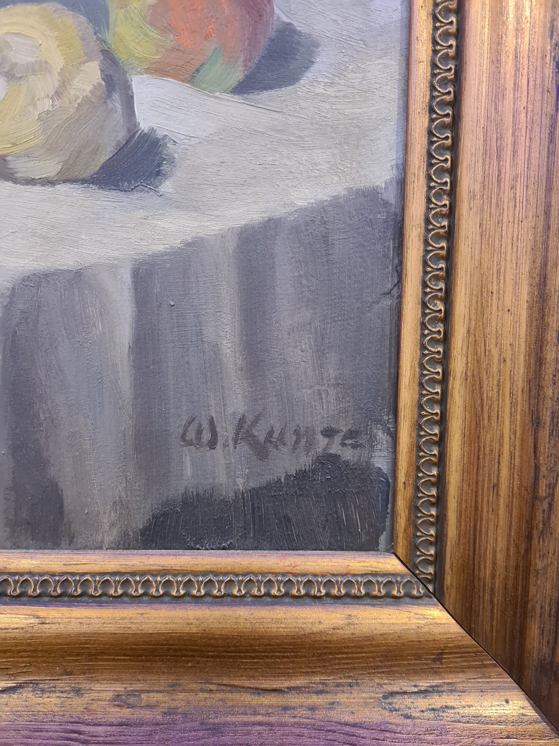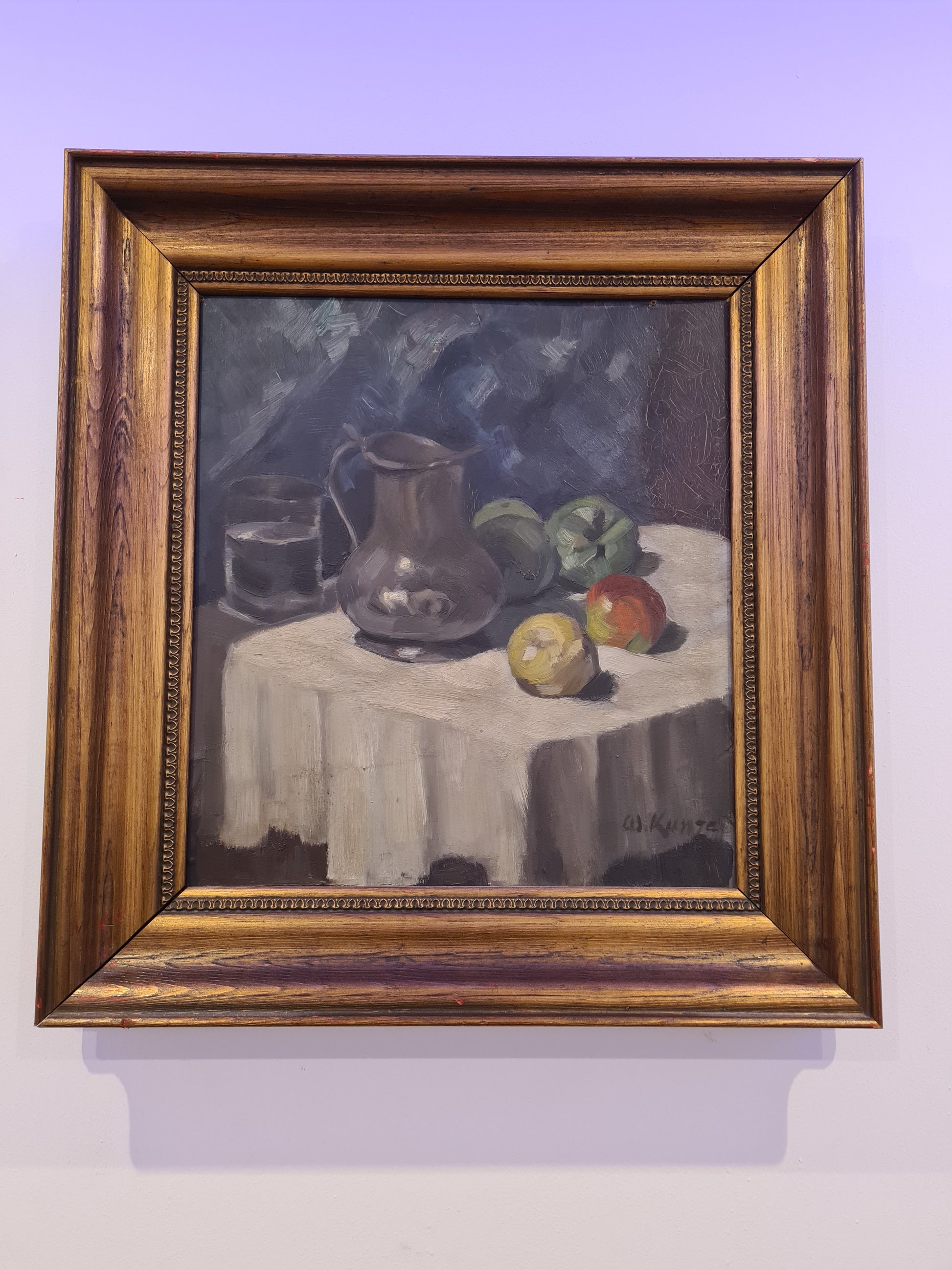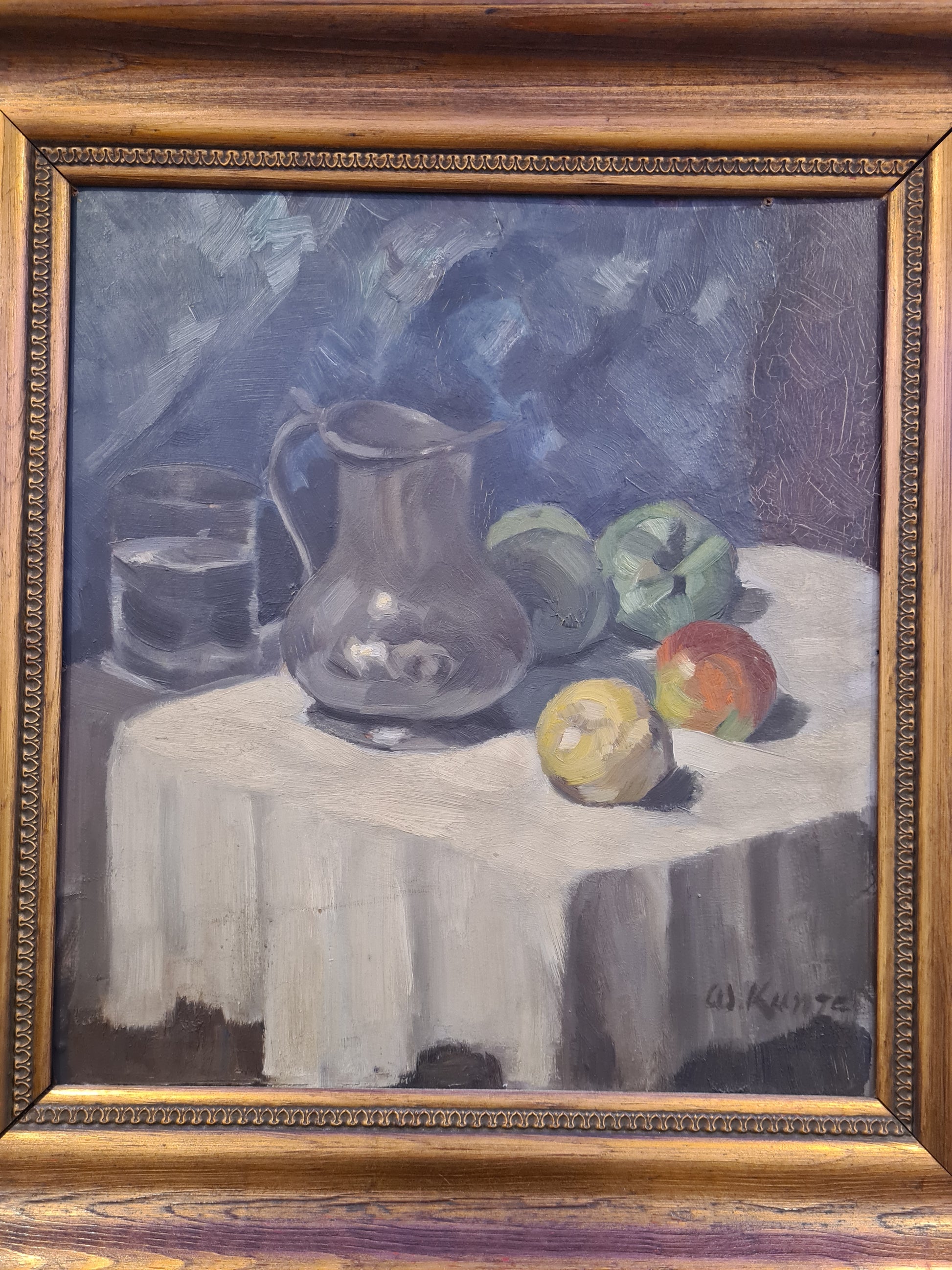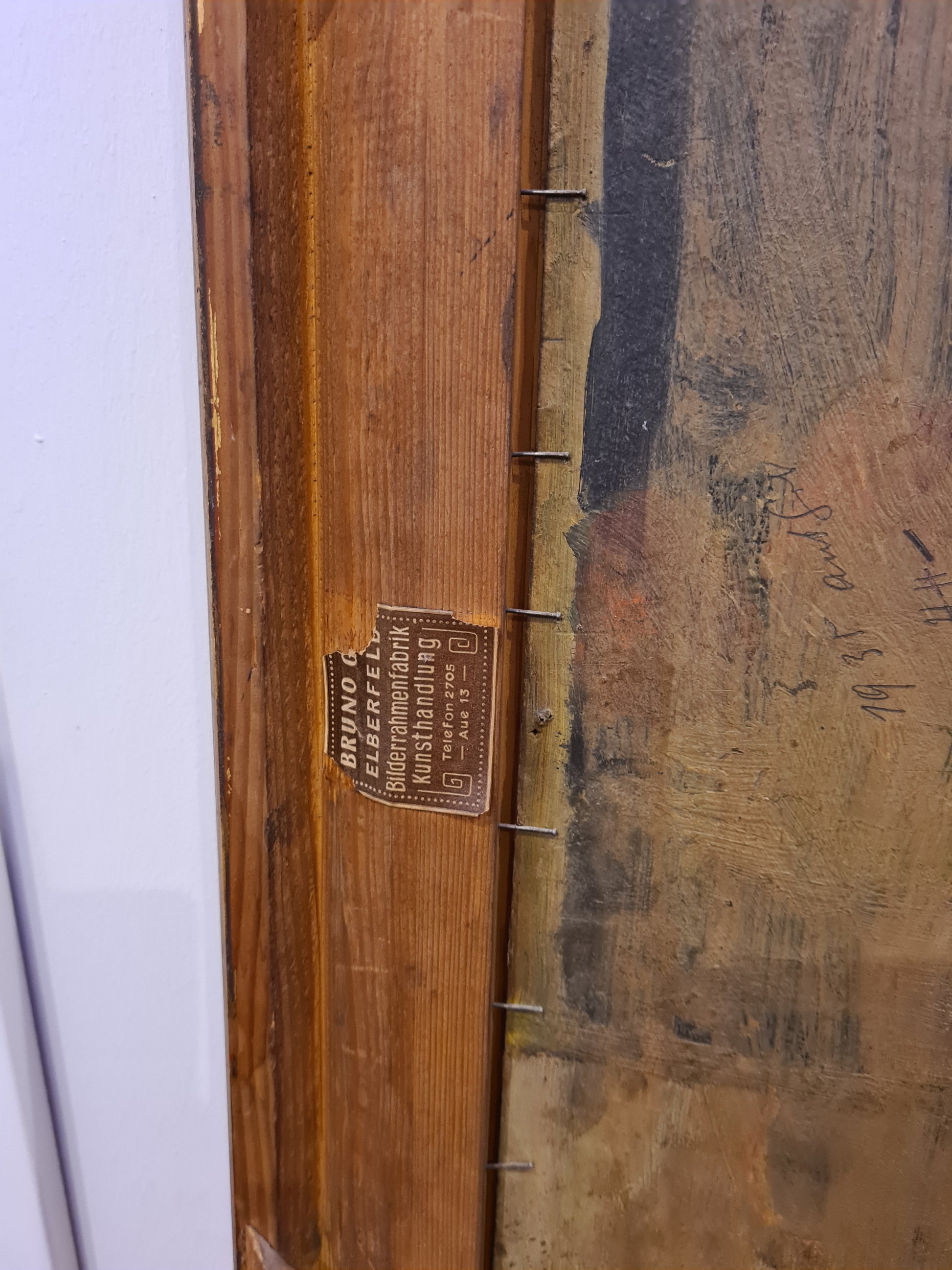 angeboten wird ein signiertes Ölgemälde auf Holz mit Stillleben und Akt, beidseitig bemalt und gerahmt – ein einzigartiges Kunstwerk.