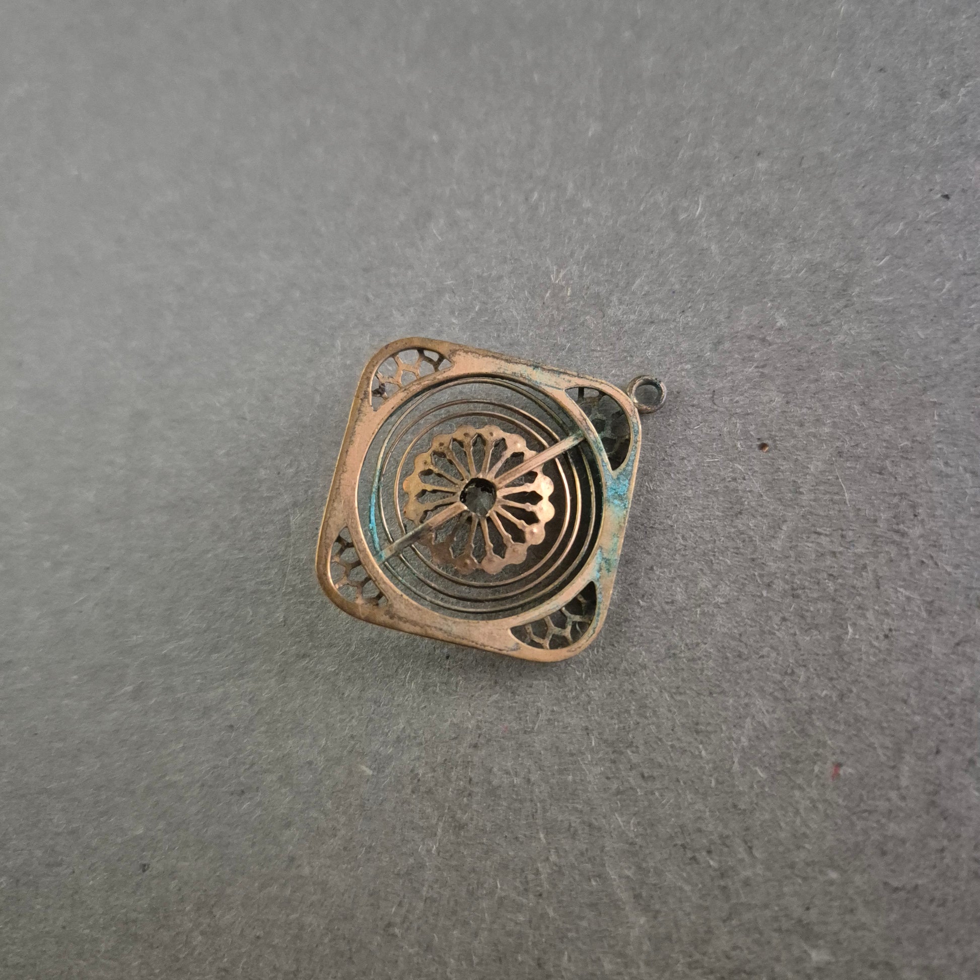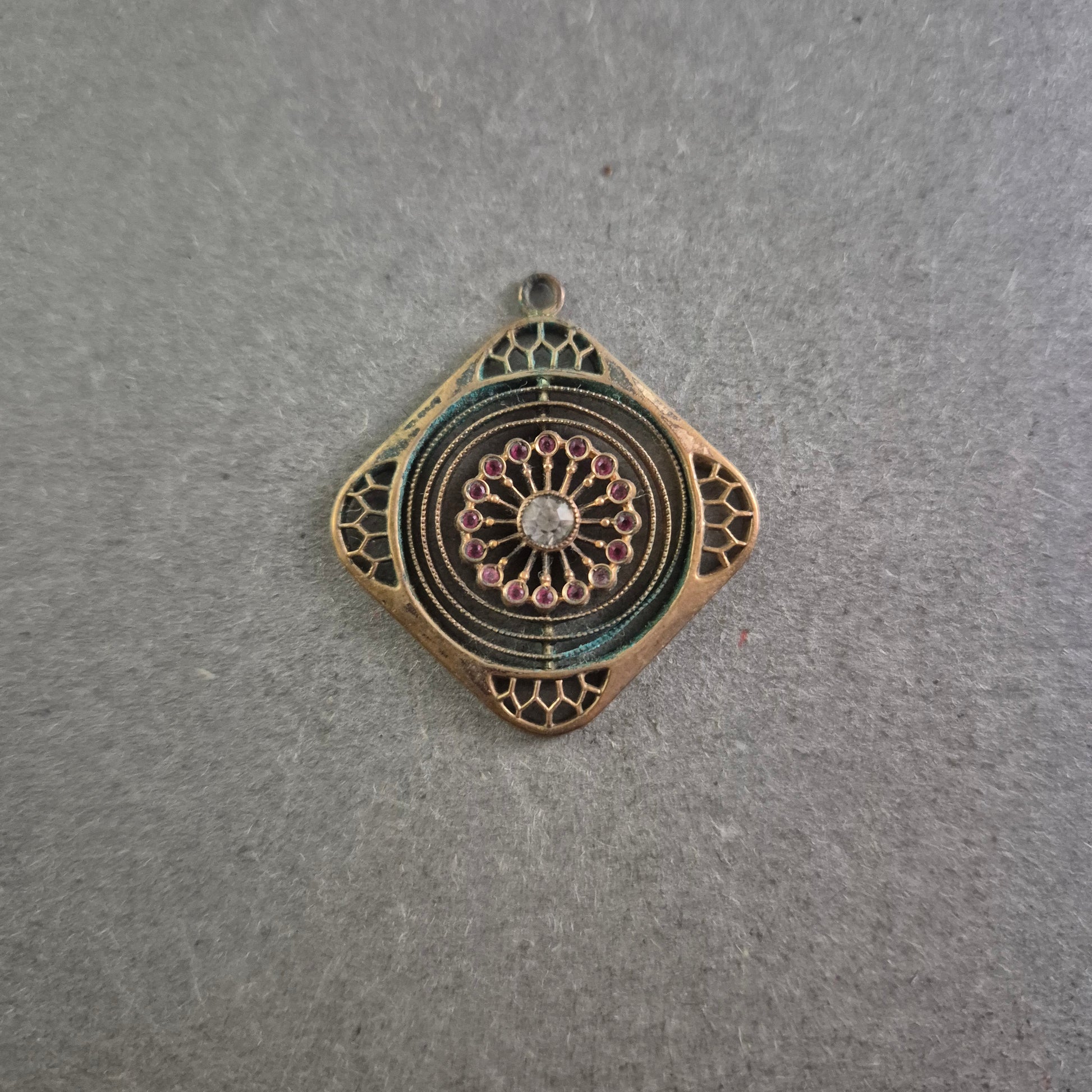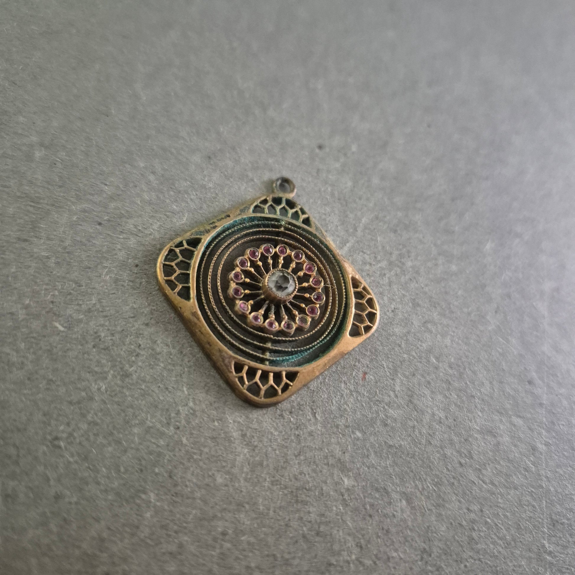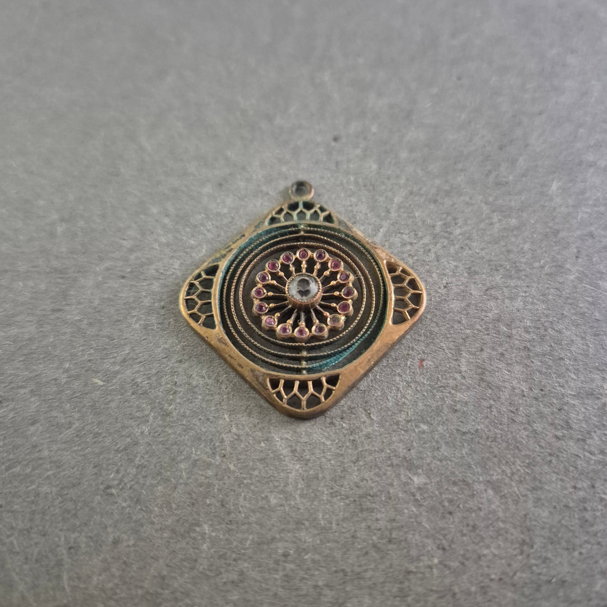 Dieser außergewöhnliche, doppelseitige Anhänger im orientalischen Stil kombiniert aufwendig gearbeitete Details mit einem Hauch Patina für eine antike Ausstrahlung. Die eine Seite zeigt ein feines Blütenornament mit violetten Steinakzenten um einen zentralen klaren Stein. Die Rückseite offenbart ein florales, durchbrochenes Design, das an alte Metallkunst erinnert. Perfekt für Boho-, Ethno- oder Vintage-Outfits.