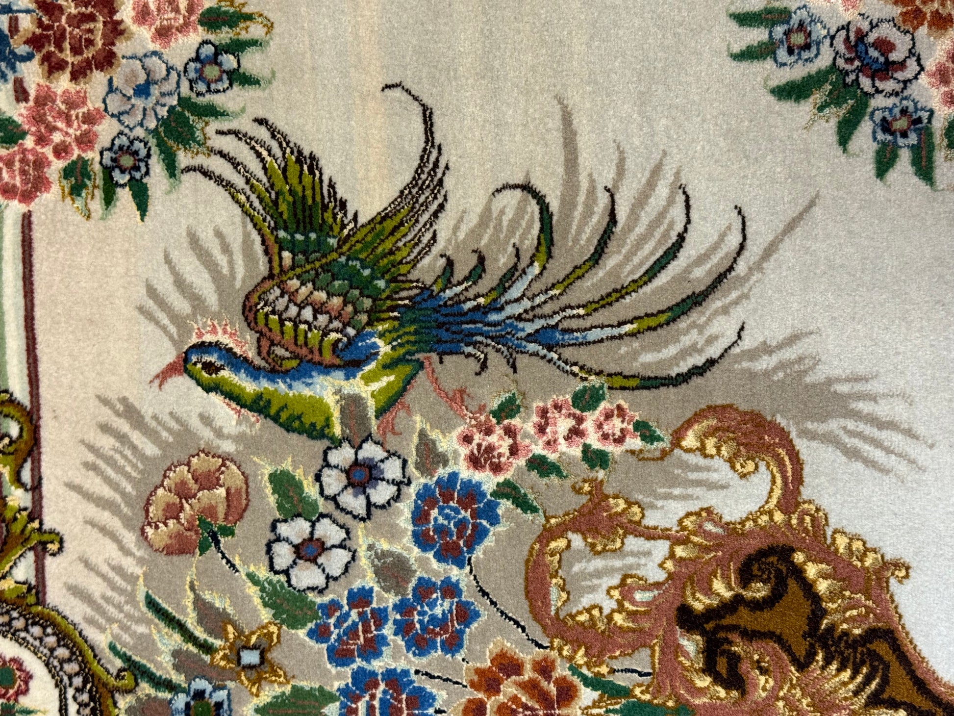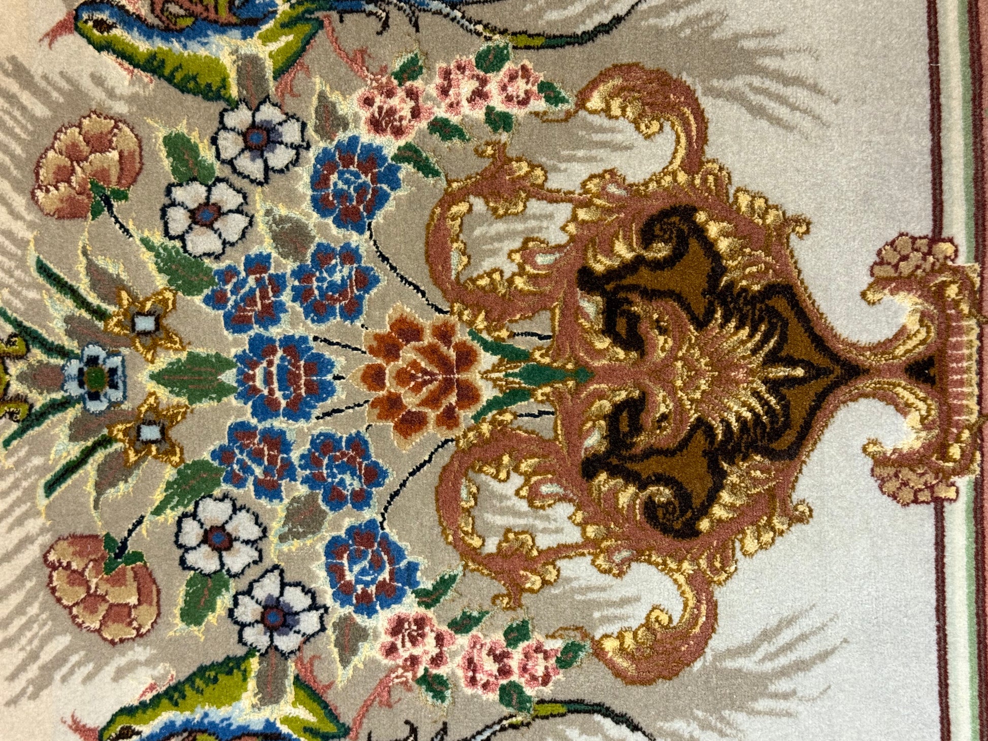 Dieser edle Orientteppich im Täbriz-Muster wurde in aufwendiger Handarbeit gefertigt und überzeugt durch seine außergewöhnlich feine Knüpfung sowie hochwertige Materialien. Die Kombination aus weicher Korkwolle und glänzender Seide verleiht dem Teppich eine edle Haptik und ein elegantes Erscheinungsbild.