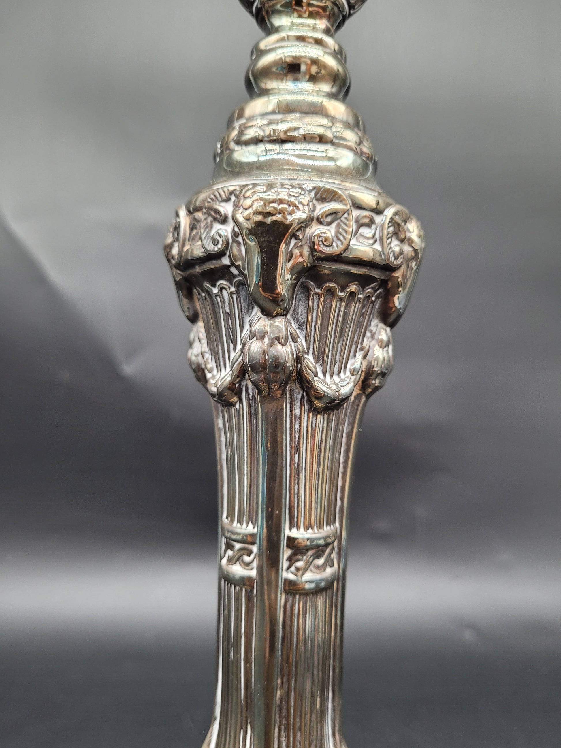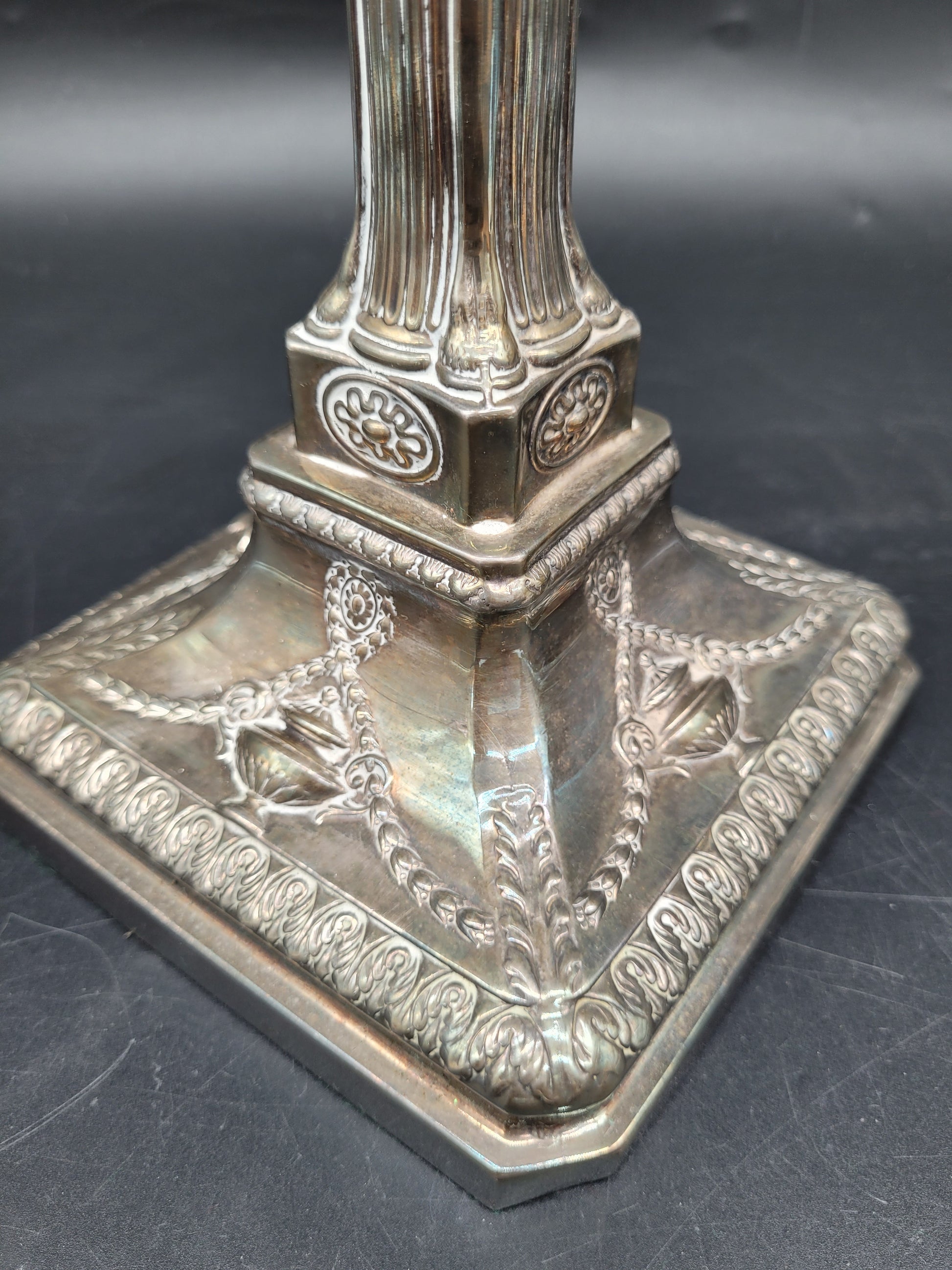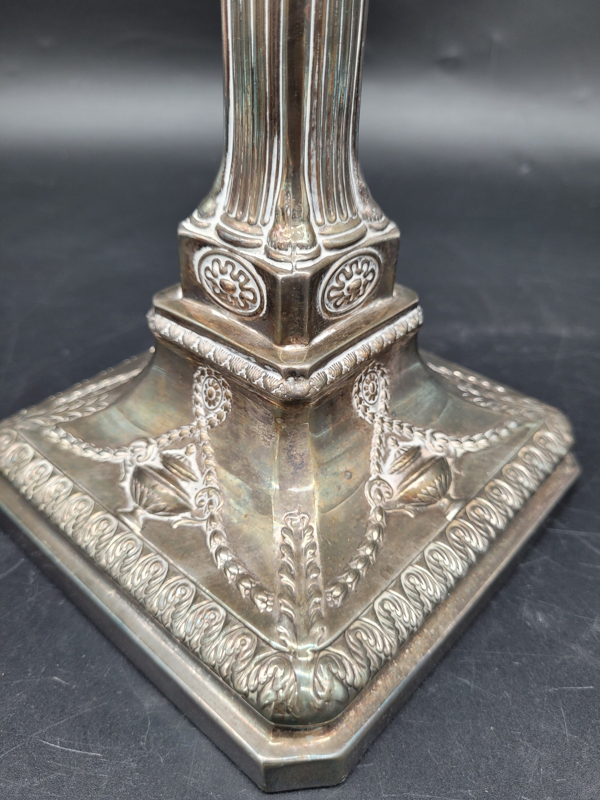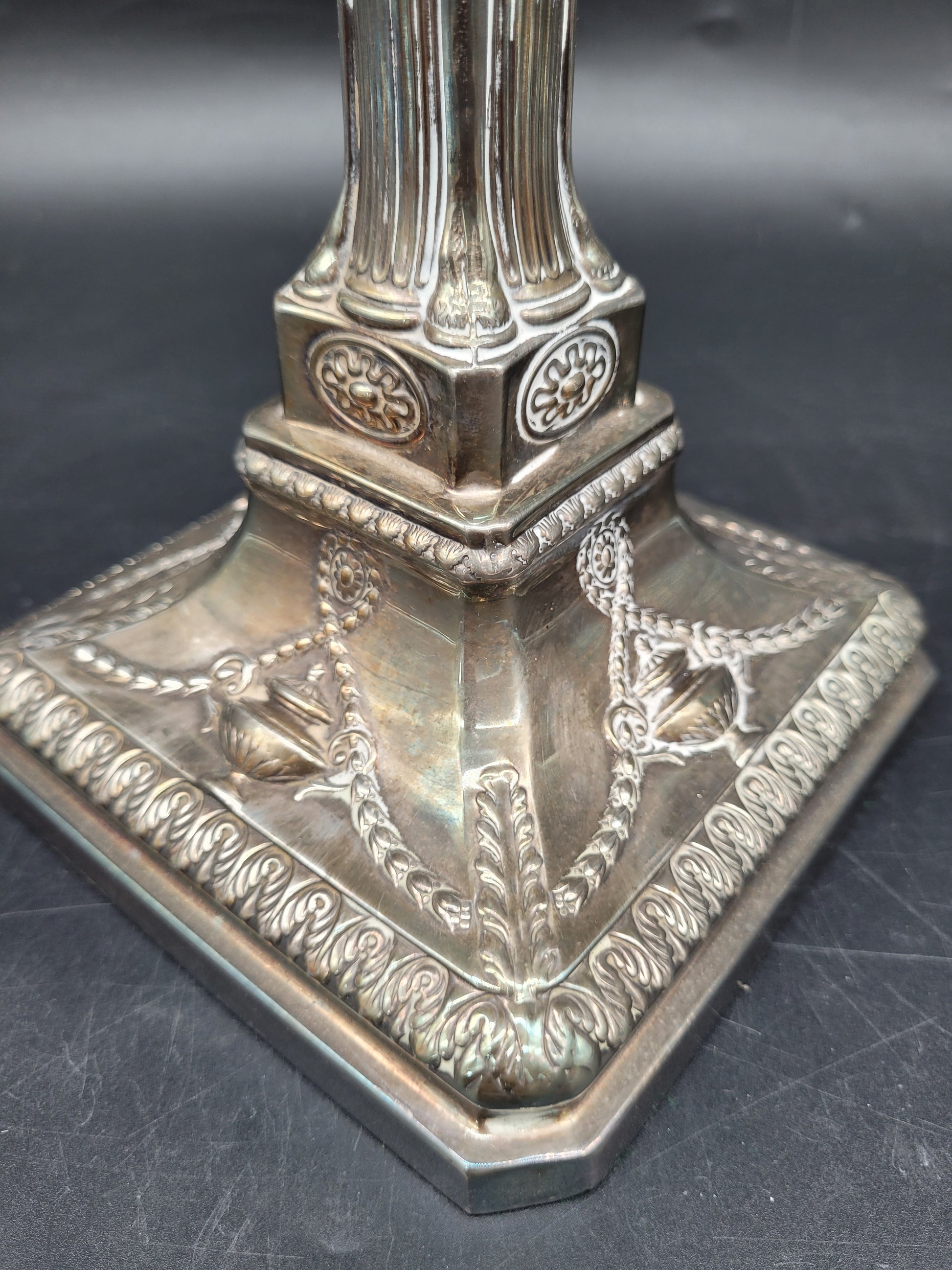 Dieses eindrucksvolle Paar Kerzenständer wurde von einer englischen Manufaktur gefertigt und ist ein exzellentes Beispiel für den neoklassischen Stil. Mit ihren geriffelten Säulen und den aufwendig verzierten Sockeln strahlen sie eine zeitlose Eleganz aus. Dank ihres soliden Gewichts von über 3 Kilogramm sind sie besonders standfest und eignen sich ideal als prunkvolle Tischdekoration.