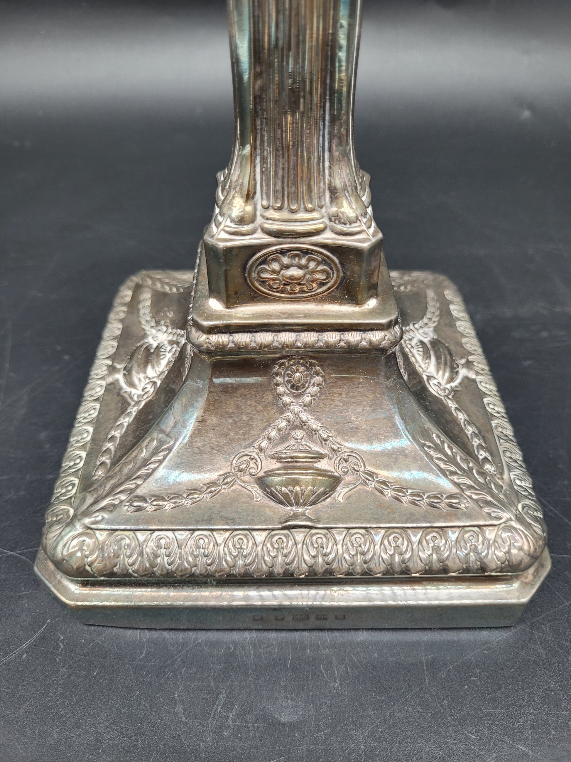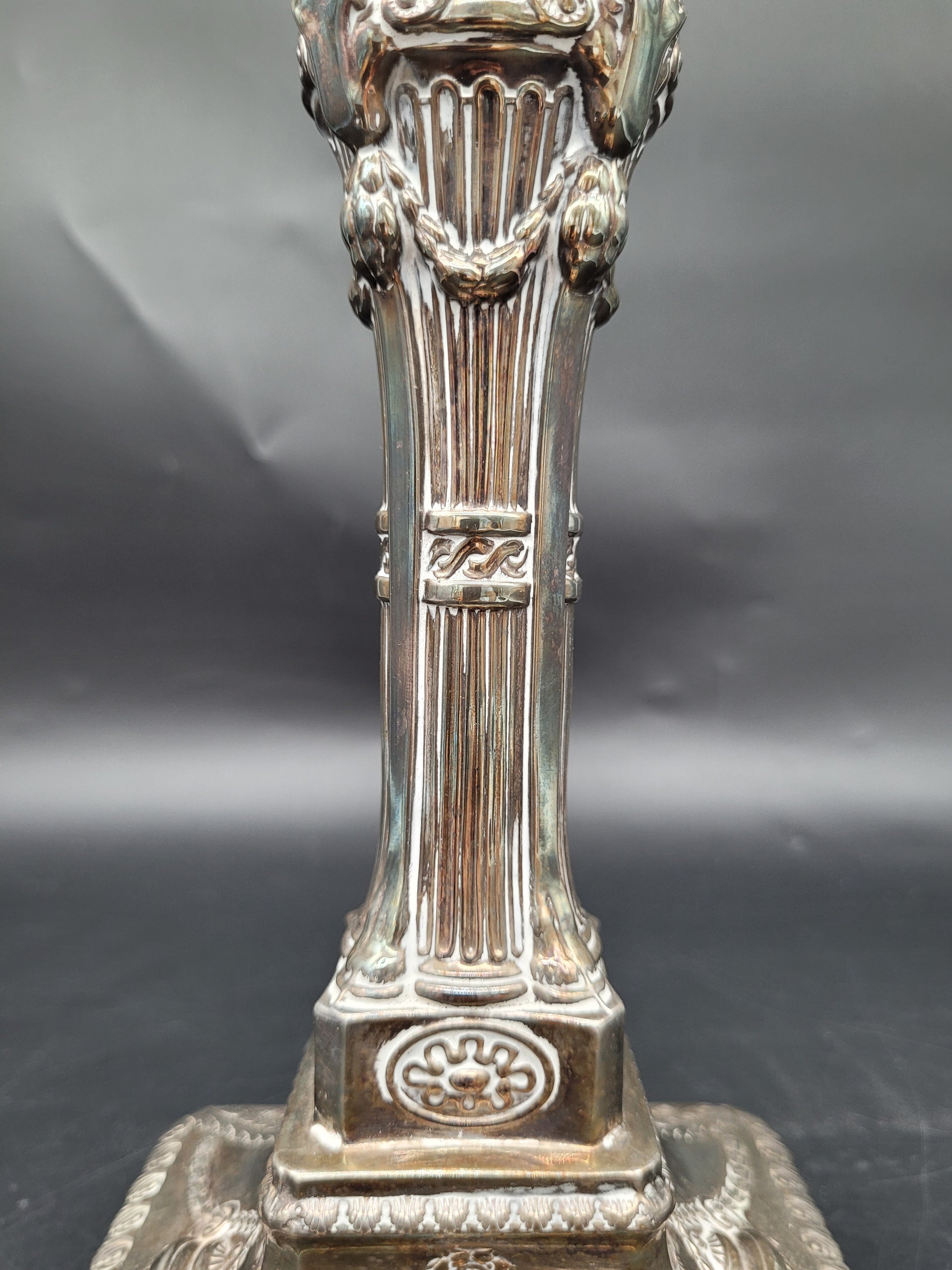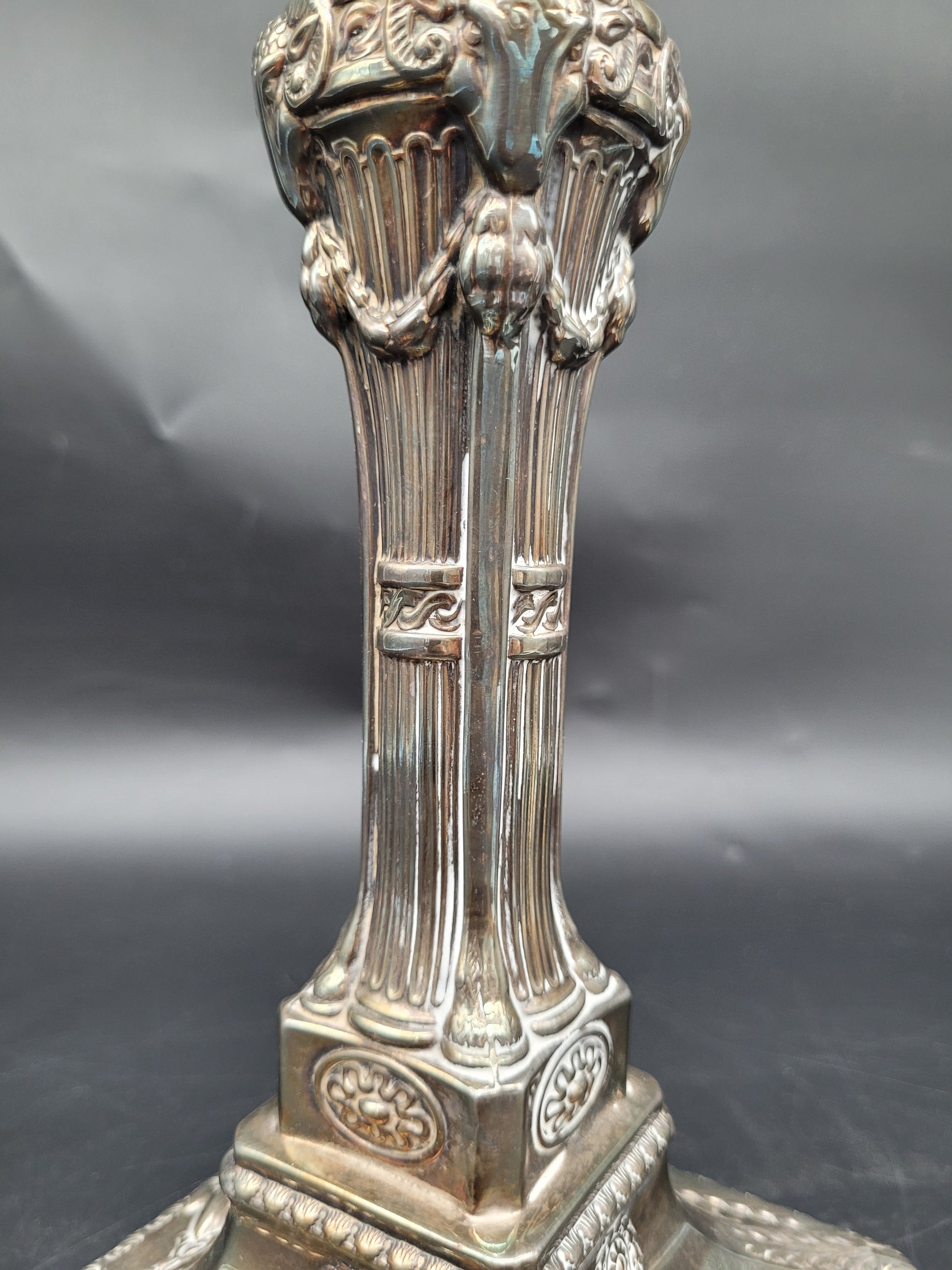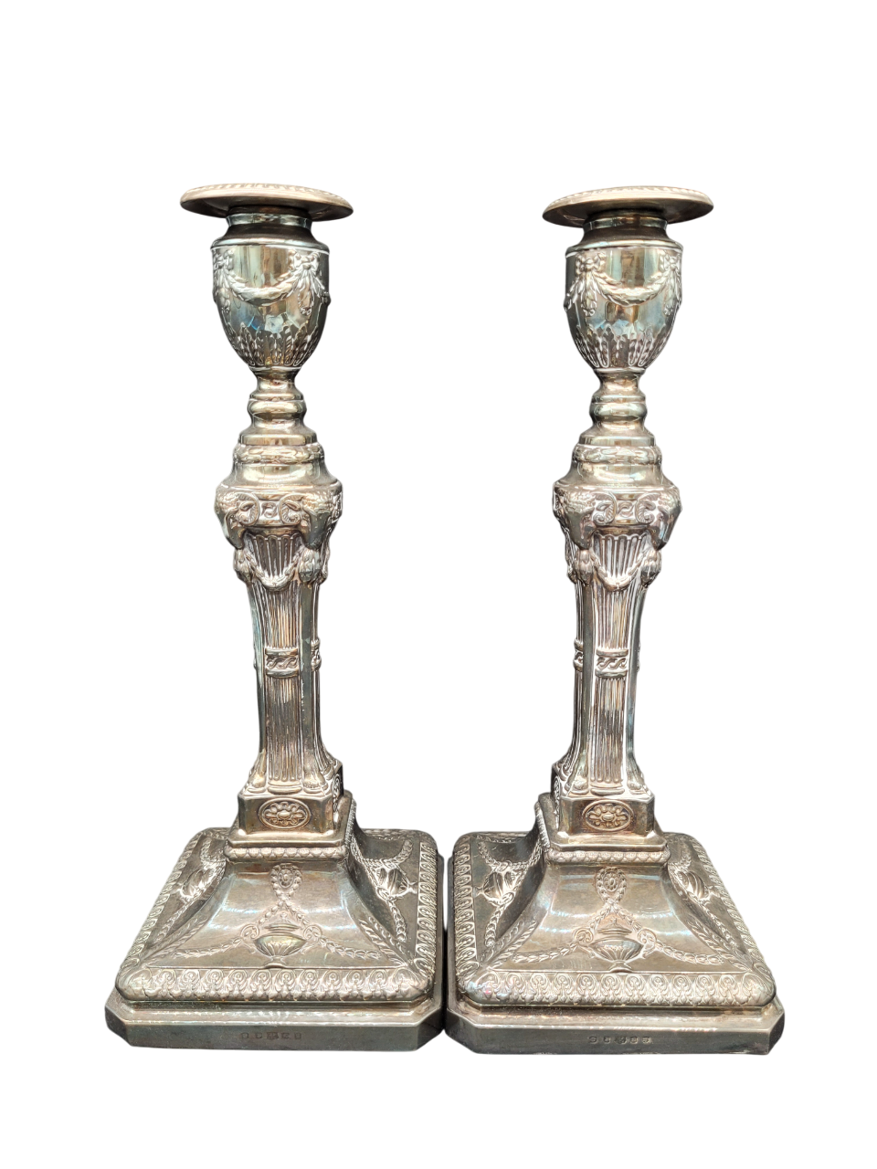 Dieses eindrucksvolle Paar Kerzenständer wurde von einer englischen Manufaktur gefertigt und ist ein exzellentes Beispiel für den neoklassischen Stil. Mit ihren geriffelten Säulen und den aufwendig verzierten Sockeln strahlen sie eine zeitlose Eleganz aus. Dank ihres soliden Gewichts von über 3 Kilogramm sind sie besonders standfest und eignen sich ideal als prunkvolle Tischdekoration.