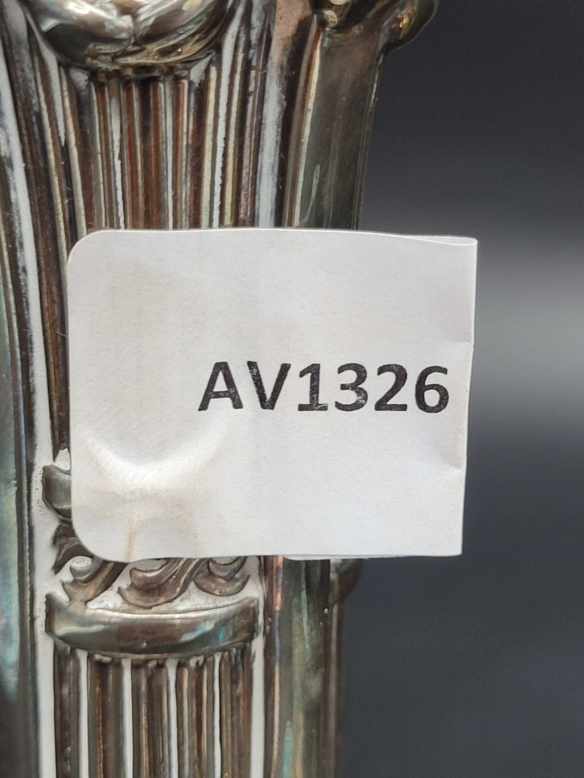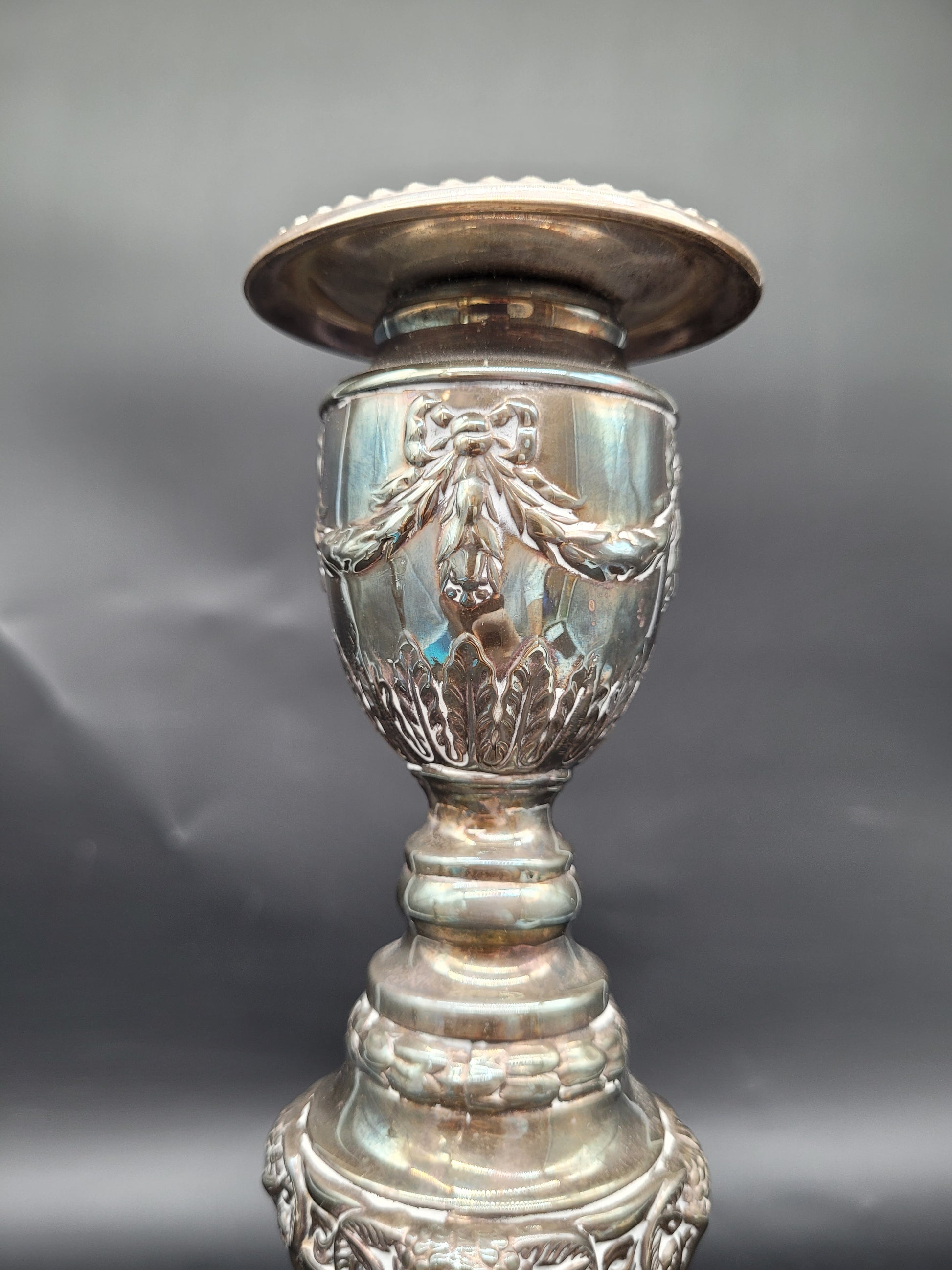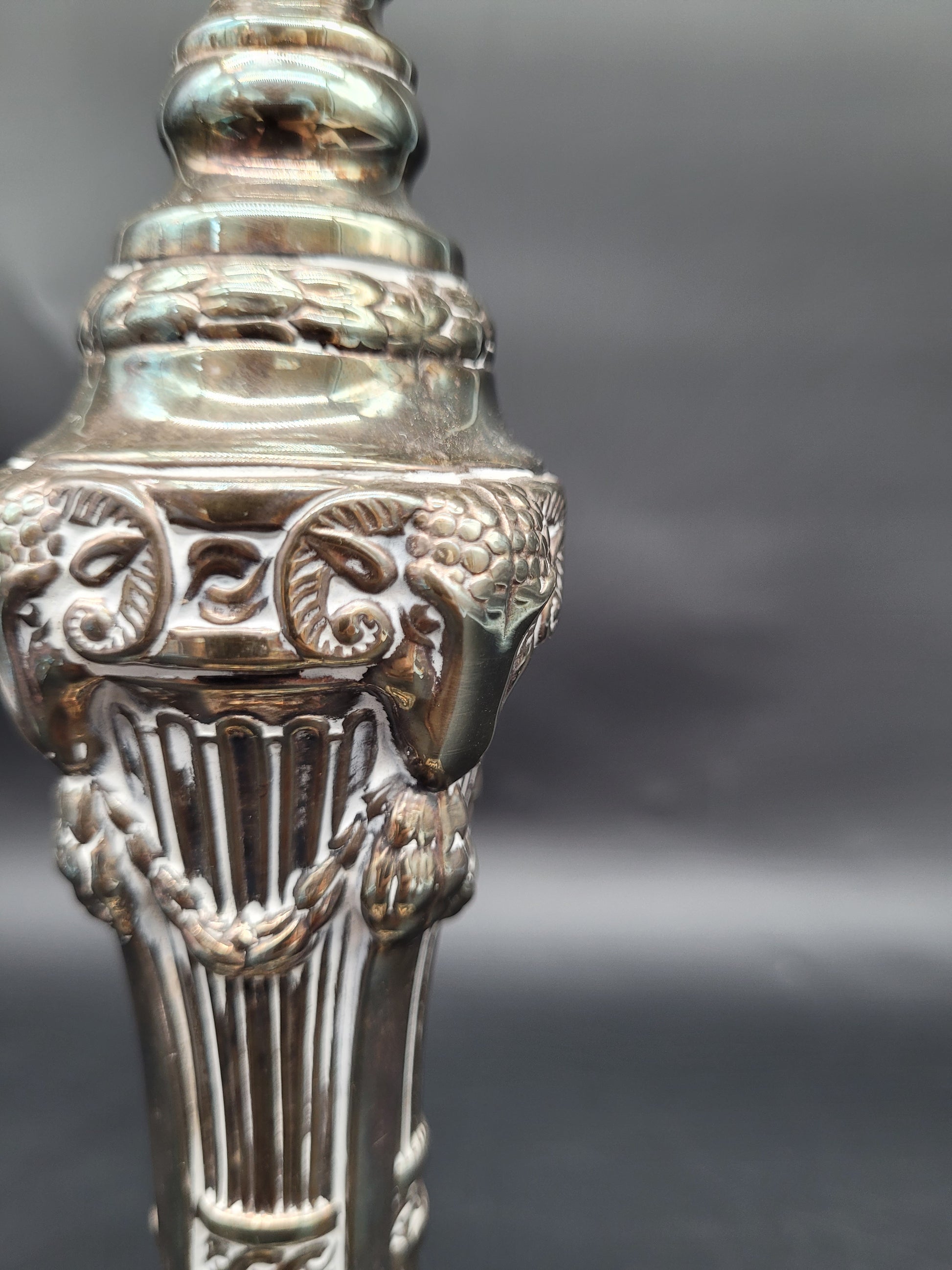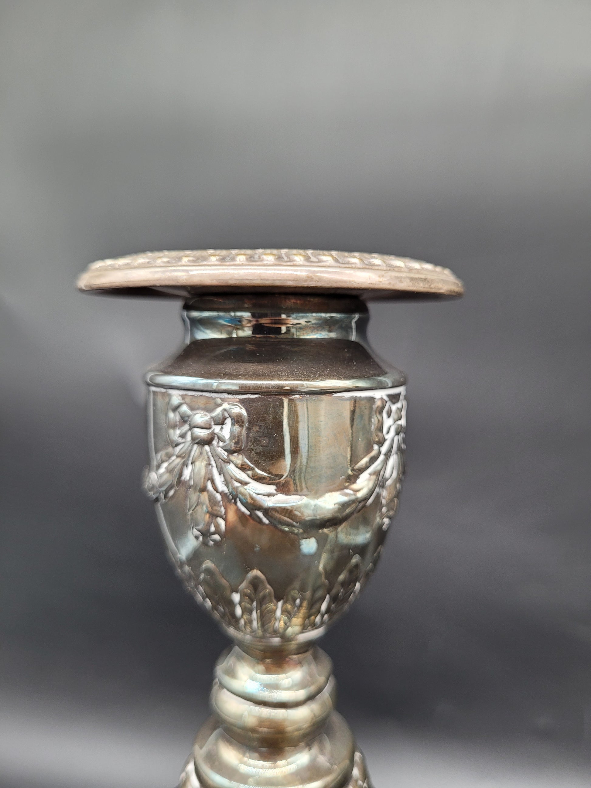 Dieses eindrucksvolle Paar Kerzenständer wurde von einer englischen Manufaktur gefertigt und ist ein exzellentes Beispiel für den neoklassischen Stil. Mit ihren geriffelten Säulen und den aufwendig verzierten Sockeln strahlen sie eine zeitlose Eleganz aus. Dank ihres soliden Gewichts von über 3 Kilogramm sind sie besonders standfest und eignen sich ideal als prunkvolle Tischdekoration.