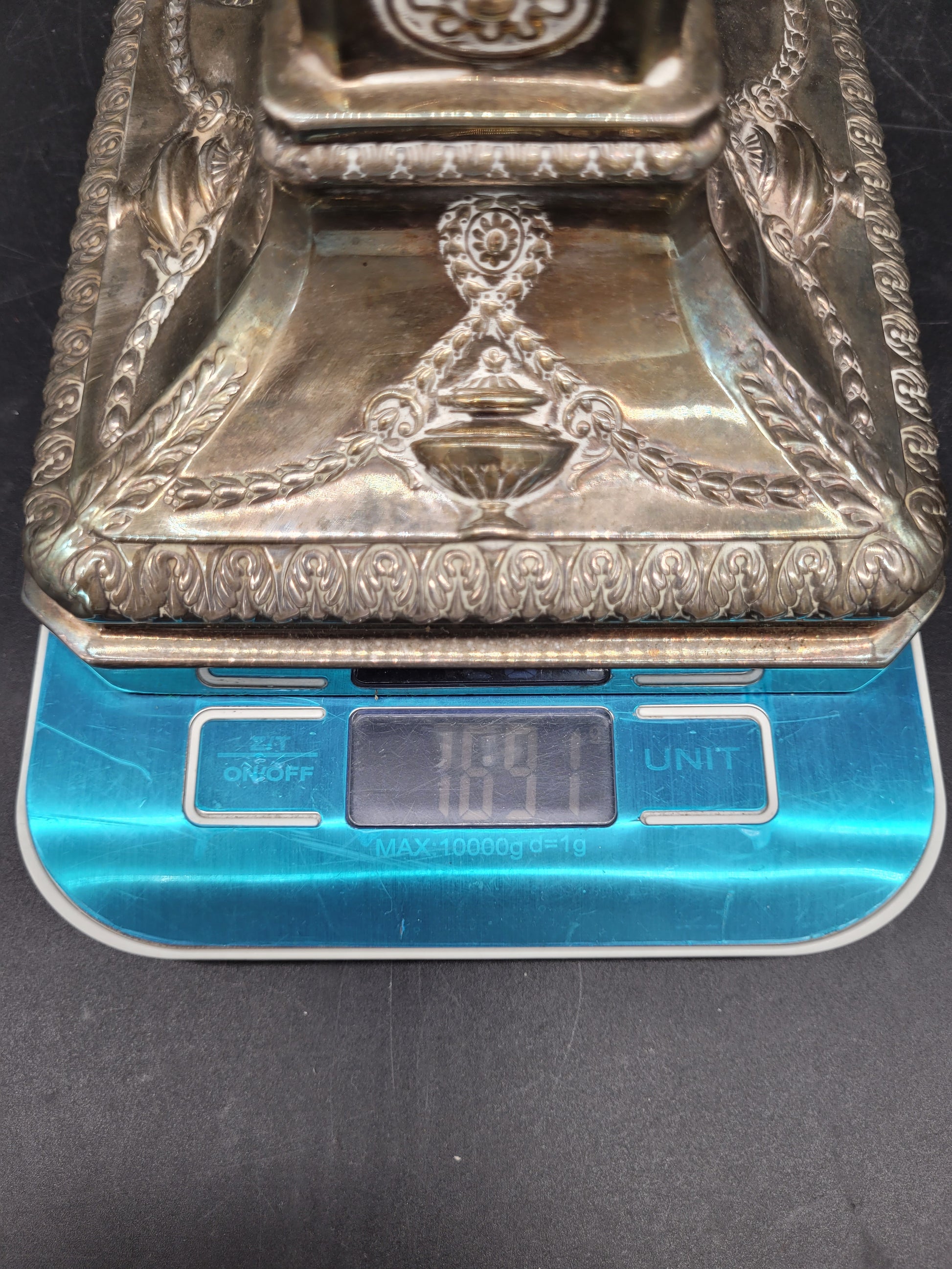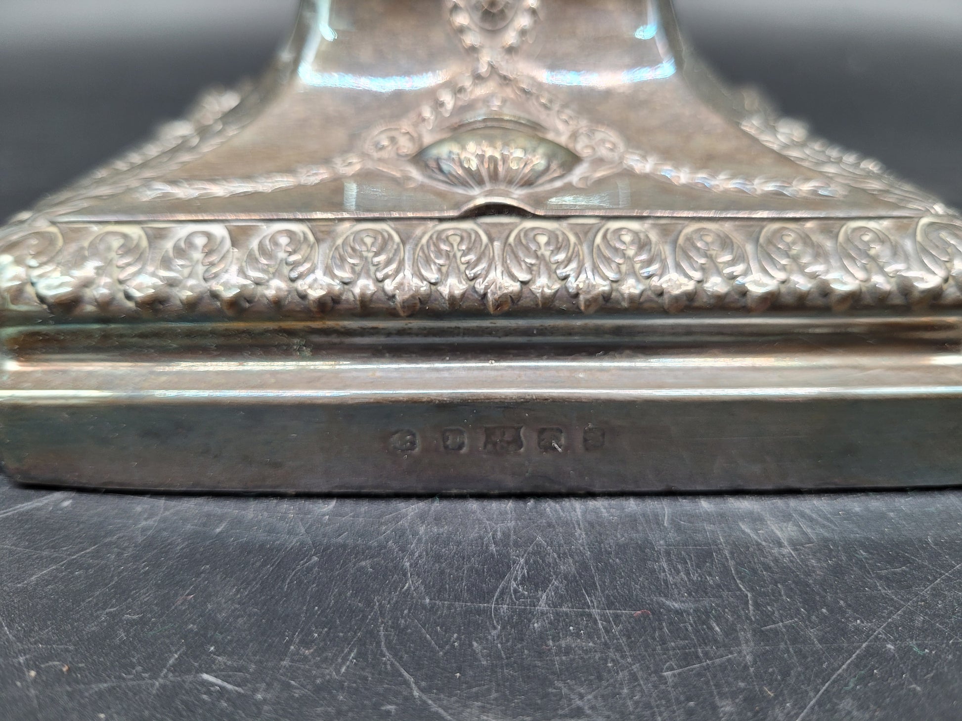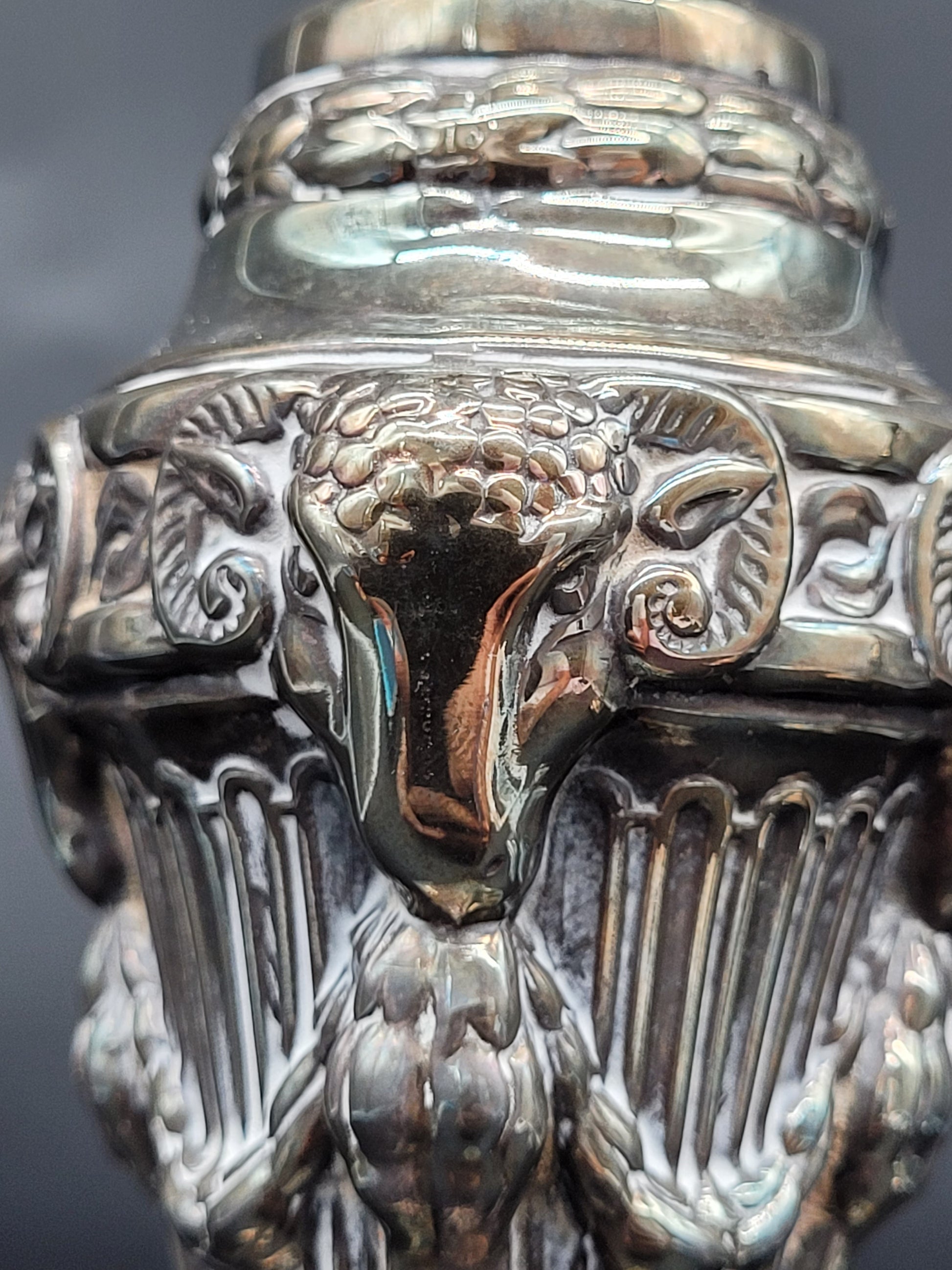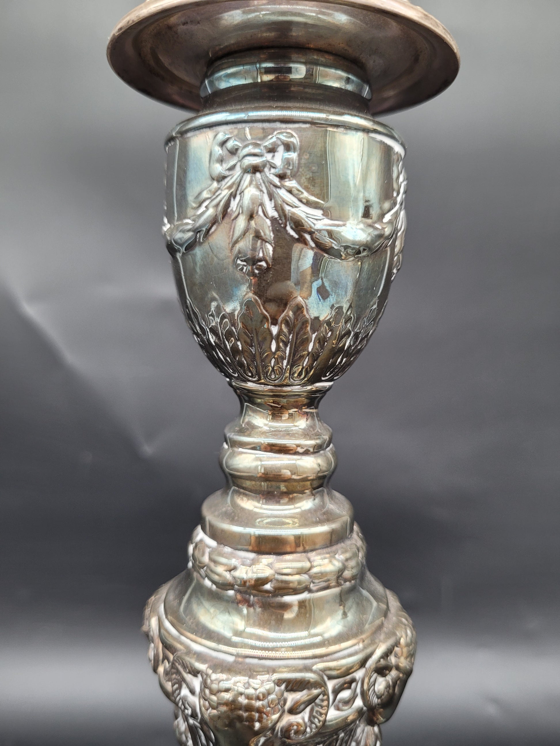 Dieses eindrucksvolle Paar Kerzenständer wurde von einer englischen Manufaktur gefertigt und ist ein exzellentes Beispiel für den neoklassischen Stil. Mit ihren geriffelten Säulen und den aufwendig verzierten Sockeln strahlen sie eine zeitlose Eleganz aus. Dank ihres soliden Gewichts von über 3 Kilogramm sind sie besonders standfest und eignen sich ideal als prunkvolle Tischdekoration.