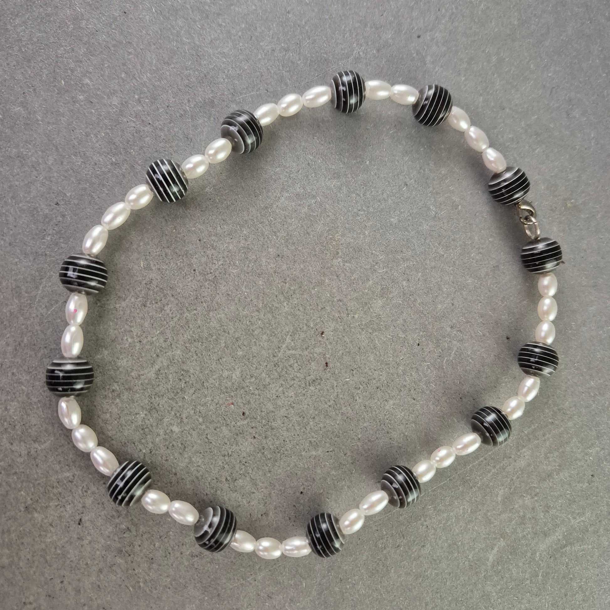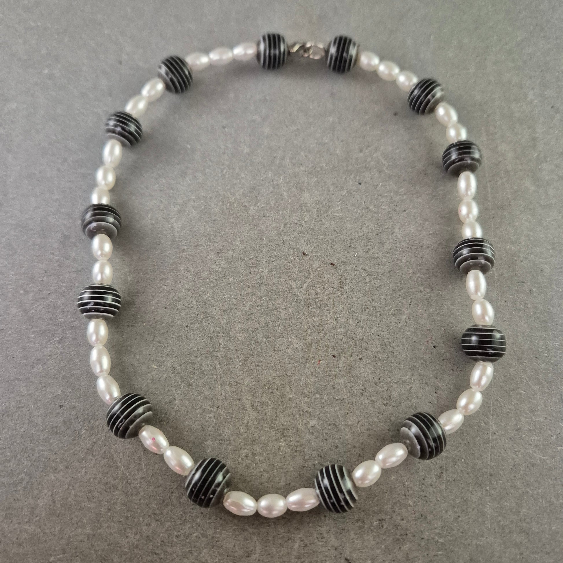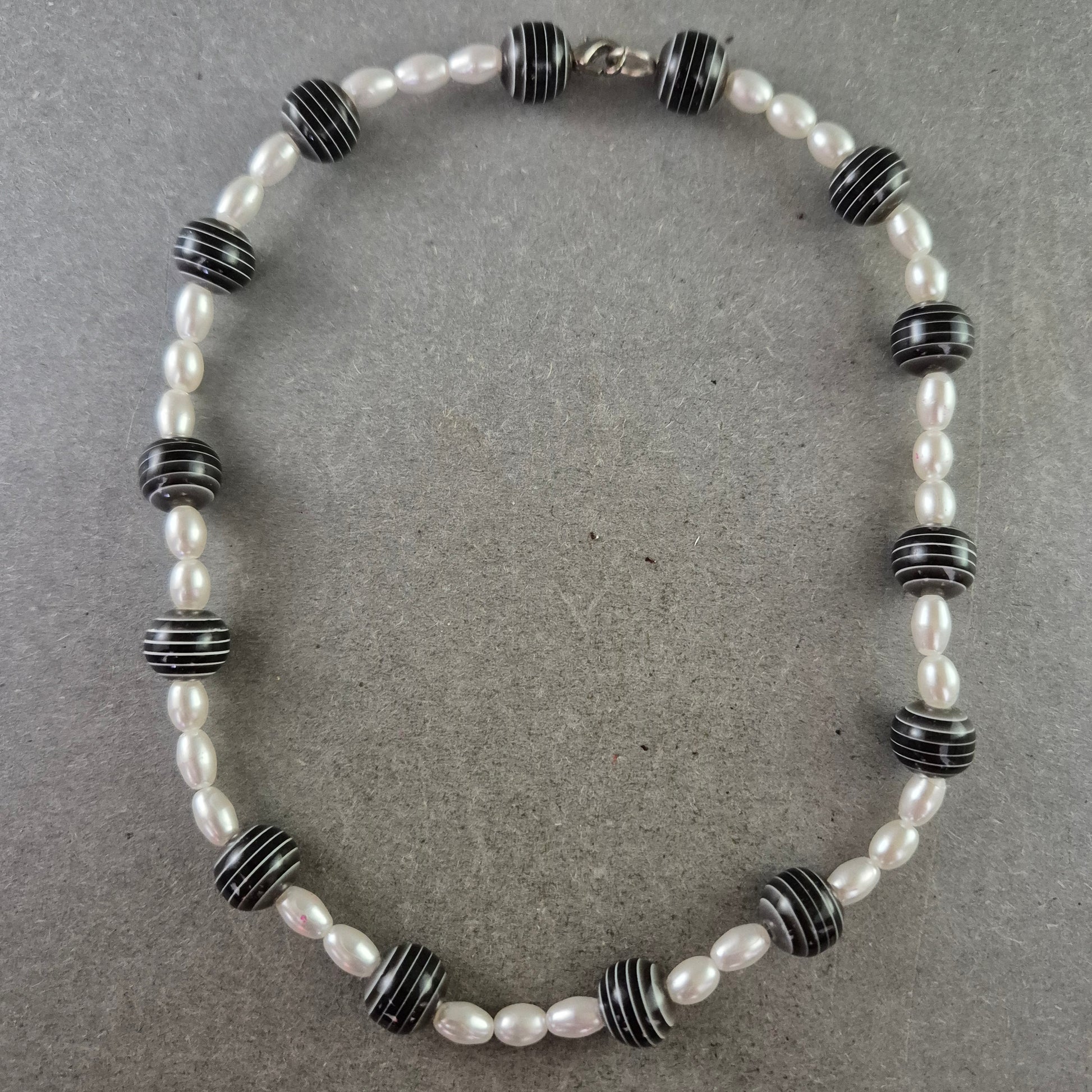 Diese auffällige Perlen Kette kombiniert elegante weiße Perlen mit großen, schwarz gestreiften Kugeln, die für einen modernen Kontrasteffekt sorgen. Mit einer Gesamtlänge von ca. 34 cm (geschlossen gemessen ca. 17 cm) liegt sie nah am Hals und ist ein stilvoller Blickfang für besondere Anlässe.