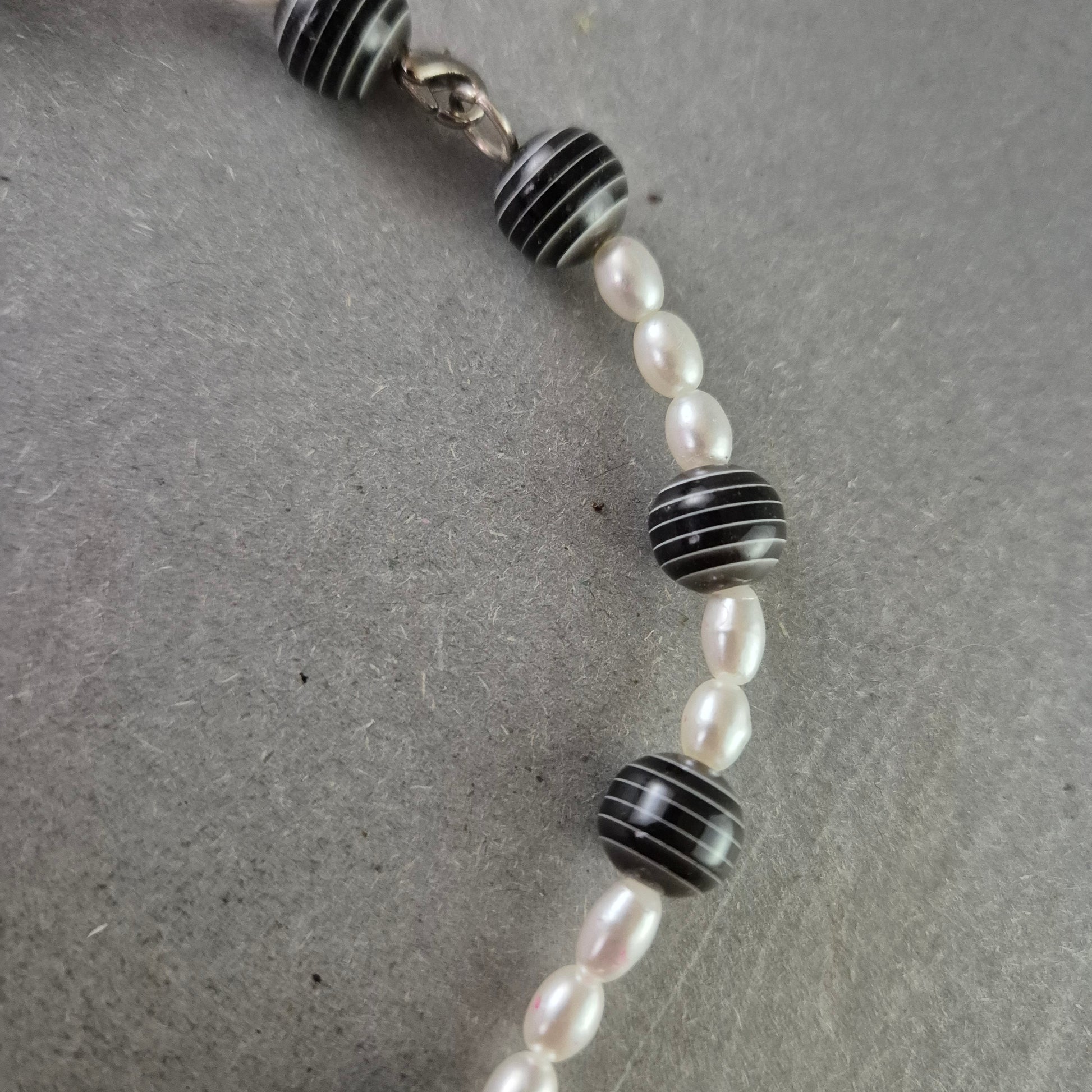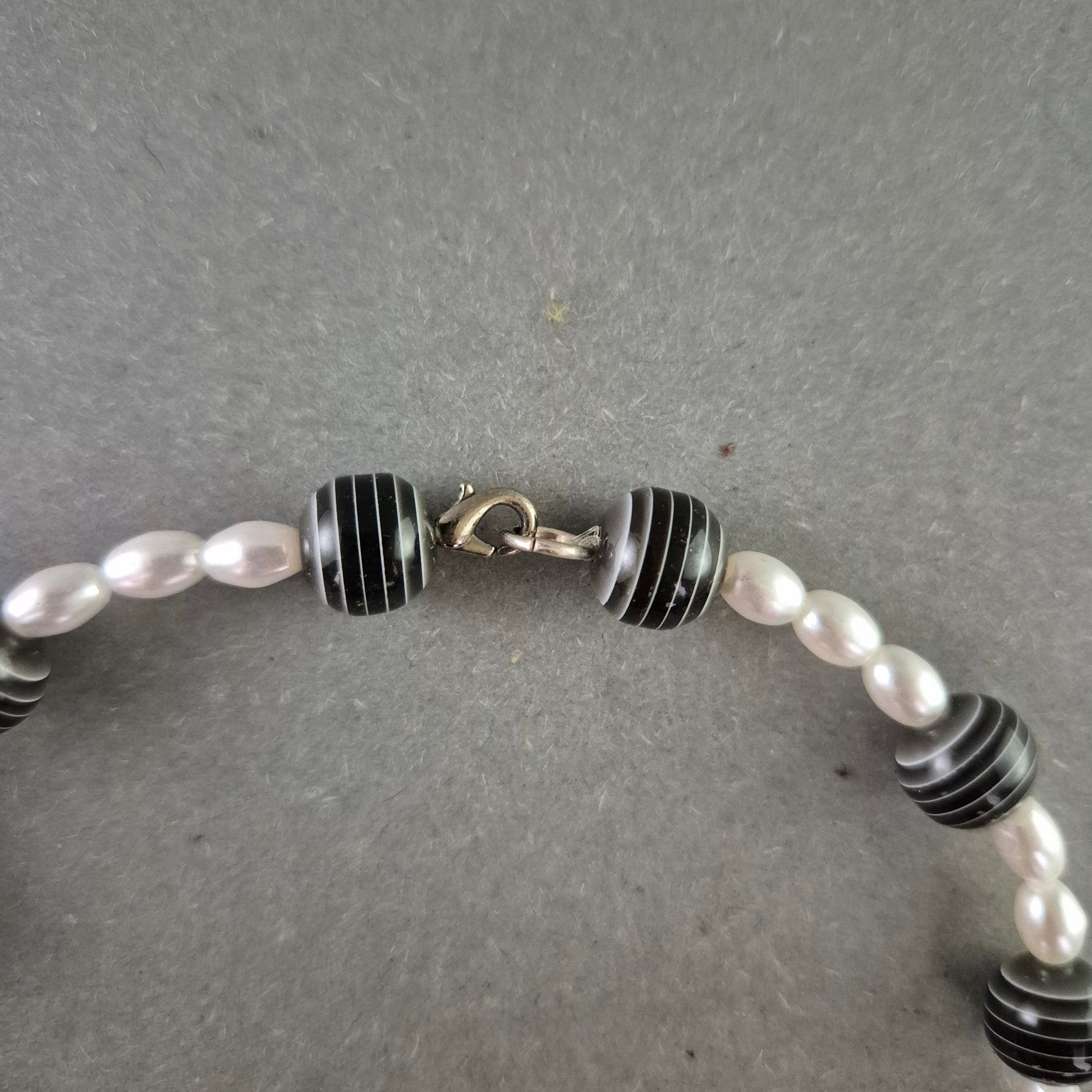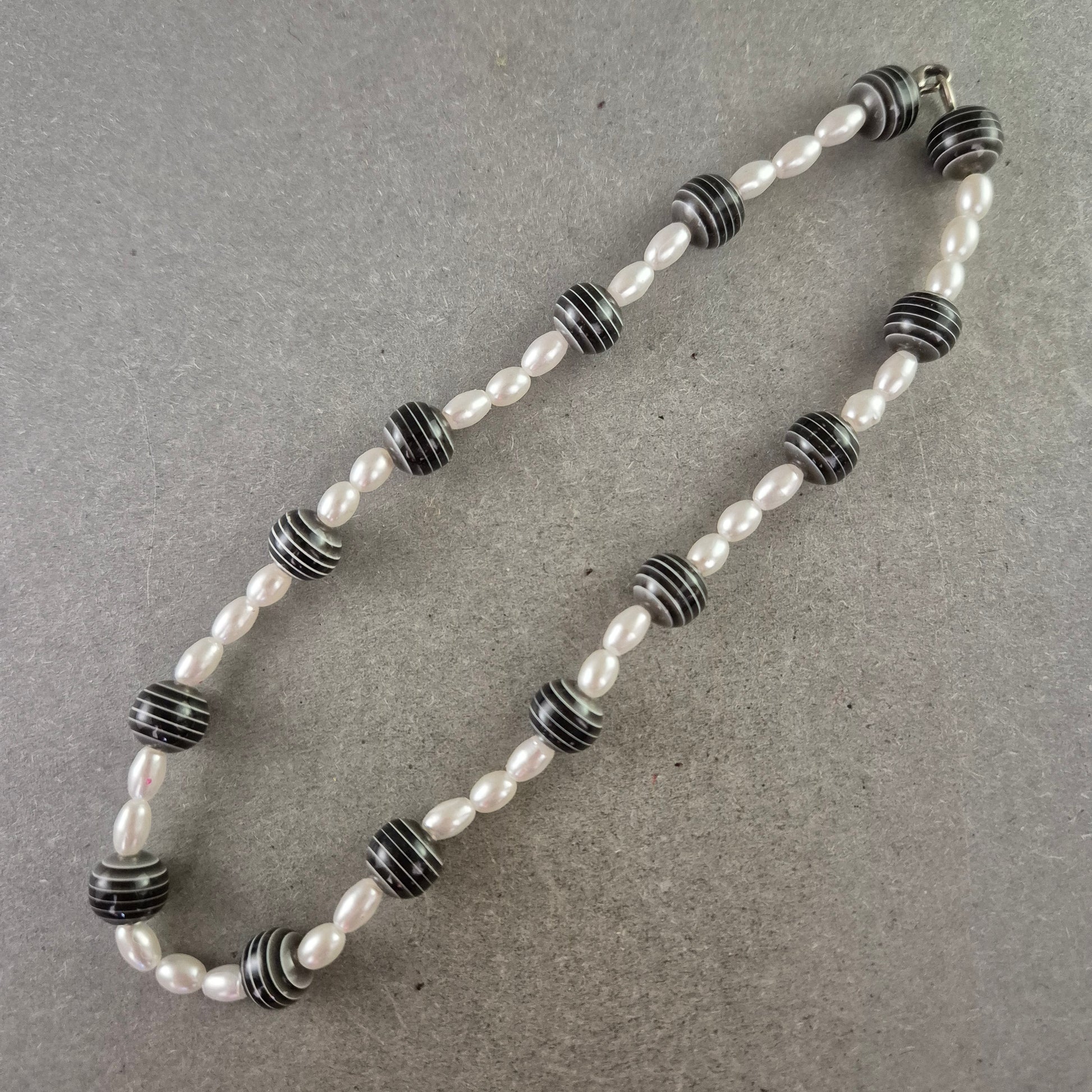 Diese auffällige Perlen Kette kombiniert elegante weiße Perlen mit großen, schwarz gestreiften Kugeln, die für einen modernen Kontrasteffekt sorgen. Mit einer Gesamtlänge von ca. 34 cm (geschlossen gemessen ca. 17 cm) liegt sie nah am Hals und ist ein stilvoller Blickfang für besondere Anlässe.