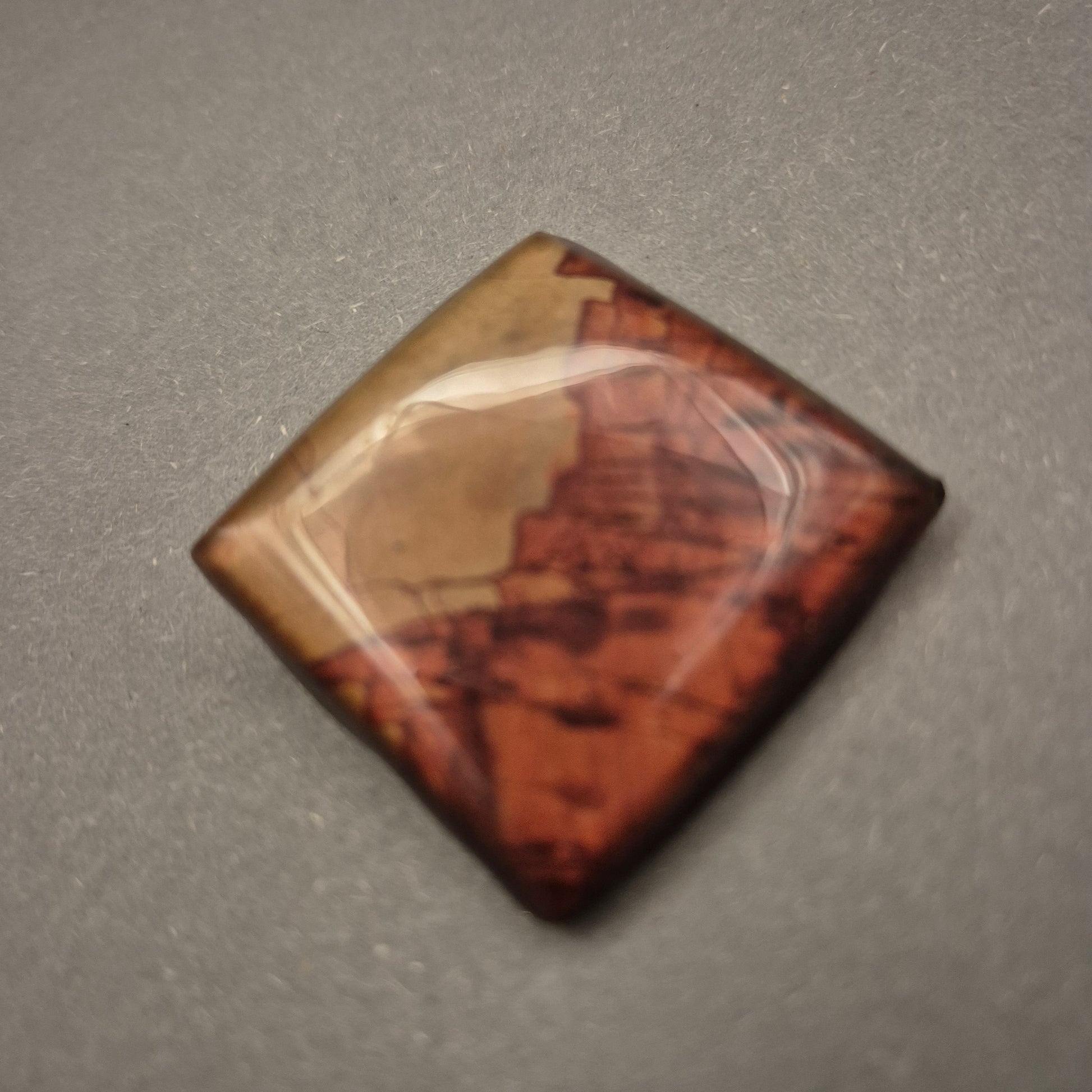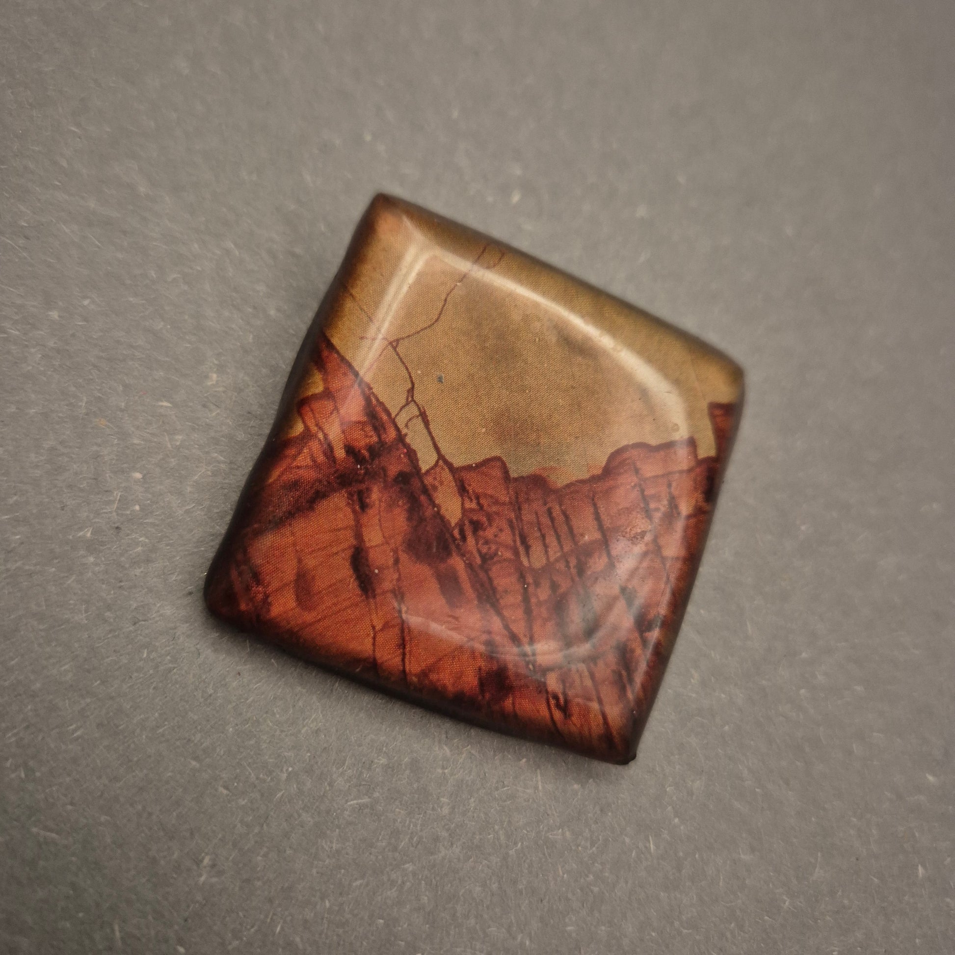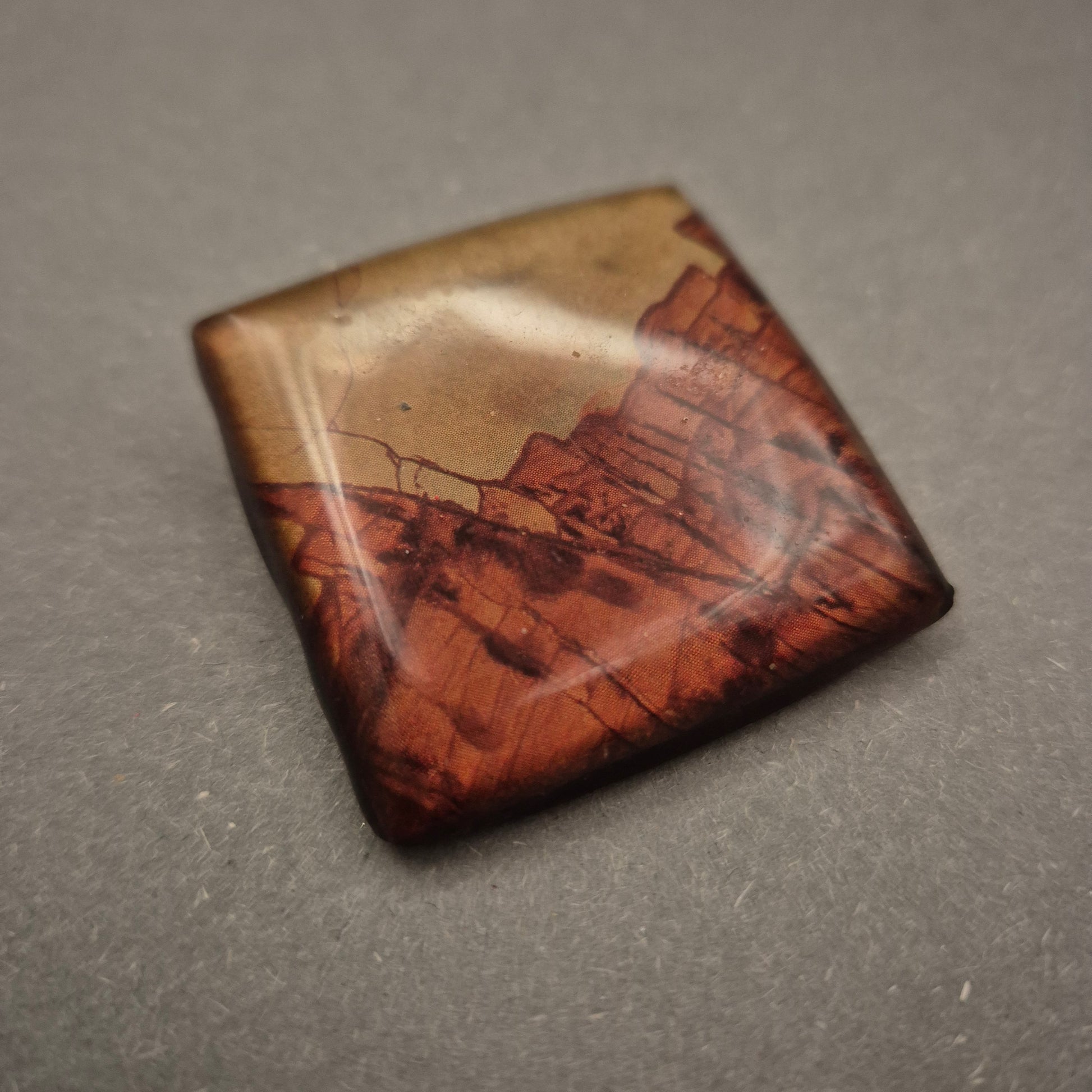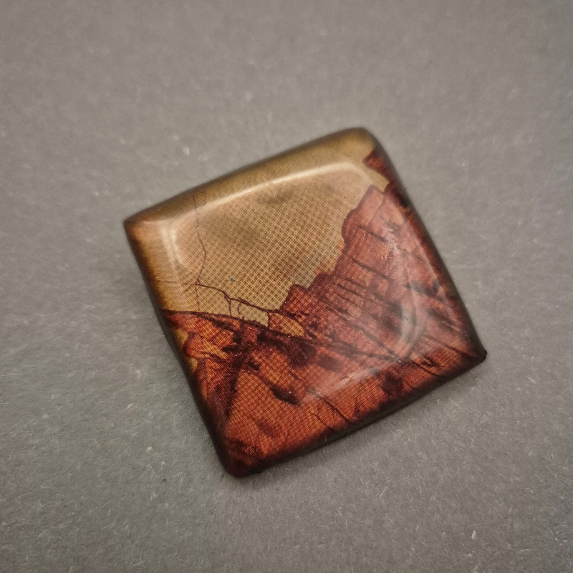 Diese außergewöhnliche Brosche besticht durch ihr quadratisches Design mit einem stimmungsvollen Landschafts-Print in warmen Braun- und Rottönen. Das Motiv erinnert an eine Felslandschaft im Sonnenlicht und verleiht jedem Outfit einen Hauch von Vintage-Ästhetik. Rückseitig befindet sich eine stabile Metallschließe zum einfachen Befestigen an Jacken oder Blusen.