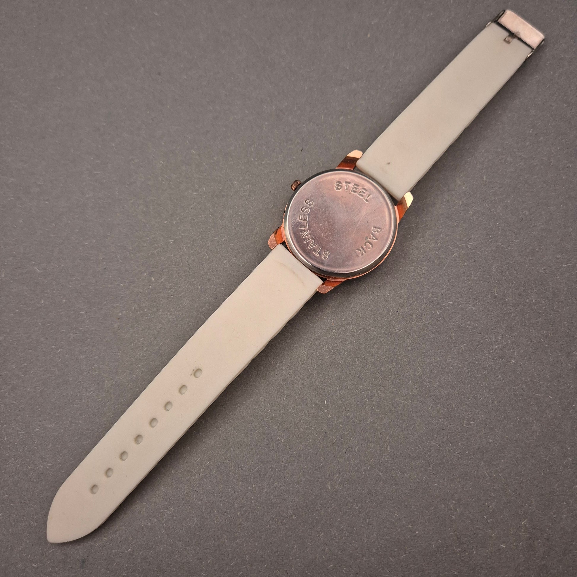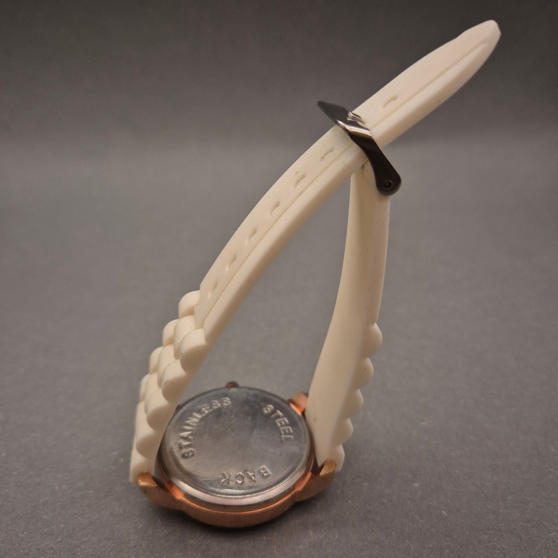 • Material: Metallgehäuse (Roségold-Optik), Silikon/Kautschuk-Armband (weiß), Strass-Besatz