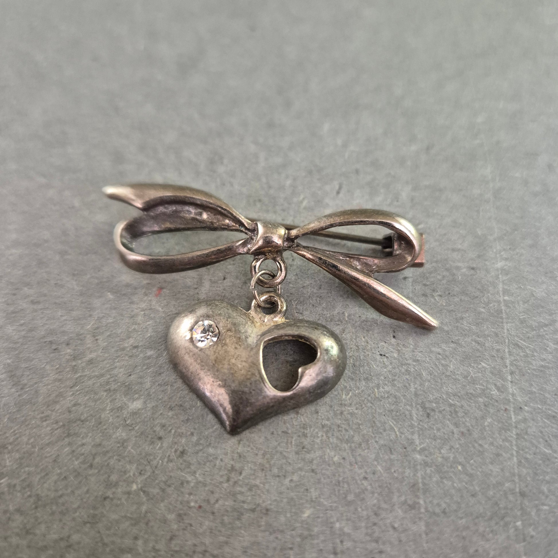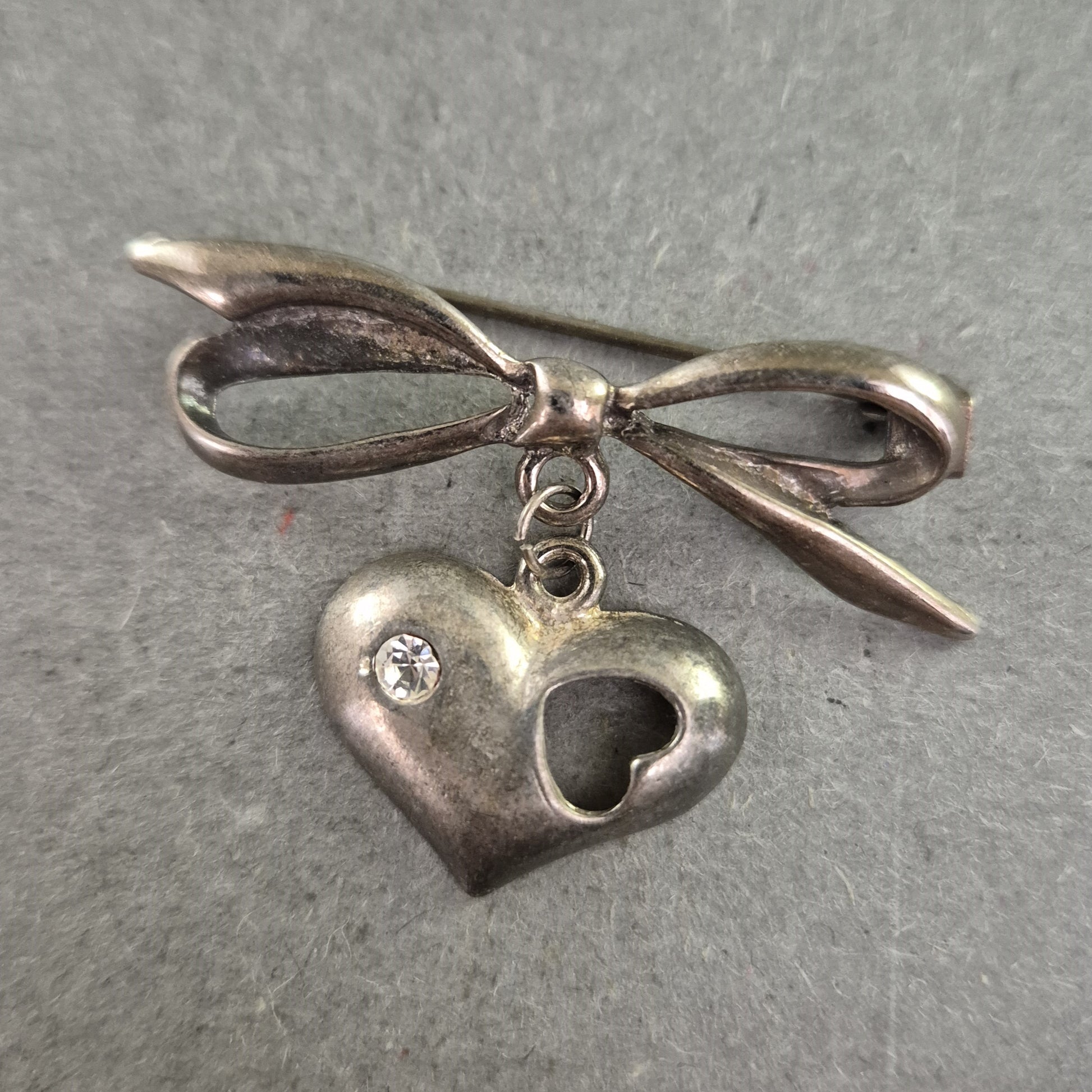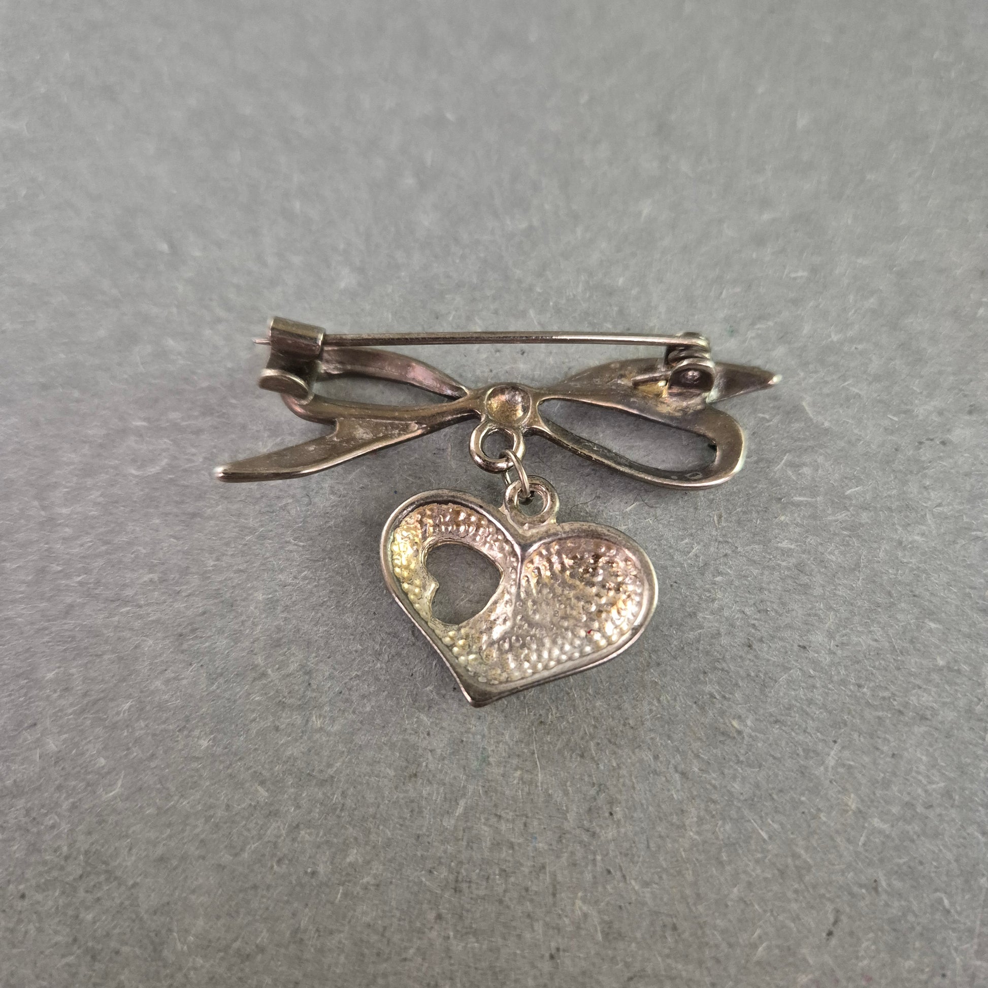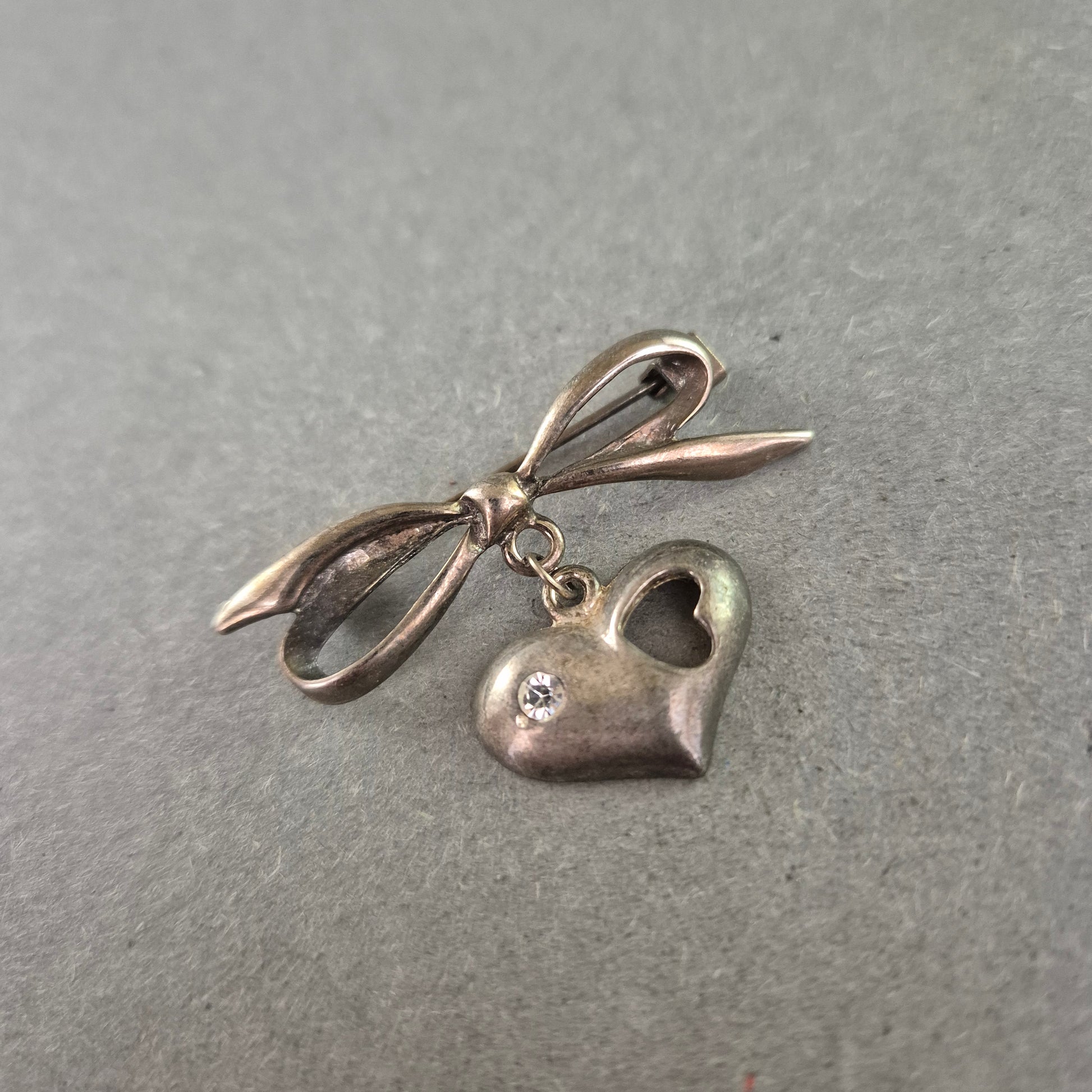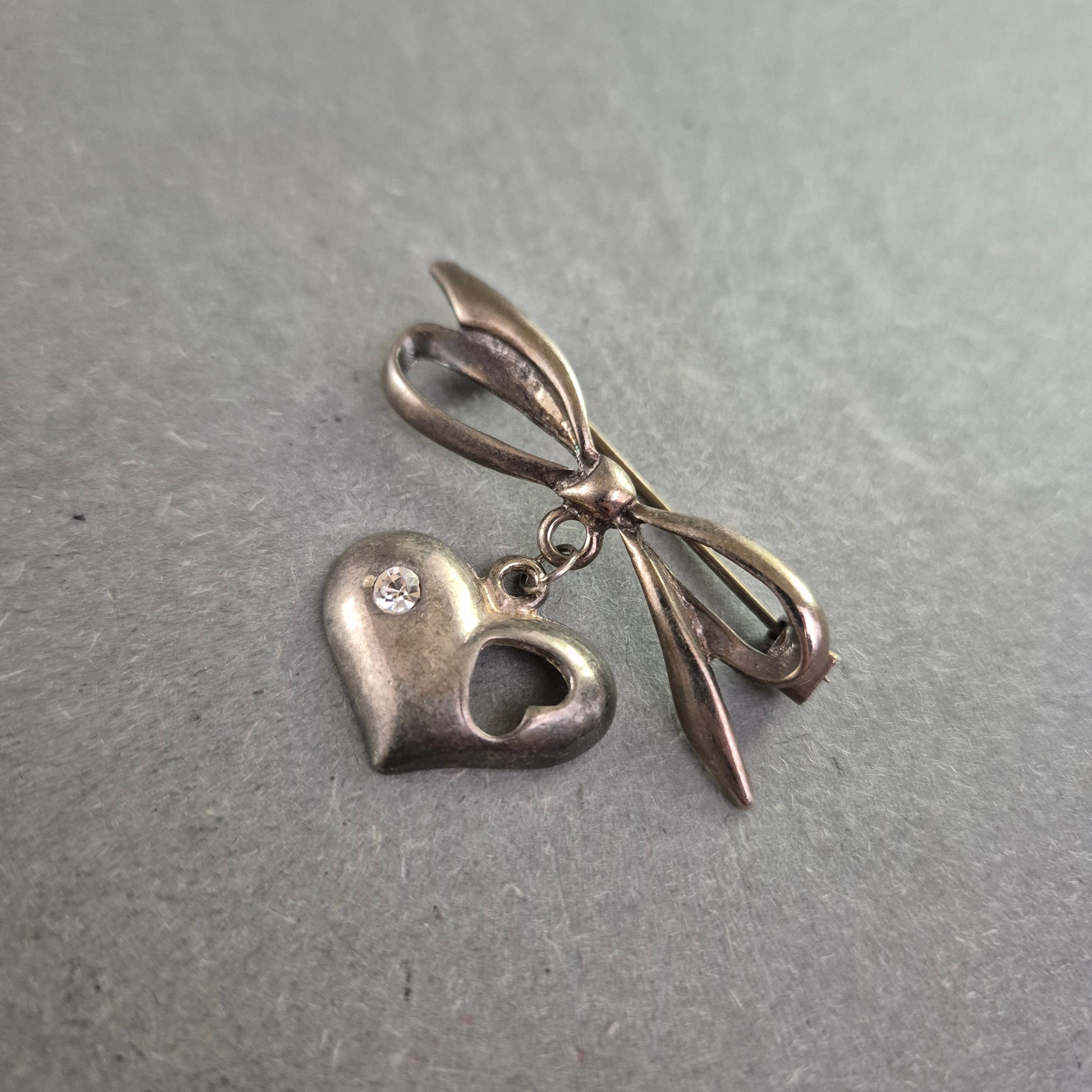 Diese verspielte Vintage-Brosche zeigt eine filigrane Schleife mit einem herabhängenden Herzanhänger. Das Herz ist mit einem kleinen Strassstein besetzt und besitzt eine herzförmige Aussparung – ein charmantes Detail, das Liebe und Eleganz vereint. Die silberfarbene Patina verleiht der Brosche einen zarten Retro-Look.