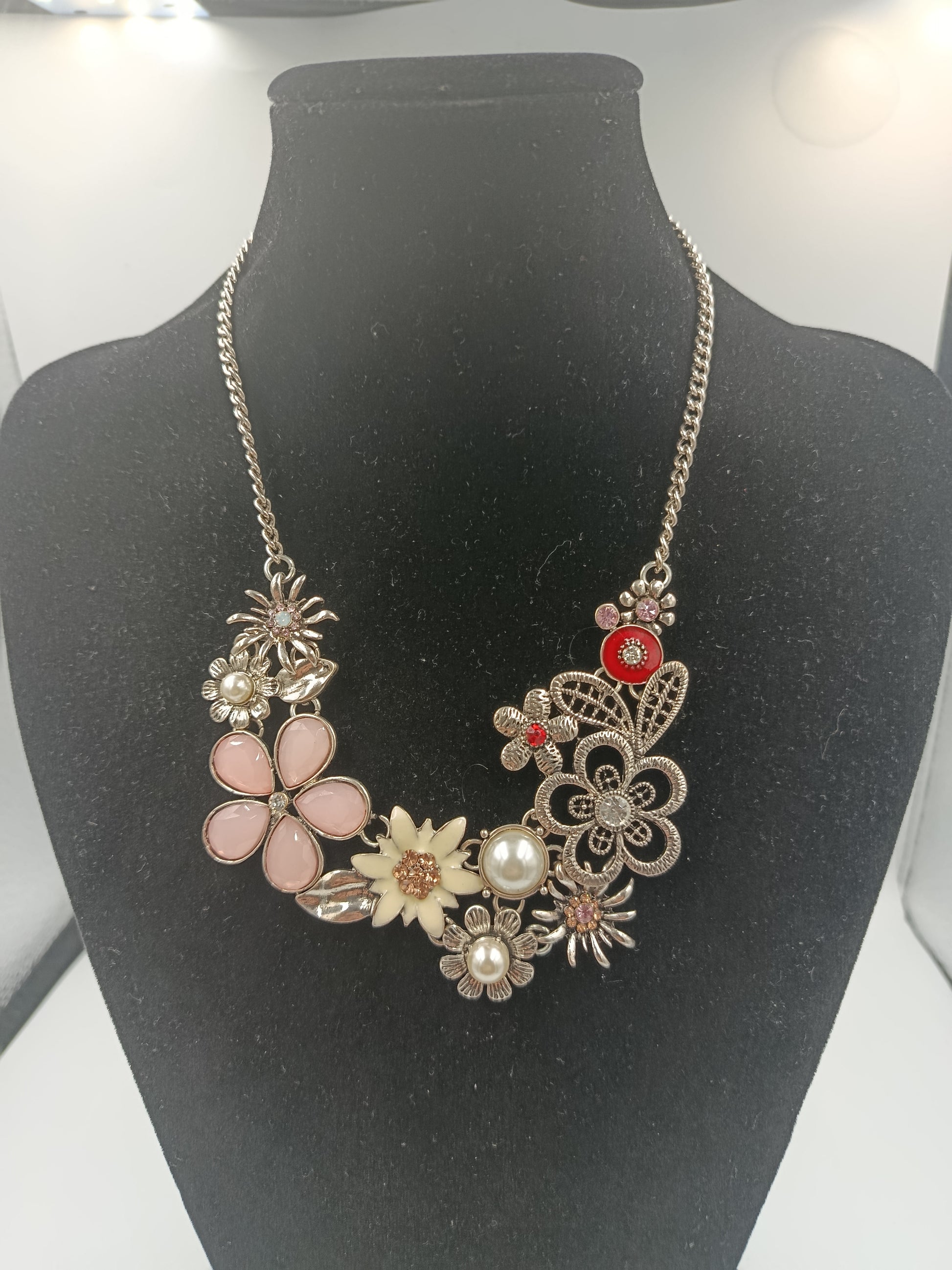 Diese auffällige Statement-Kette vereint romantische Eleganz mit verspielten Details. Die floralen Elemente in Silberoptik sind kunstvoll mit pastellfarbenem Emaille, funkelnden Strasssteinen und zarten Perlen verziert. Ein besonderes Schmuckstück, das jedes Outfit sofort aufwertet – ideal für festliche Anlässe oder als stilvolles Highlight im Alltag.