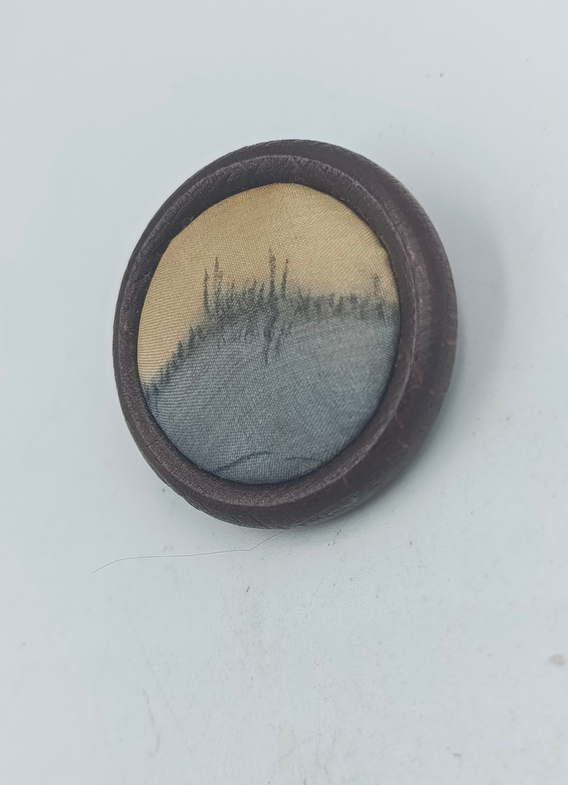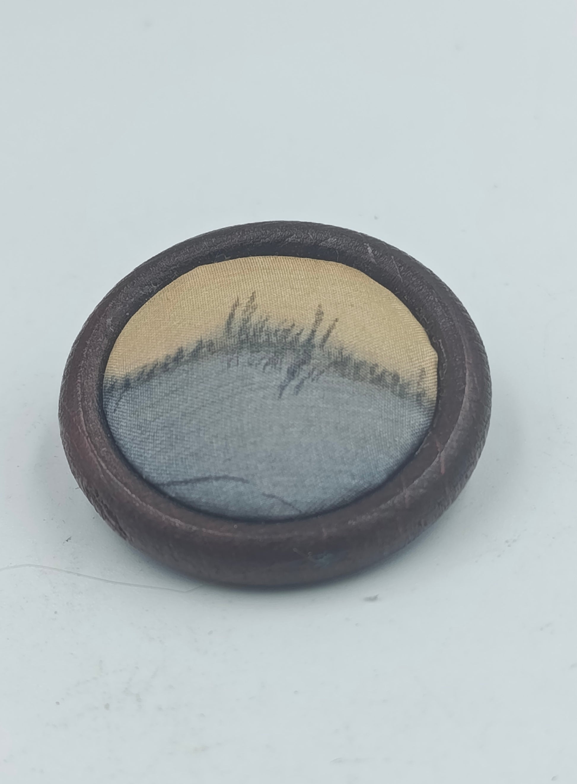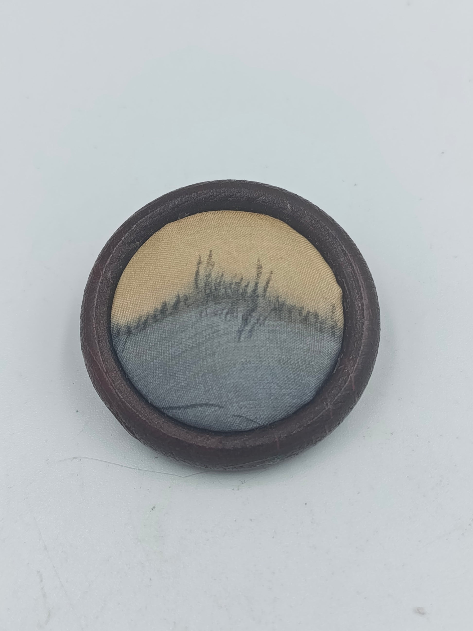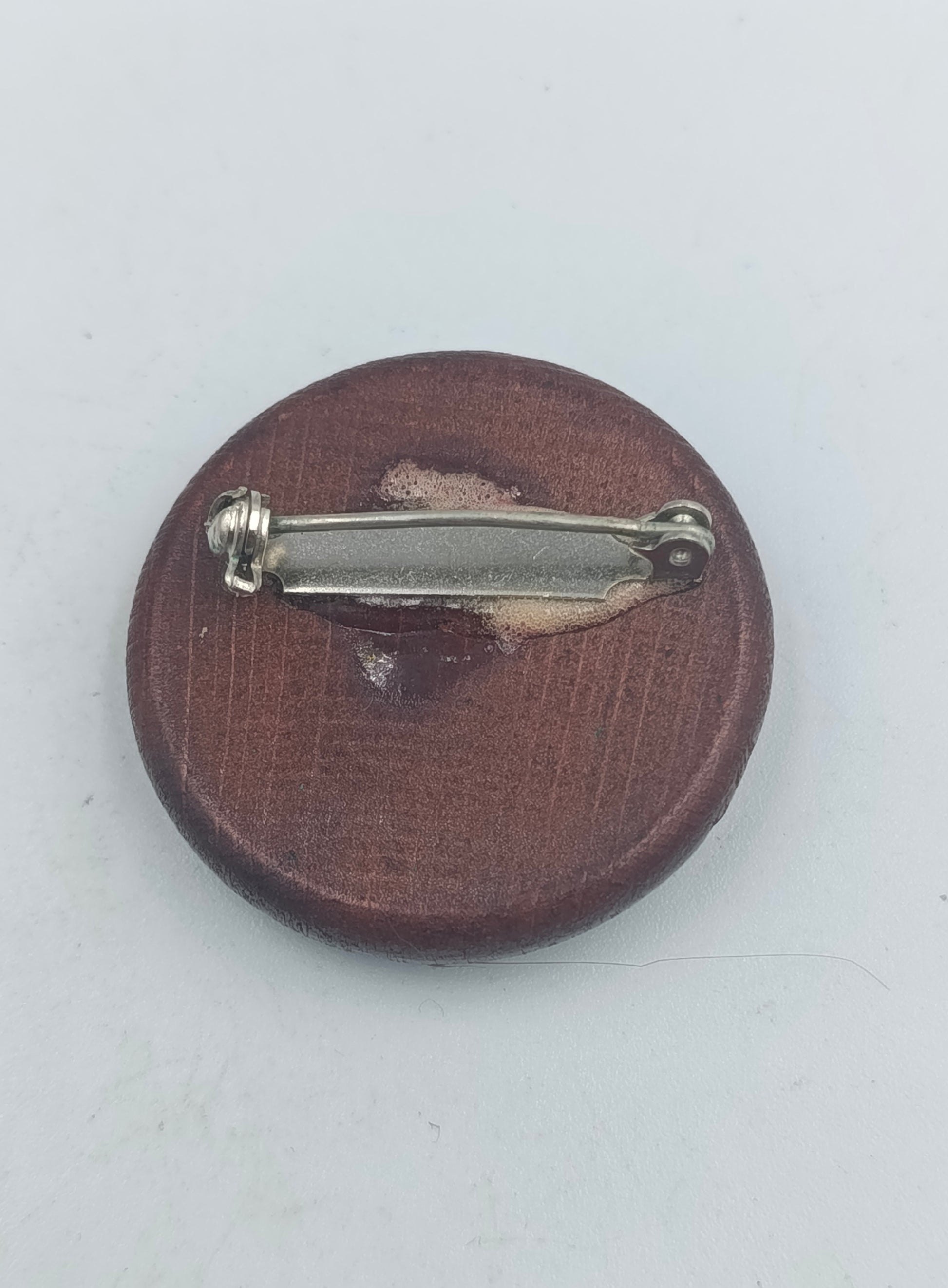 Runde Brosche mit Stoffmuster und Holzrahmen im Vintage Stil