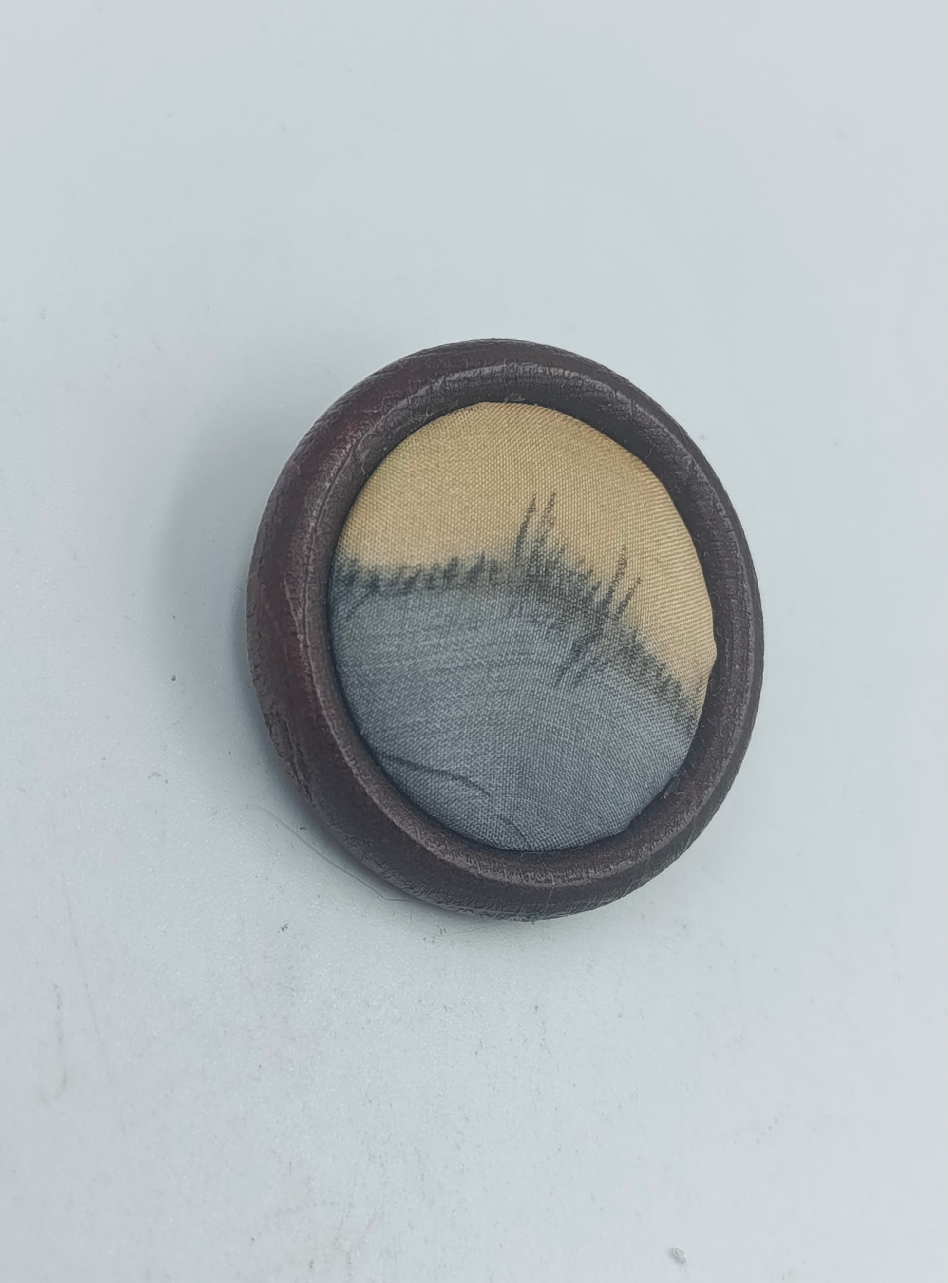 Schlichte und dennoch besondere runde Brosche mit Stoffeinsatz in Naturtönen und einem dunklen Holzrahmen. Das dezente Design verleiht ihr einen natürlichen und nostalgischen Charme – ideal für Blusen, Schals oder Jacken.