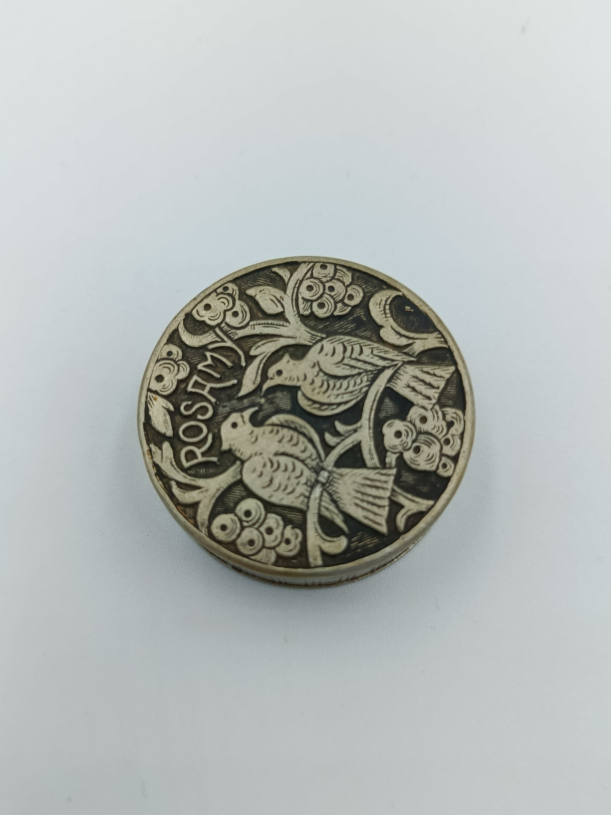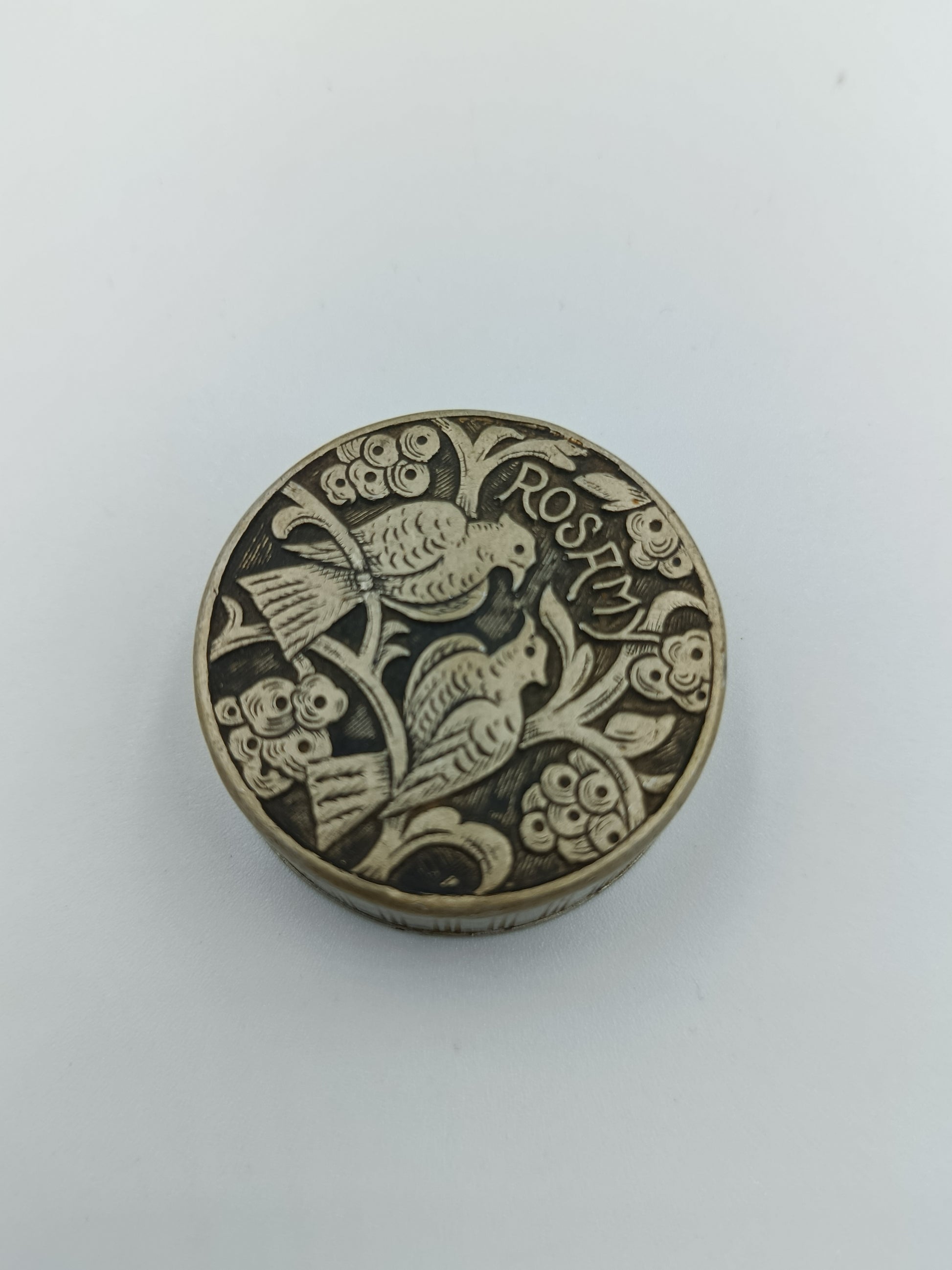 Kleine, runde Vintage-Dose aus Metall mit filigranem Reliefmotiv: zwei Vögel inmitten von Blumen und Zweigen, umrahmt vom Schriftzug „ROSAMY“. Perfekt als Sammlerstück oder zur Aufbewahrung von kleinen Dingen wie Pillen oder Schmuck.