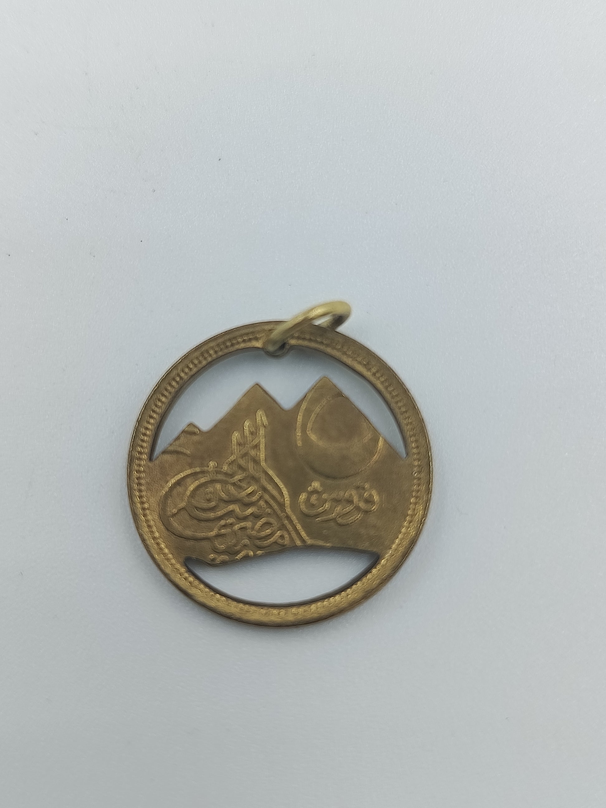 Kleiner runder Anhänger aus Messing oder vergoldetem Metall, mit filigraner Aussparung und dekorativer Gravur. Auf der Vorderseite sind arabische Schriftzeichen und ein Halbmond-Motiv zu sehen, die Rückseite ist glatt.
