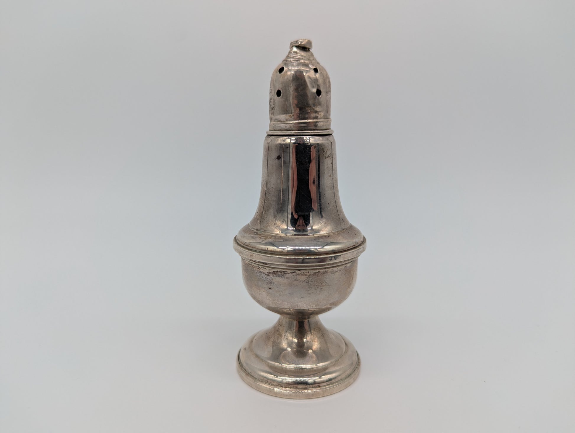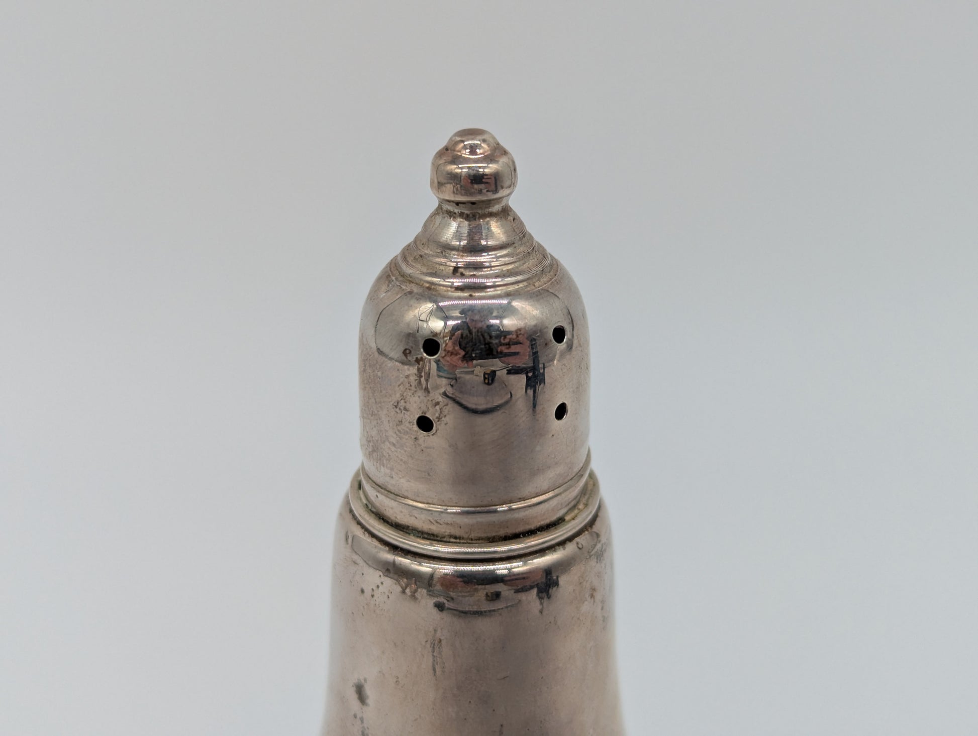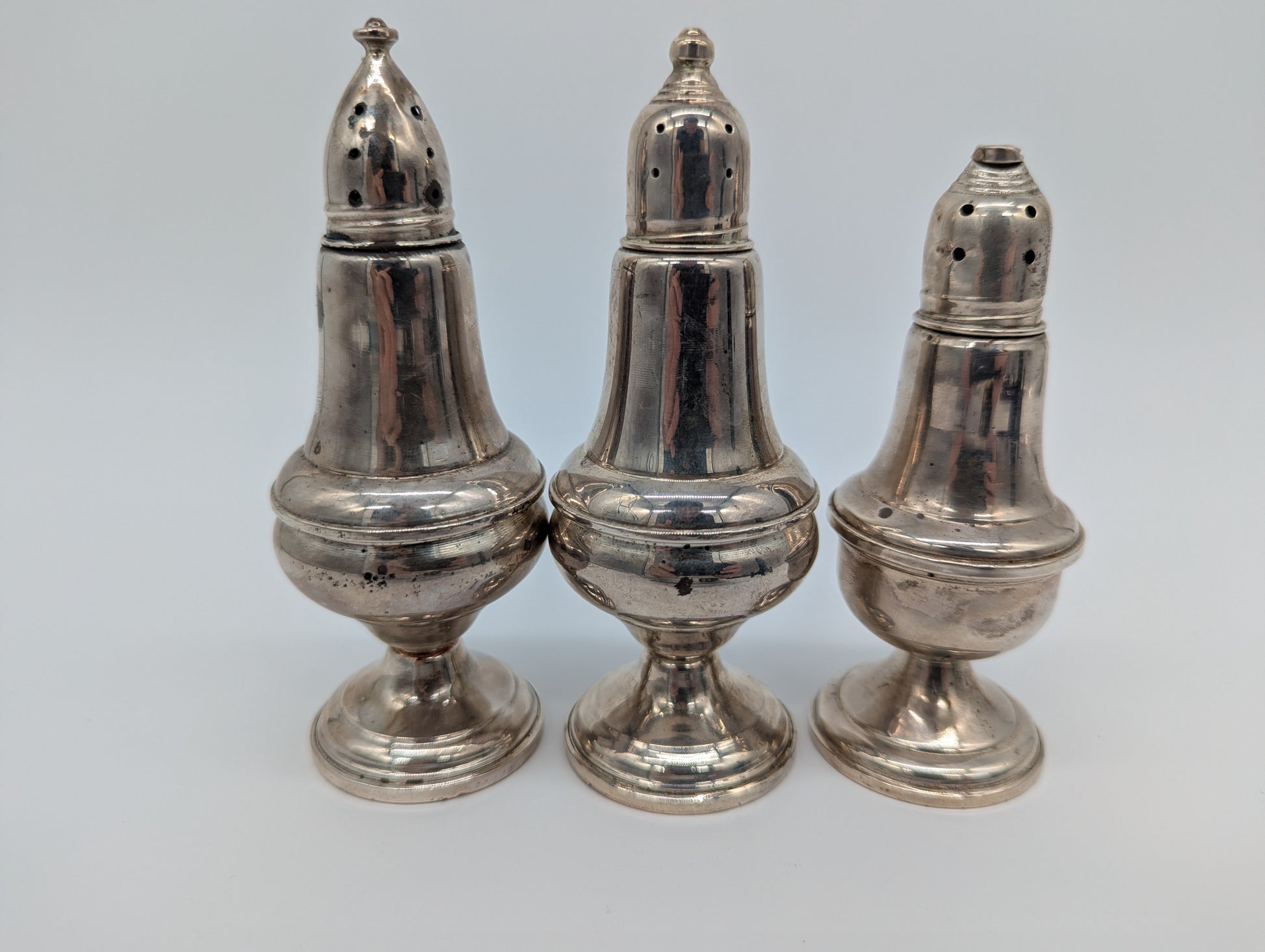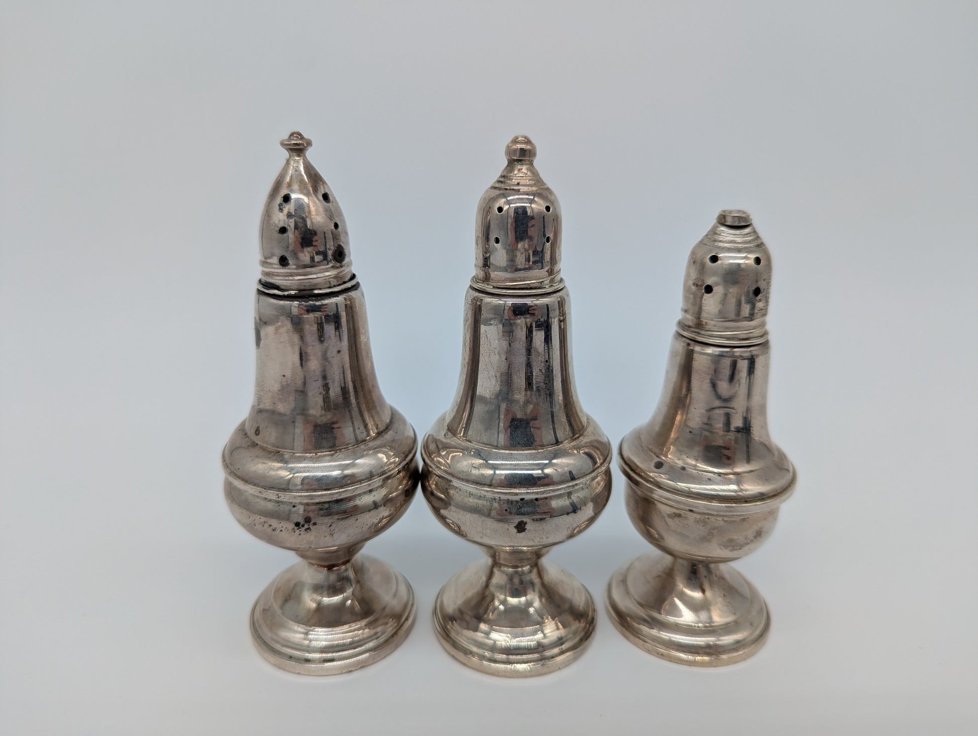 Dieses elegante Set umfasst drei Salz- und Pfefferstreuer aus 925er Sterling Silber in klassischer Balusterform. Mit Höhen zwischen 11 cm und 13 cm und einem Gesamtgewicht von 513 g bestechen die Stücke durch ihre solide Verarbeitung und edle Erscheinung. Die Streuer zeigen leichte Gebrauchsspuren, befinden sich jedoch in gutem Zustand und bringen mit ihrer schönen Patina antiken Charme auf den Tisch.