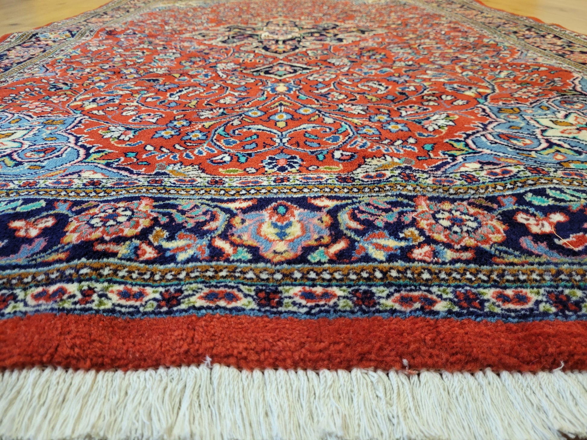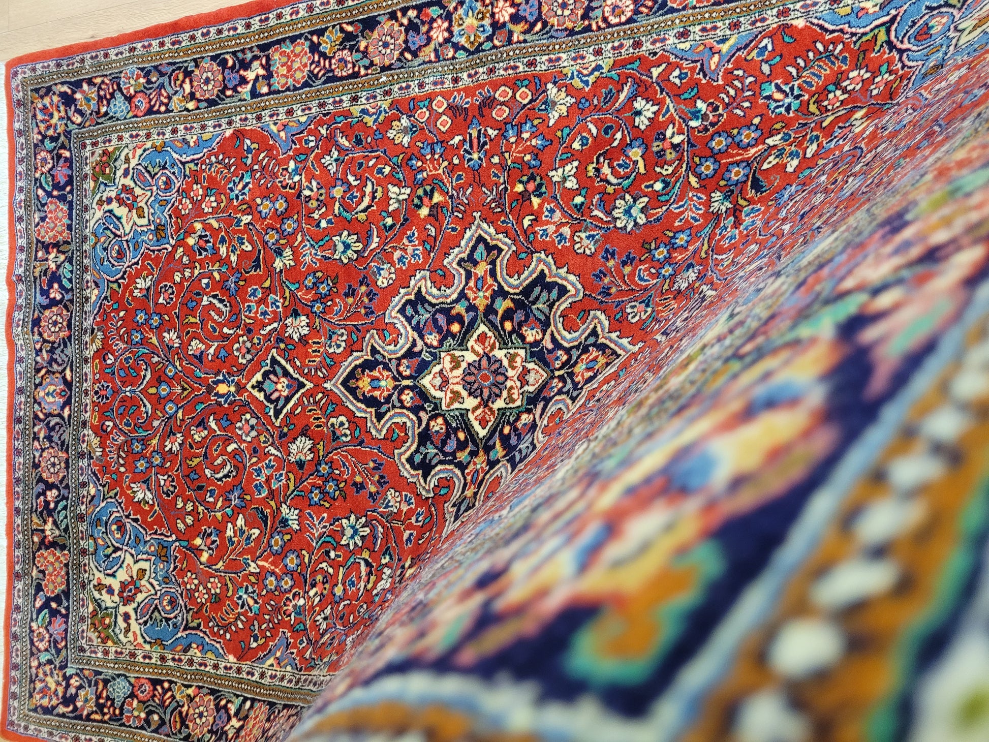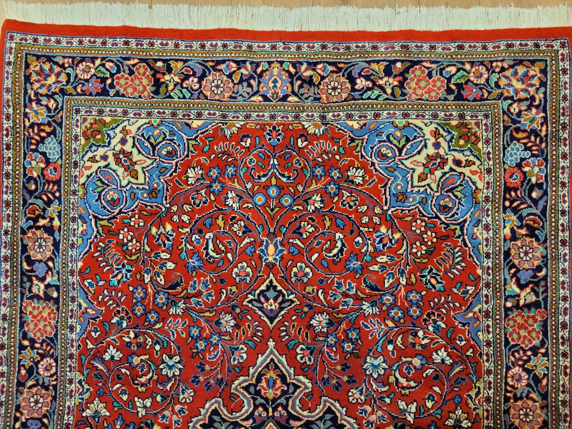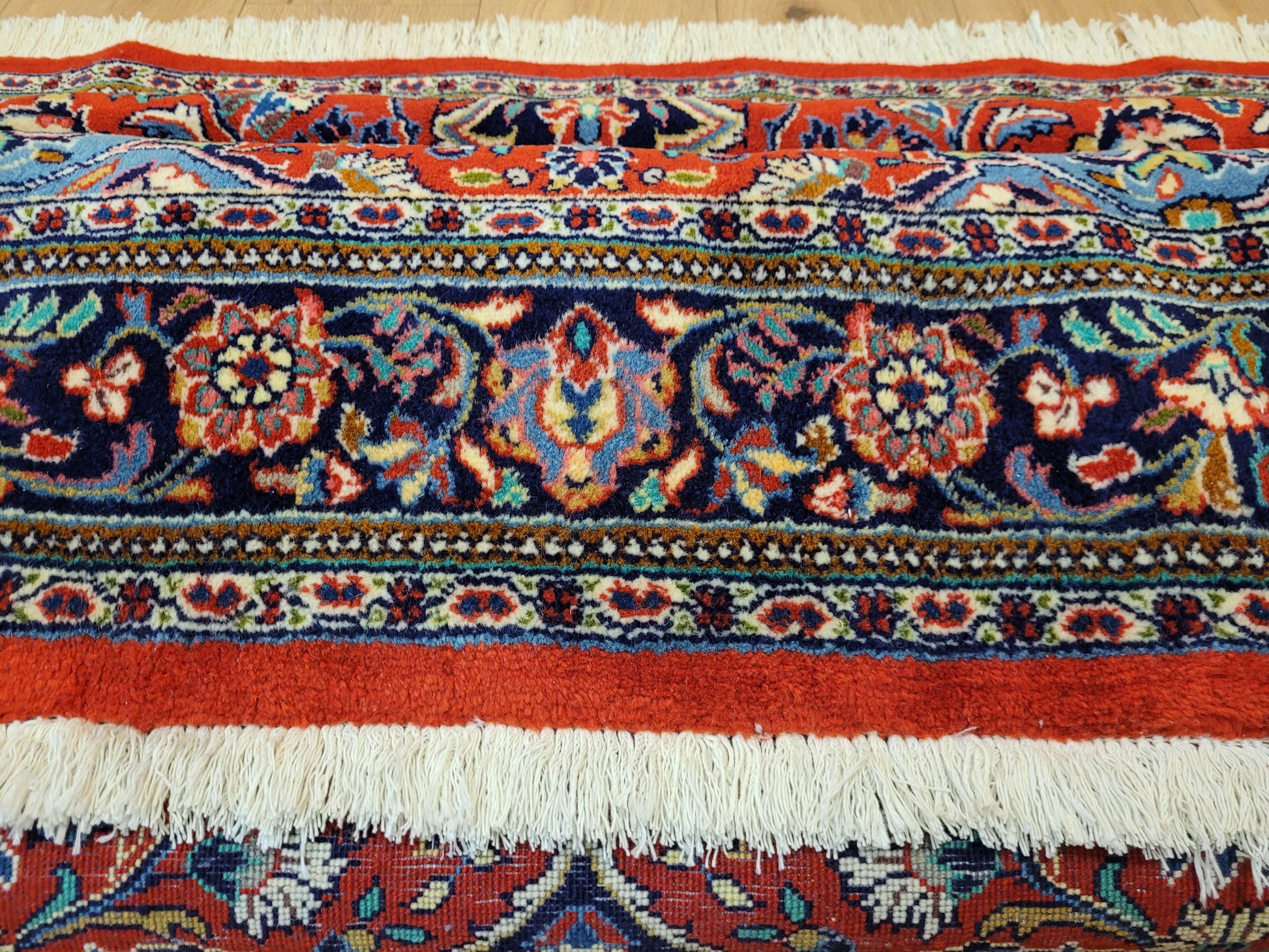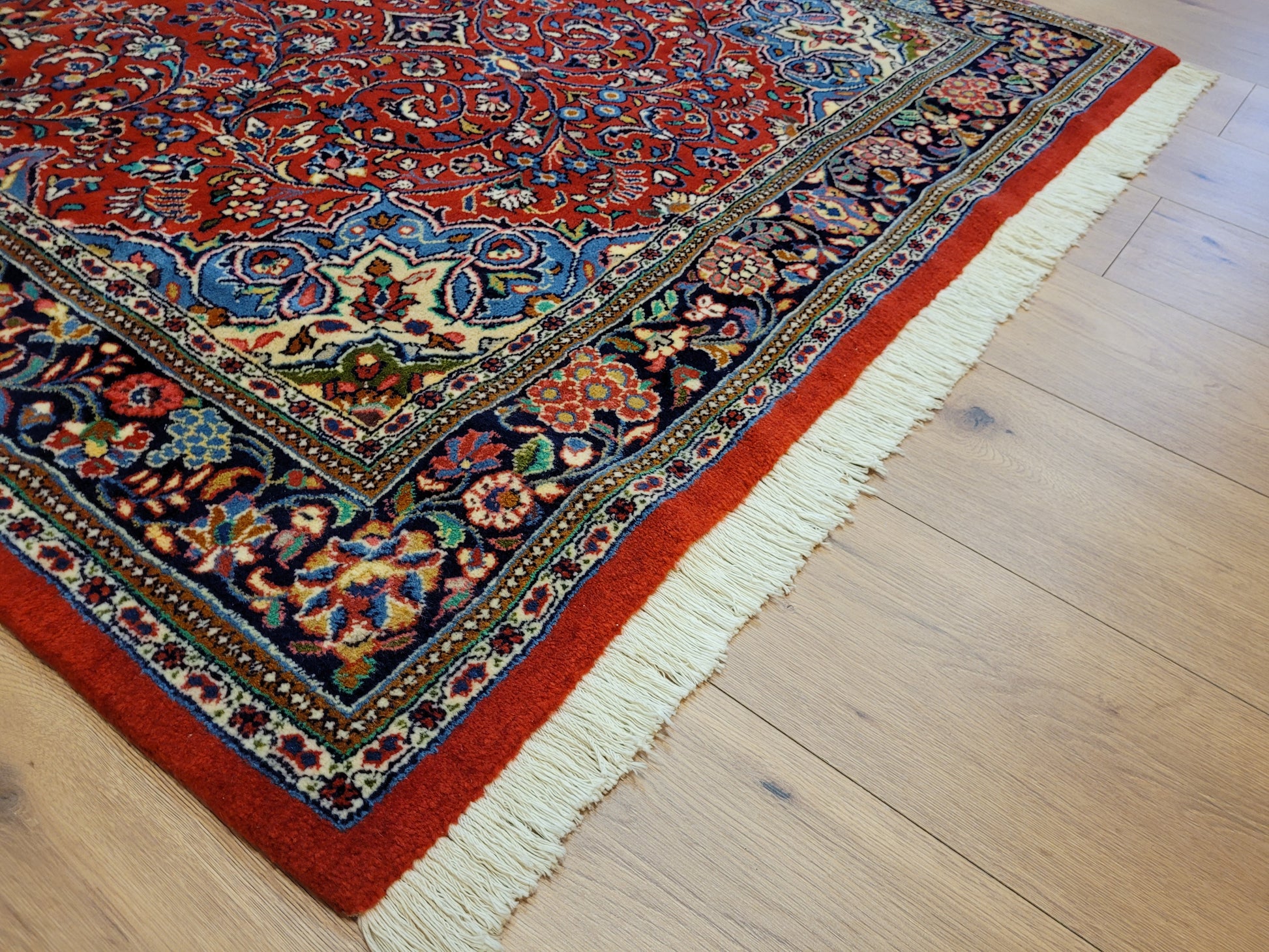 angeboten wird ein klassischer Sarough Teppich aus Wolle auf Baumwollkette, handgeknüpft in traditioneller Knüpfkunst. Das Design zeigt ein ausdrucksvolles Zentralmedaillon auf rotem Fond, umrahmt von geschwungenen Ranken und filigranen Blütenmustern. Die Eckzwickel in Blau mit floralen Motiven sowie die reich verzierte Bordüre ergänzen das harmonische Gesamtbild.