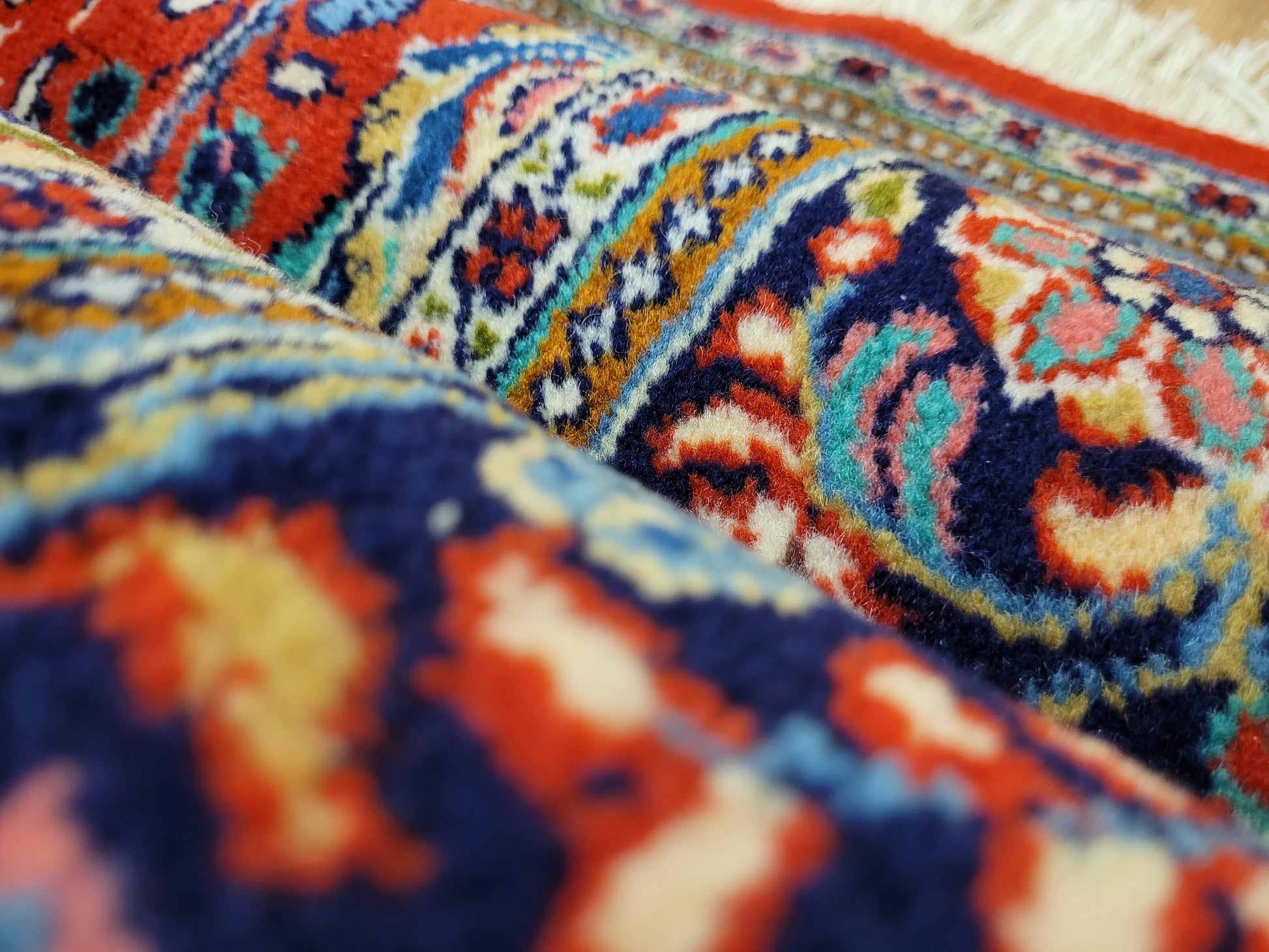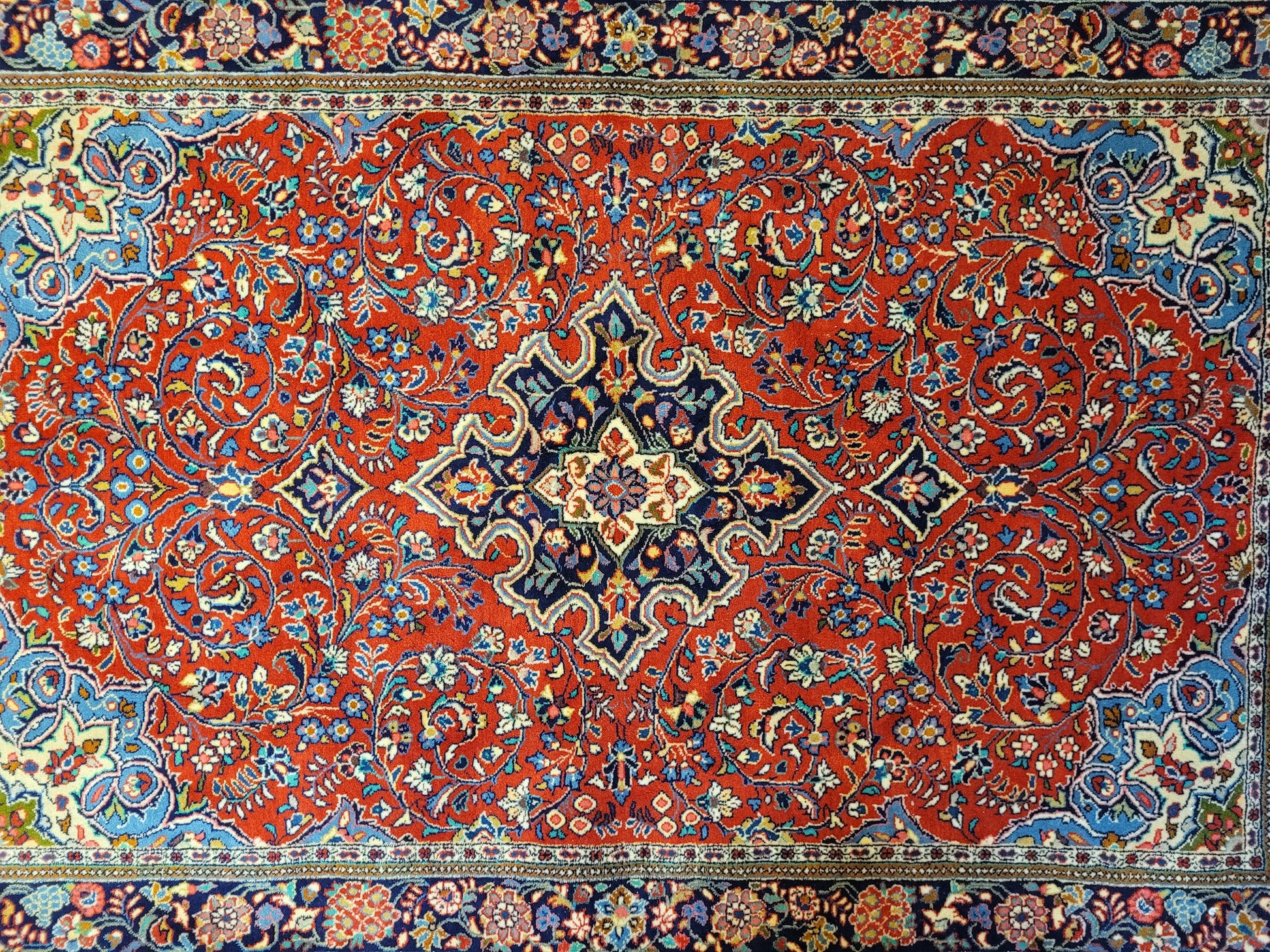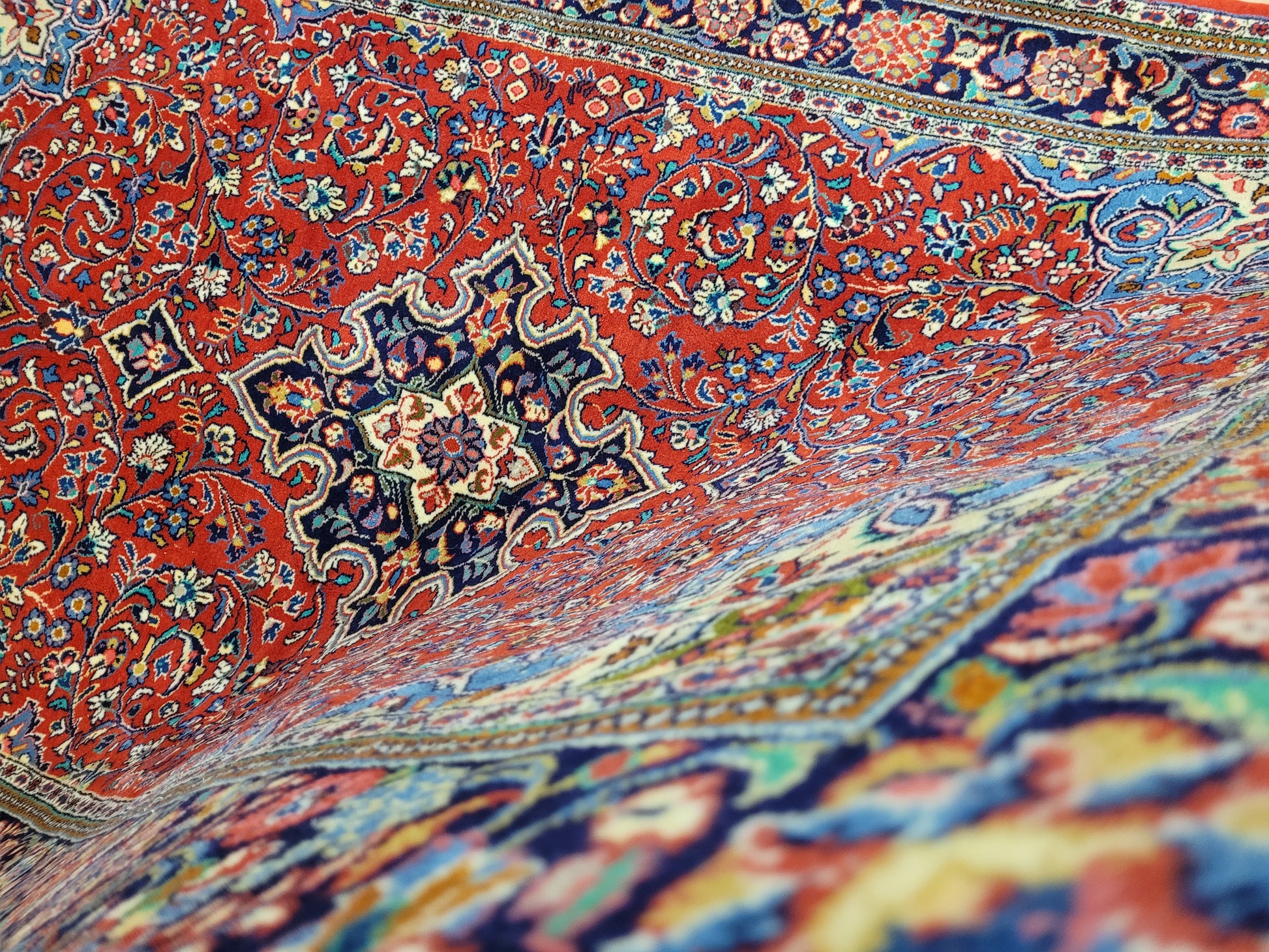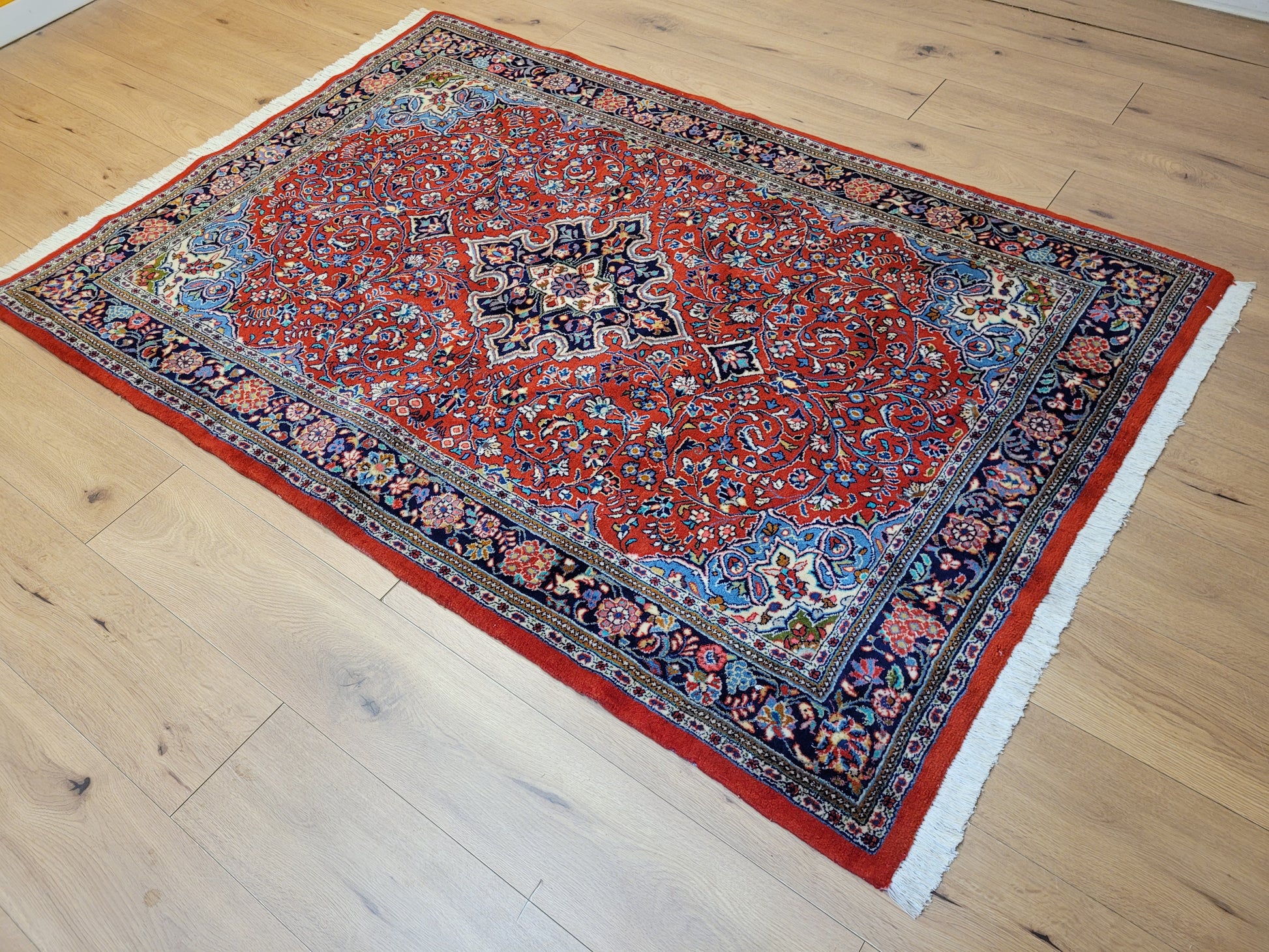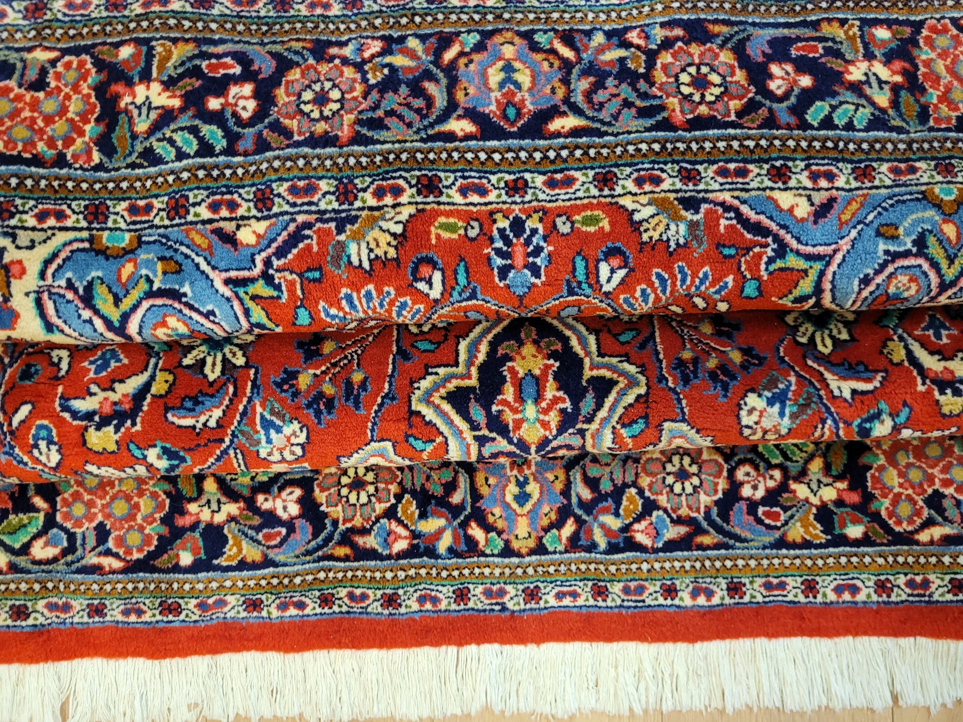 angeboten wird ein klassischer Sarough Teppich aus Wolle auf Baumwollkette, handgeknüpft in traditioneller Knüpfkunst. Das Design zeigt ein ausdrucksvolles Zentralmedaillon auf rotem Fond, umrahmt von geschwungenen Ranken und filigranen Blütenmustern. Die Eckzwickel in Blau mit floralen Motiven sowie die reich verzierte Bordüre ergänzen das harmonische Gesamtbild.