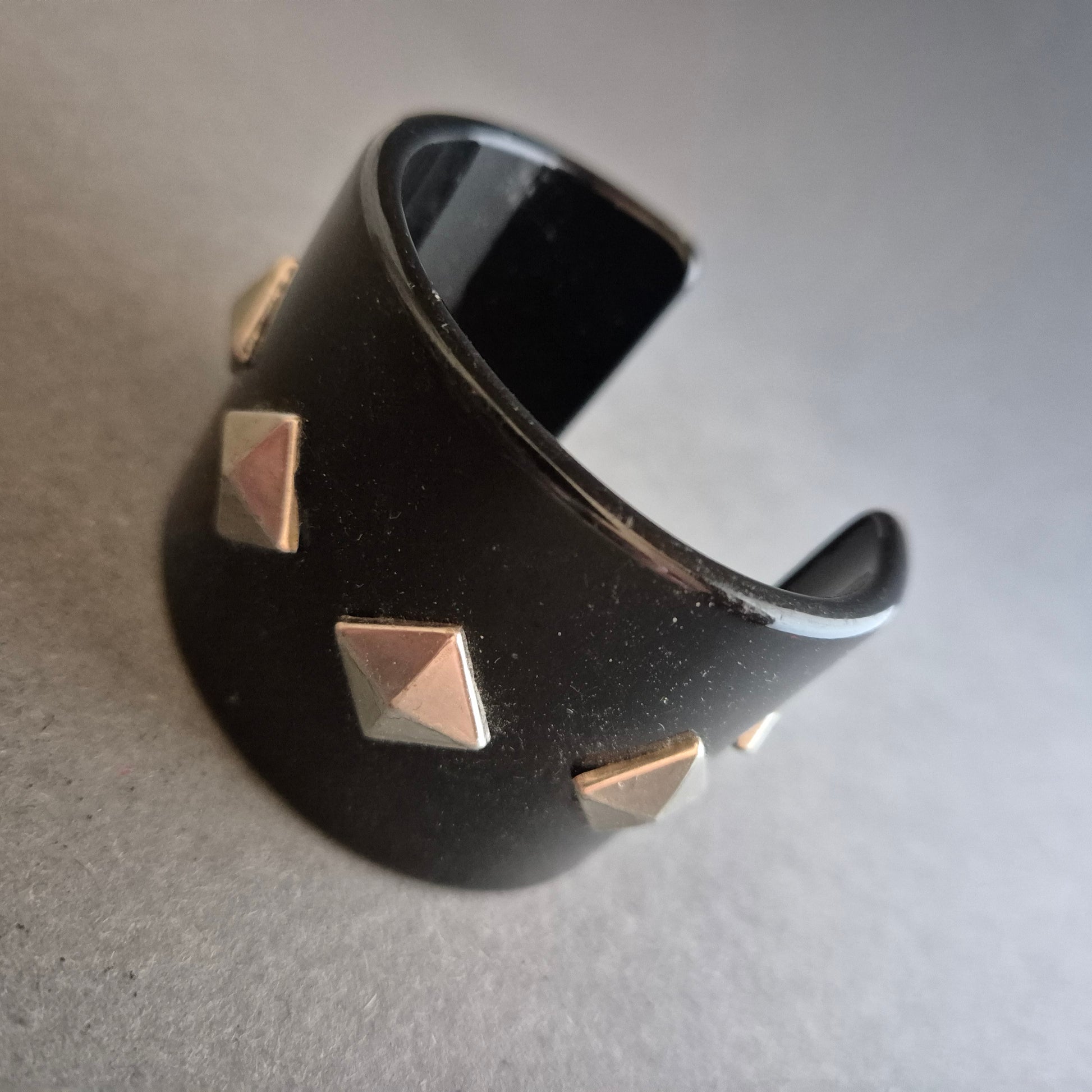 Dieses auffällige Statement-Armband aus schwarzem Kunststoff ist mit pyramidenförmigen Metallnieten verziert und verleiht jedem Outfit eine rebellische Note. Die breite Manschettenform und der offene Stil machen das An- und Ablegen besonders einfach. Ideal für Modebewusste, die ein markantes Accessoire suchen.
