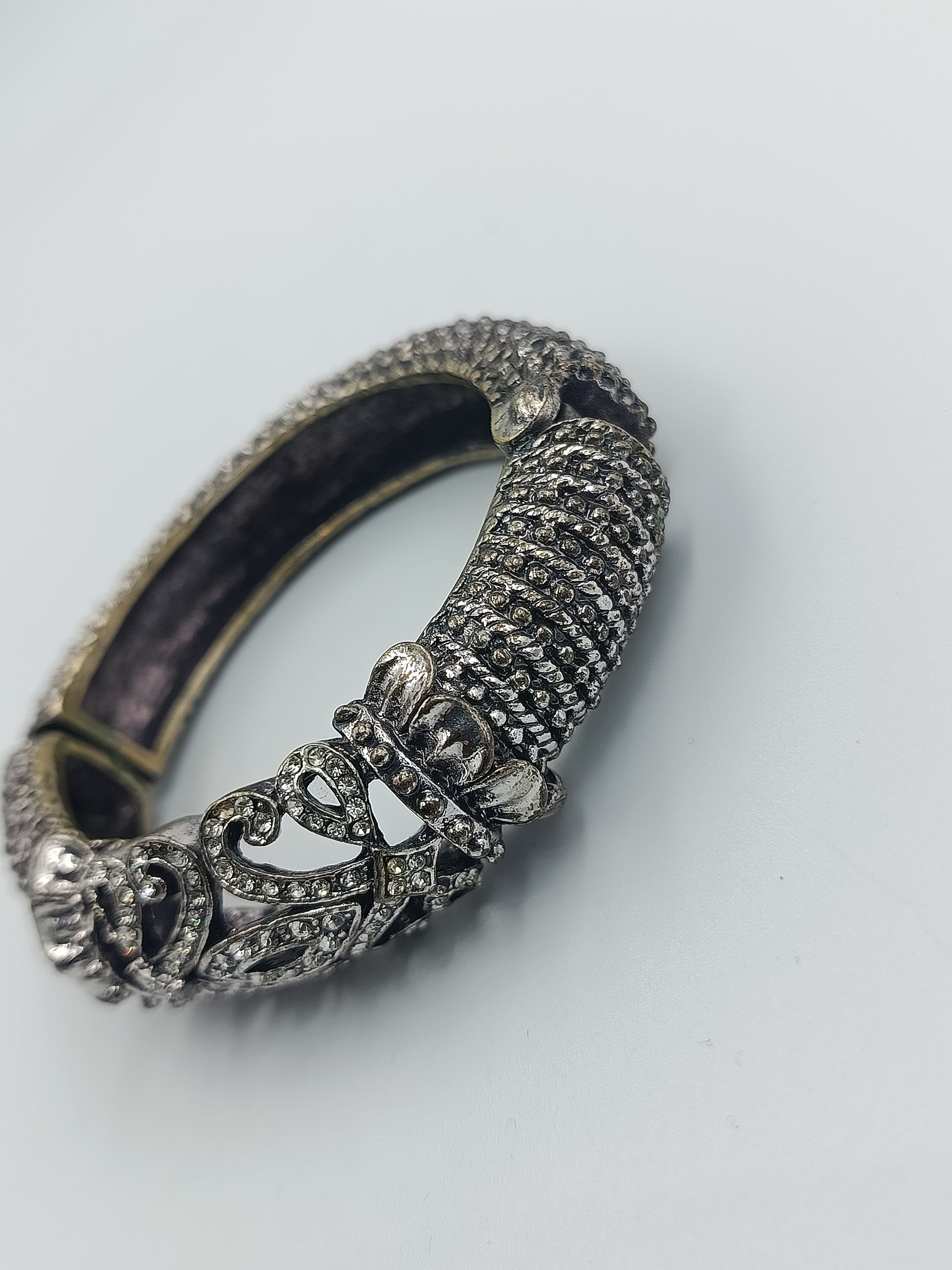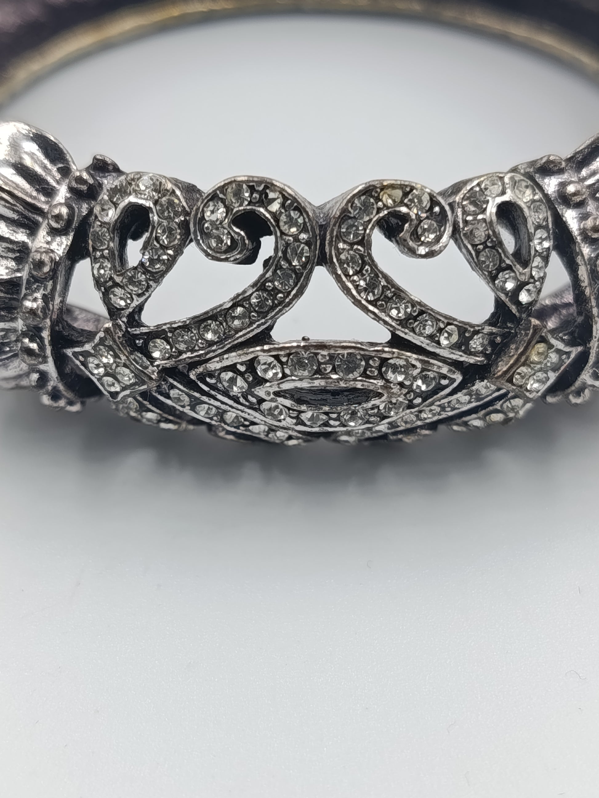 Dieses markante, massive Armband ist ein echter Hingucker. Es besteht aus silberfarbenem Metall mit aufwendigen Ornament-Details und funkelnden Glassteinen, die dem Schmuckstück eine glamouröse Note verleihen. Das Armband hat einen Klappverschluss und ist innen leicht abgerundet, wodurch es angenehm zu tragen ist – trotz seines stattlichen Gewichts.