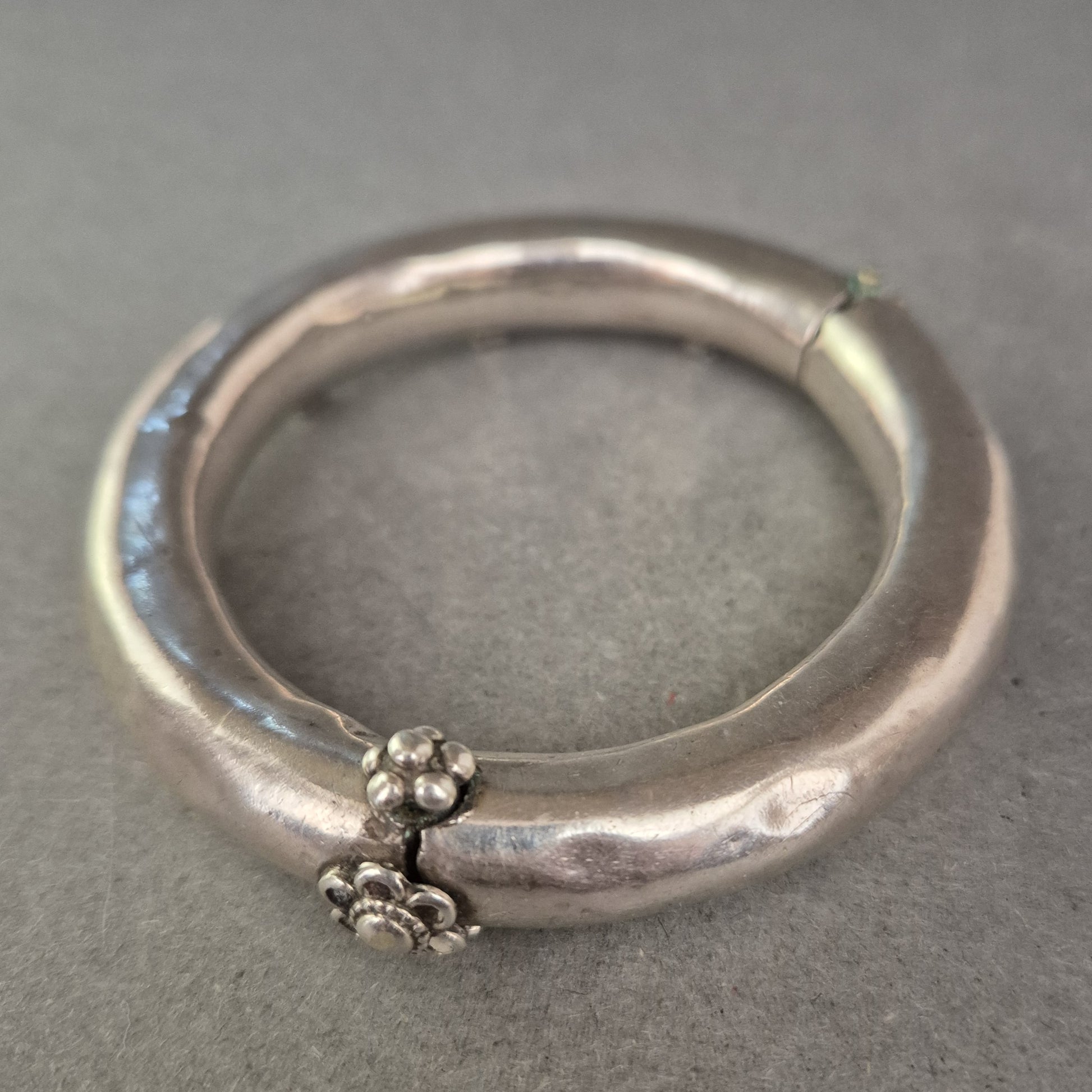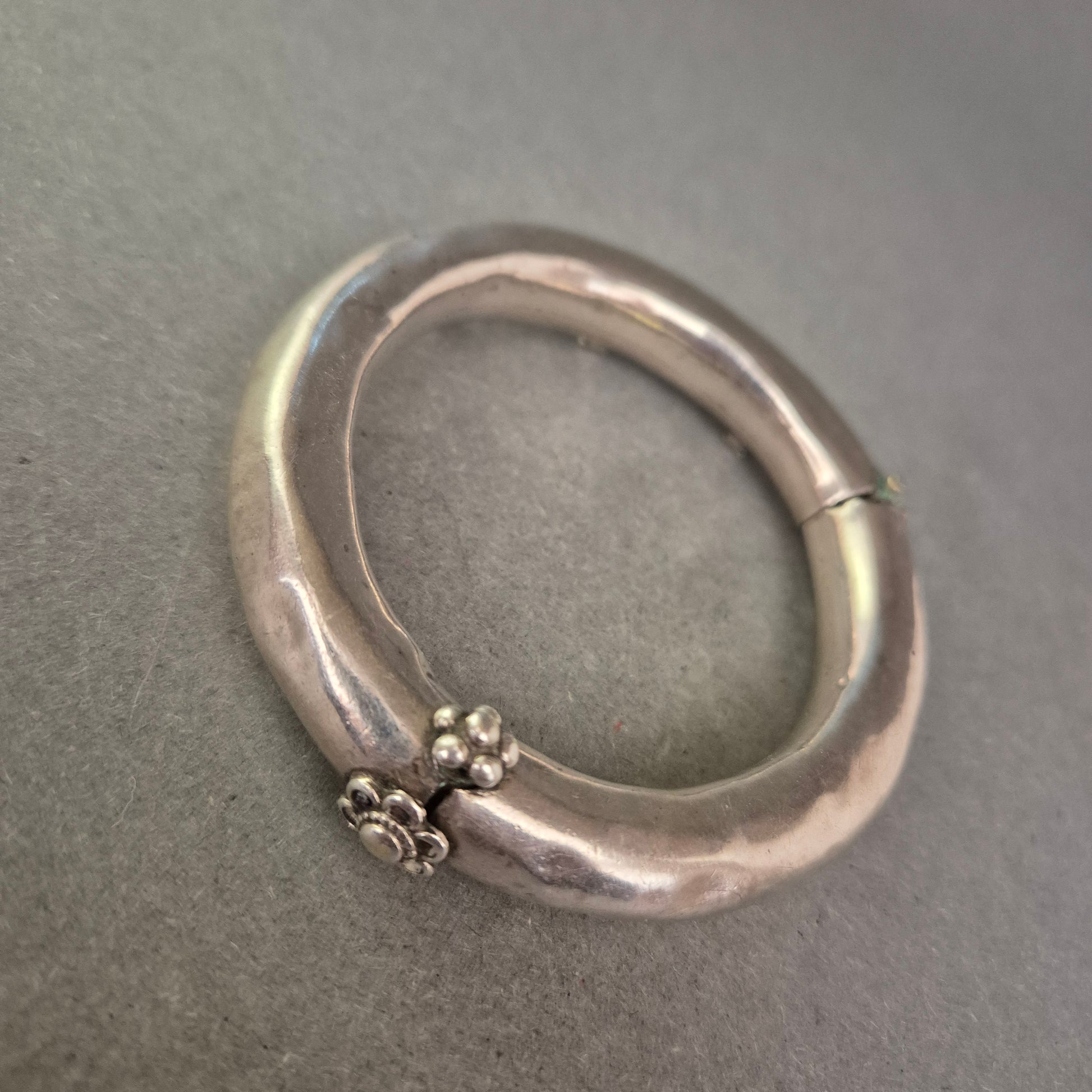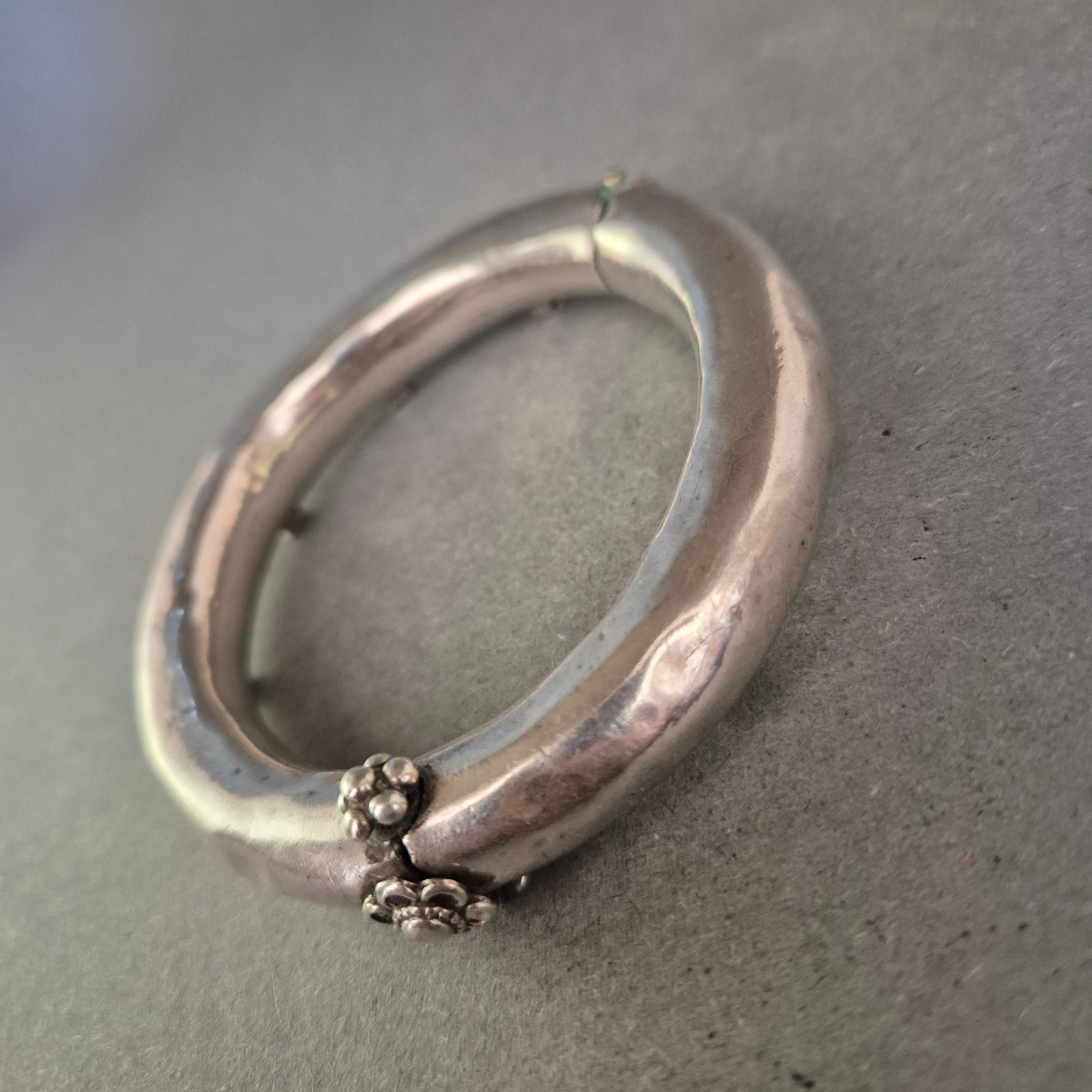 Dieser massive Vintage-Armreif mit einem Gewicht von 43 g überzeugt durch seine schlichte, runde Form und eine florale Verschlussverzierung. Die silberfarbene Oberfläche mit natürlichen Gebrauchsspuren verleiht dem Stück Authentizität und Charakter. Perfekt für Liebhaber ethnischer oder rustikaler Schmuckstücke.