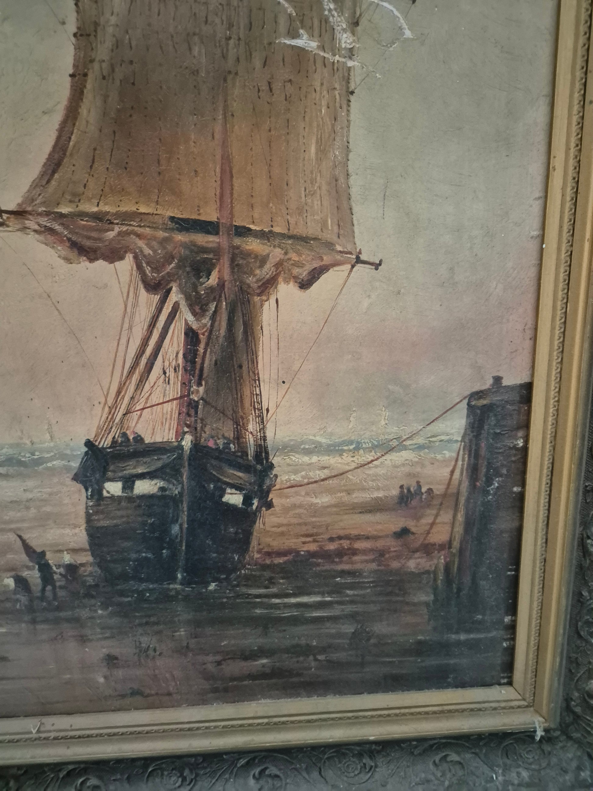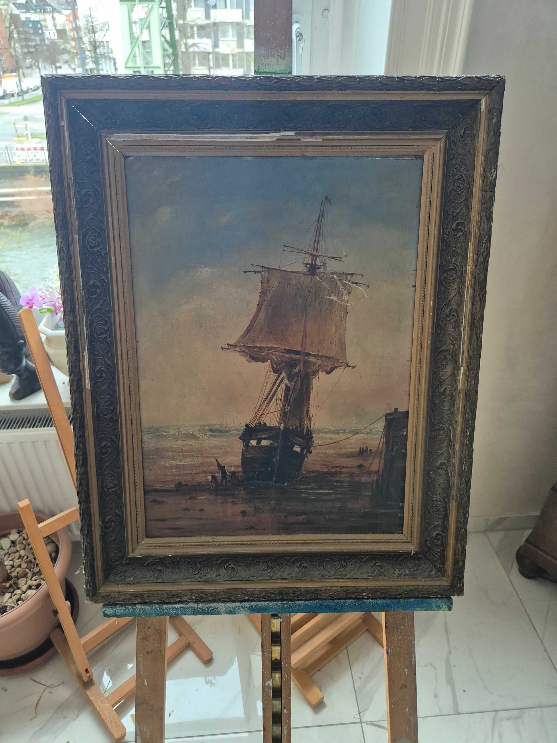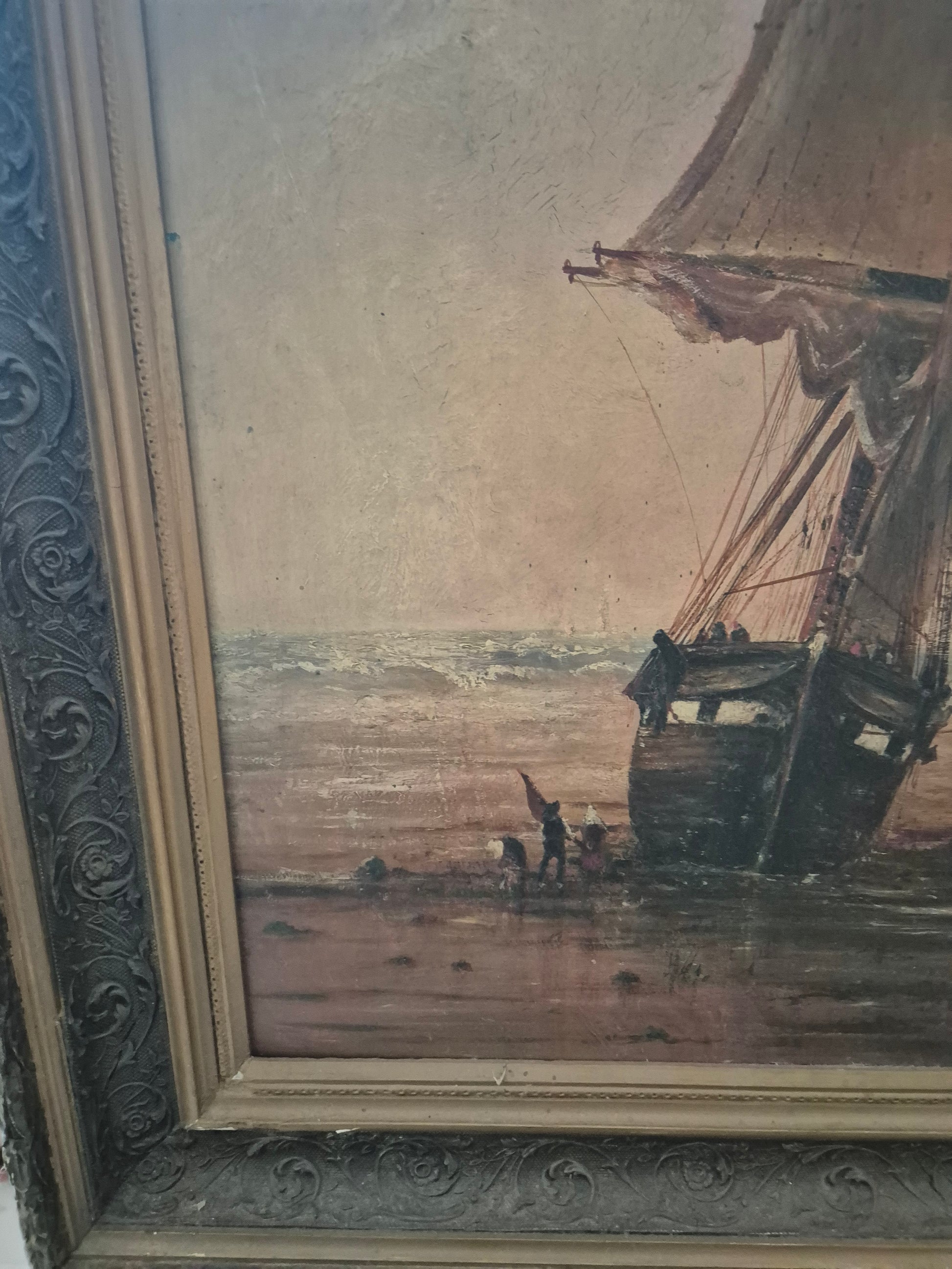 Atmosphärisches Ölgemälde mit maritimer Darstellung eines Segelschiffs am Ufer. Die detailreiche Malweise fängt die Abendstimmung mit feinem Lichtspiel und weitem Horizont ein. Der prachtvolle, verzierte Rahmen unterstreicht den klassischen Charakter dieses Werks.