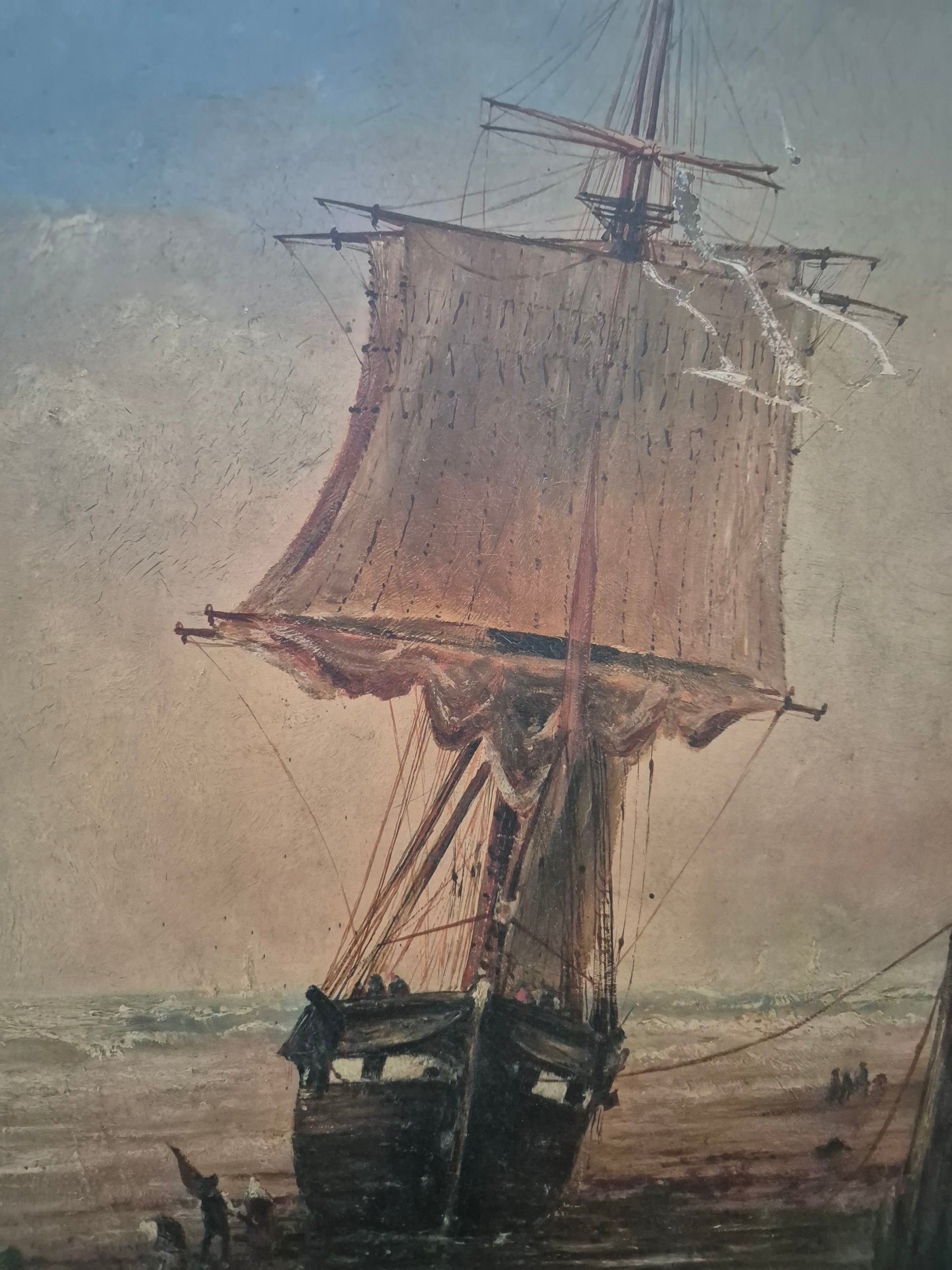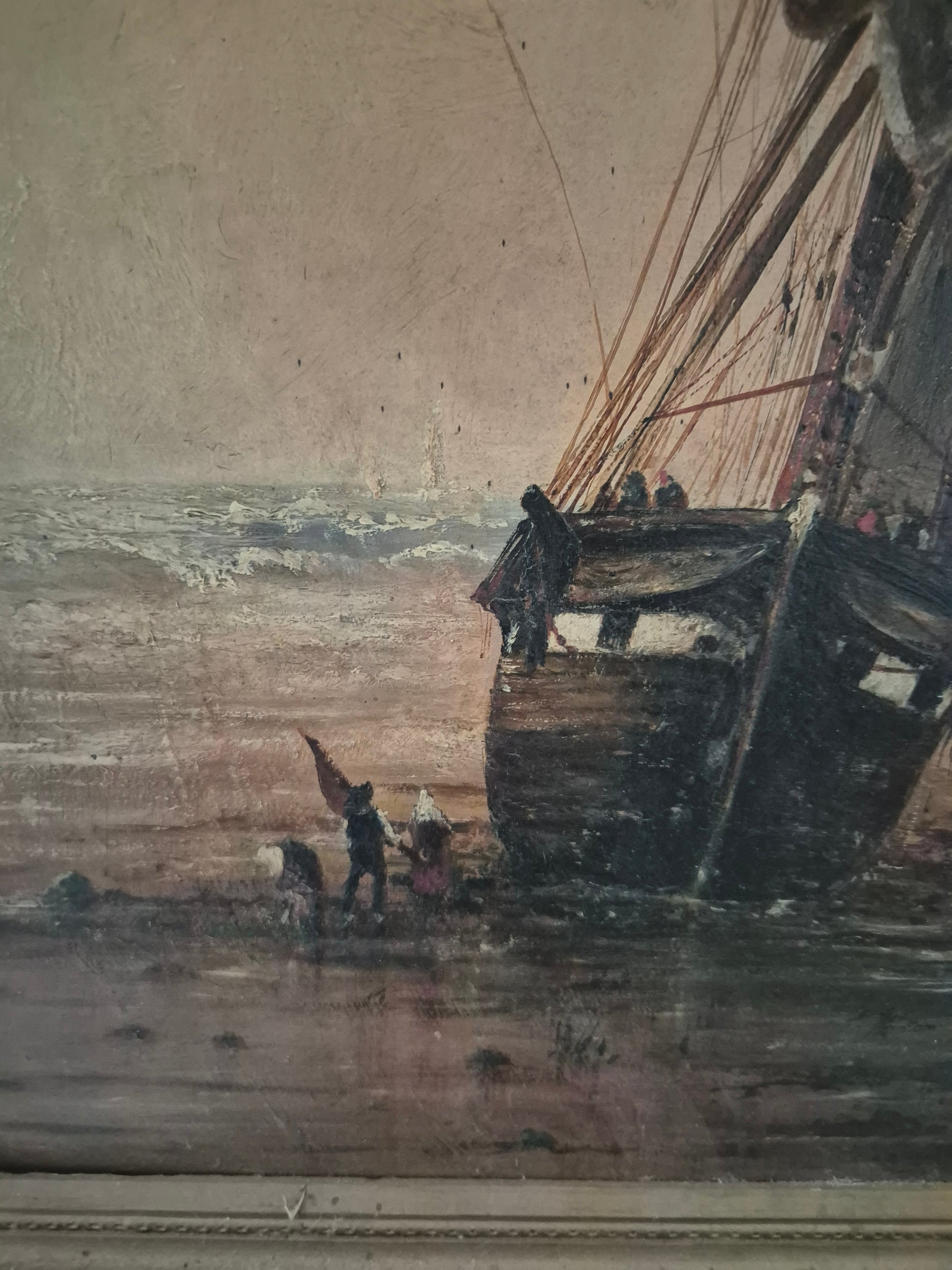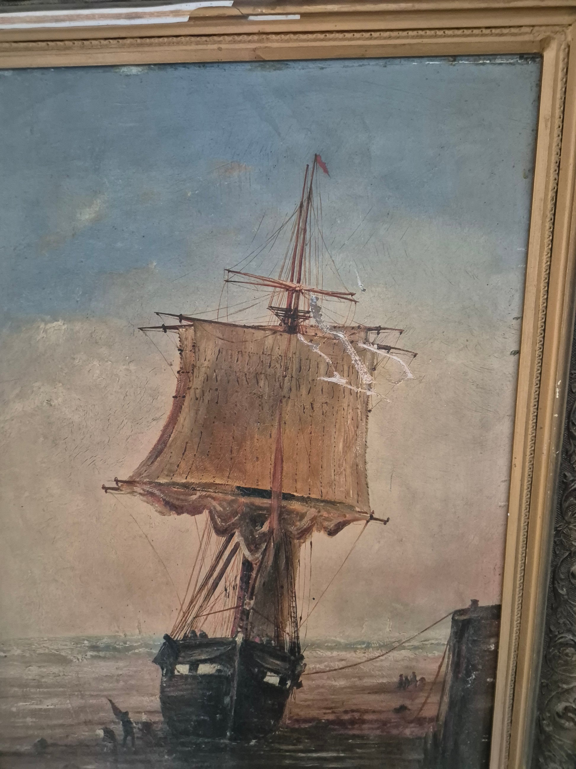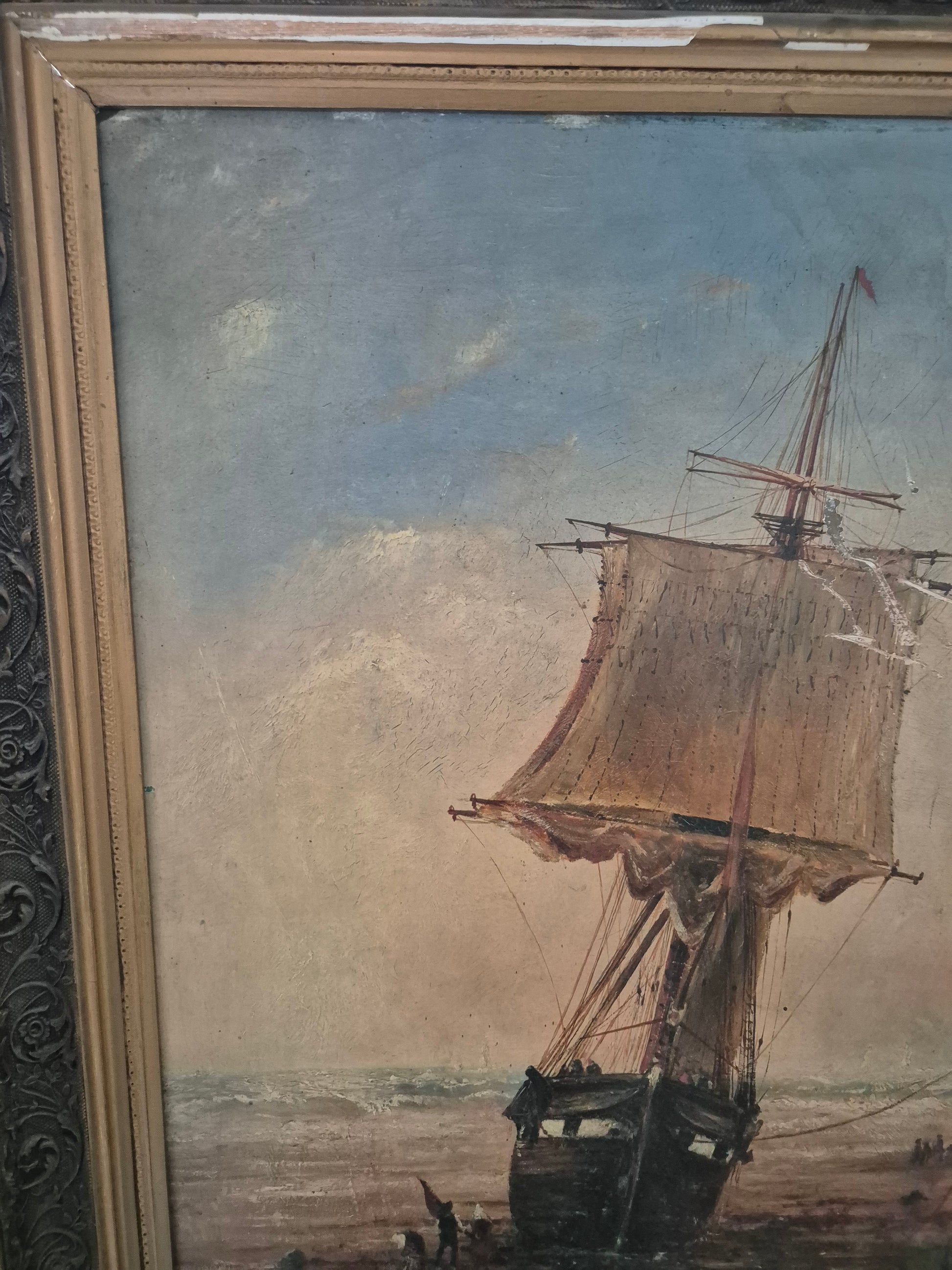 Atmosphärisches Ölgemälde mit maritimer Darstellung eines Segelschiffs am Ufer. Die detailreiche Malweise fängt die Abendstimmung mit feinem Lichtspiel und weitem Horizont ein. Der prachtvolle, verzierte Rahmen unterstreicht den klassischen Charakter dieses Werks.