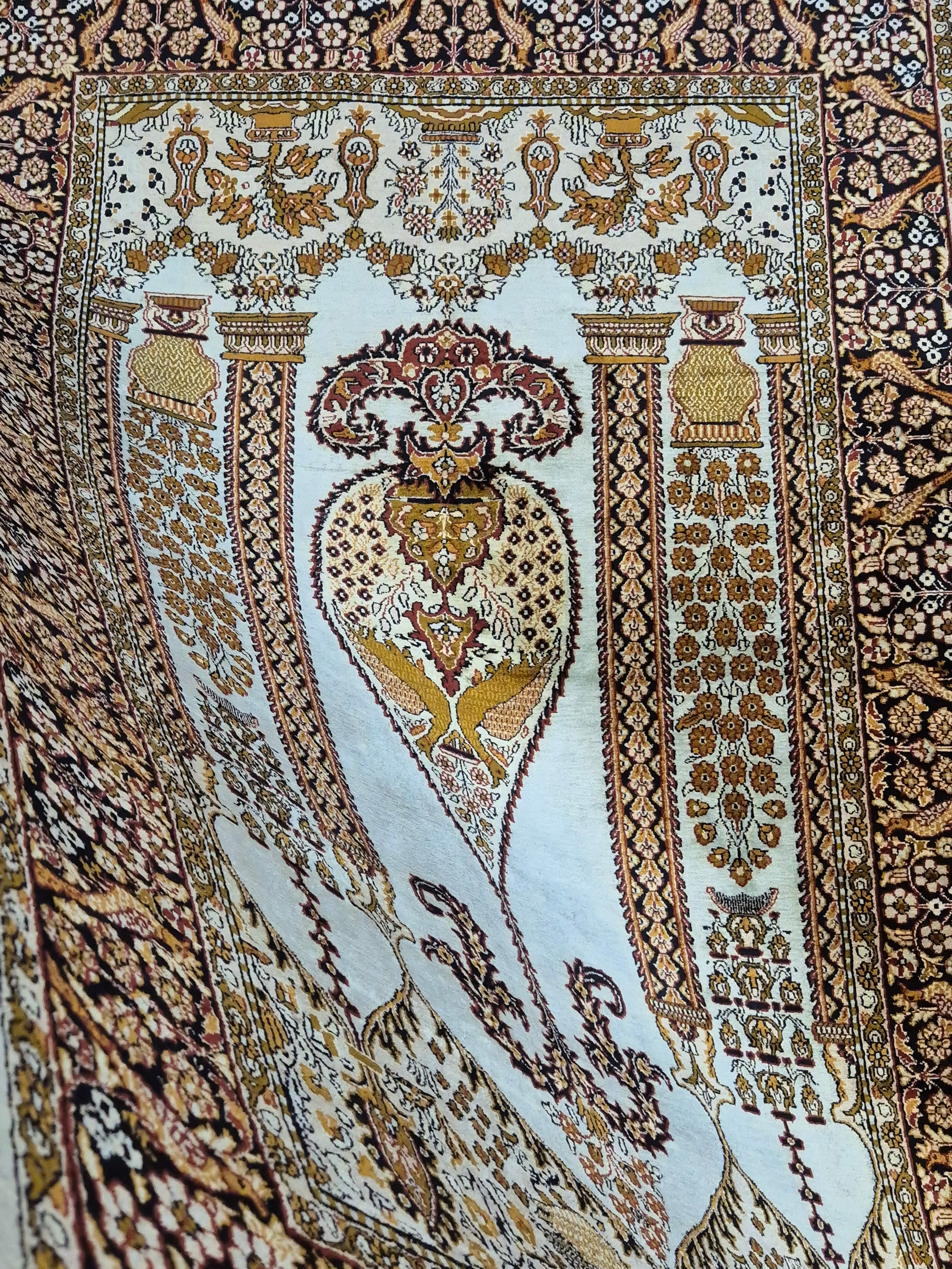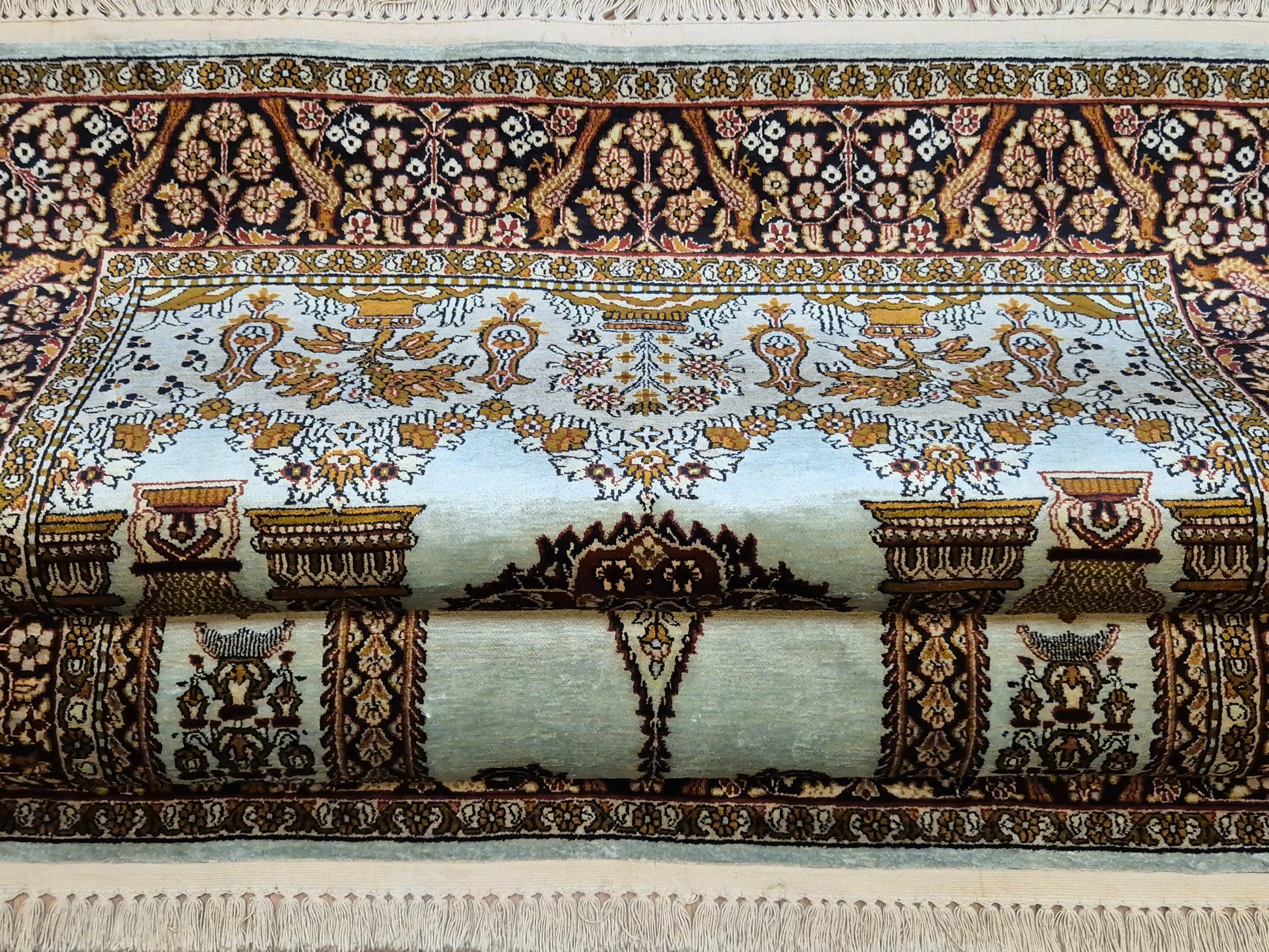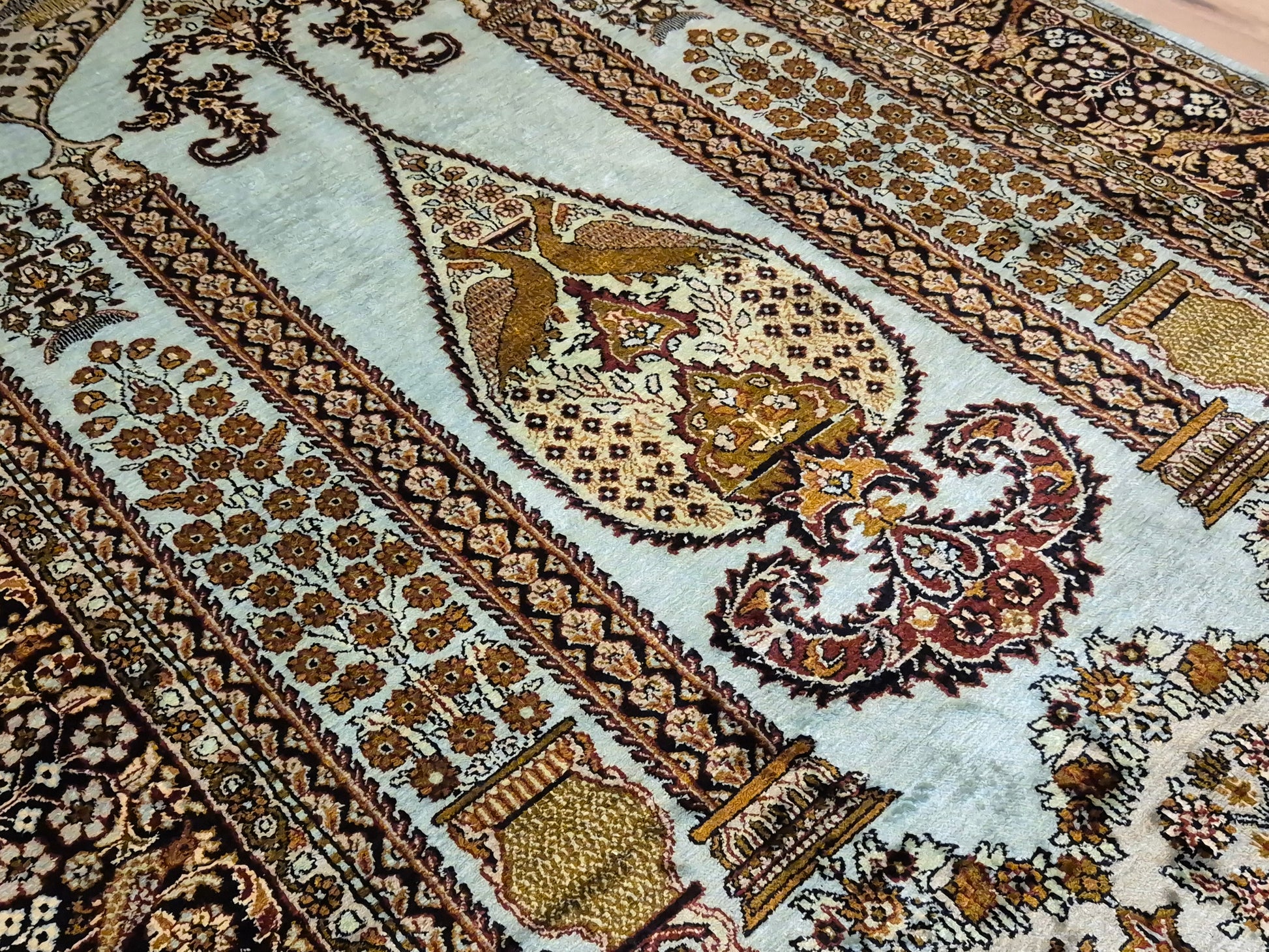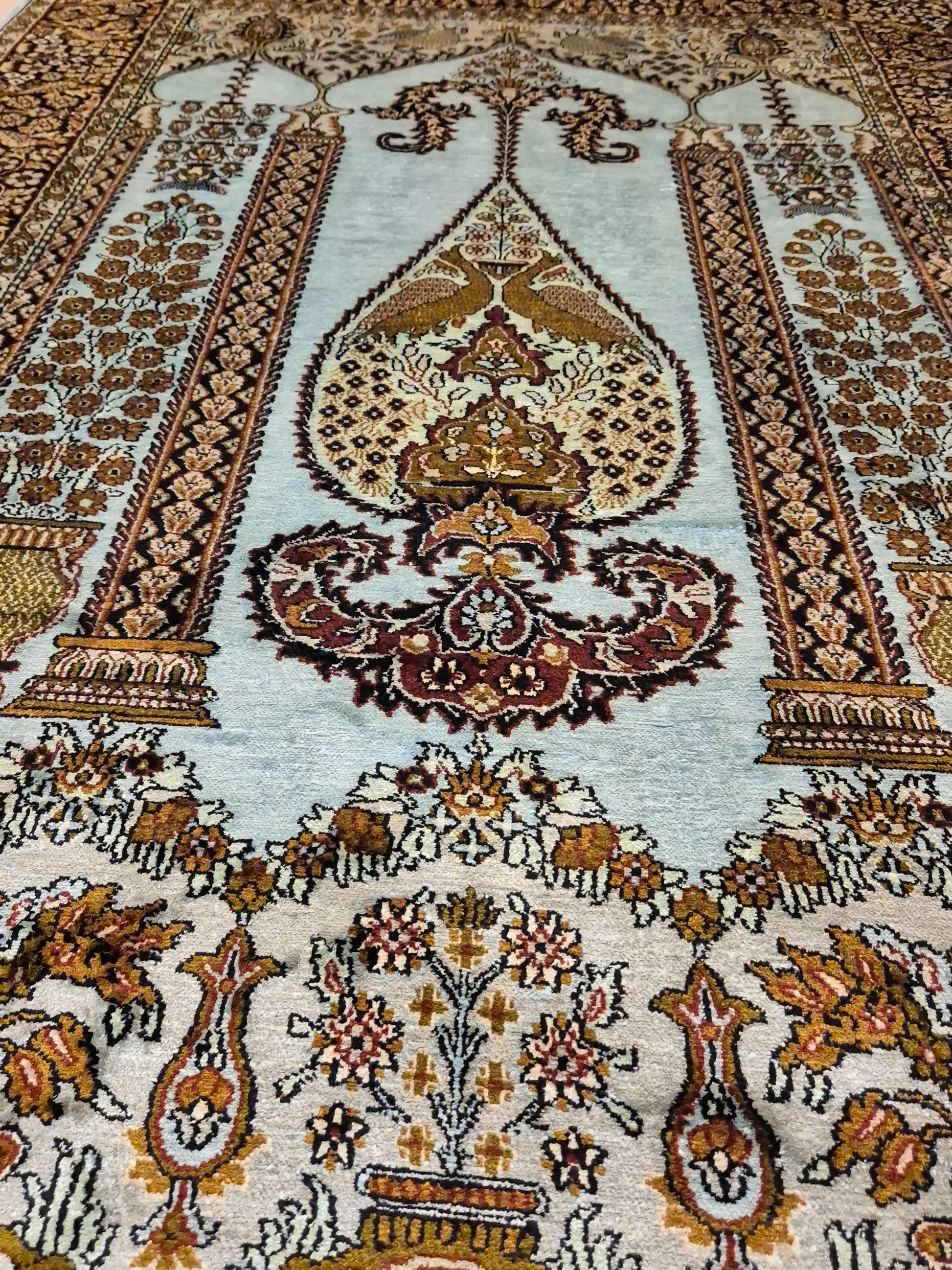 • Verarbeitung: meisterhafte Knüpftechnik, detailreiche Musterung, glänzende Seide für edle Lichtreflexe