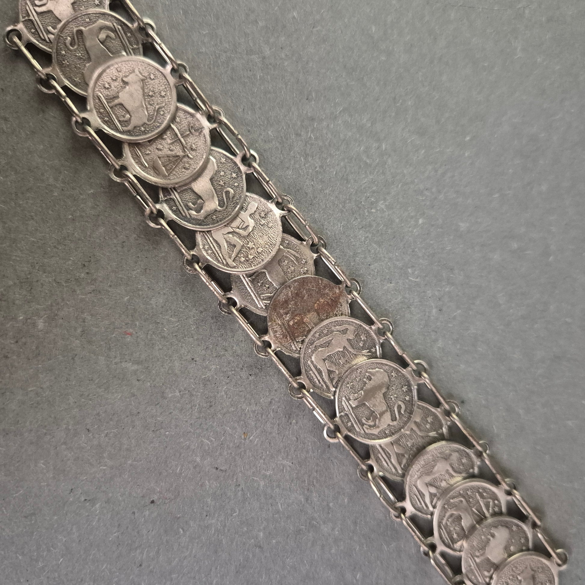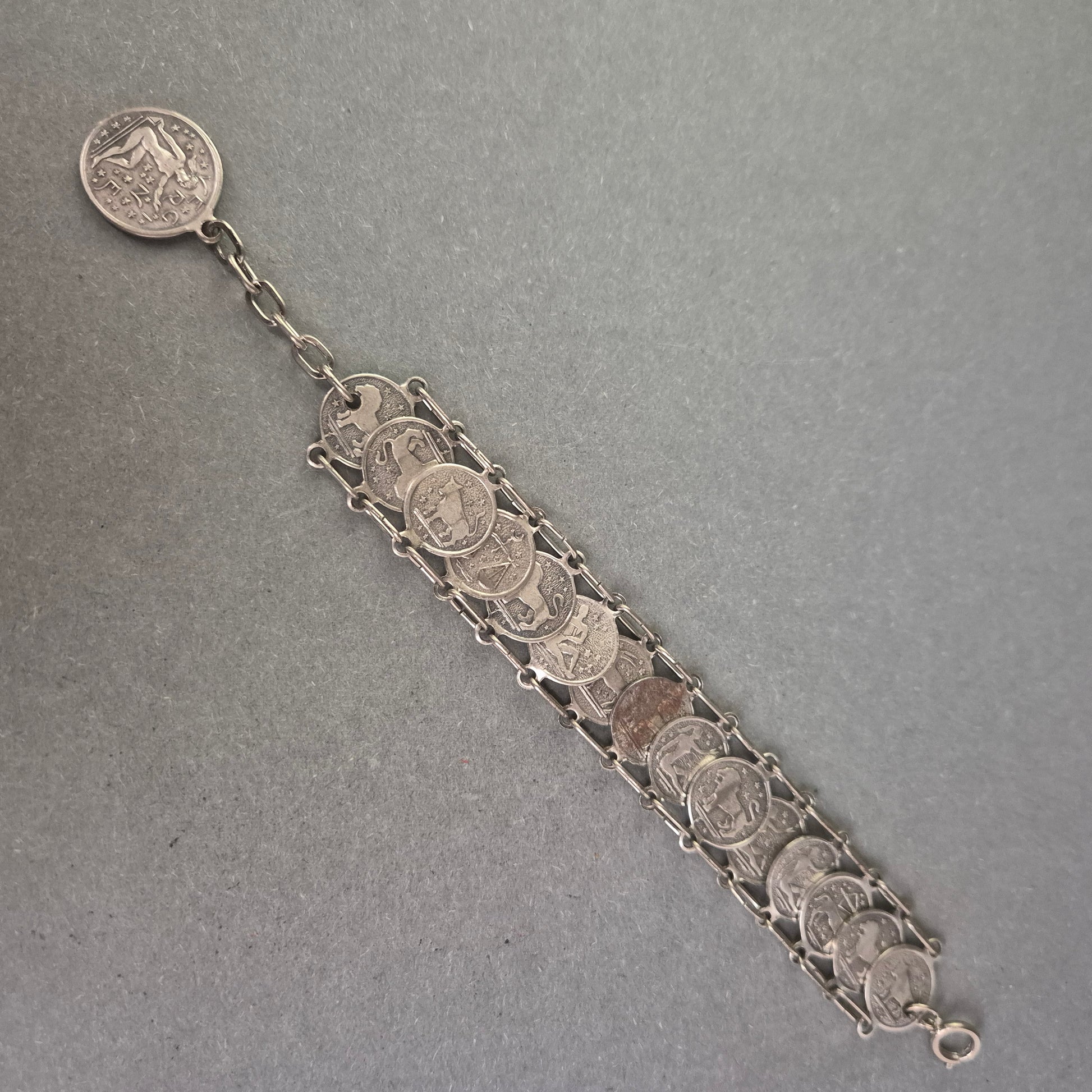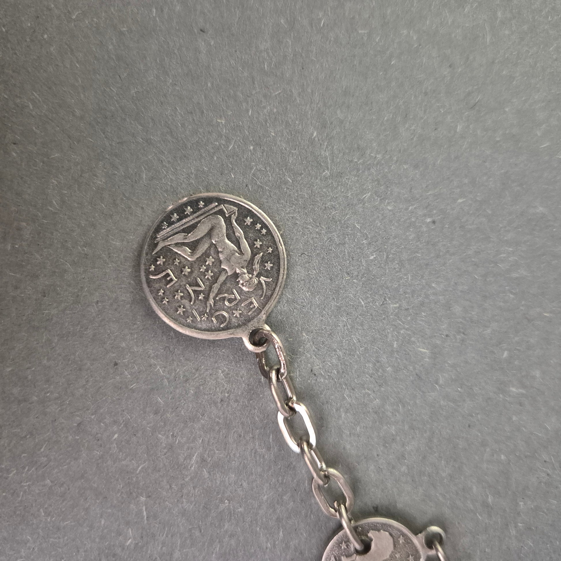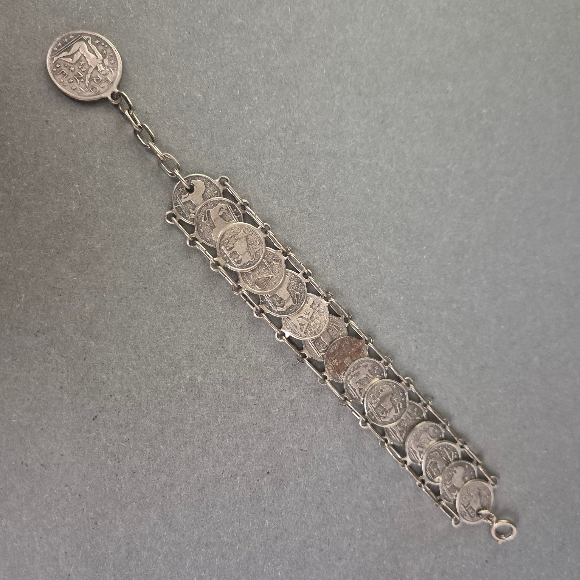 Dieses massive Vintage-Armband besteht aus zahlreichen runden Silberplättchen, die mit stilisierten Tierkreiszeichen wie Löwe, Widder oder Hund geprägt sind. Die detailreichen Gravuren und die stabile Verarbeitung machen das Schmuckstück zu einem besonderen Blickfang für Sammler oder Astrologie-Liebhaber.