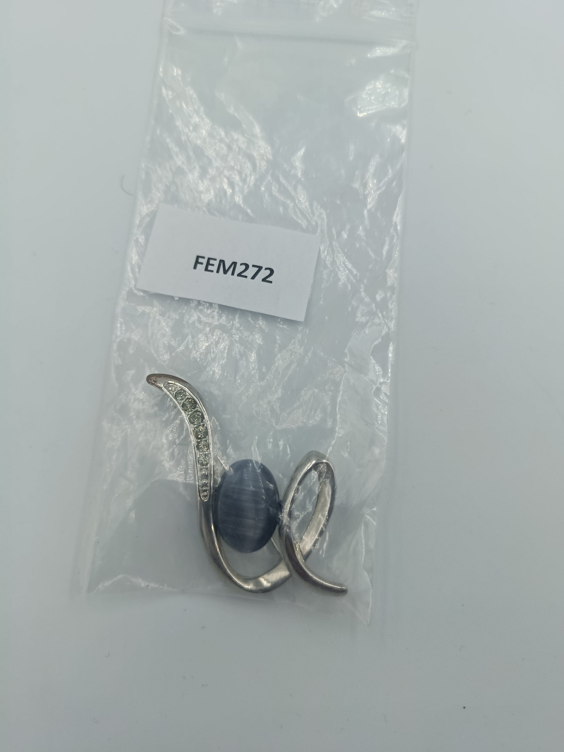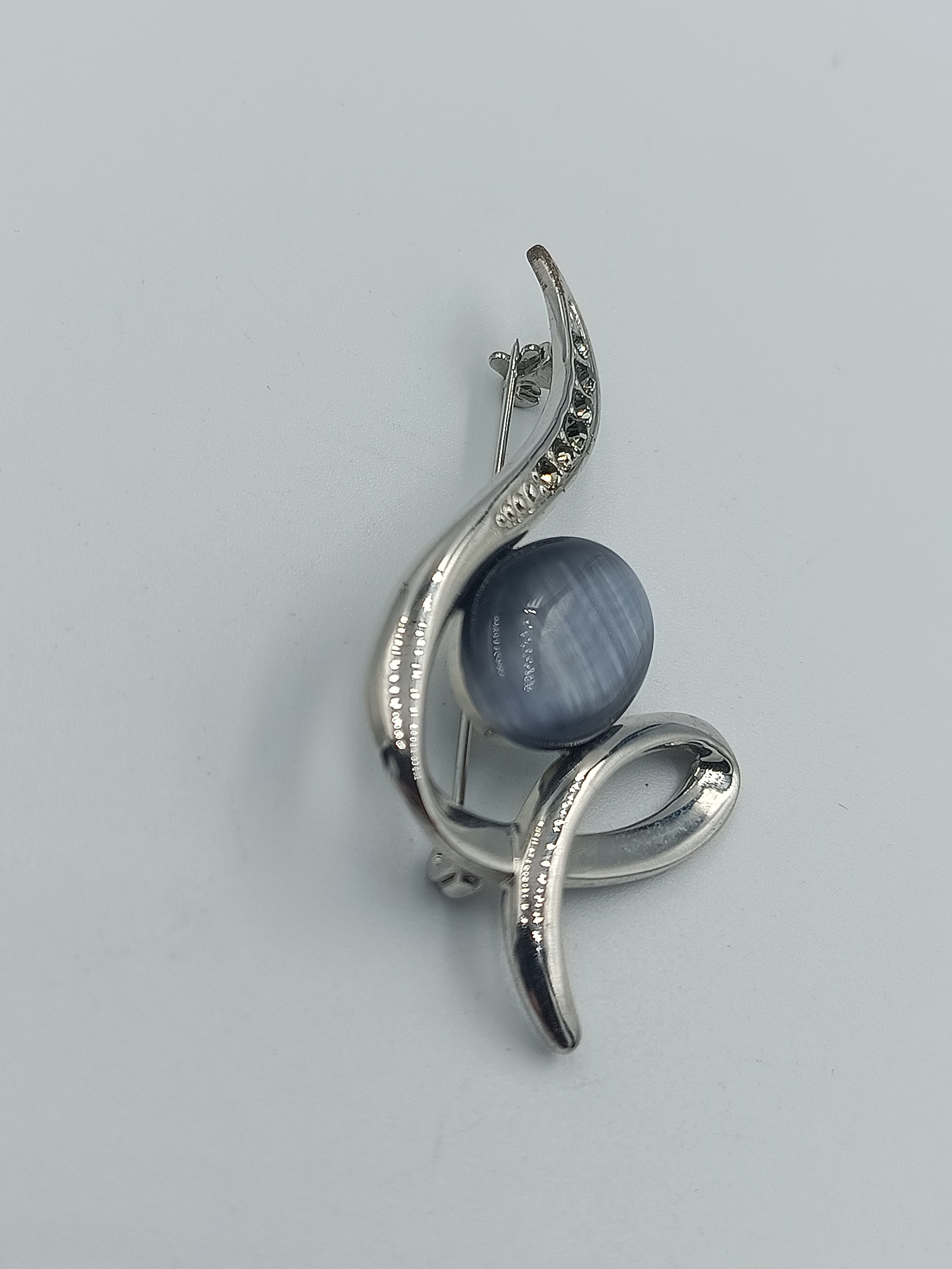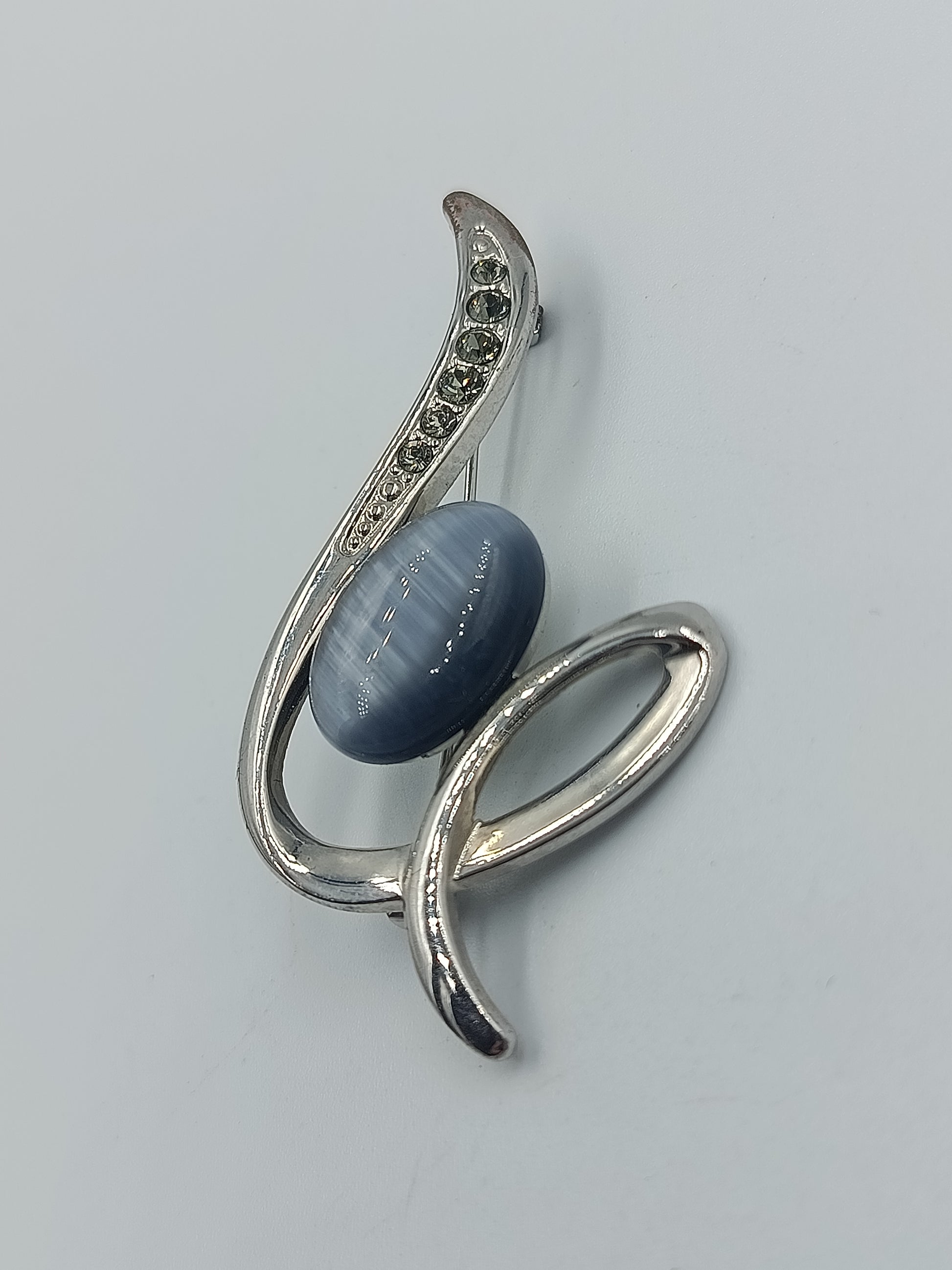 Elegante, modern geschwungene Brosche mit silberfarbenem Metallrahmen und einem zentralen, ovalen Katzenauge-Stein in graublau. Verziert mit kleinen, funkelnden Strasssteinen entlang der geschwungenen Linie. Ideal als stilvolles Accessoire für Blusen, Schals oder Jacken.