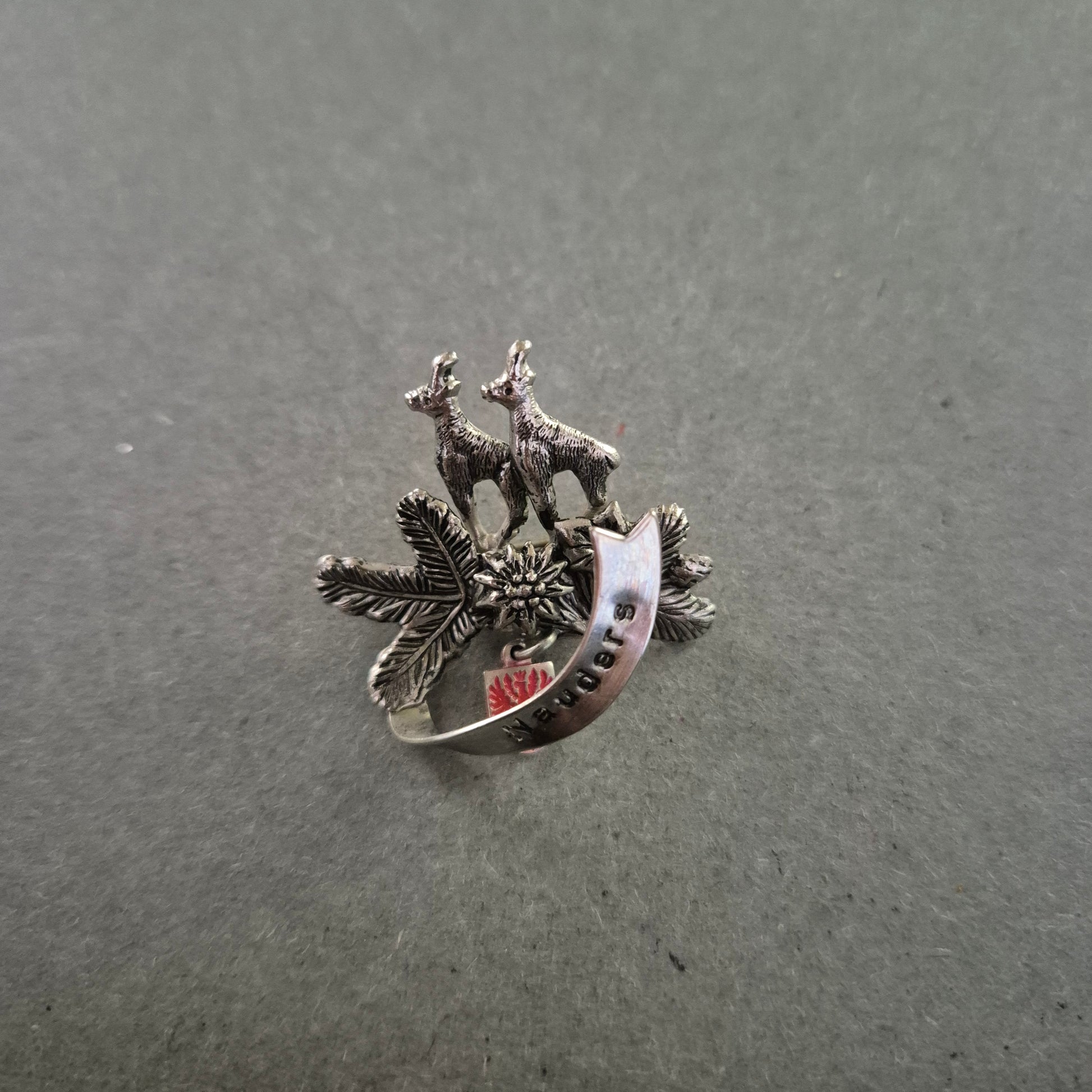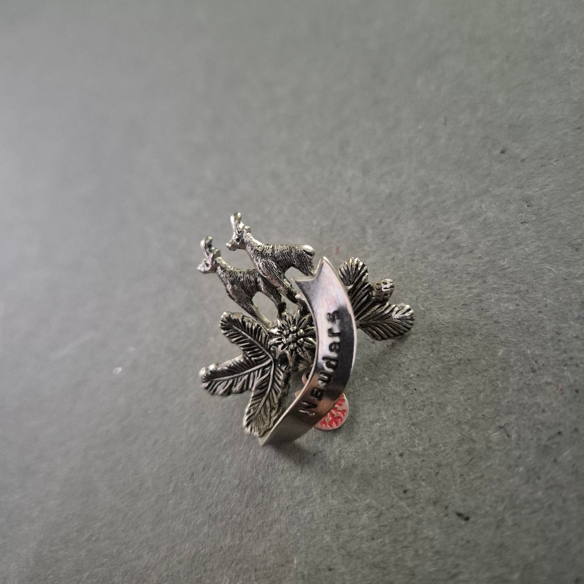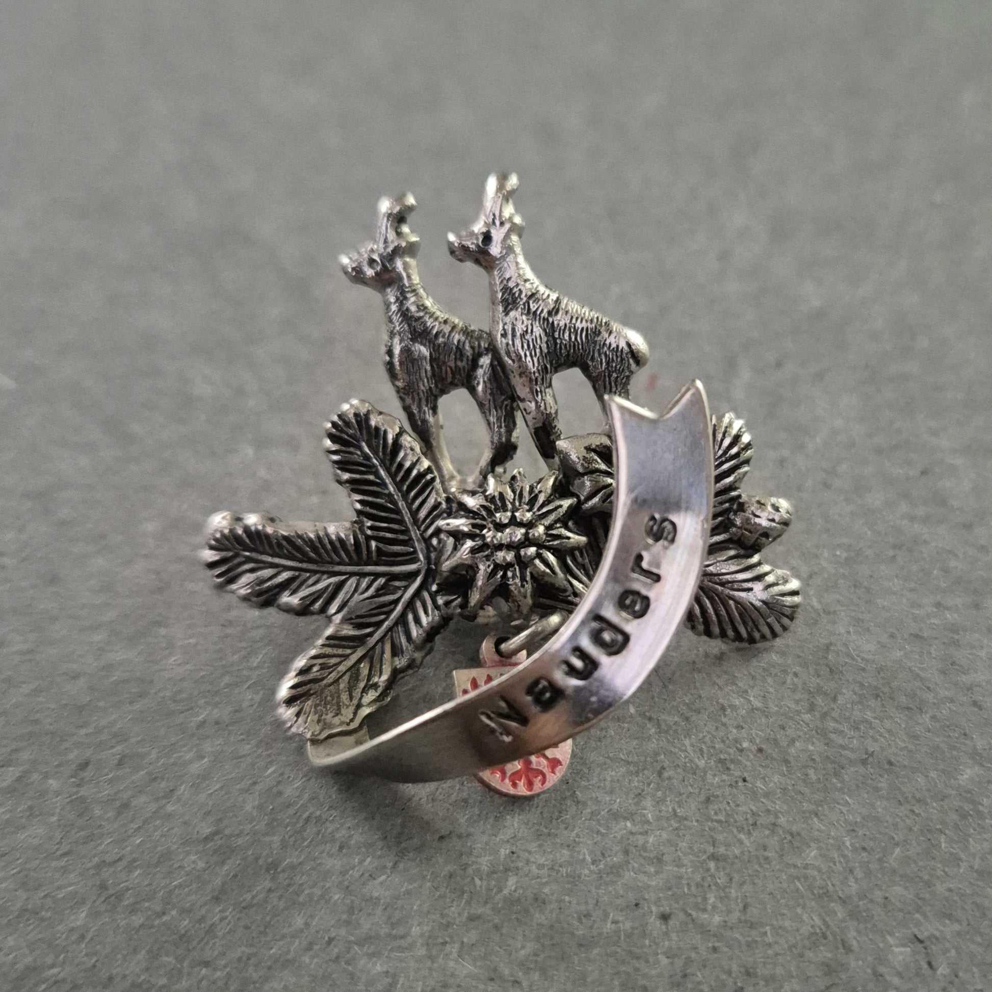 Silberfarbene Brosche „Nauders“ – Alpenmotiv mit Gämsen & Edelweiß