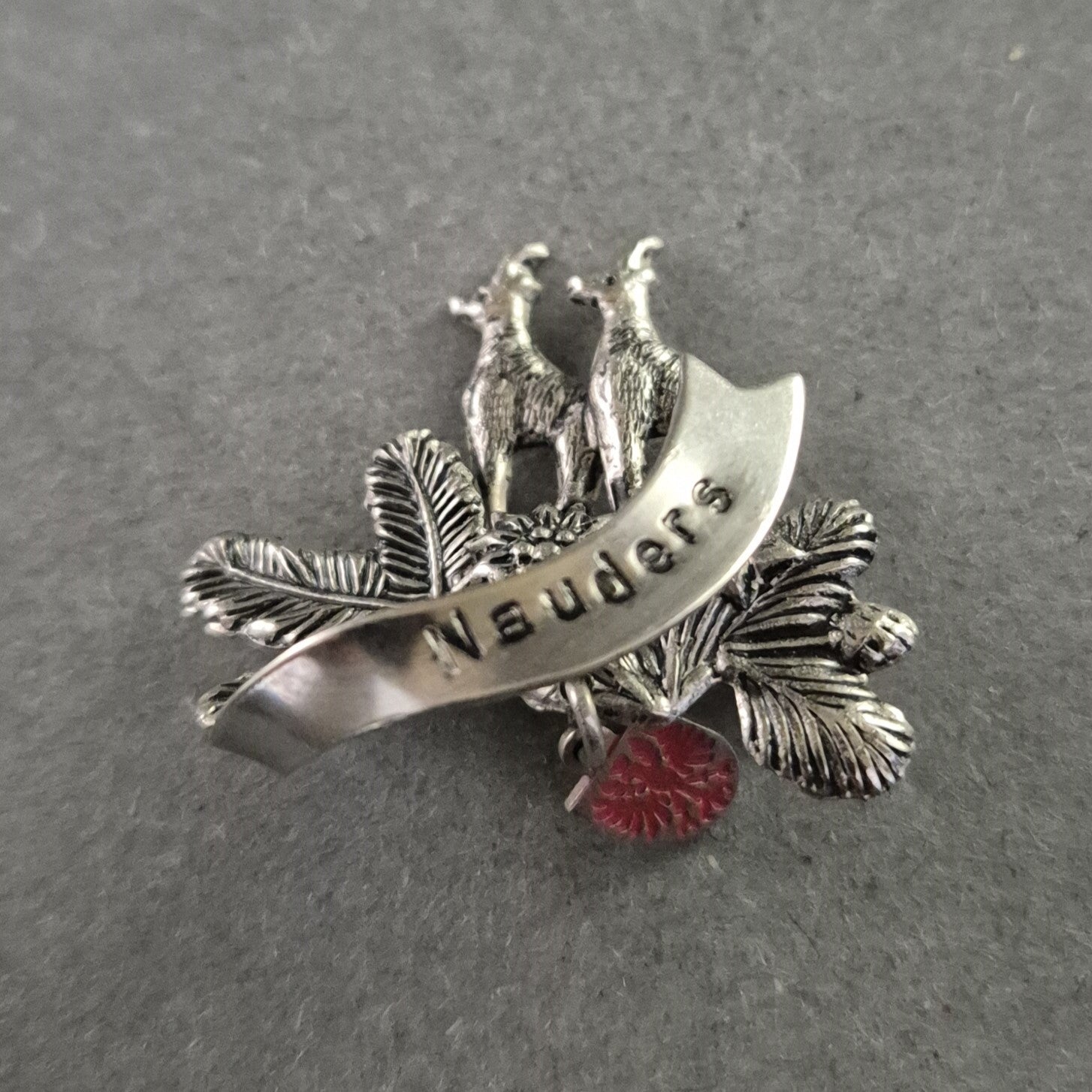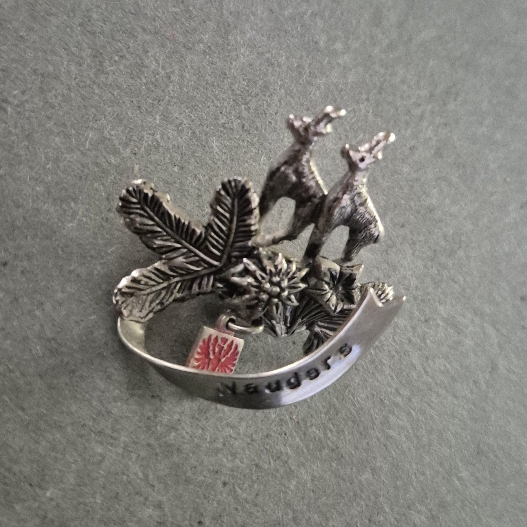 Diese detailreiche Anstecknadel zeigt zwei Gämsen vor einer Kulisse aus alpinen Blättern und Edelweißblüten, ergänzt durch den Schriftzug „Nauders“. Ein kleines, rotes Blümchen als Anhänger verleiht der Brosche zusätzlichen Charme. Das ideale Souvenir aus den Alpen oder als Trachtenaccessoire für traditionelle Outfits.