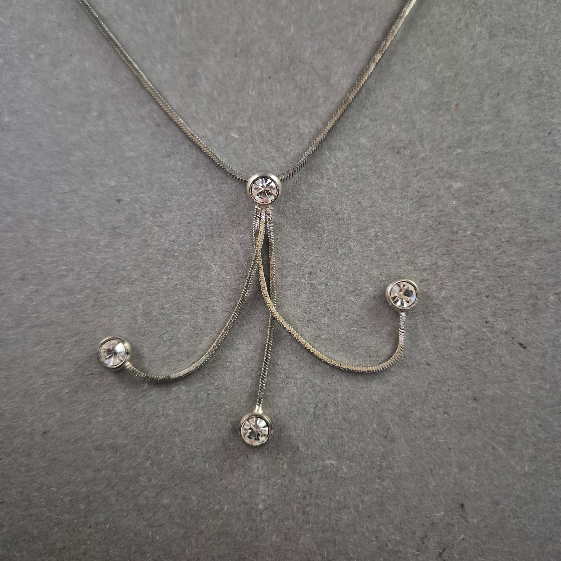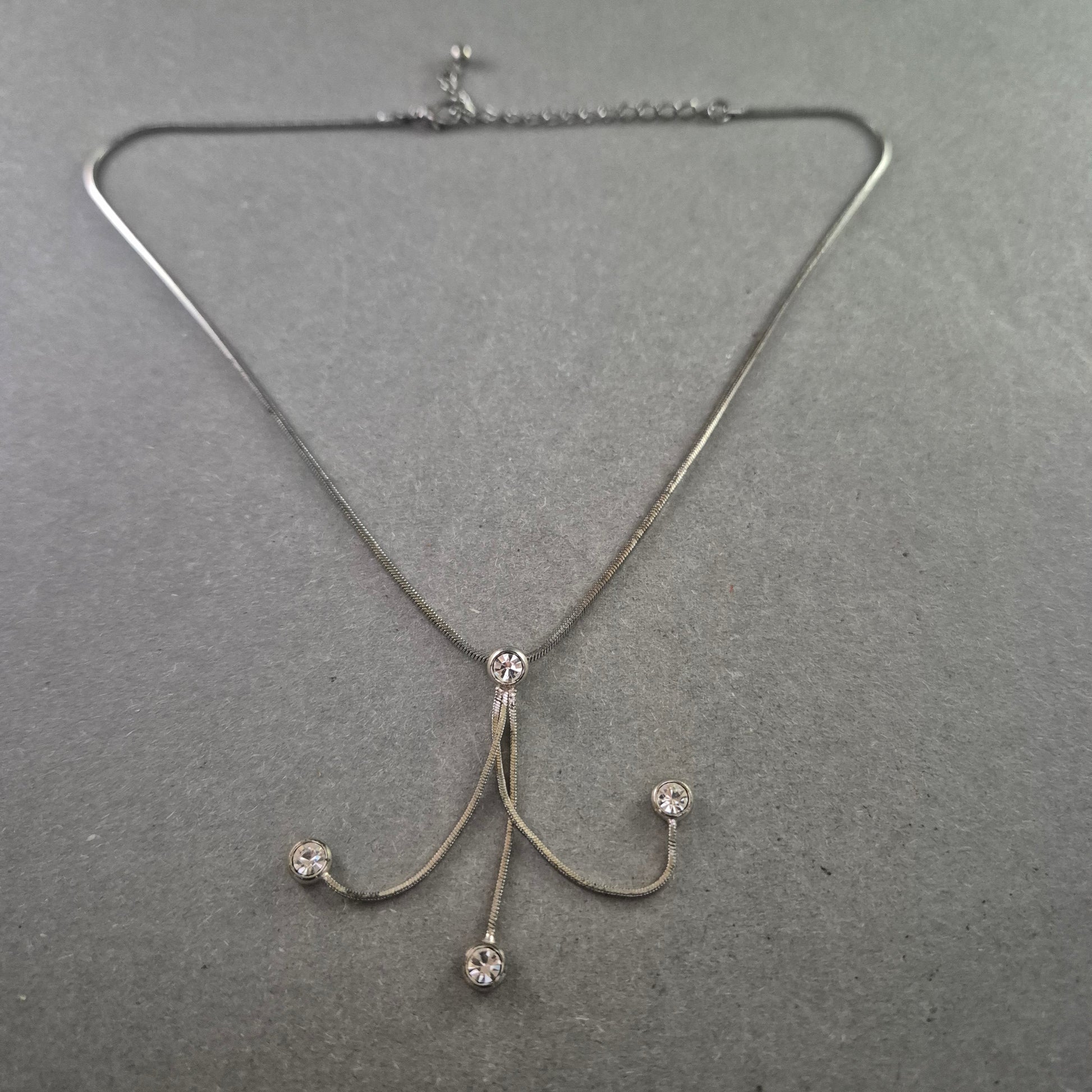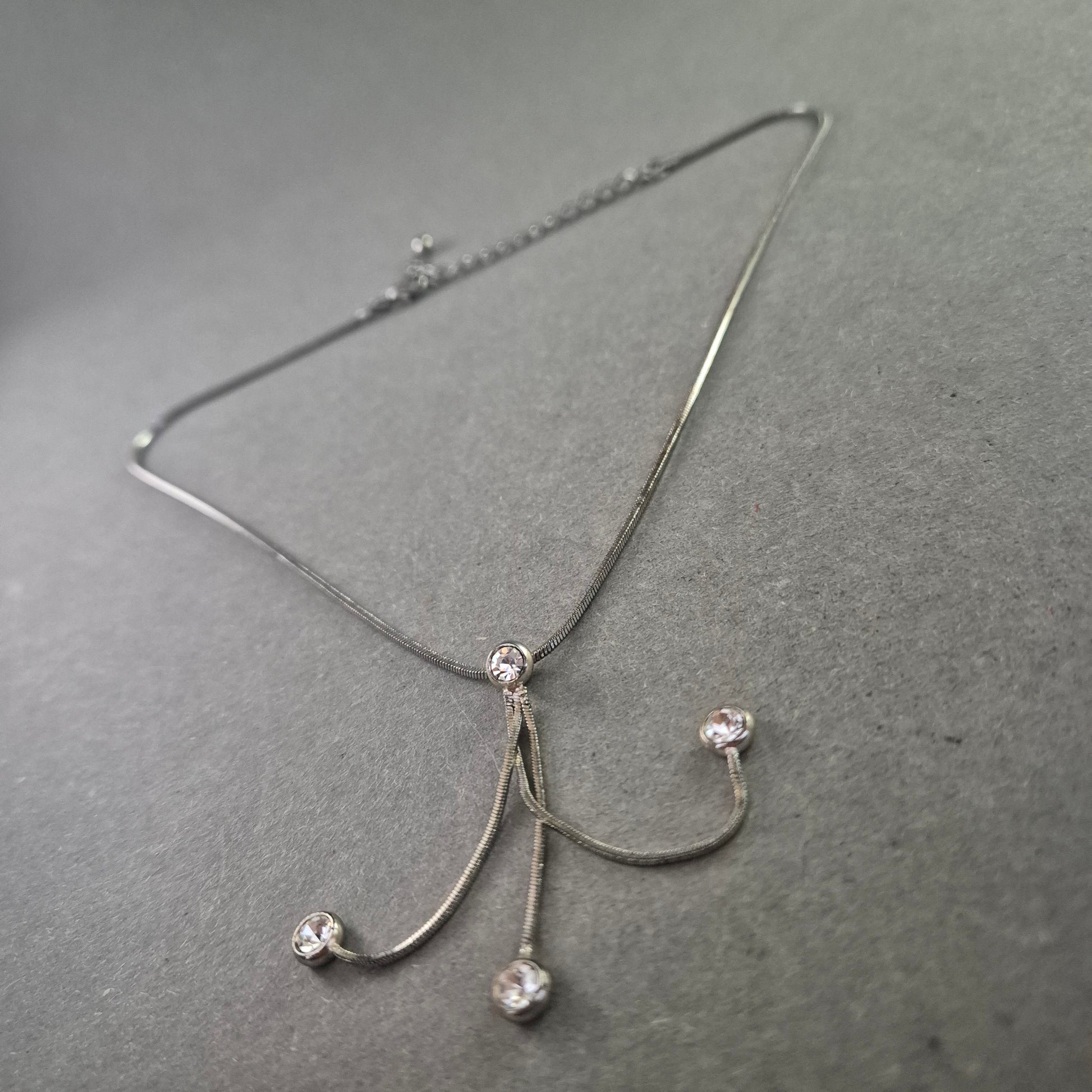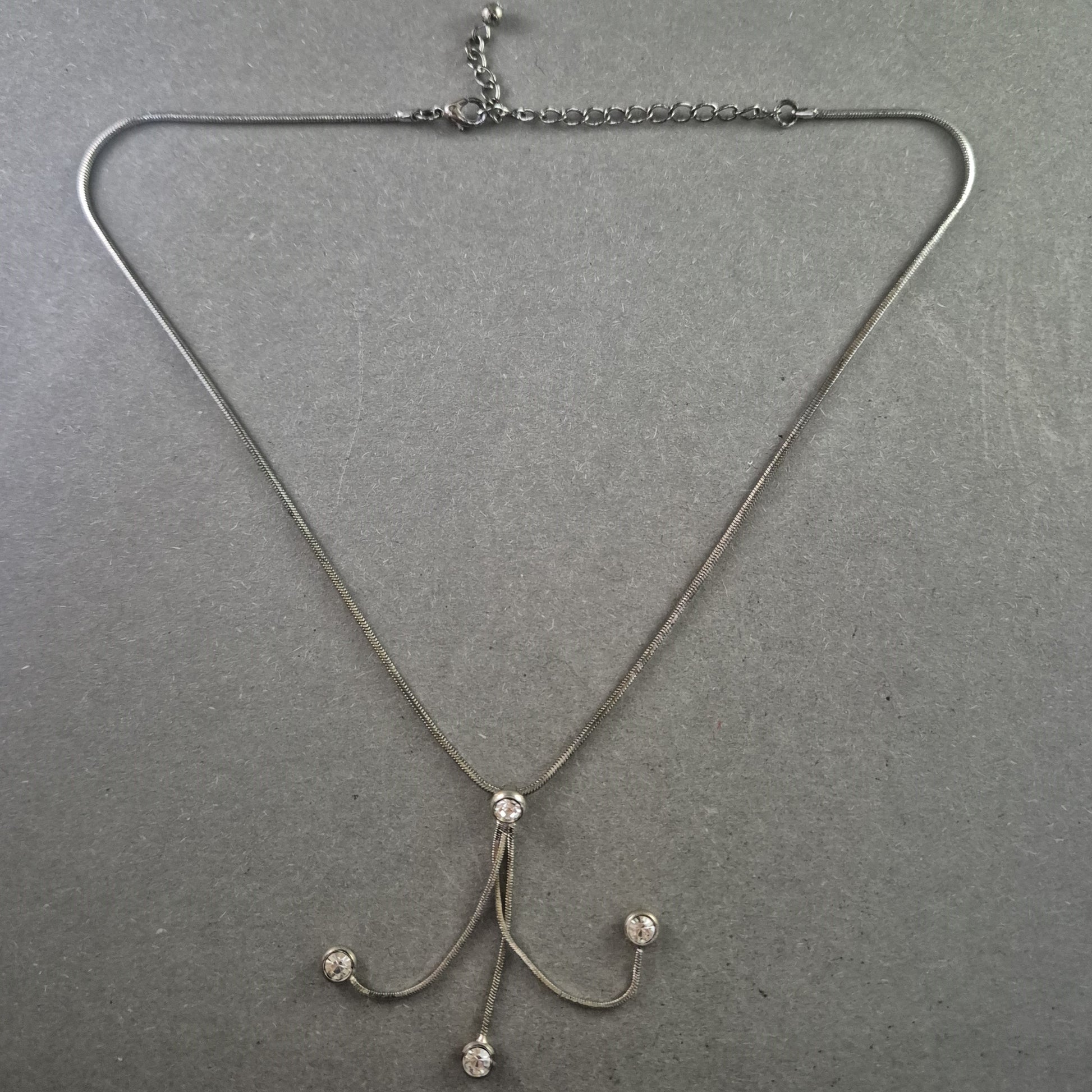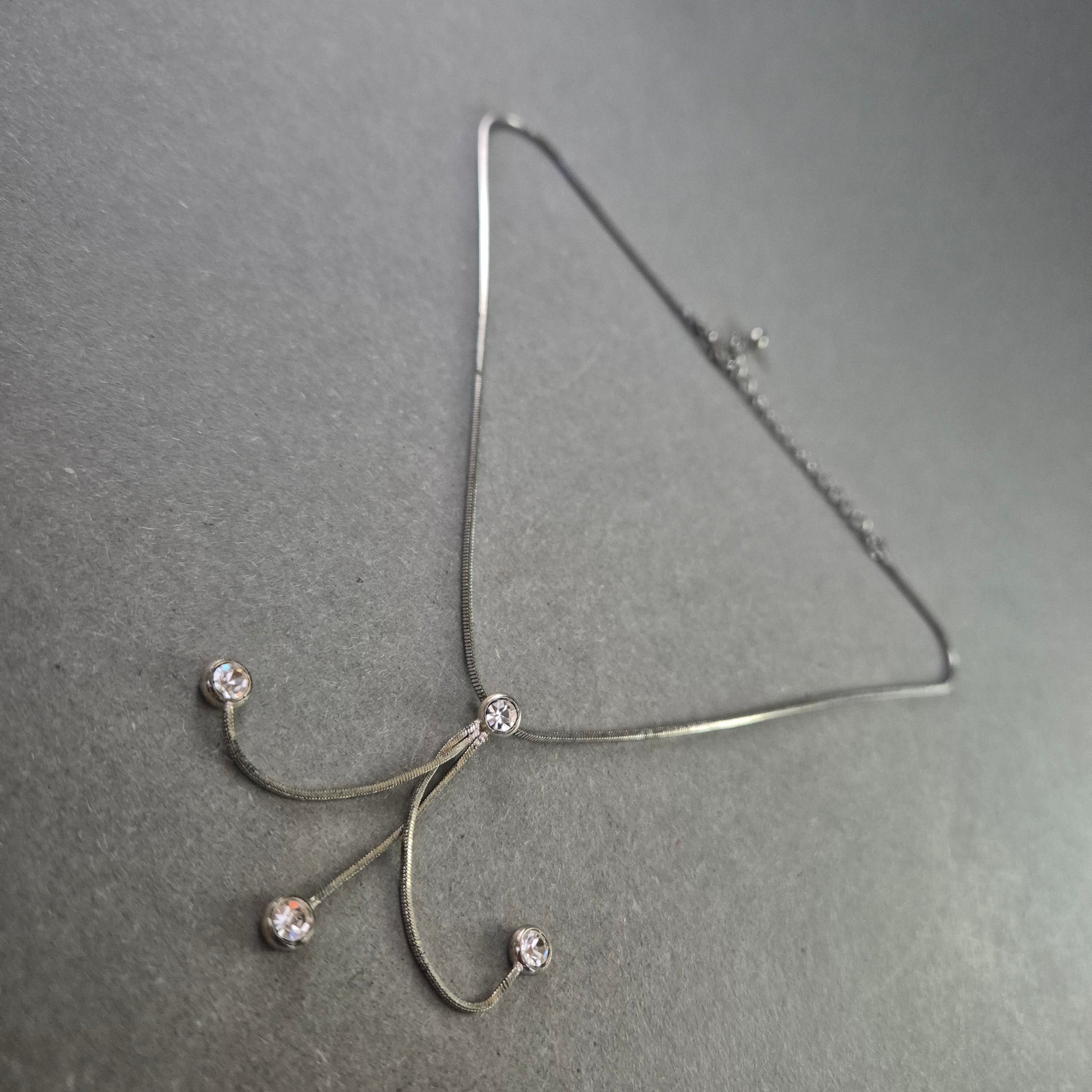 Diese elegante Collierkette kombiniert schlichte Linien mit verspielten Details. Der zentrale Anhänger besteht aus geschwungenen Elementen mit funkelnden Strasssteinen an den Enden. Die feine, silberfarbene Schlangenkette lässt sich durch ein Verlängerungskettchen individuell anpassen – ideal für elegante Abendoutfits oder festliche Anlässe.