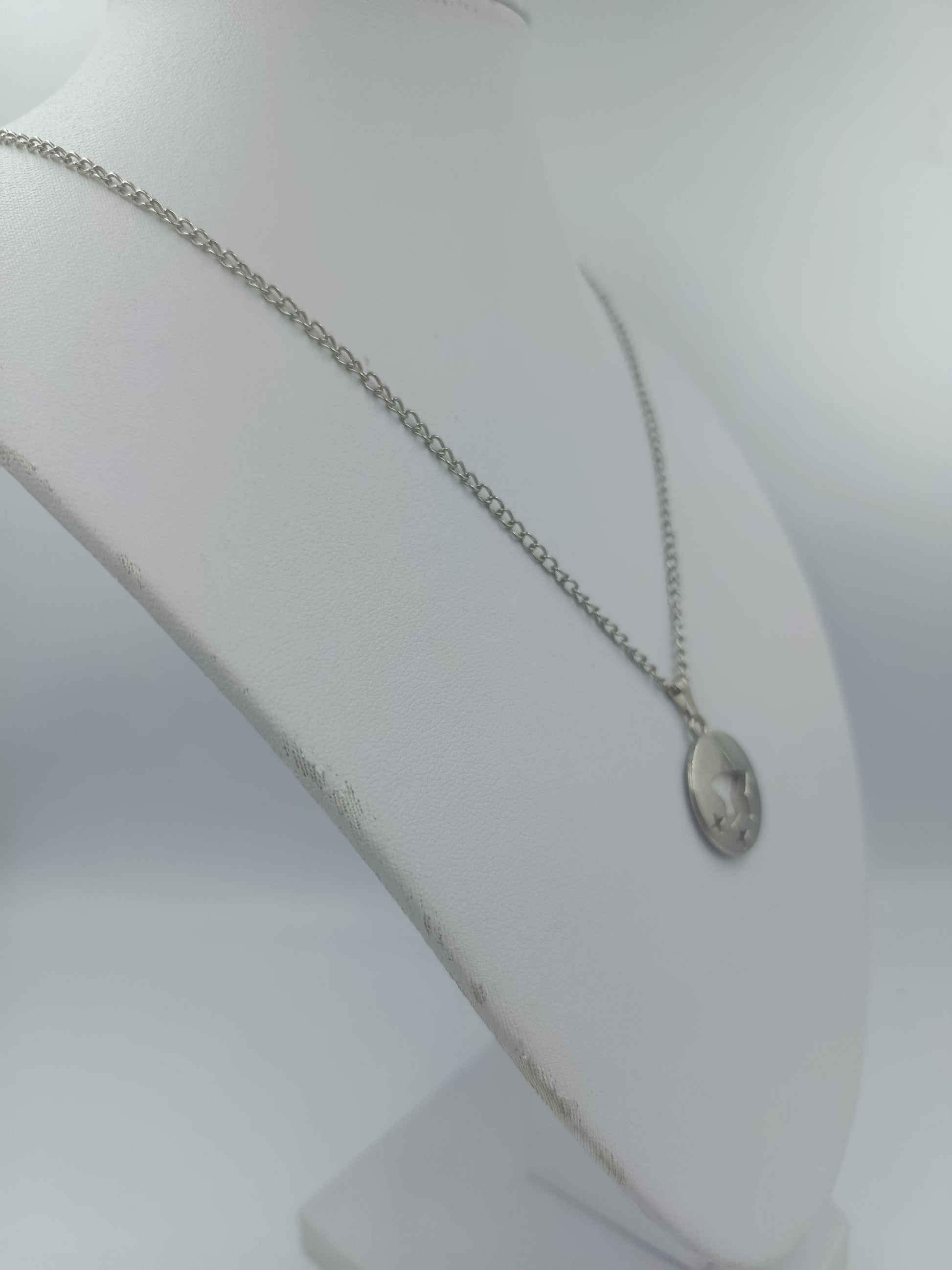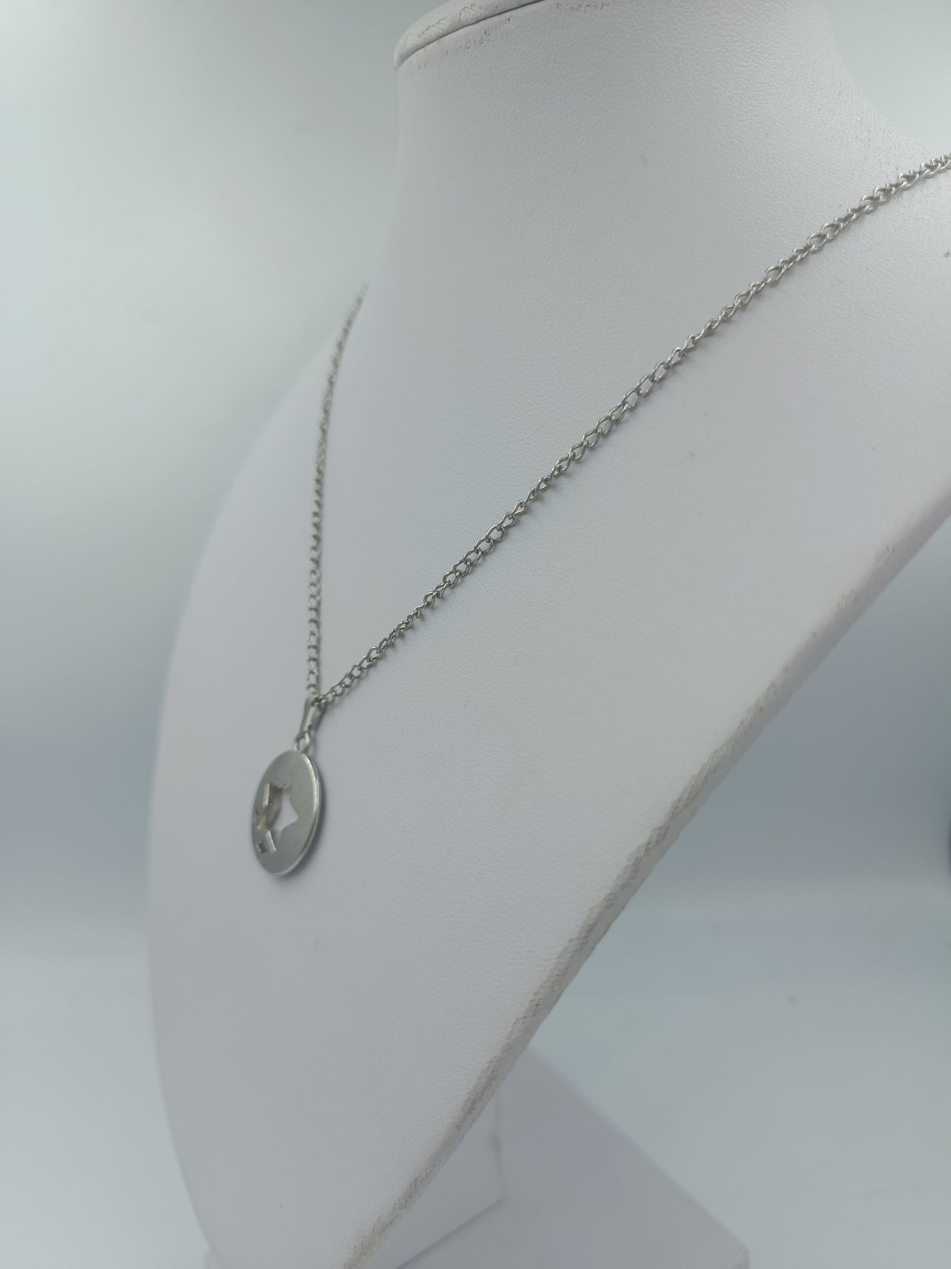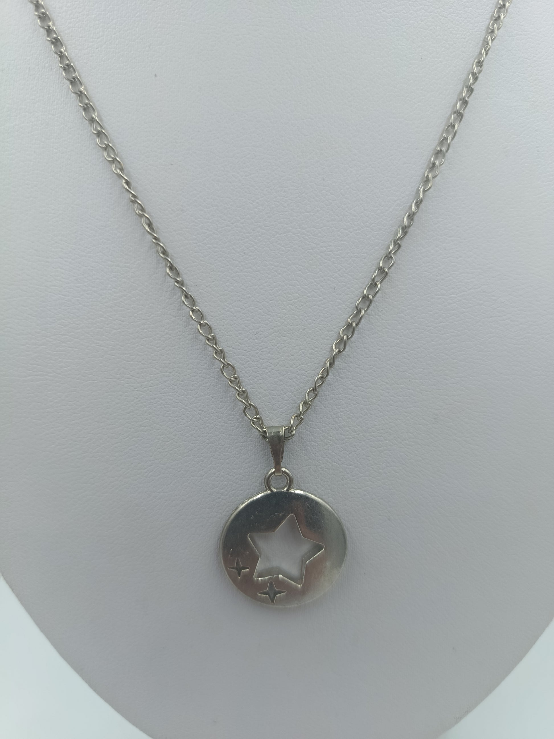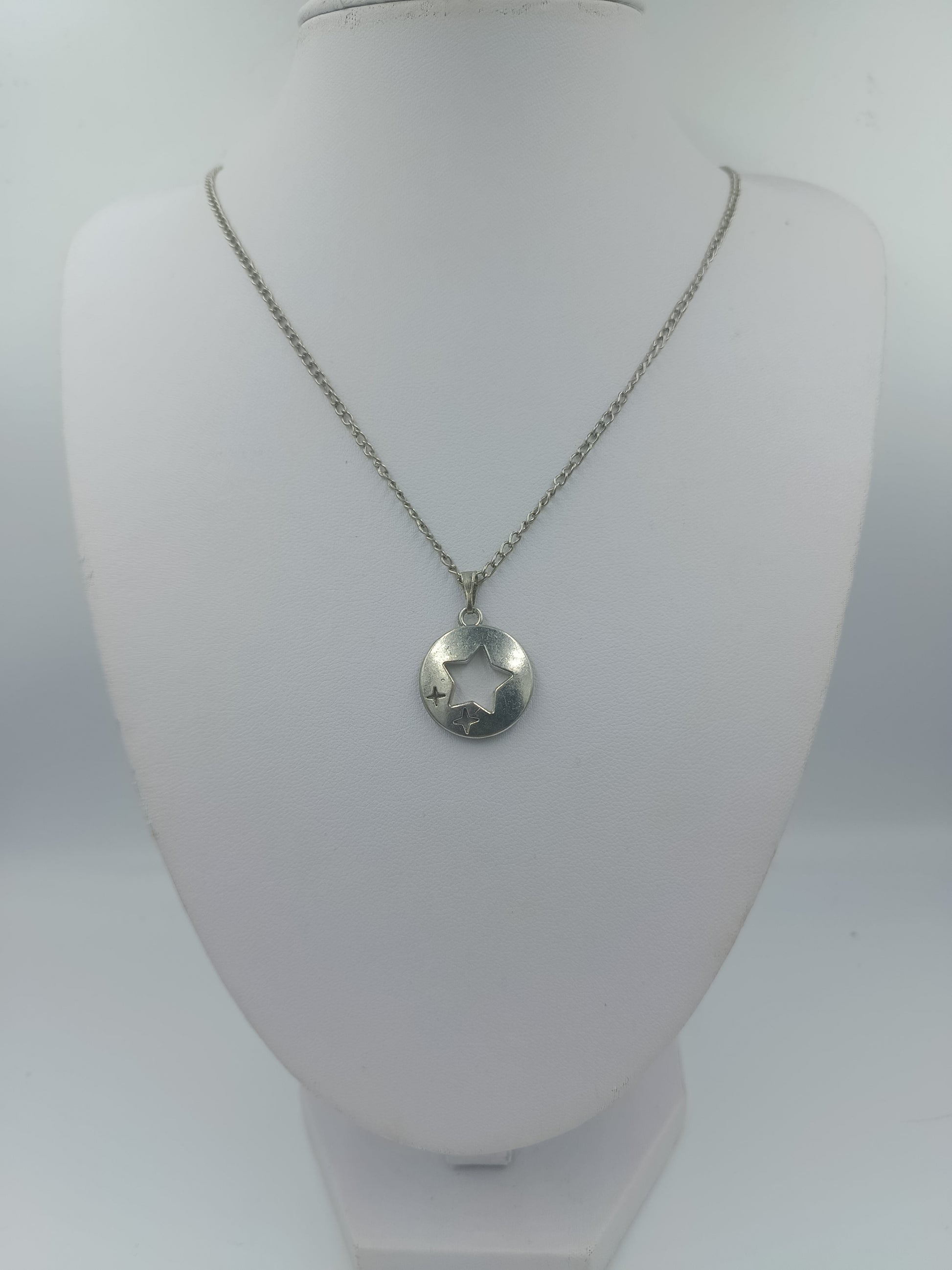 Moderne silberfarbene Halskette mit rundem Anhänger im Stern-Design. Der ausgestanzte Stern in Kombination mit der schlichten Gliederkette verleiht dem Schmuckstück einen zeitlosen und trendigen Look – perfekt für den Alltag oder als stilvolles Accessoire zu jedem Outfit.