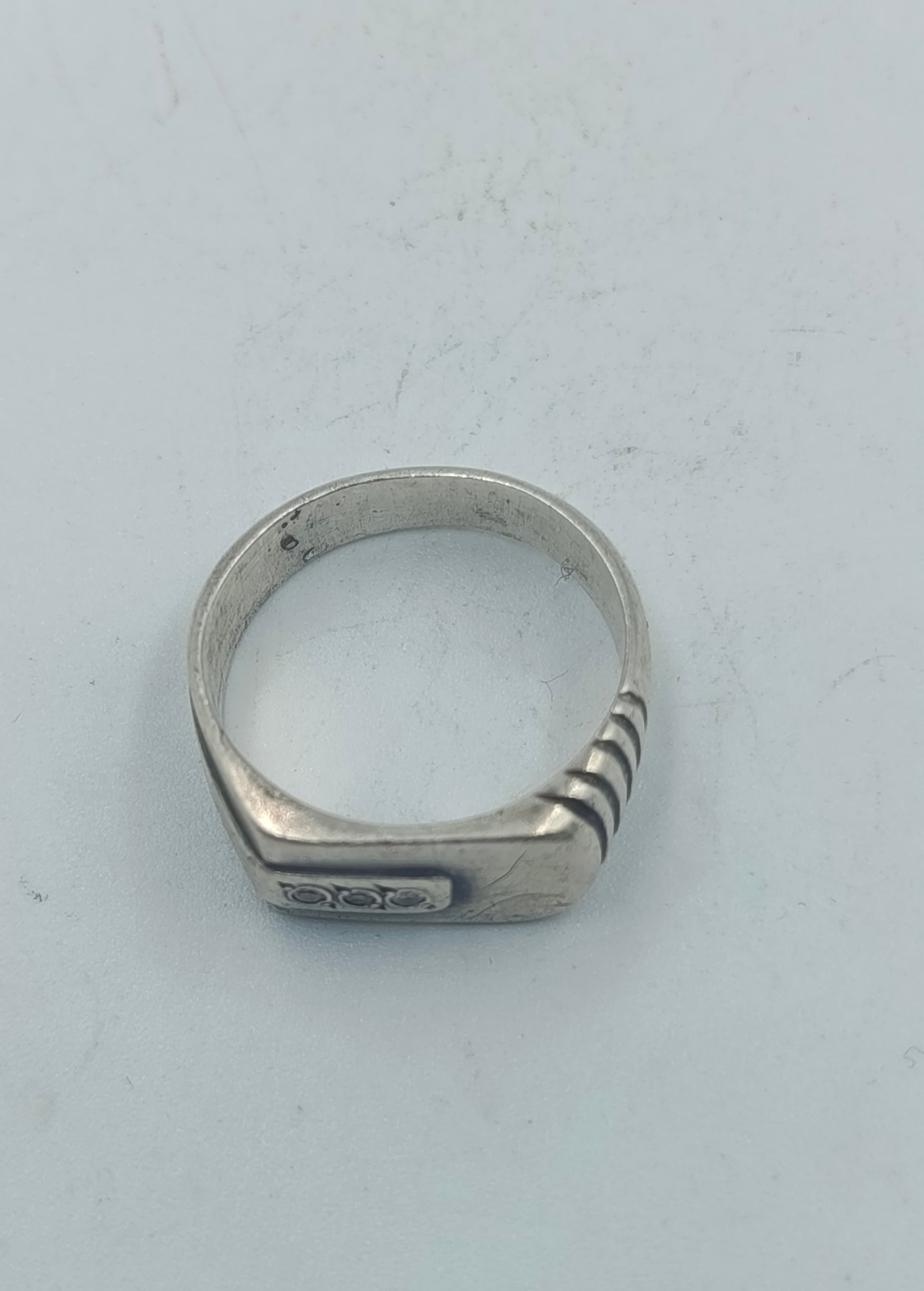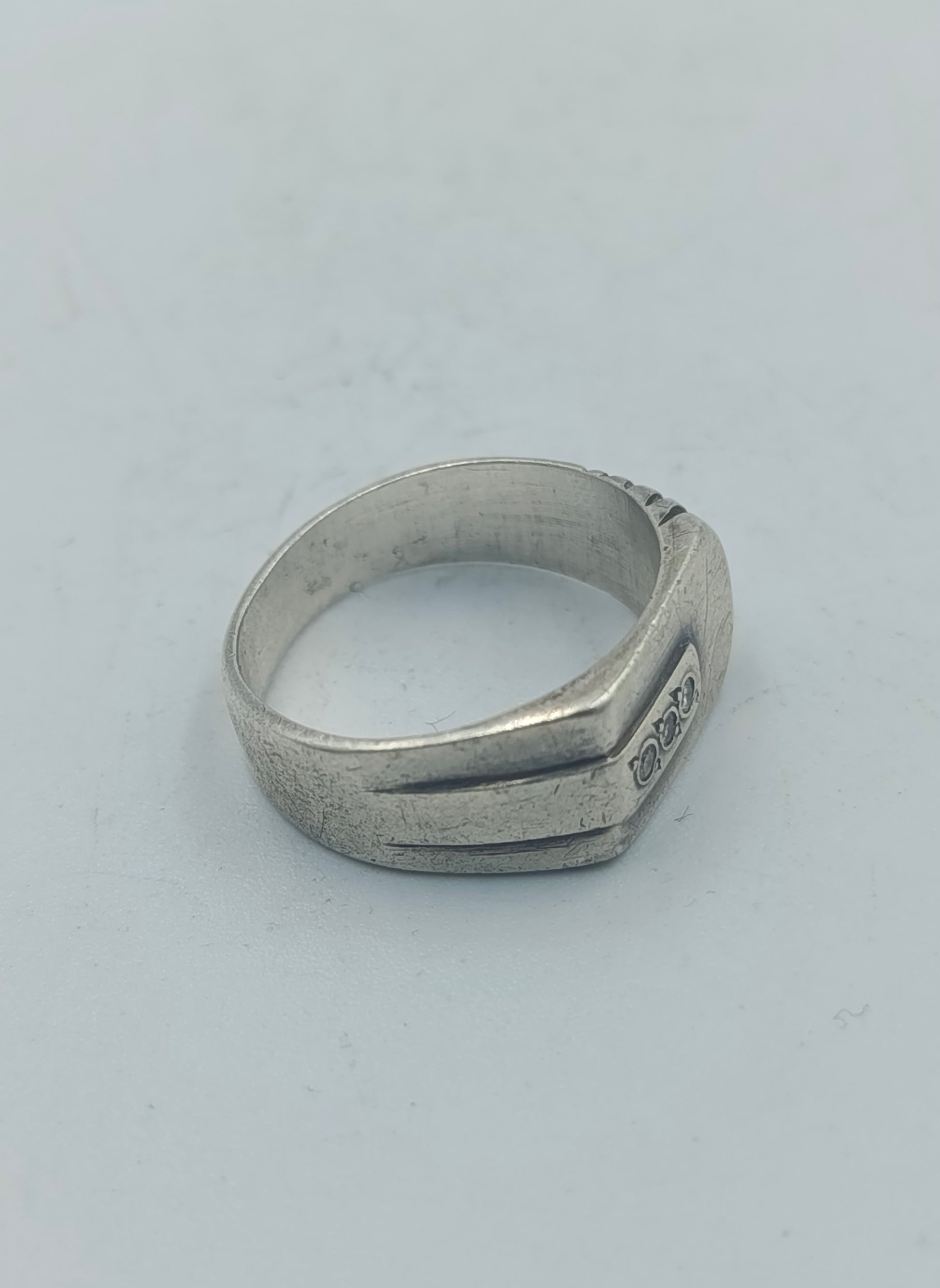 Dieser markante Silberring überzeugt mit seinem massiven, leicht kantigen Design und den drei klaren Steinen auf der Front. Durch seine breitere Form wirkt er besonders maskulin und eignet sich ideal als Statement-Ring für den Alltag oder als besonderes Accessoire. Der Ring zeigt leichte Tragespuren, was ihm einen authentischen Vintage-Charakter verleiht.