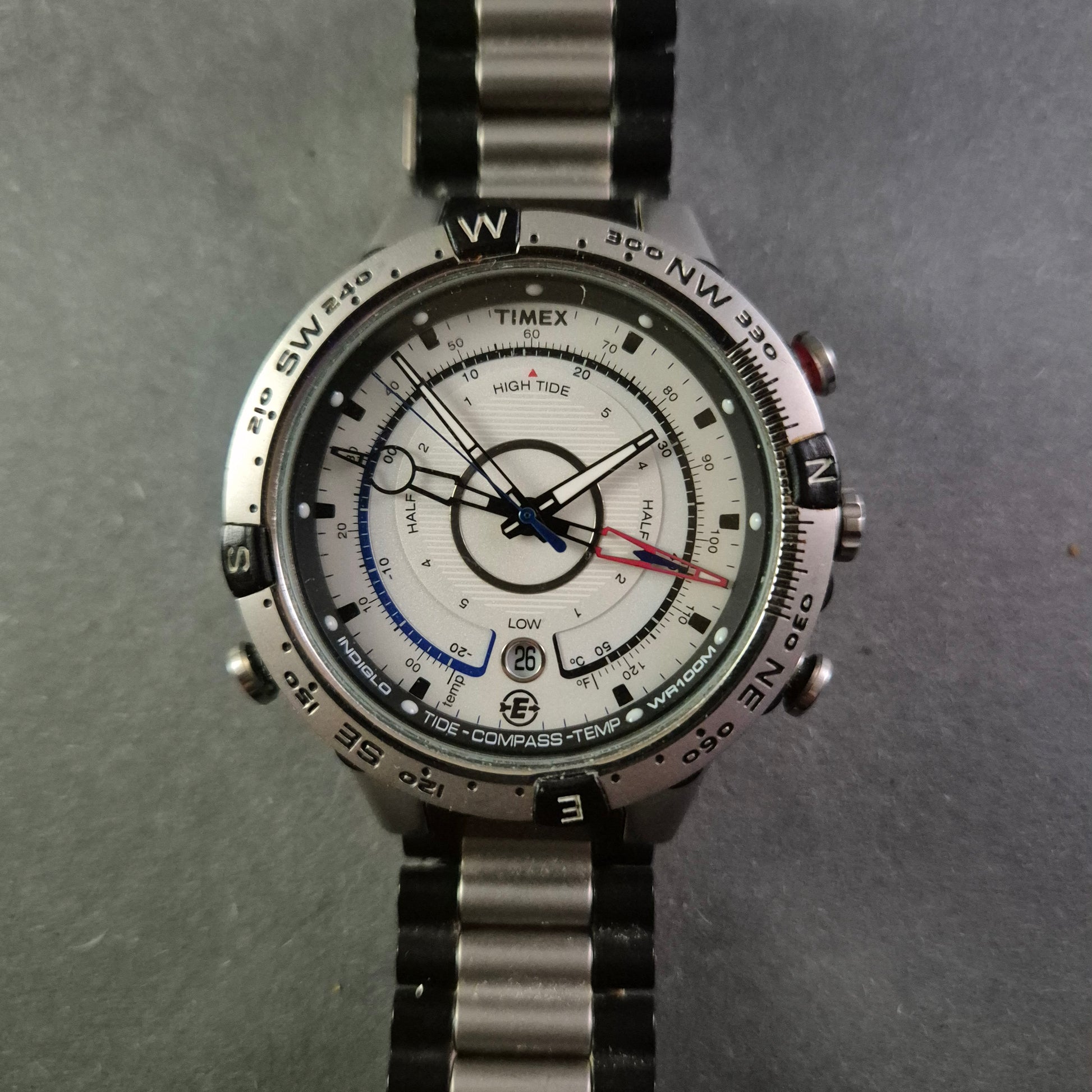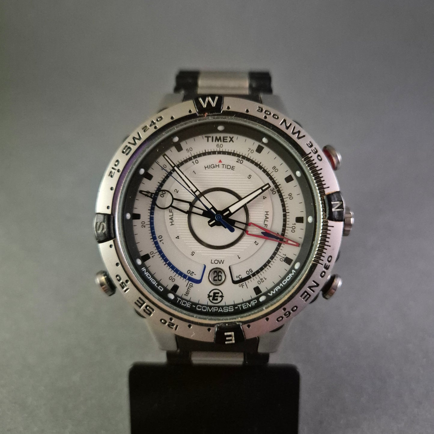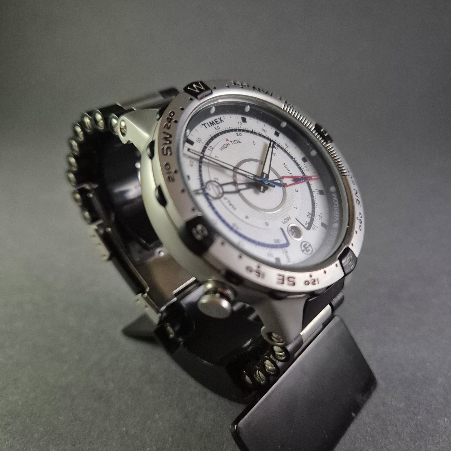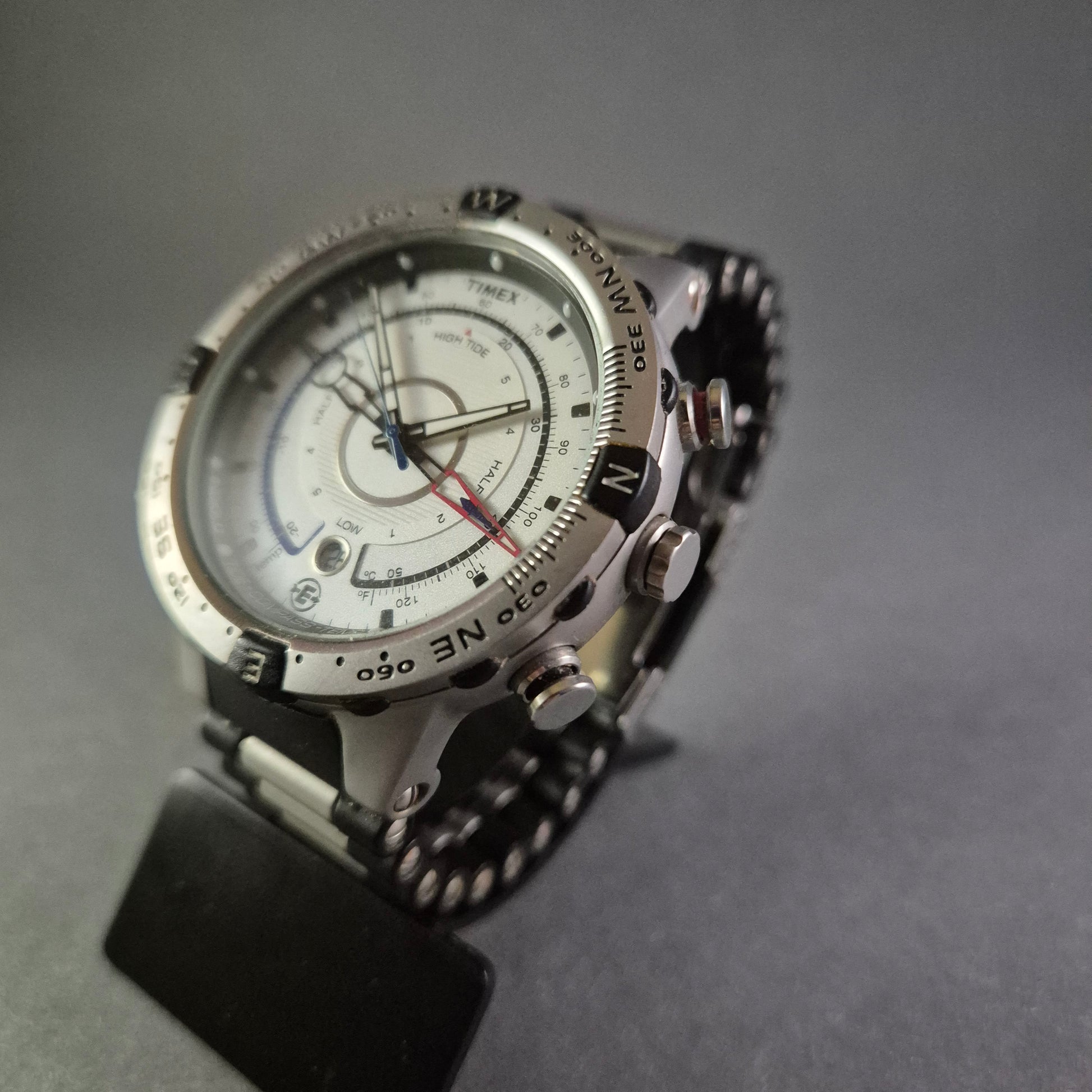Diese Timex Herrenarmbanduhr vereint Funktionalität mit einem sportlichen Design. Ausgestattet mit einem Edelstahlgehäuse und einem robusten Armband, bietet sie zahlreiche Funktionen, darunter eine Anzeige für Hoch- und Niedrigwasser sowie einen Kompass. Die klare, weiße Zifferblattgestaltung ermöglicht eine leichte Ablesbarkeit, während die Chronographen- und Tachymeterfunktionen sie ideal für aktive Träger machen. Ein perfekter Begleiter für Outdoor-Enthusiasten und Abenteurer.