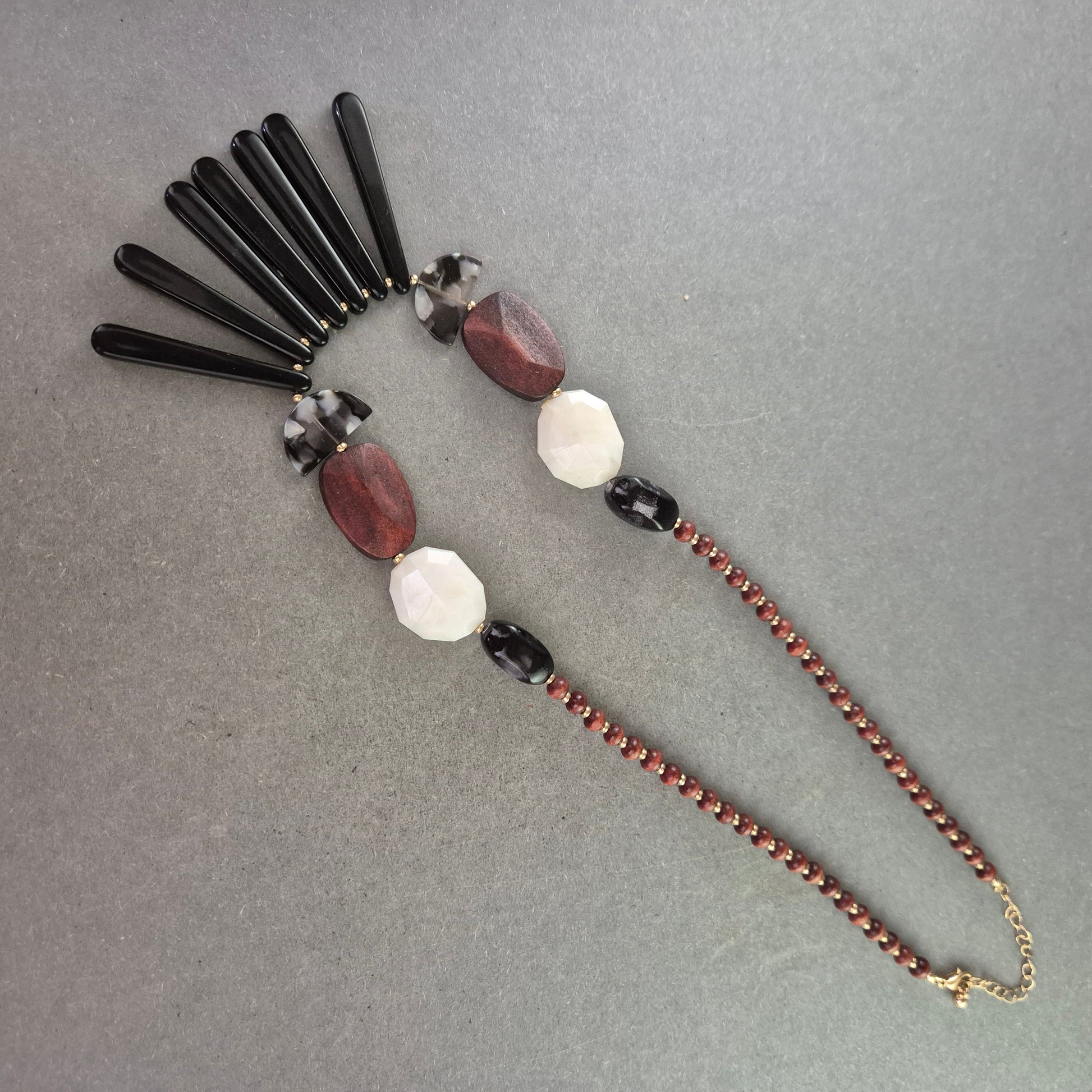 Diese ausgefallene Statement-Halskette vereint unterschiedlichste Materialien zu einem auffälligen Ensemble: braune Holzperlen, weiße und schwarze Acrylsteine sowie tropfenförmige schwarze Anhänger bilden ein harmonisches, ethnisch inspiriertes Design. Die Verlängerungskette mit Karabinerverschluss bietet Flexibilität beim Tragen – perfekt für Boho- oder Ethno-Looks.