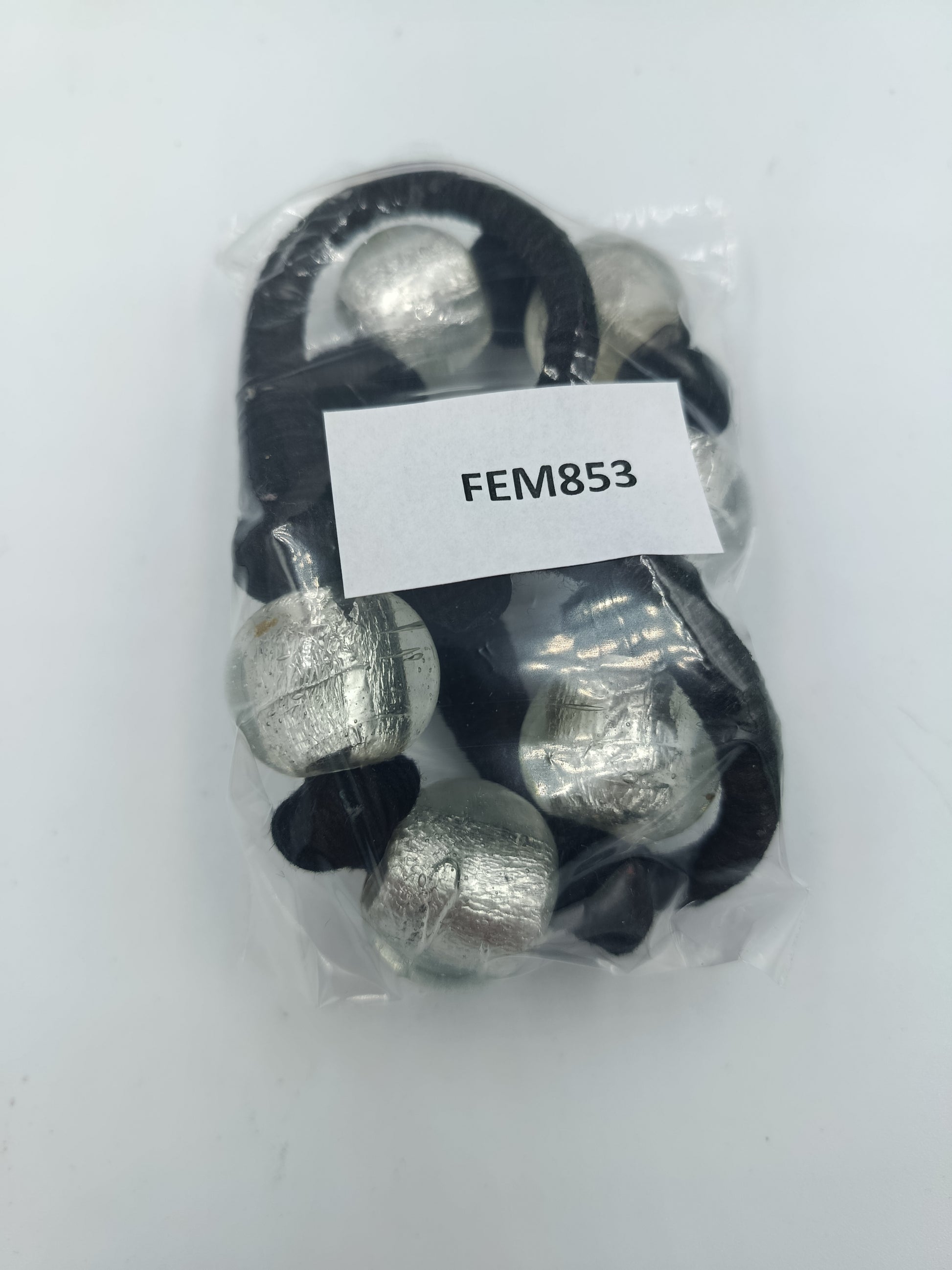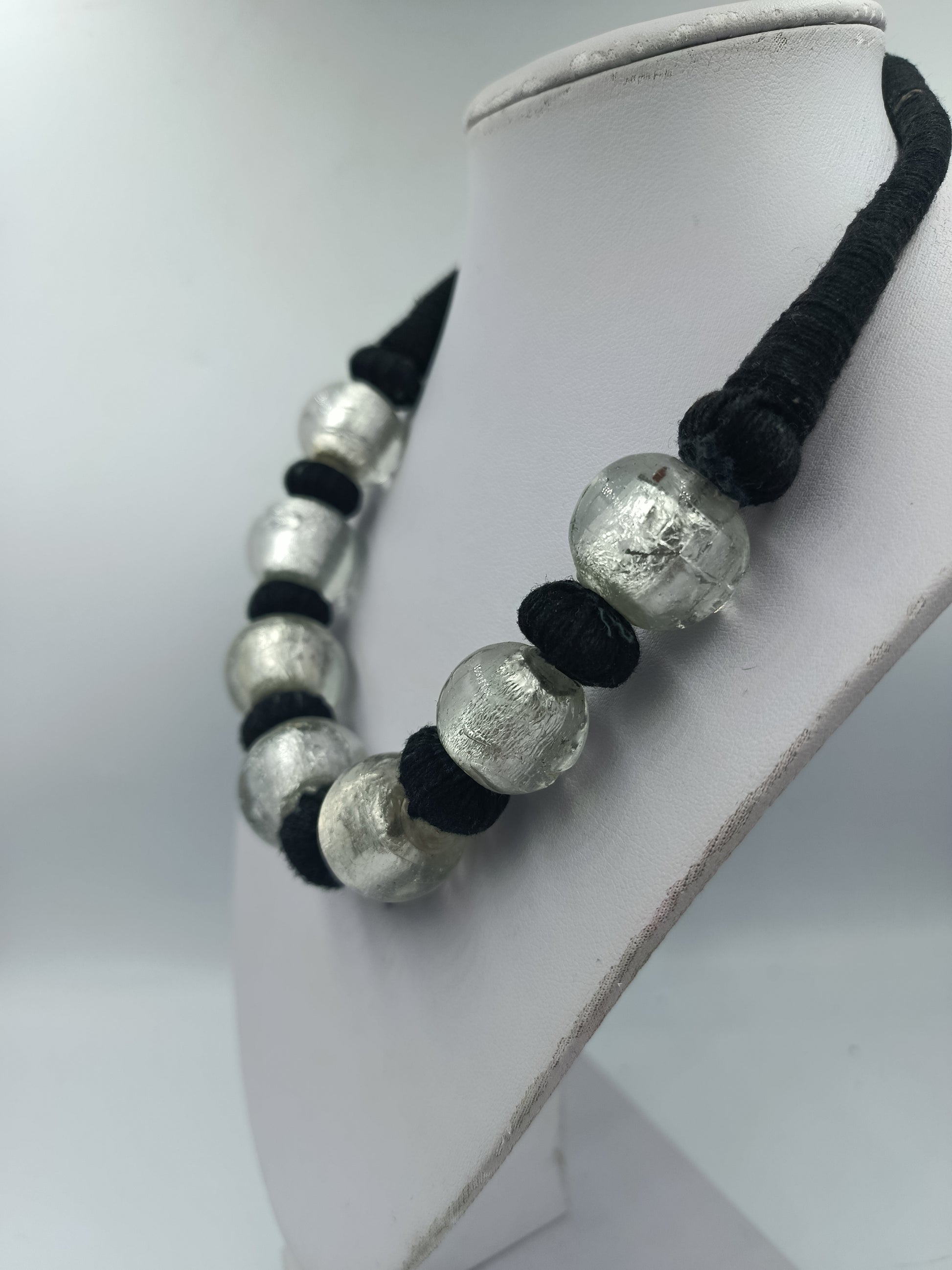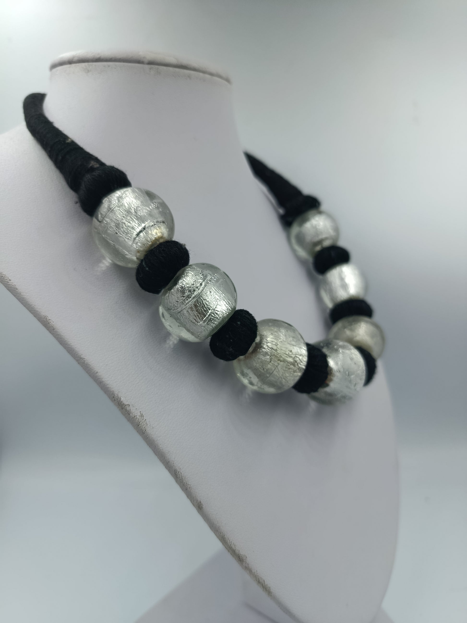 Auffällige Statementkette mit großen silberfarbenen Kugelperlen und schwarzen textilumwickelten Elementen. Der markante Kontrast zwischen mattem Schwarz und glänzendem Silber verleiht dieser Kette einen modernen, kunstvollen Look – ideal für ein modisches Statement zu schlichten Outfits.