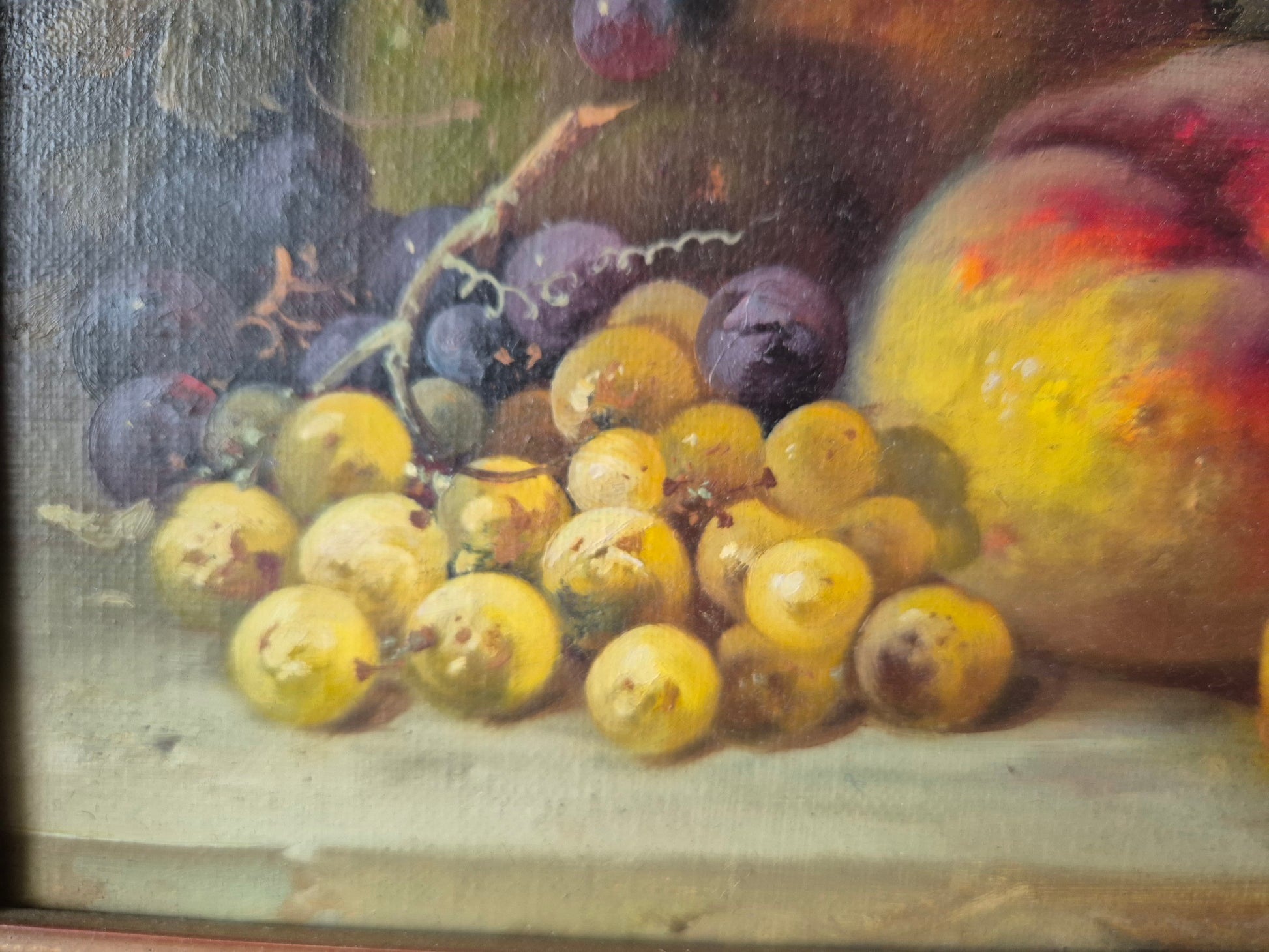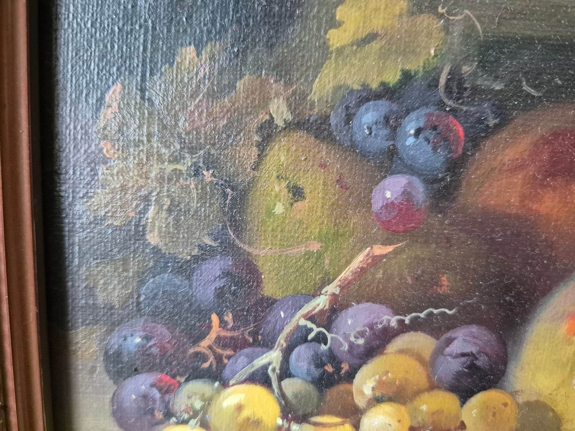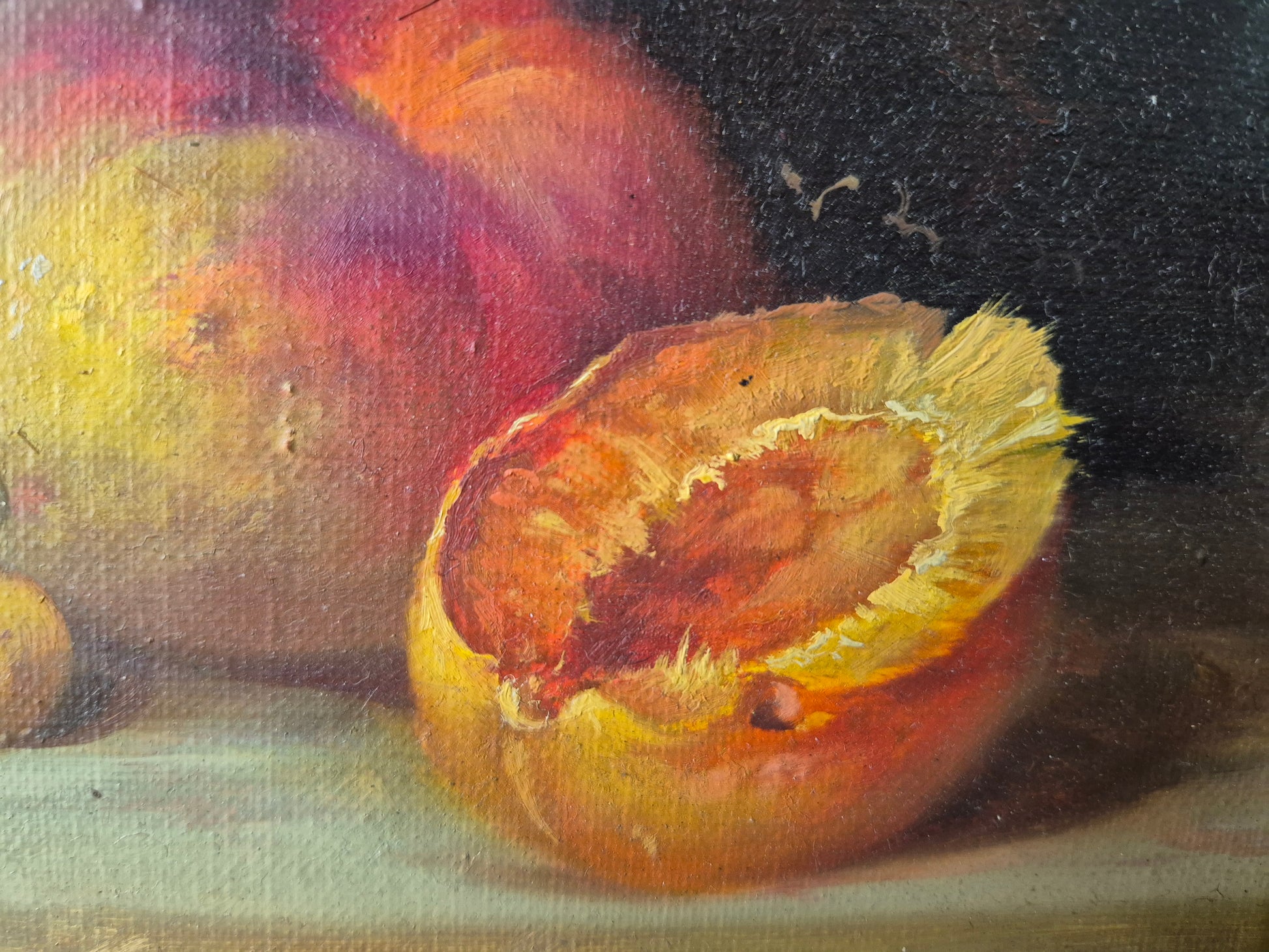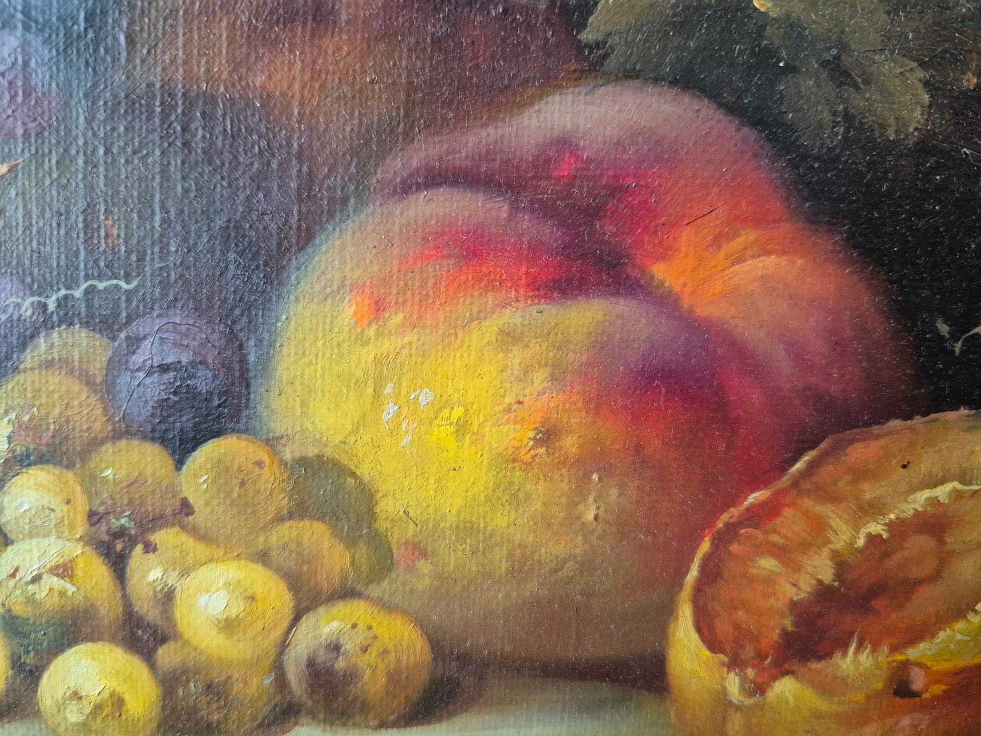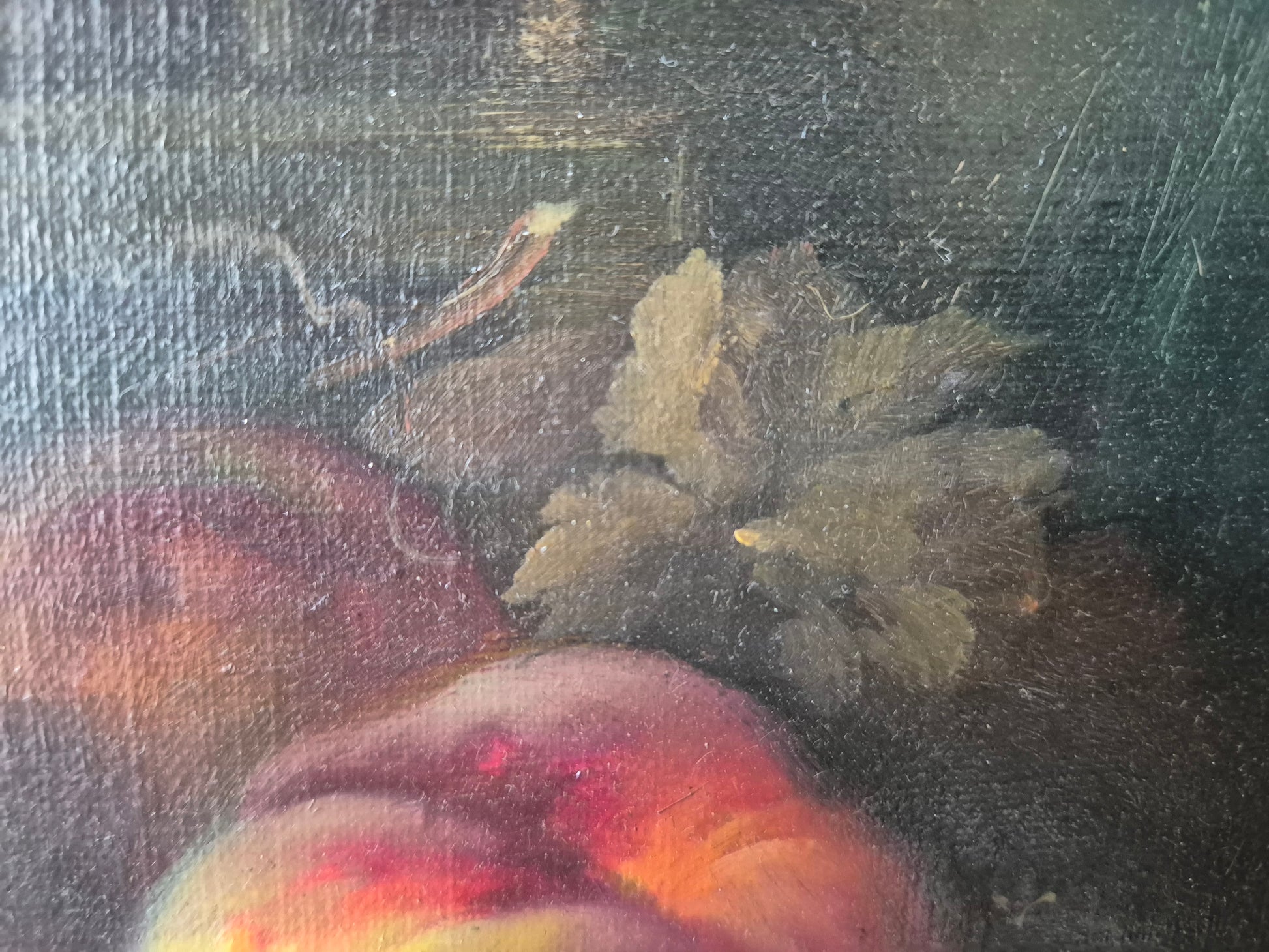 Dieses fein ausgearbeitete Ölgemälde zeigt ein klassisches Stillleben mit reifen Pfirsichen und saftigen Weintrauben, kunstvoll arrangiert auf einem dunklen Untergrund. Die warme Farbpalette und das natürliche Licht verleihen dem Motiv Tiefe und Lebendigkeit.