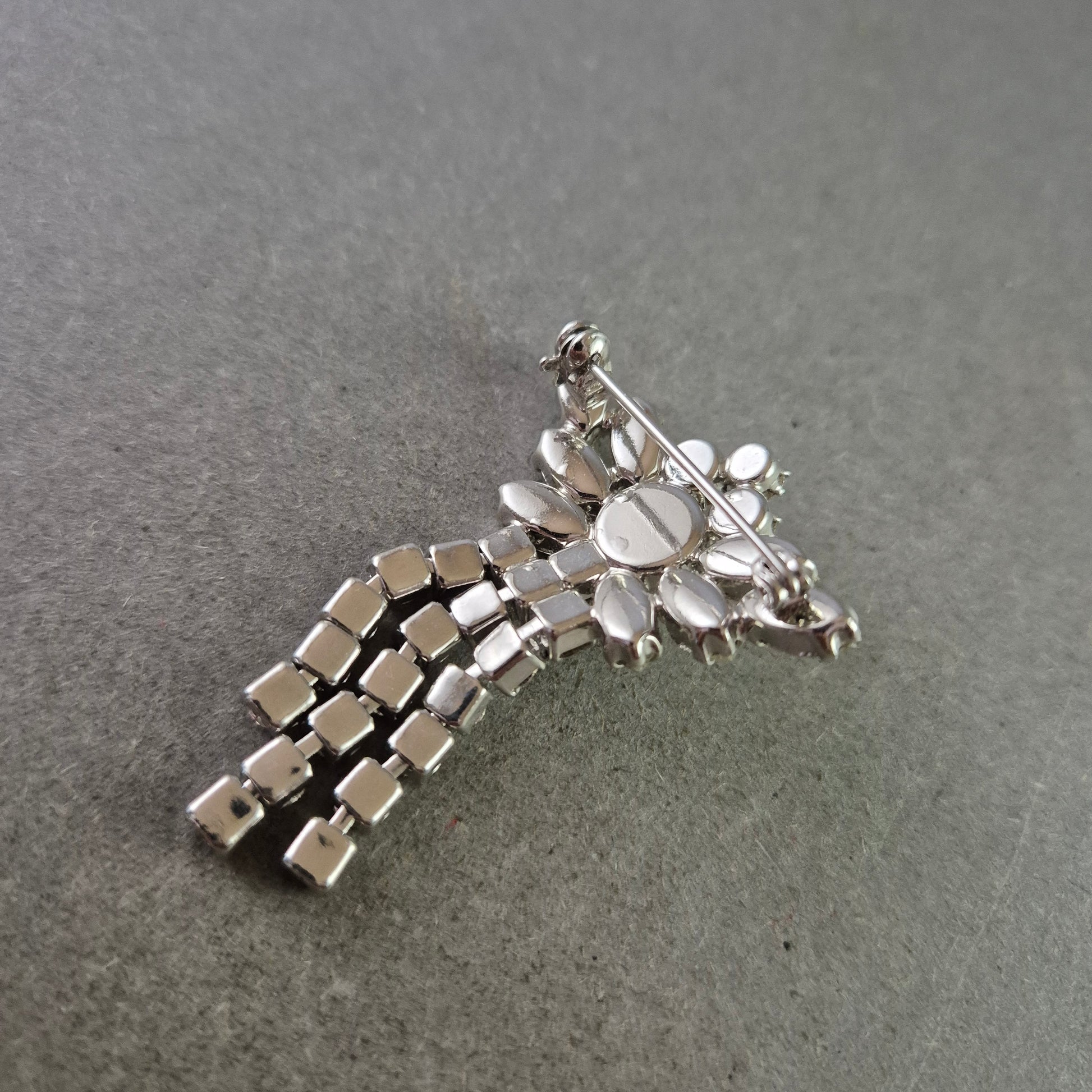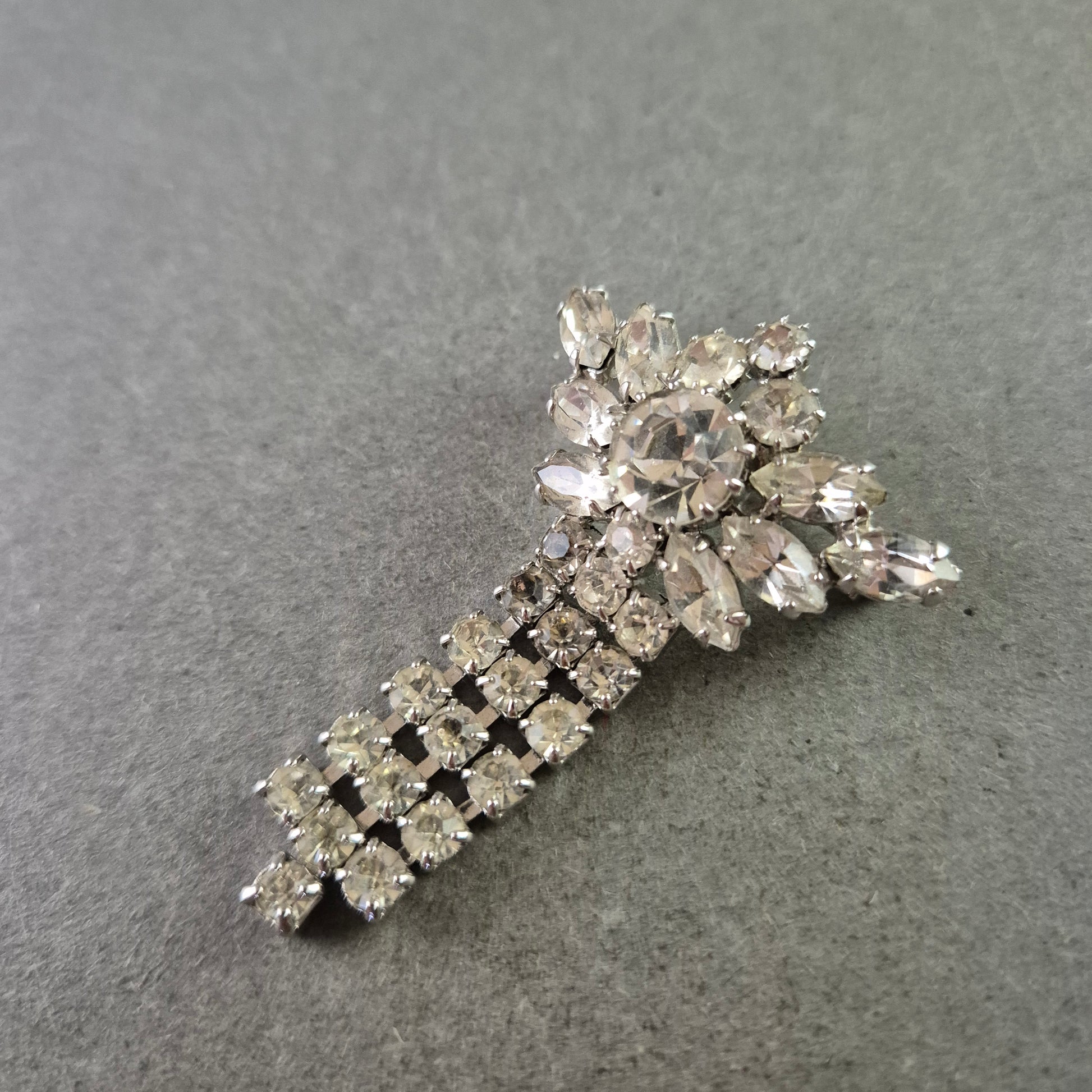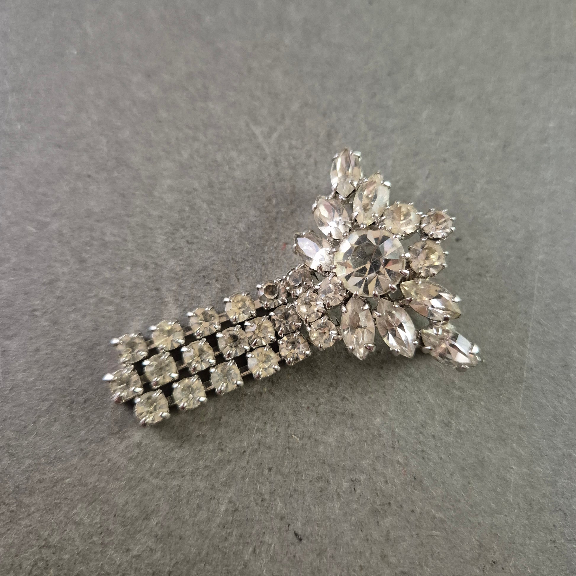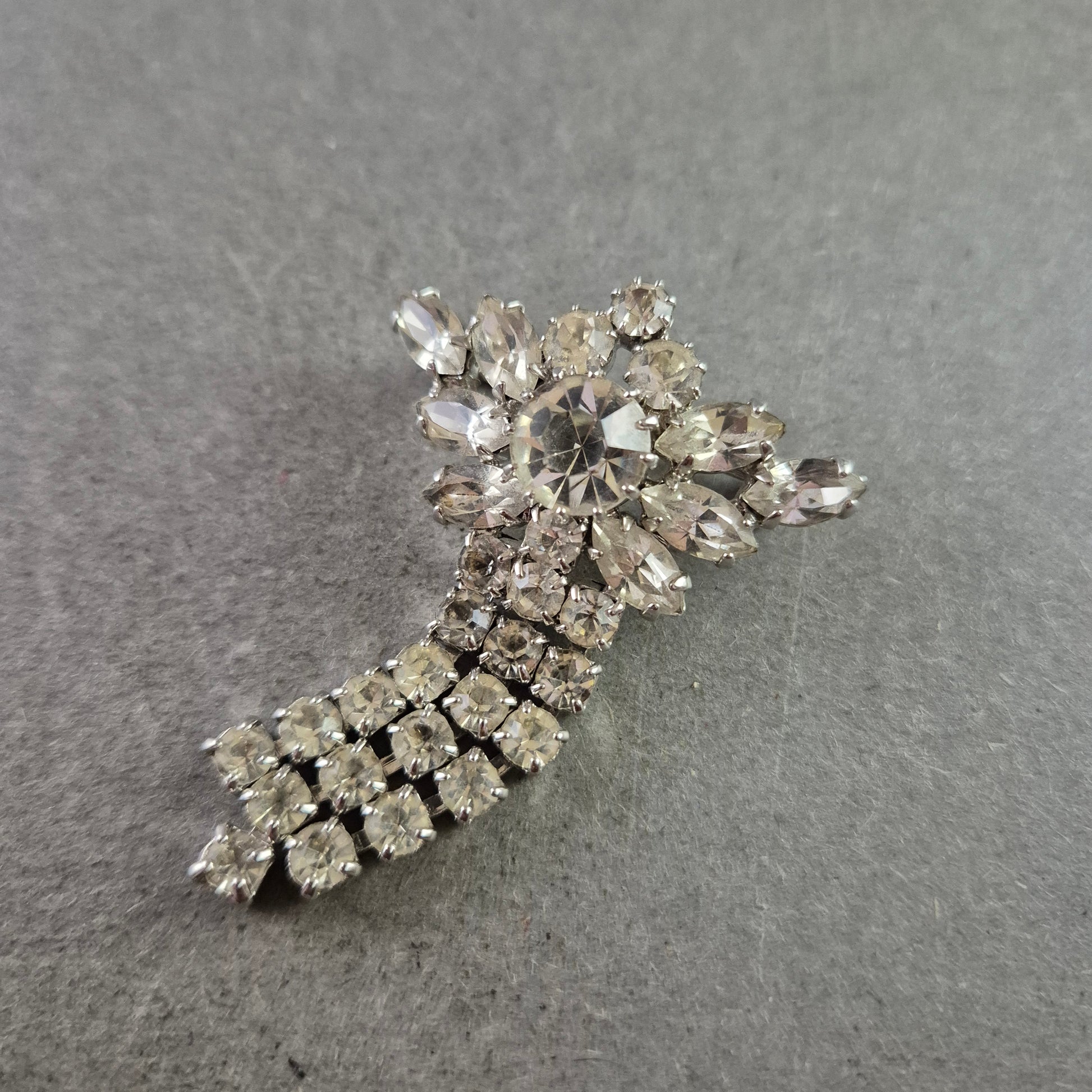 Diese glamouröse Brosche ist vollständig mit funkelnden Strasssteinen besetzt. Das Design kombiniert eine große Blütenform mit einem herabhängenden Strass-Element, das der Brosche eine elegante, leicht verspielte Note verleiht. Die silberfarbene Fassung unterstreicht die Strahlkraft der Steine und macht dieses Schmuckstück zum perfekten Accessoire für festliche Anlässe, Abendmode oder als Eyecatcher auf Jacken und Schals.