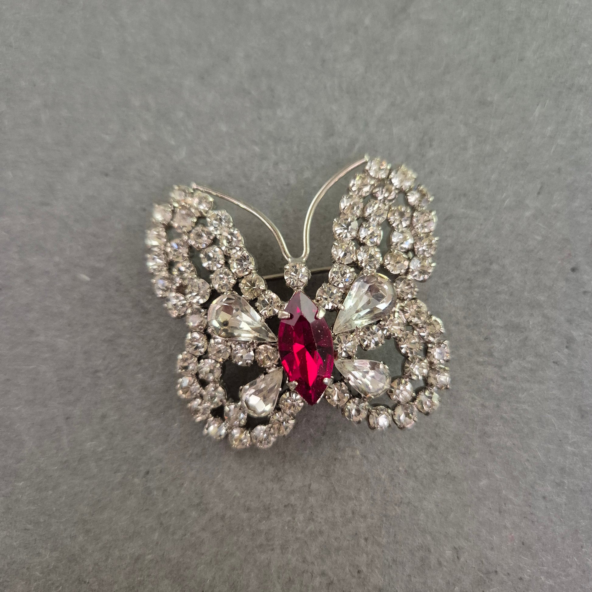 Diese glanzvolle Vintage-Brosche in Form eines Schmetterlings ist vollständig mit funkelnden Strasssteinen besetzt. Das Highlight bildet ein roter navetteförmiger Mittelstein, eingerahmt von klaren Tropfensteinen. Die detailreiche Gestaltung und das versilberte Metall machen diese Brosche zu einem echten Eyecatcher – ideal für besondere Anlässe oder glamouröse Outfits.