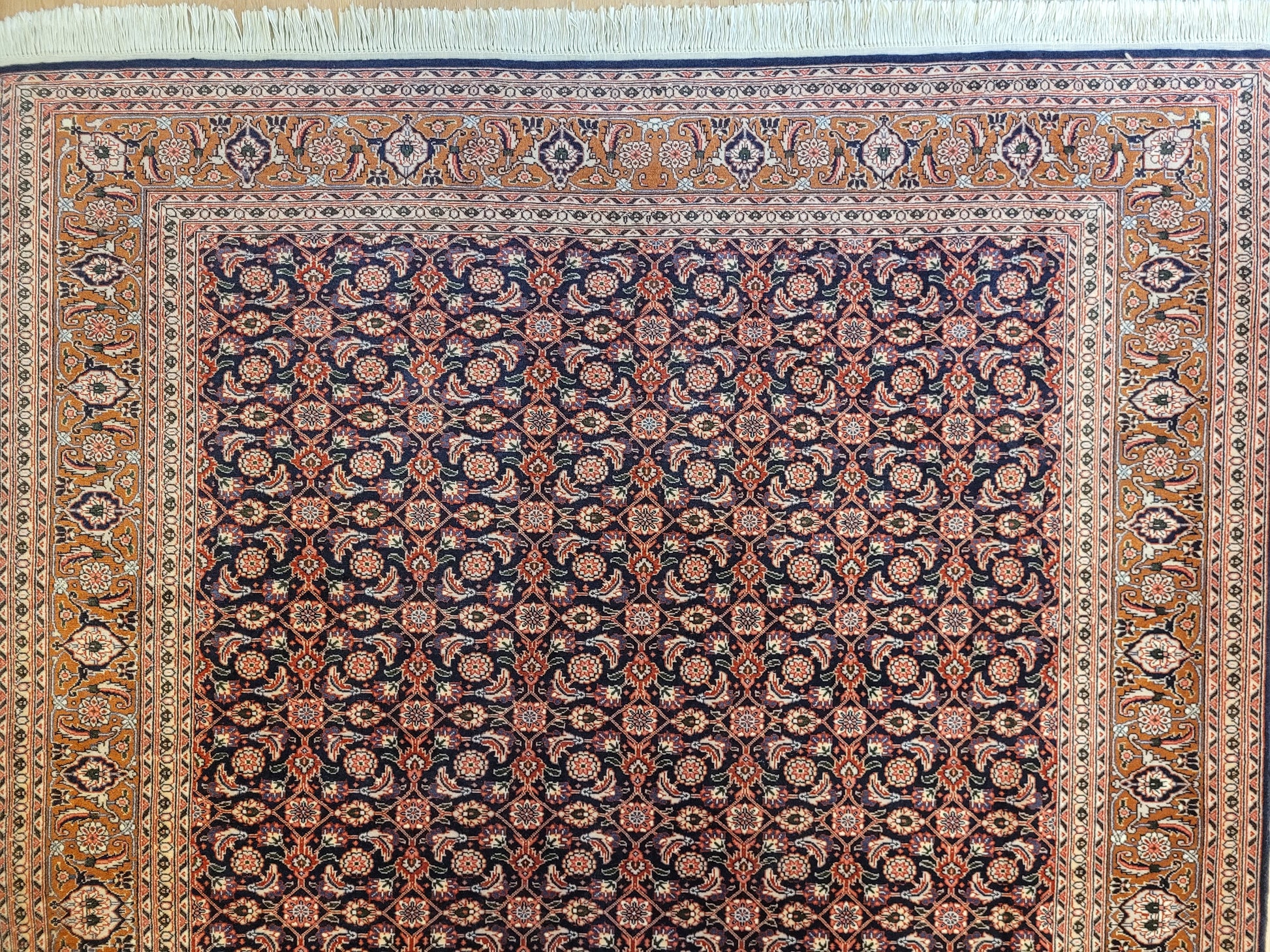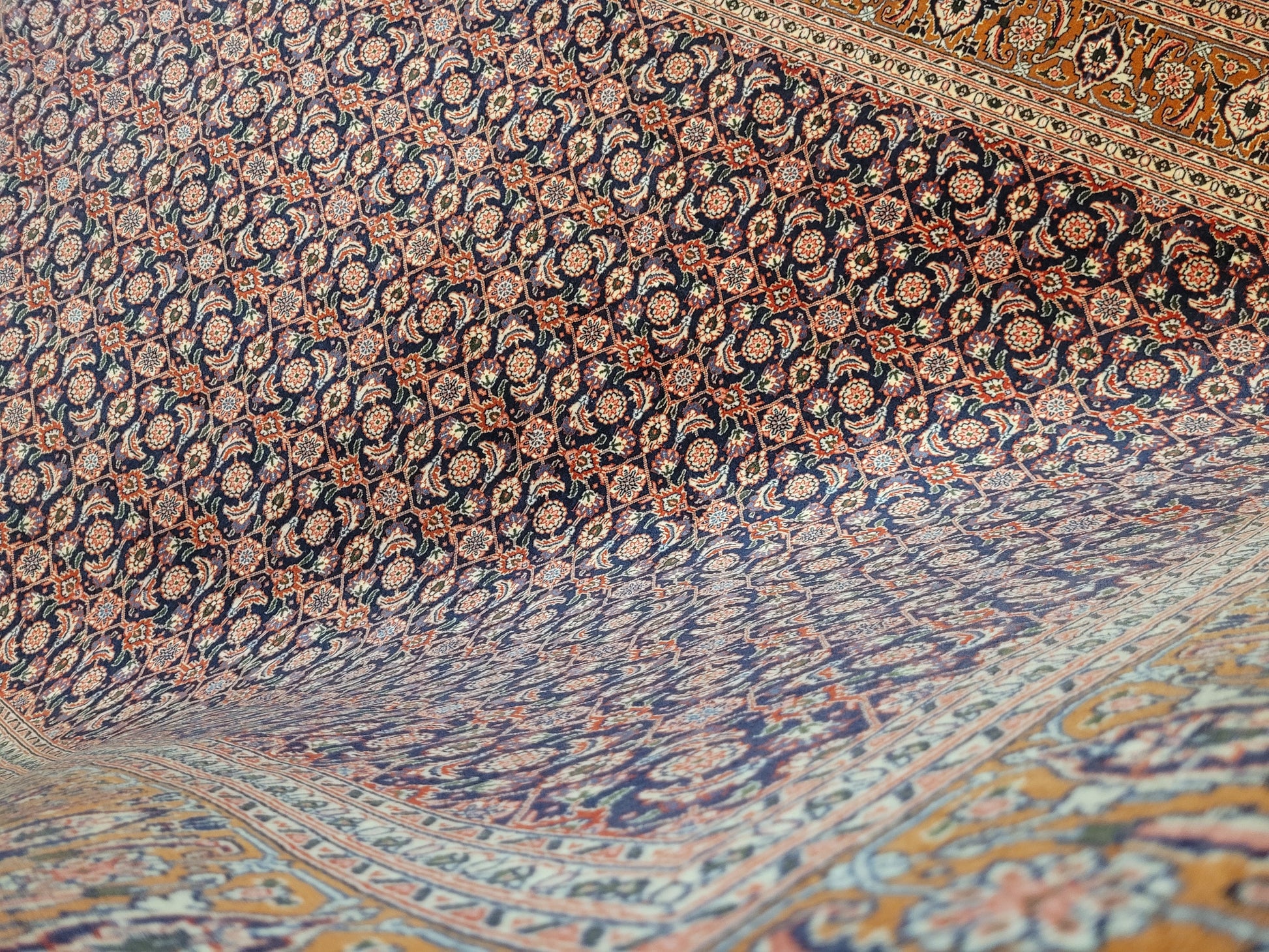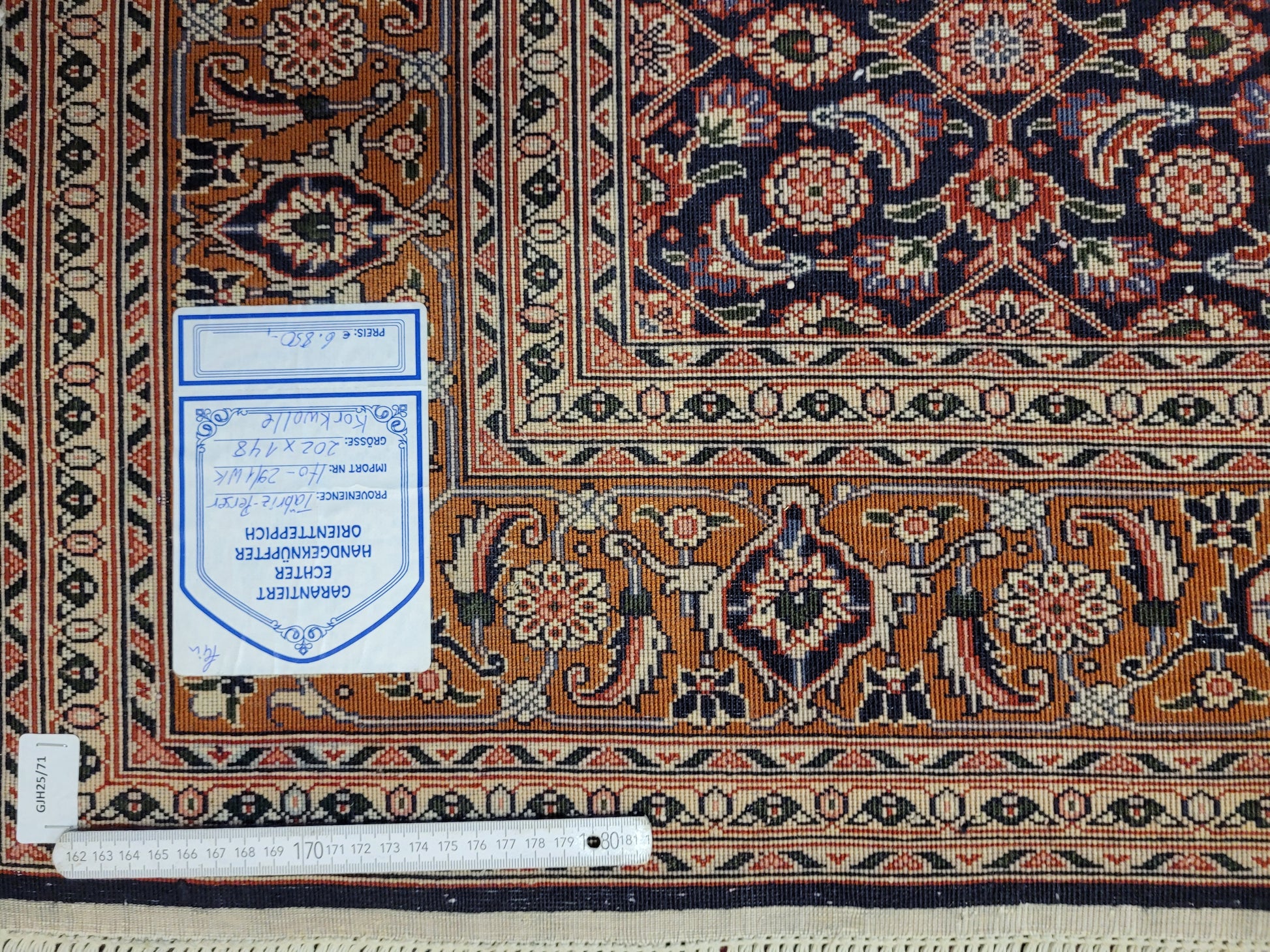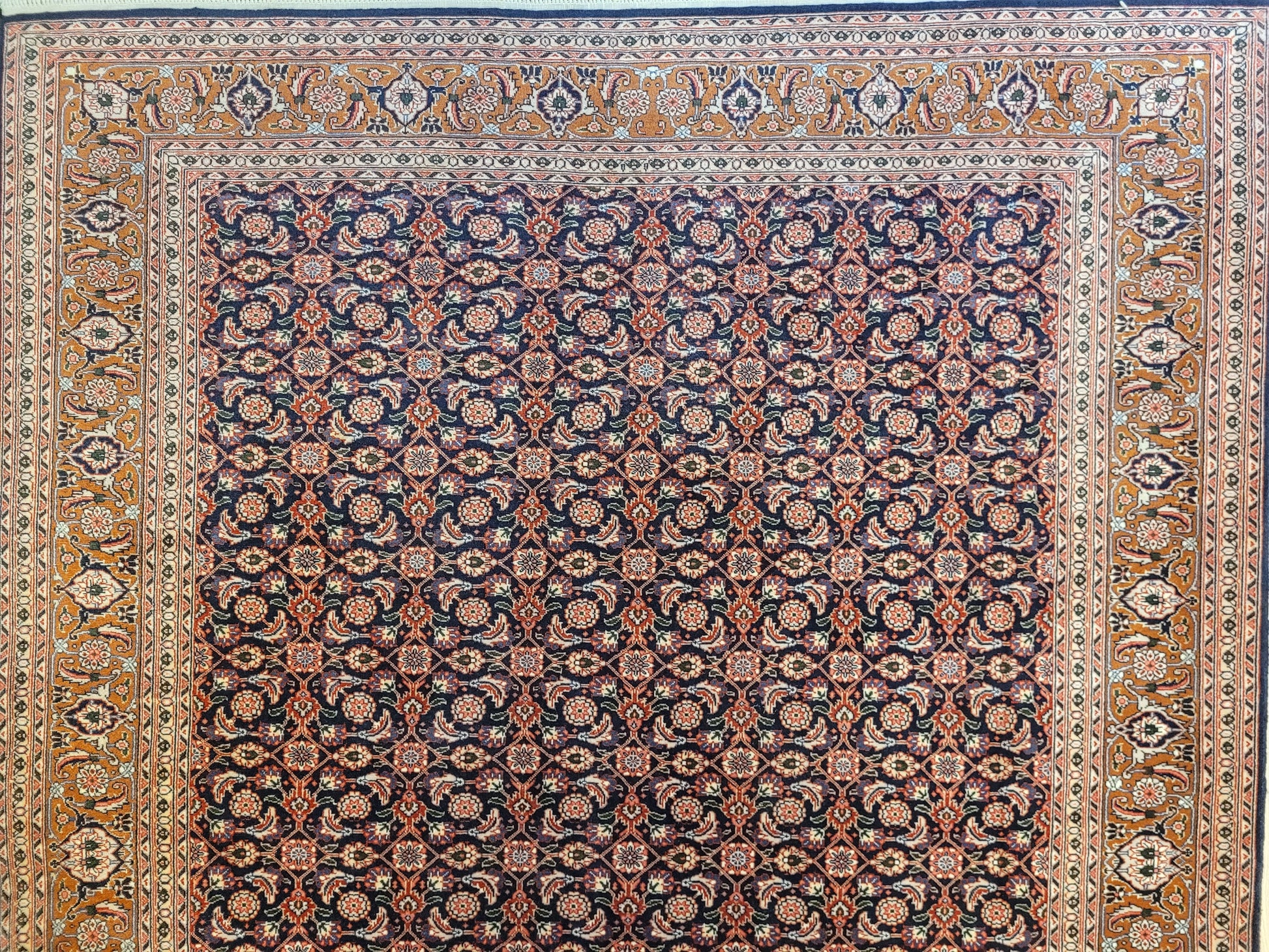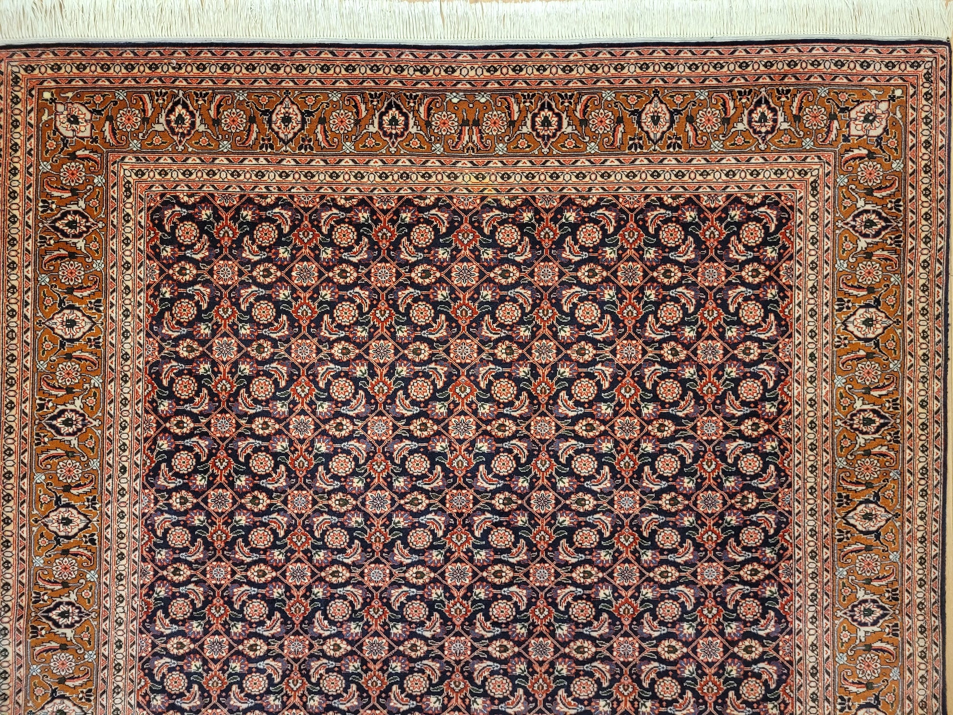 angeboten wird ein edler Täbriz Teppich aus feiner Korkwolle, handgeknüpft in detailreicher Ausführung. Das Feld zeigt ein gleichmäßiges florales Allover-Muster mit feinen Ranken, Blüten und Palmetten, kunstvoll angeordnet auf dunkelblauem Fond. Die breite Bordüre in warmem Goldbraun setzt mit ihren dekorativen Ornamenten einen harmonischen Rahmen und unterstreicht die klassische Eleganz dieses Meisterstücks.