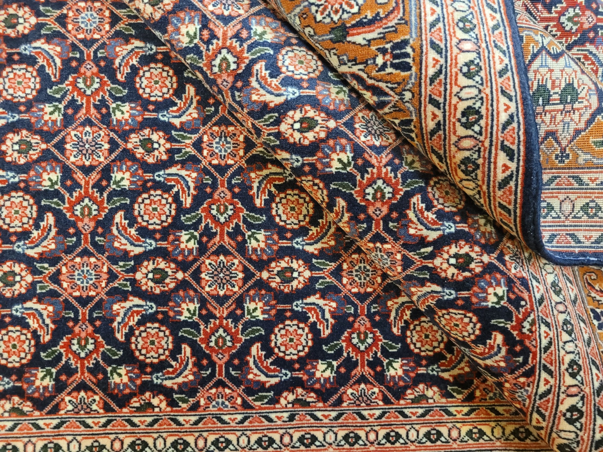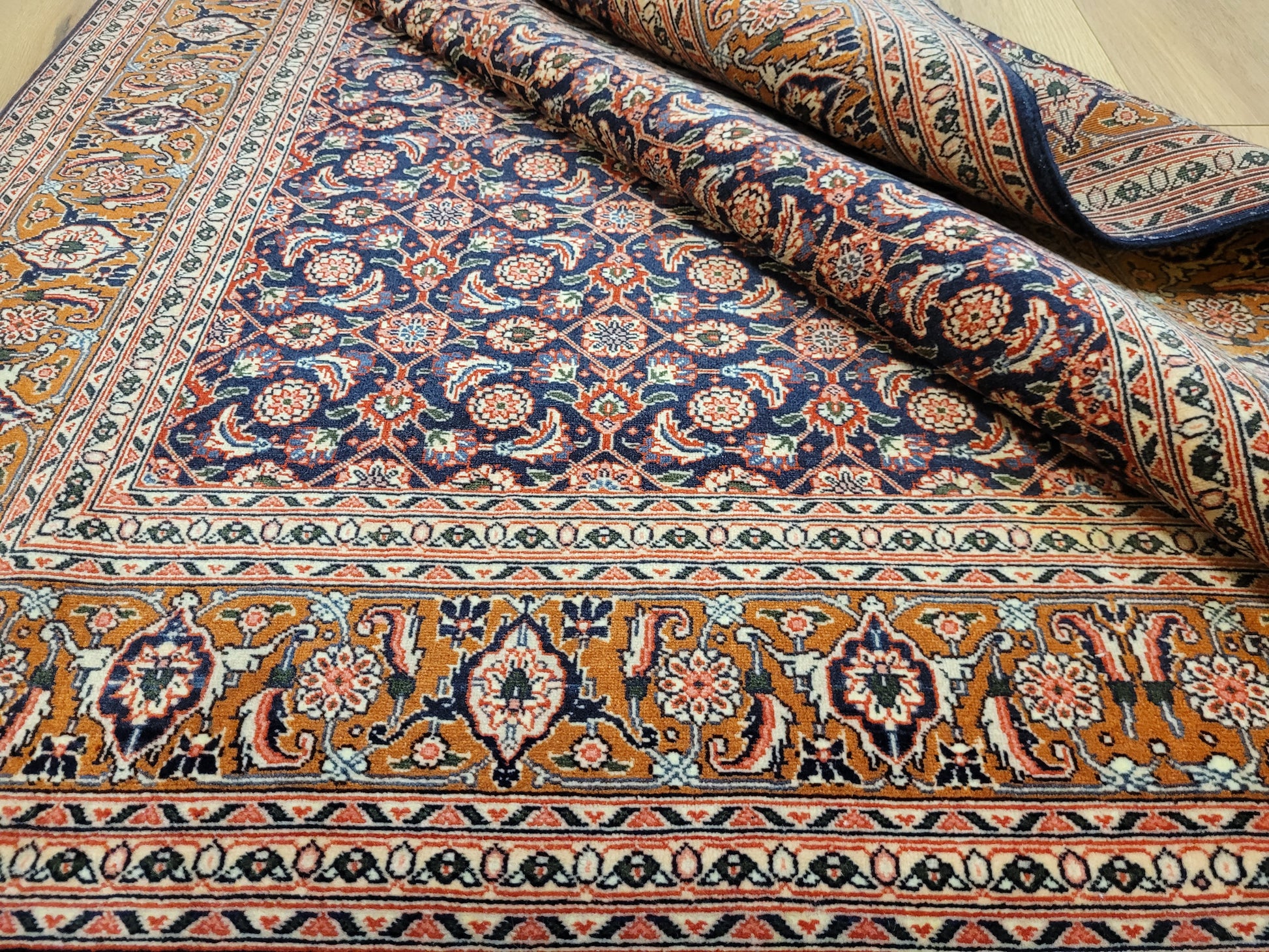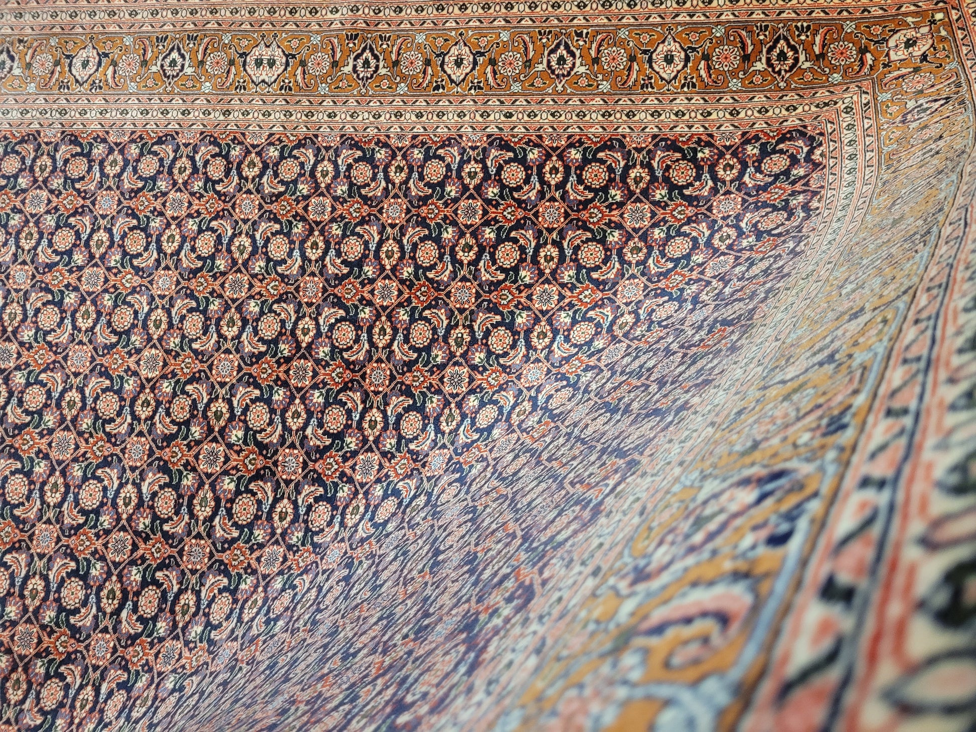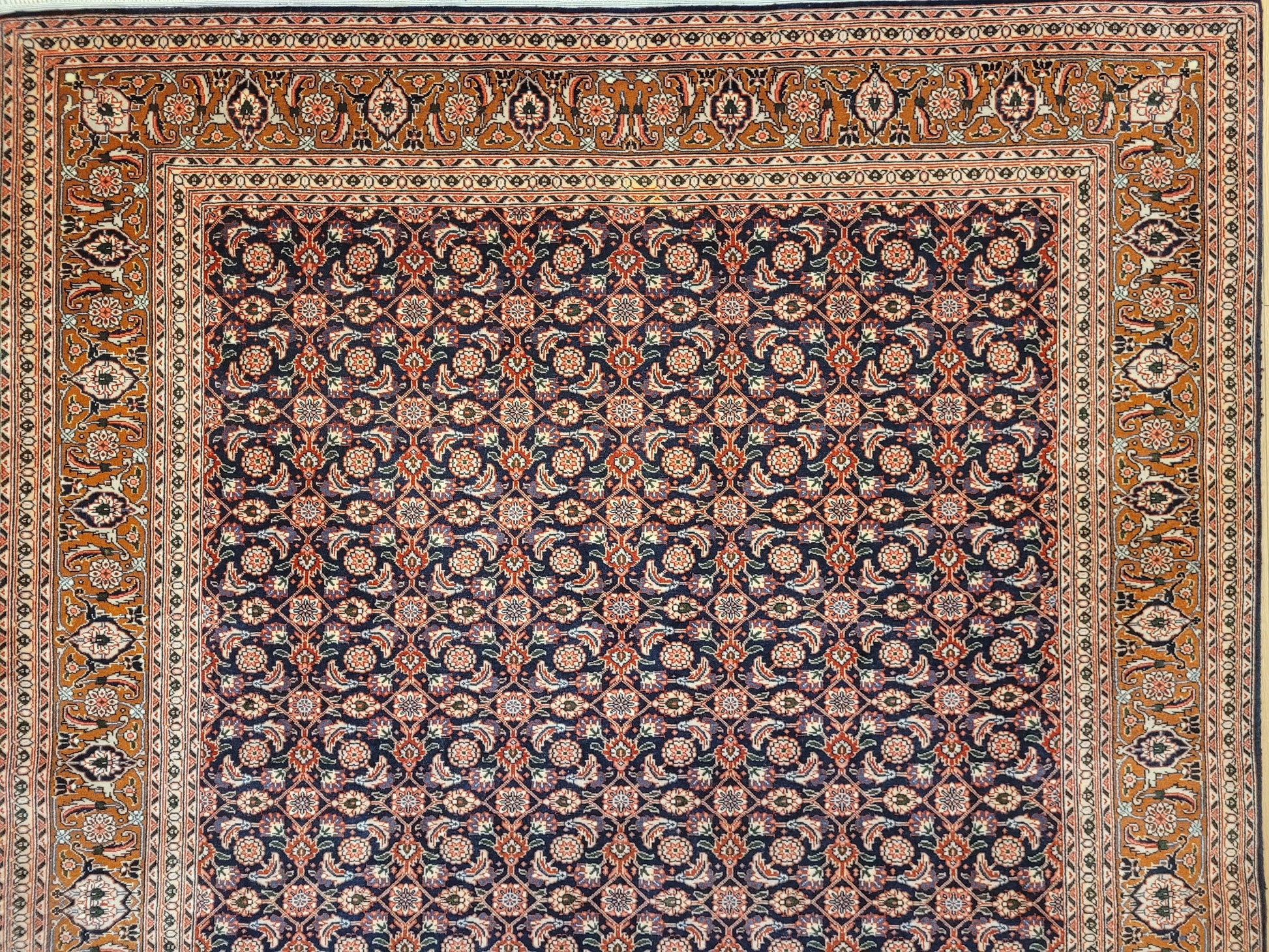 angeboten wird ein edler Täbriz Teppich aus feiner Korkwolle, handgeknüpft in detailreicher Ausführung. Das Feld zeigt ein gleichmäßiges florales Allover-Muster mit feinen Ranken, Blüten und Palmetten, kunstvoll angeordnet auf dunkelblauem Fond. Die breite Bordüre in warmem Goldbraun setzt mit ihren dekorativen Ornamenten einen harmonischen Rahmen und unterstreicht die klassische Eleganz dieses Meisterstücks.