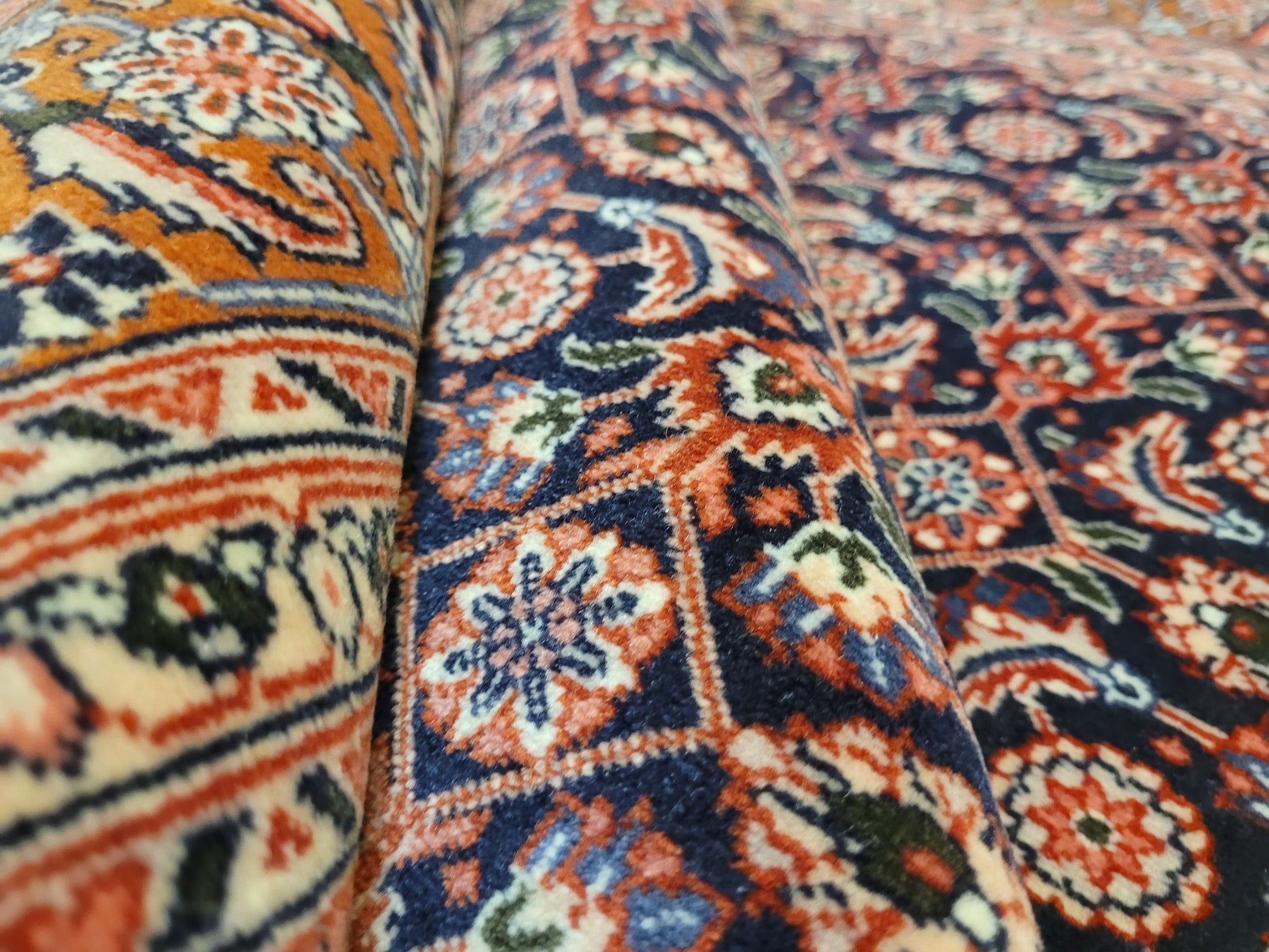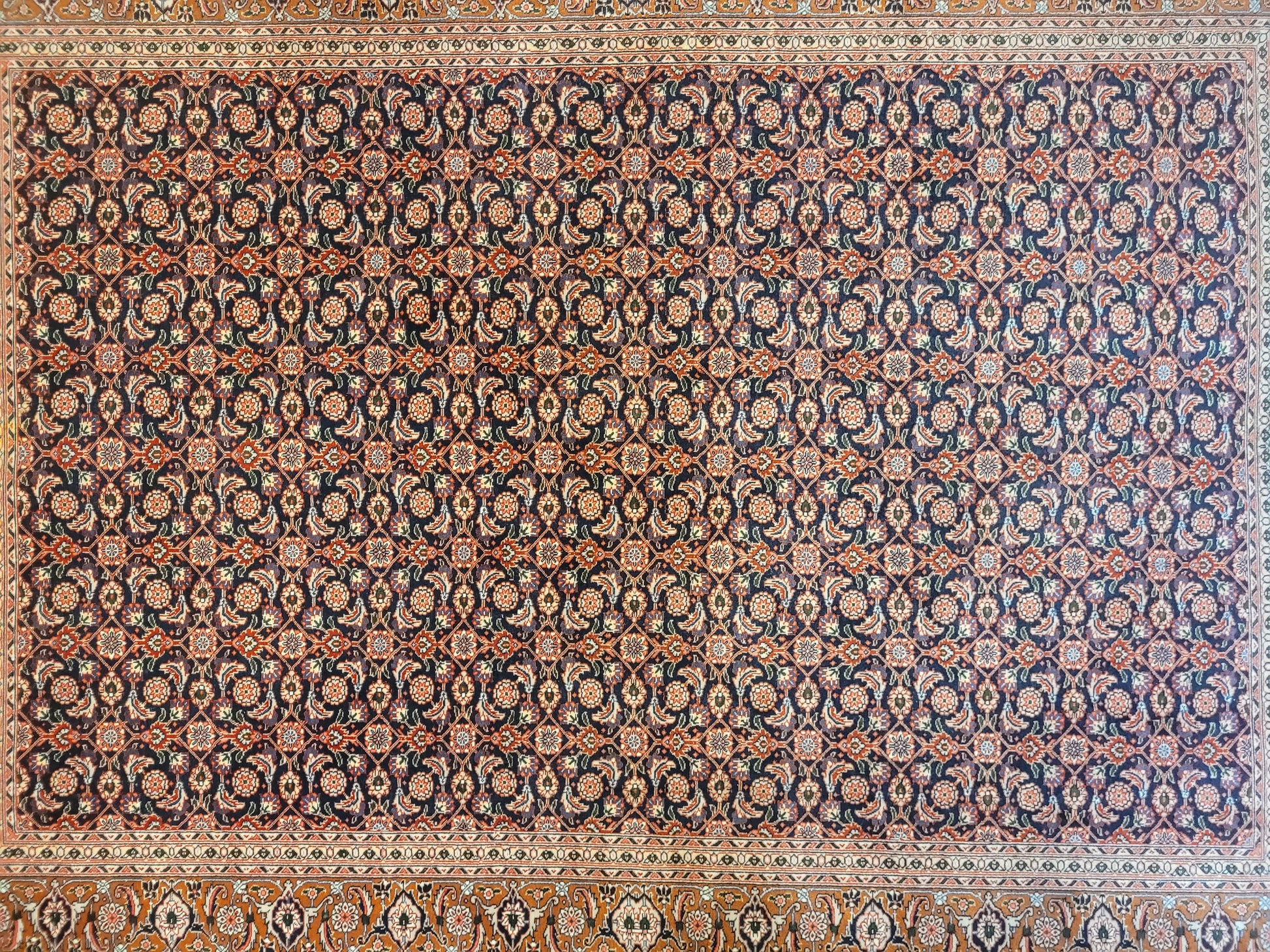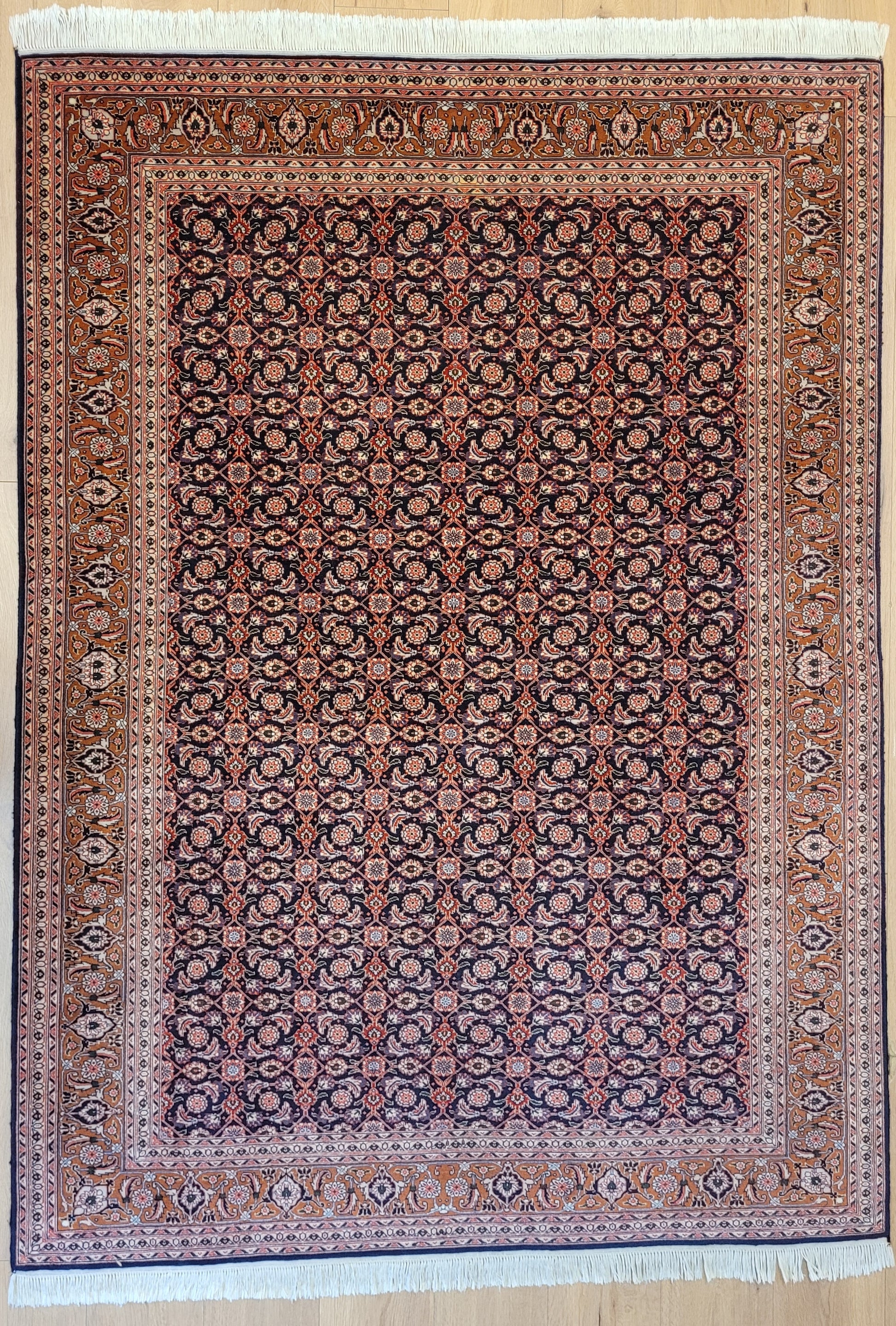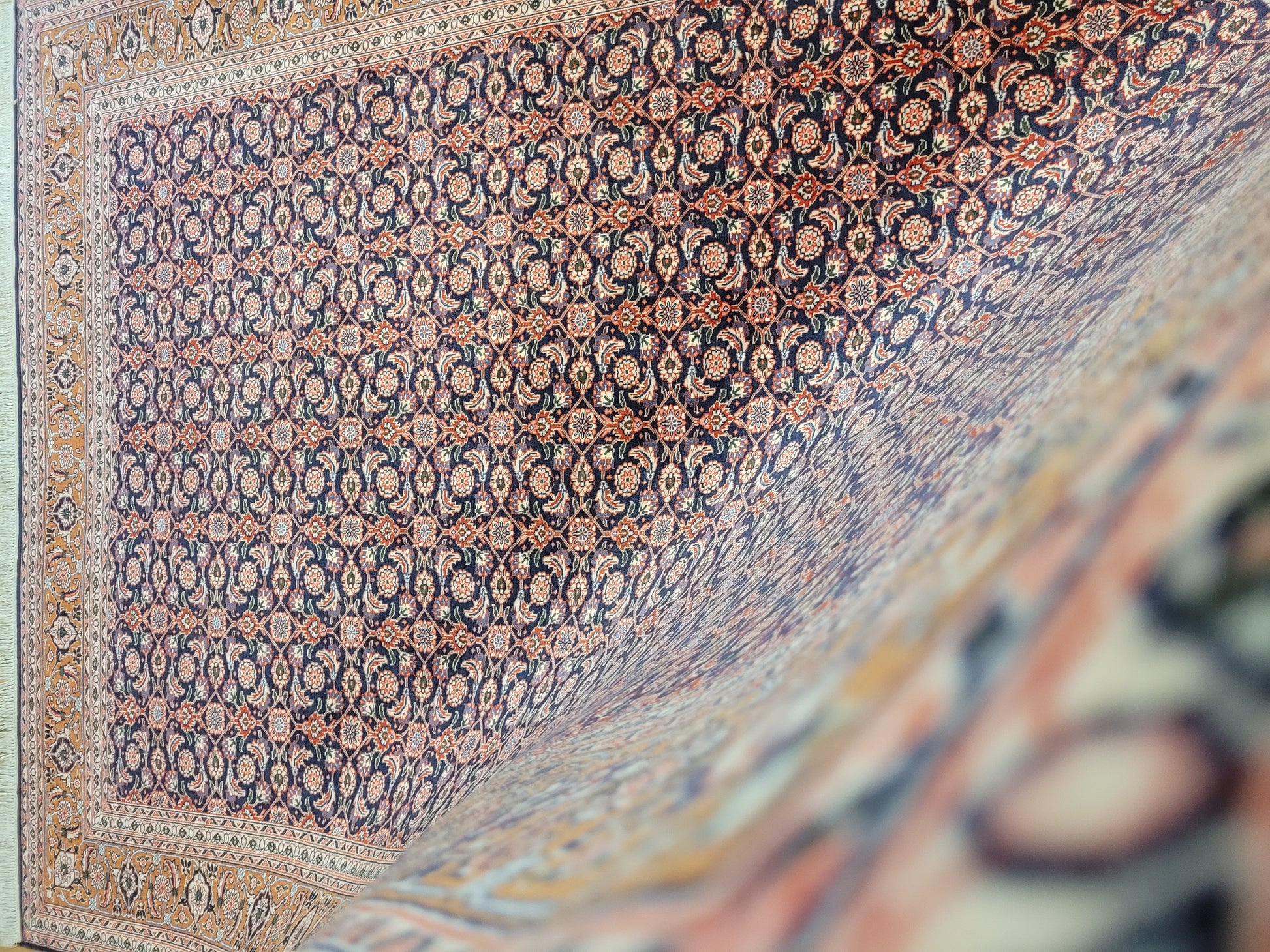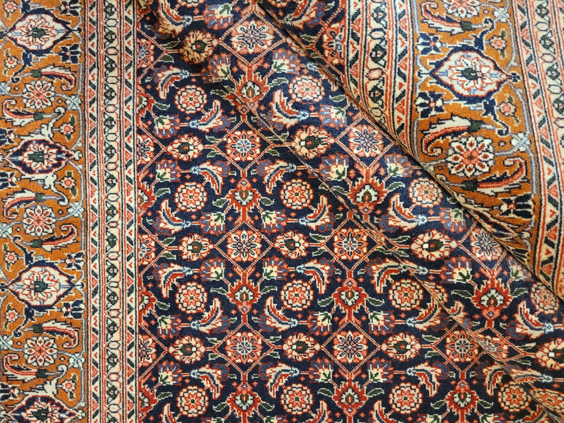 angeboten wird ein edler Täbriz Teppich aus feiner Korkwolle, handgeknüpft in detailreicher Ausführung. Das Feld zeigt ein gleichmäßiges florales Allover-Muster mit feinen Ranken, Blüten und Palmetten, kunstvoll angeordnet auf dunkelblauem Fond. Die breite Bordüre in warmem Goldbraun setzt mit ihren dekorativen Ornamenten einen harmonischen Rahmen und unterstreicht die klassische Eleganz dieses Meisterstücks.