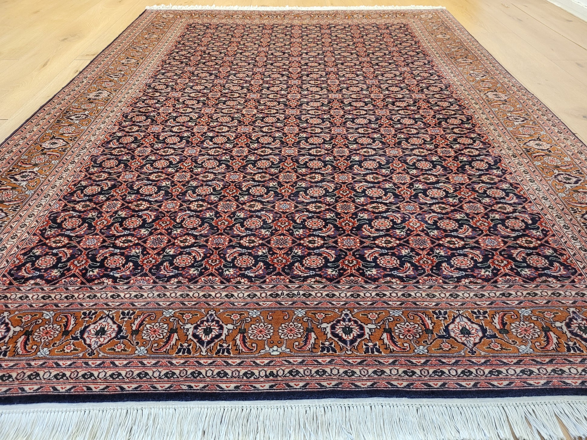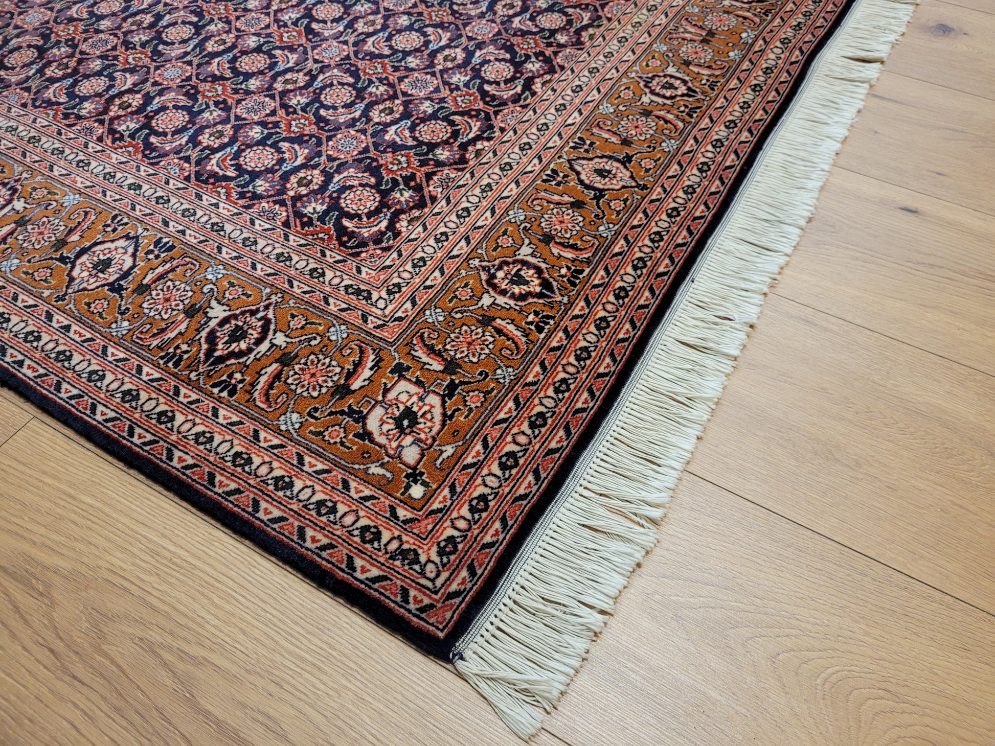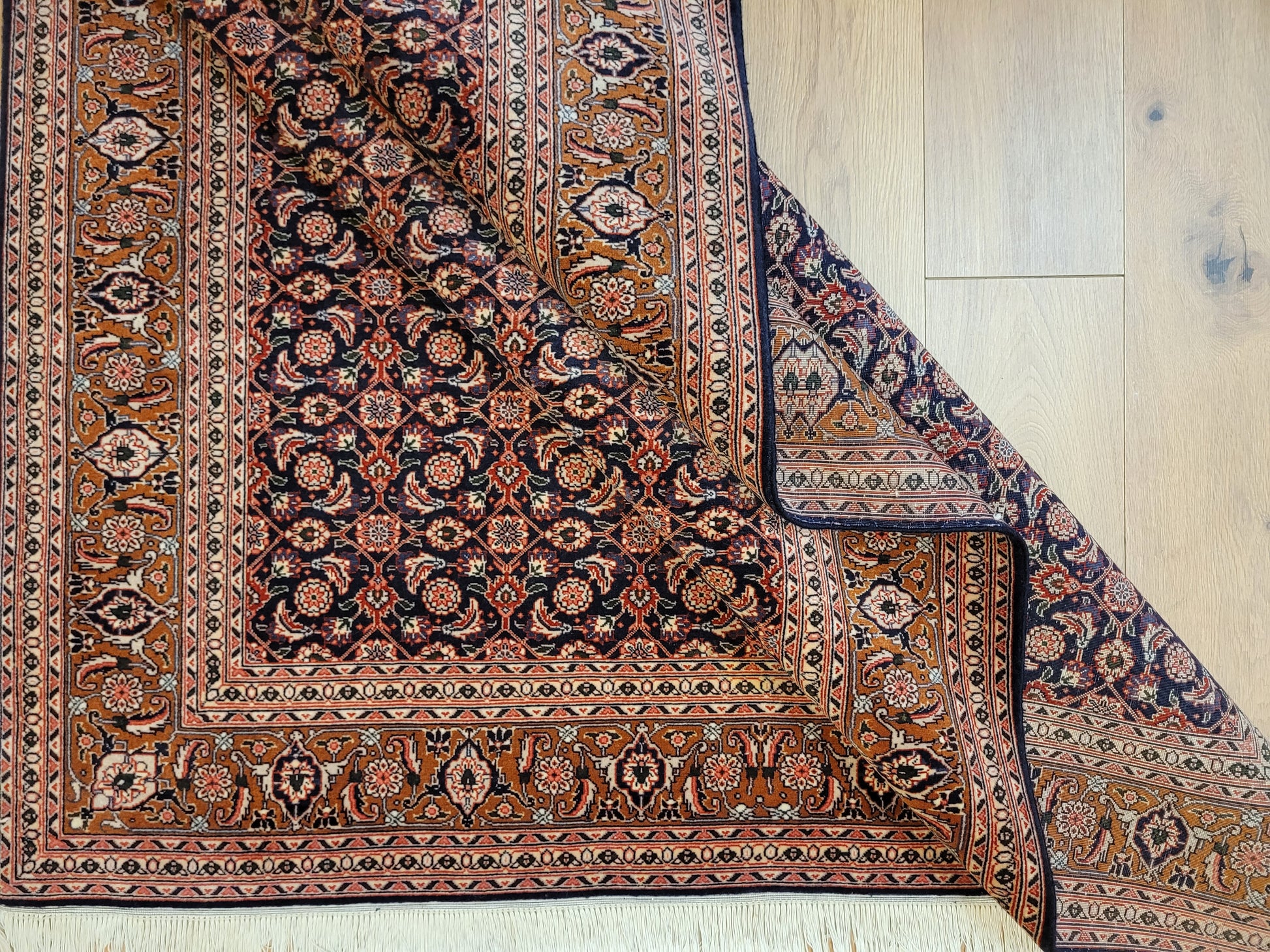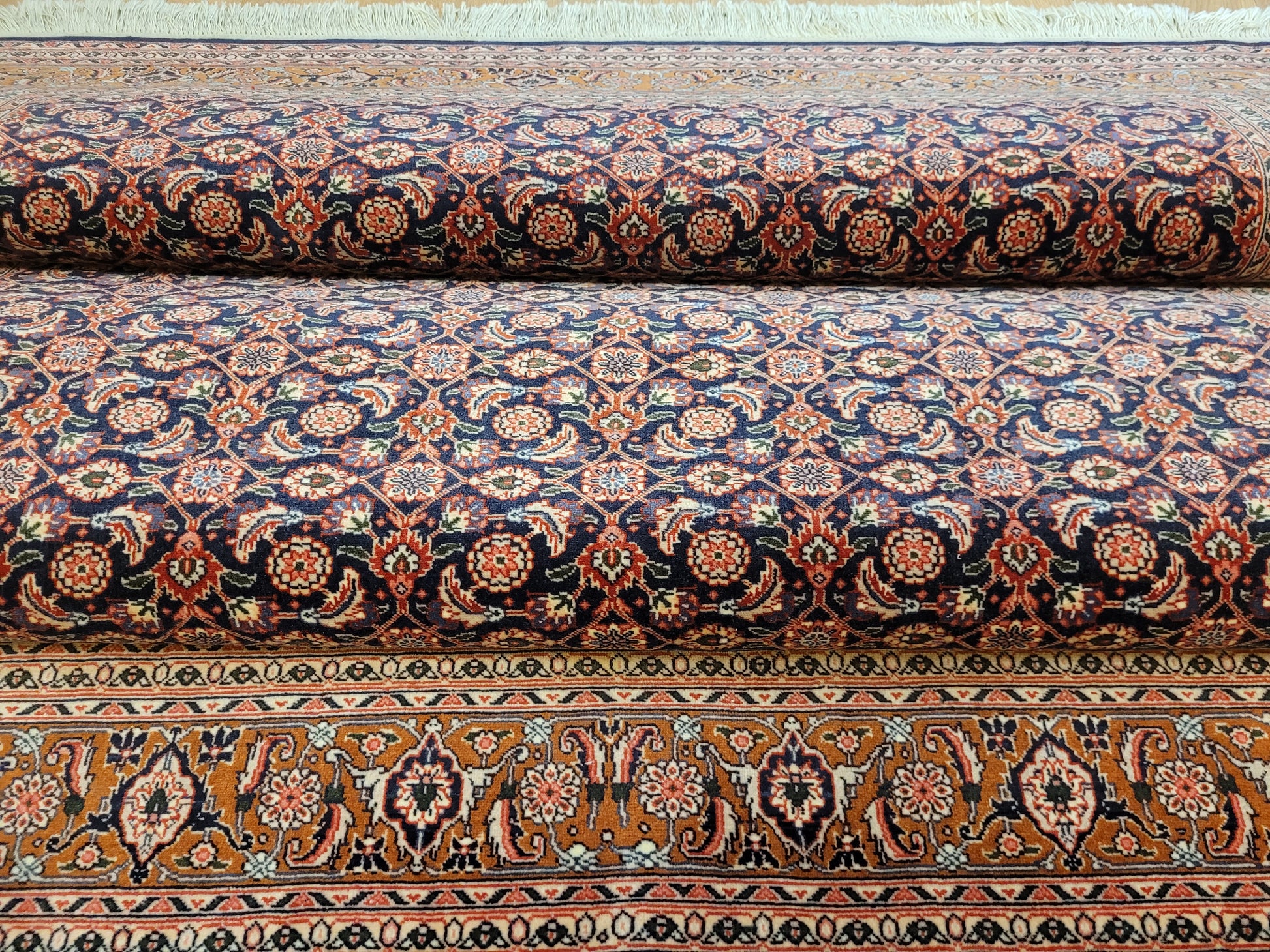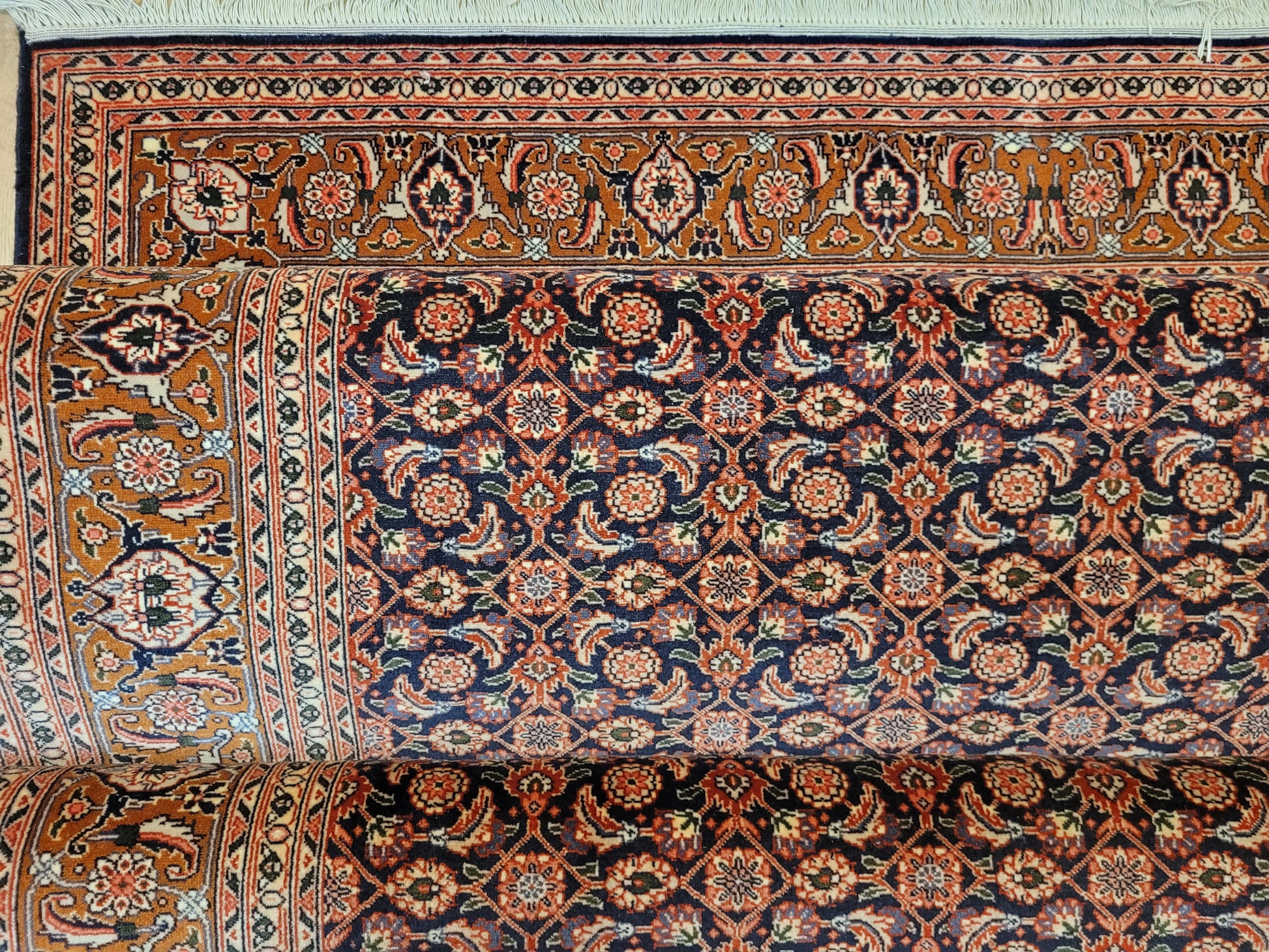 angeboten wird ein edler Täbriz Teppich aus feiner Korkwolle, handgeknüpft in detailreicher Ausführung. Das Feld zeigt ein gleichmäßiges florales Allover-Muster mit feinen Ranken, Blüten und Palmetten, kunstvoll angeordnet auf dunkelblauem Fond. Die breite Bordüre in warmem Goldbraun setzt mit ihren dekorativen Ornamenten einen harmonischen Rahmen und unterstreicht die klassische Eleganz dieses Meisterstücks.