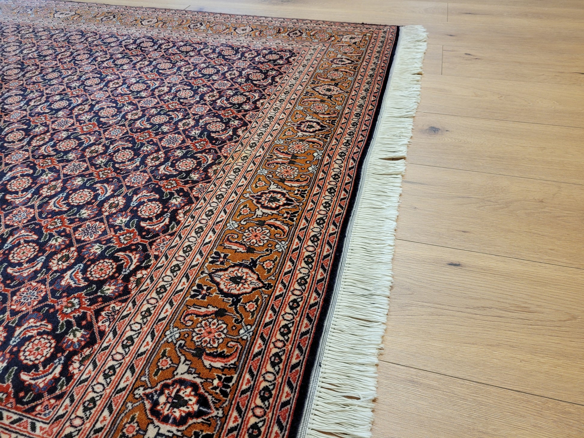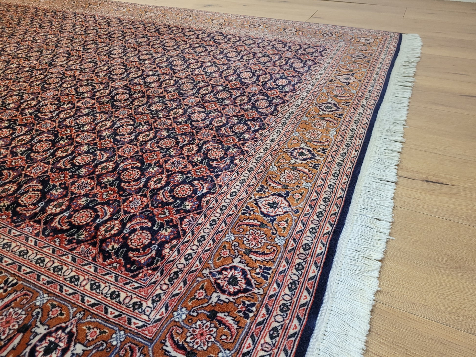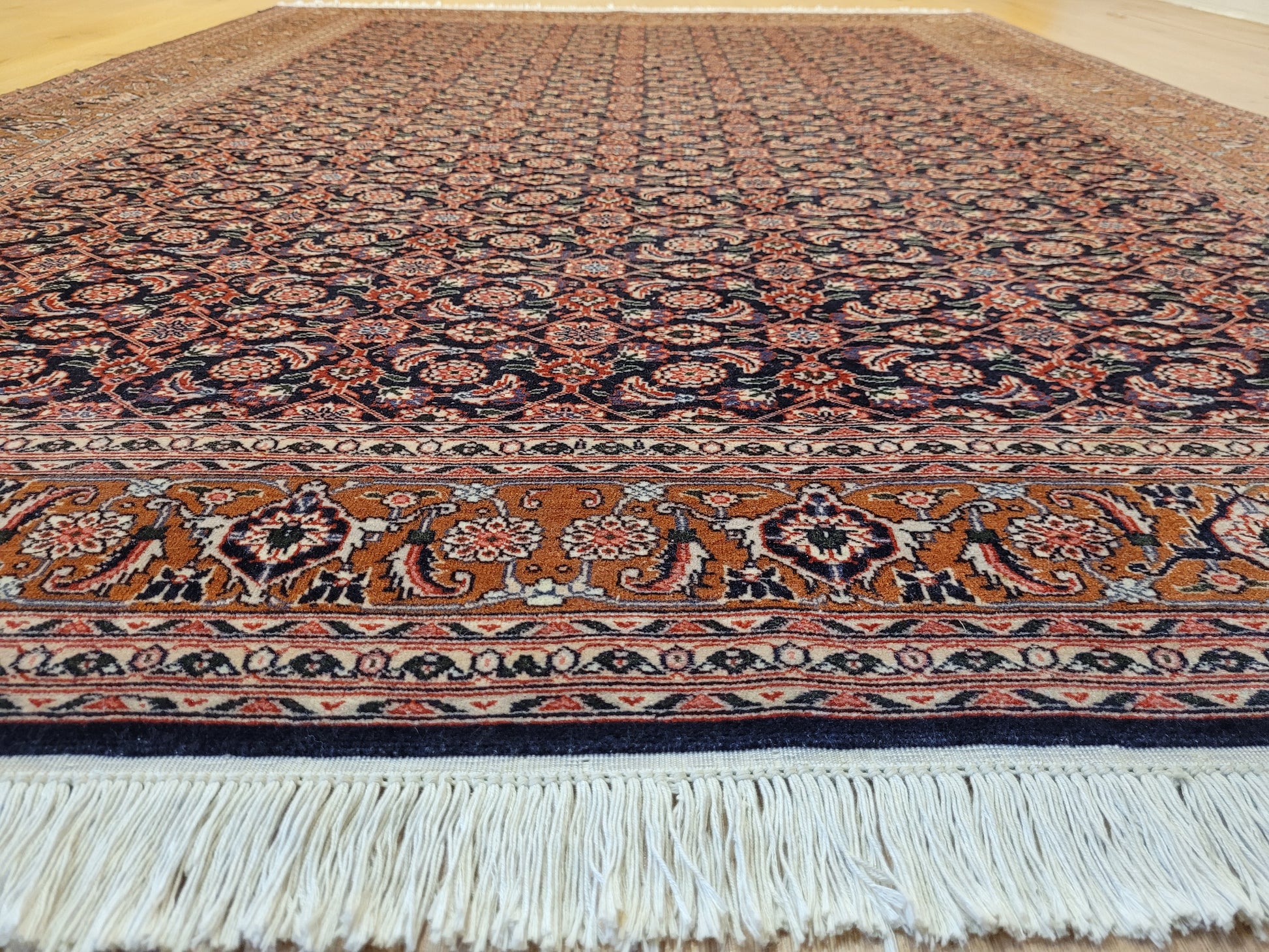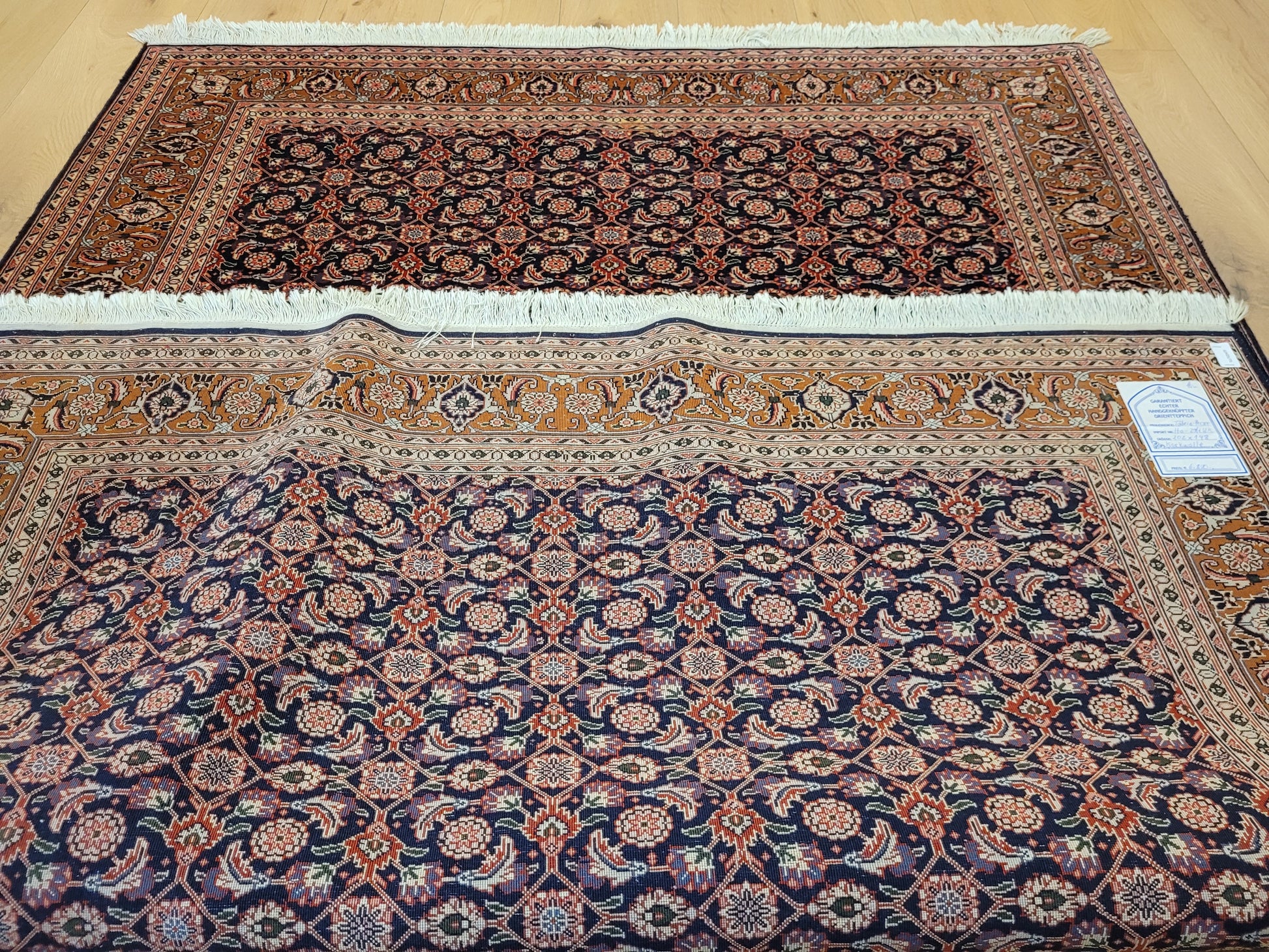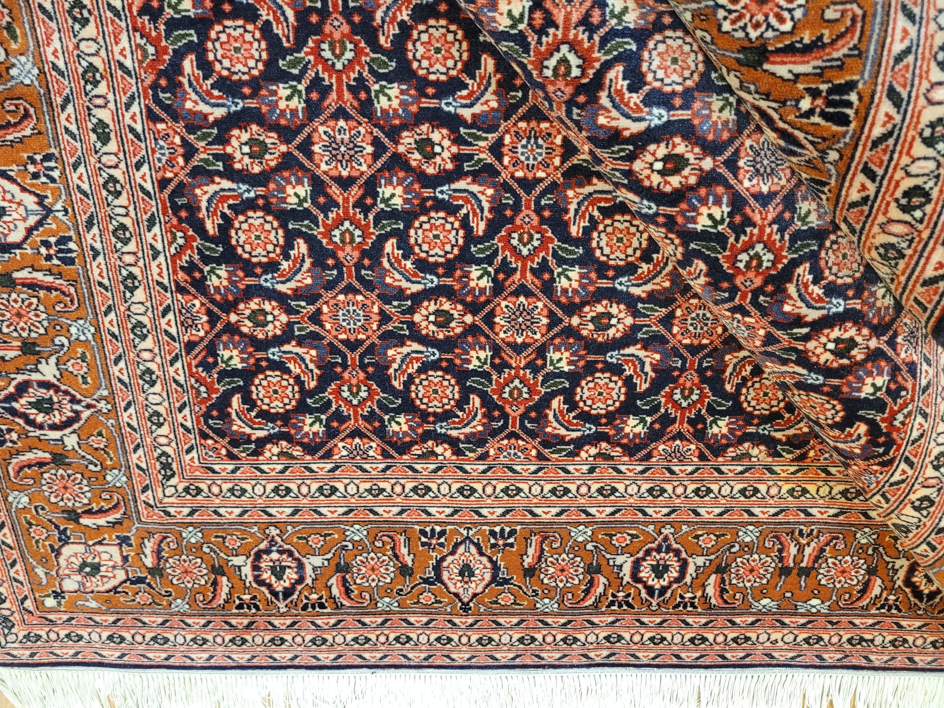 angeboten wird ein edler Täbriz Teppich aus feiner Korkwolle, handgeknüpft in detailreicher Ausführung. Das Feld zeigt ein gleichmäßiges florales Allover-Muster mit feinen Ranken, Blüten und Palmetten, kunstvoll angeordnet auf dunkelblauem Fond. Die breite Bordüre in warmem Goldbraun setzt mit ihren dekorativen Ornamenten einen harmonischen Rahmen und unterstreicht die klassische Eleganz dieses Meisterstücks.