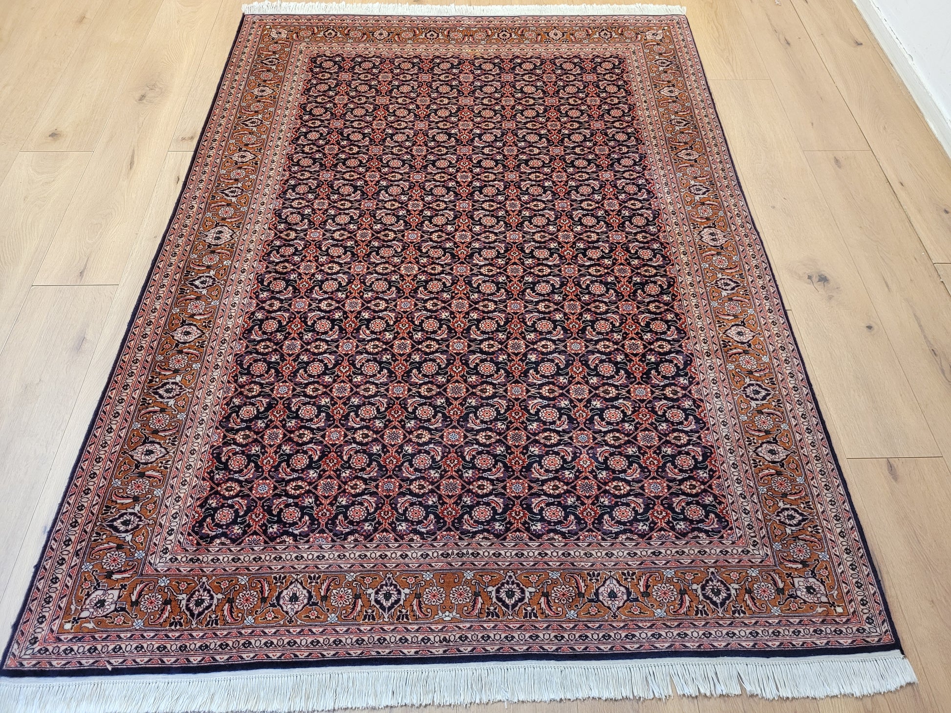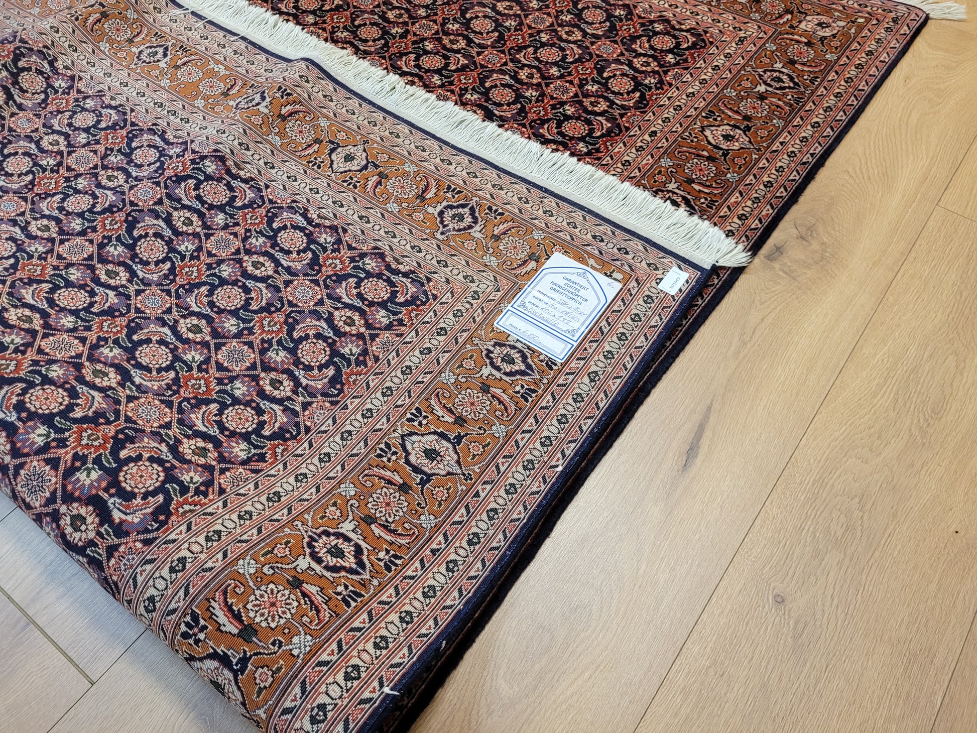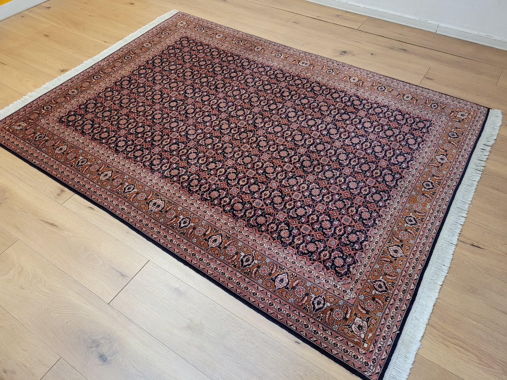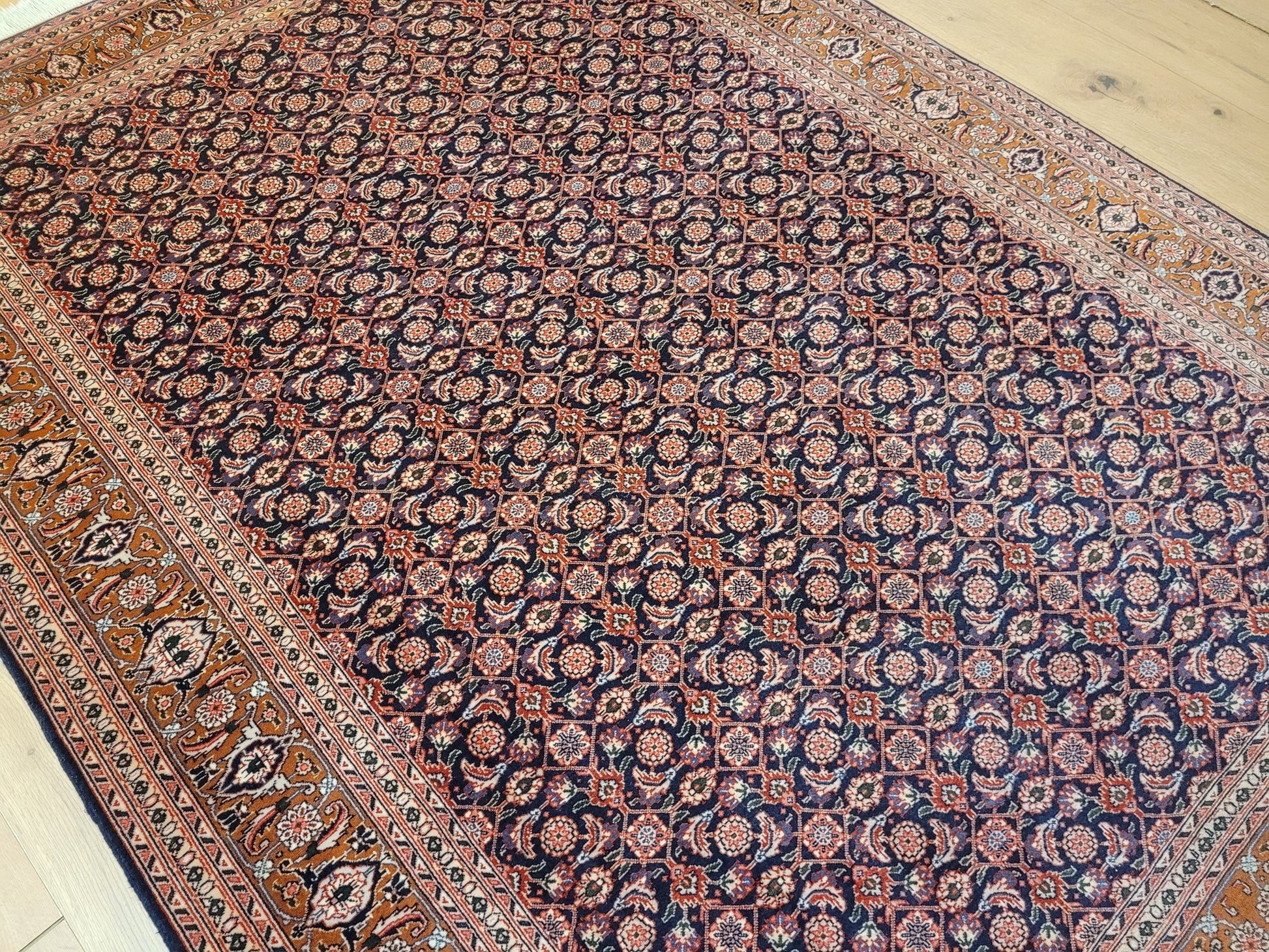 angeboten wird ein edler Täbriz Teppich aus feiner Korkwolle, handgeknüpft in detailreicher Ausführung. Das Feld zeigt ein gleichmäßiges florales Allover-Muster mit feinen Ranken, Blüten und Palmetten, kunstvoll angeordnet auf dunkelblauem Fond. Die breite Bordüre in warmem Goldbraun setzt mit ihren dekorativen Ornamenten einen harmonischen Rahmen und unterstreicht die klassische Eleganz dieses Meisterstücks.