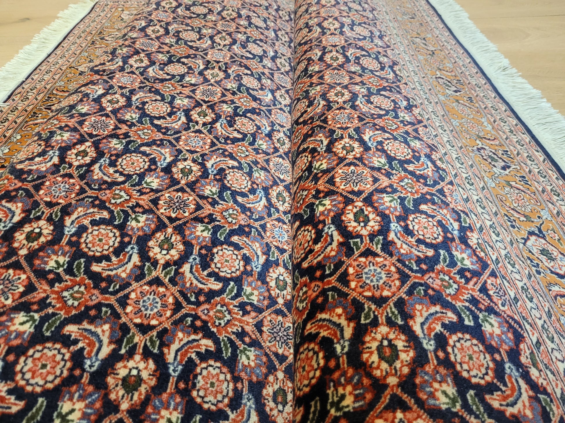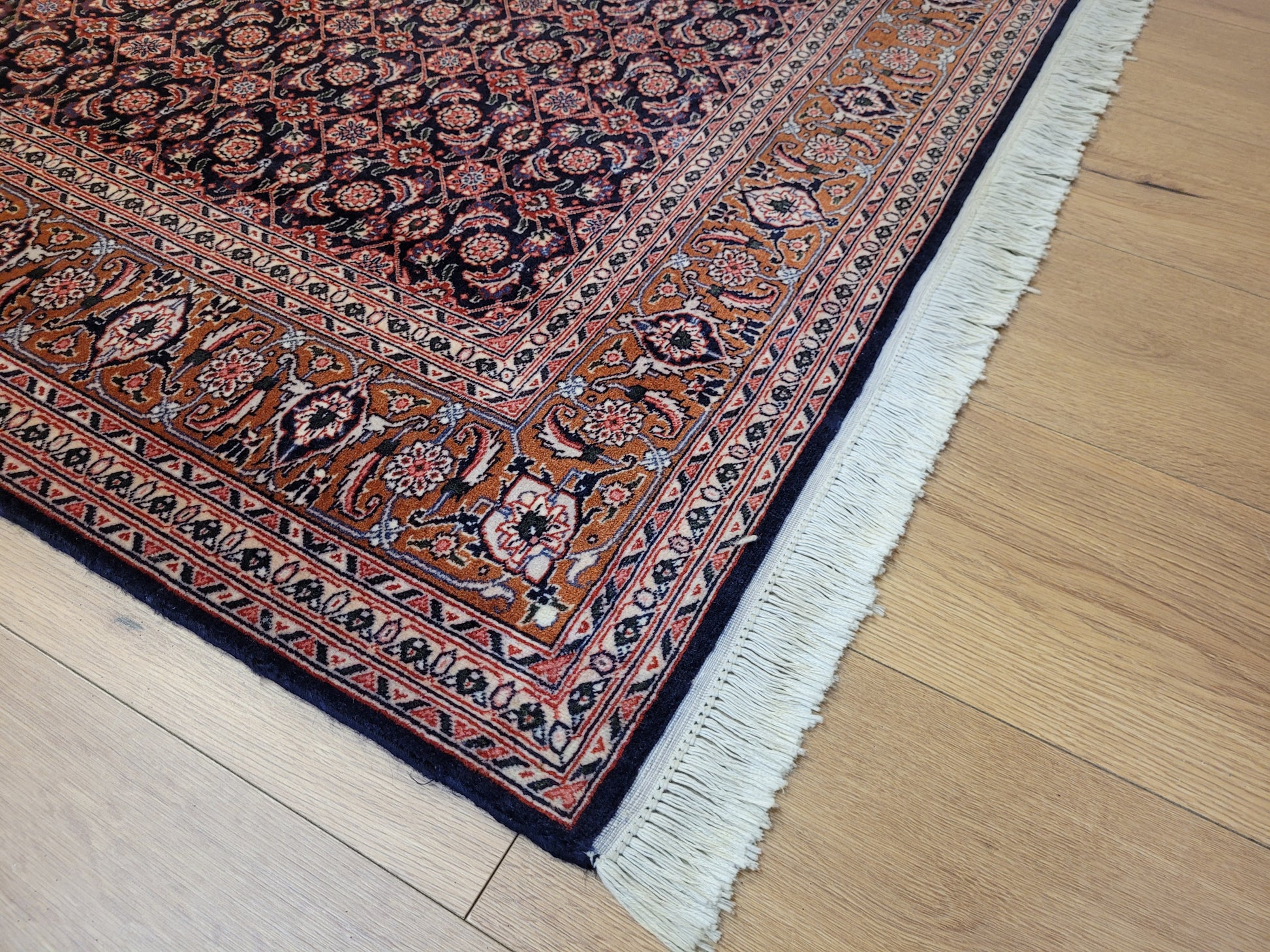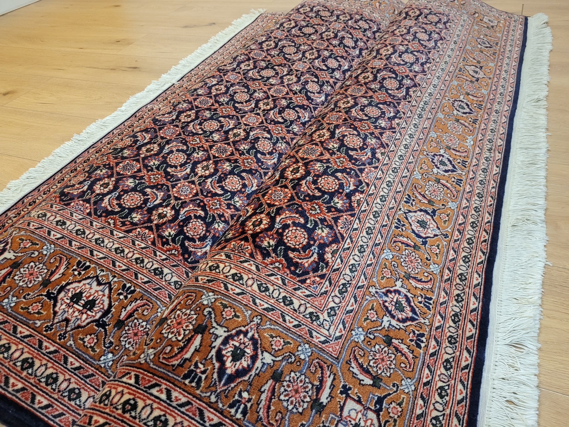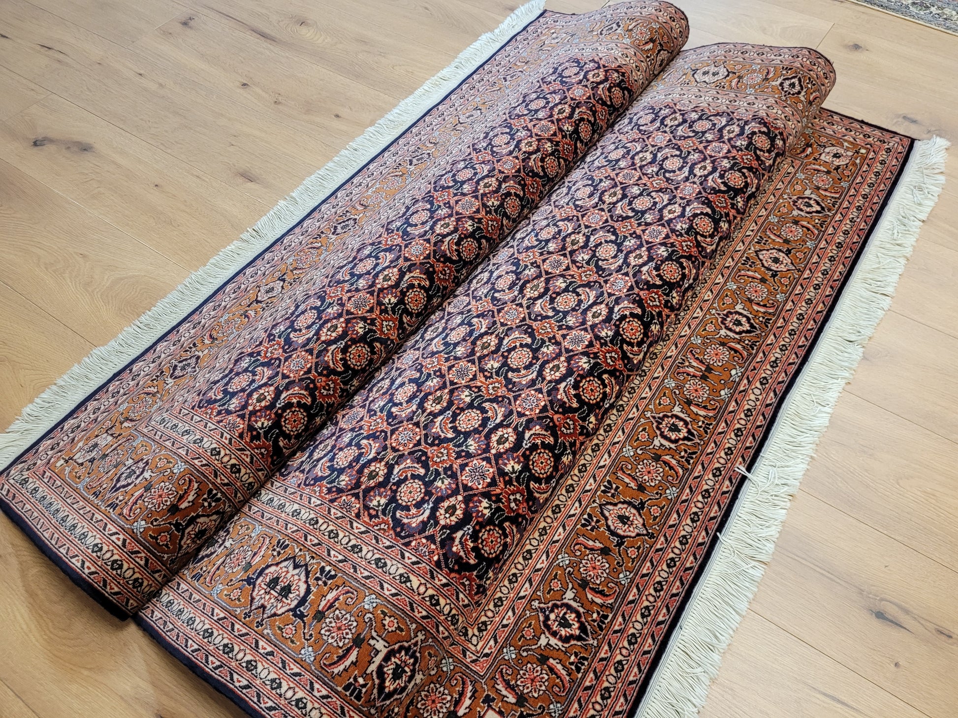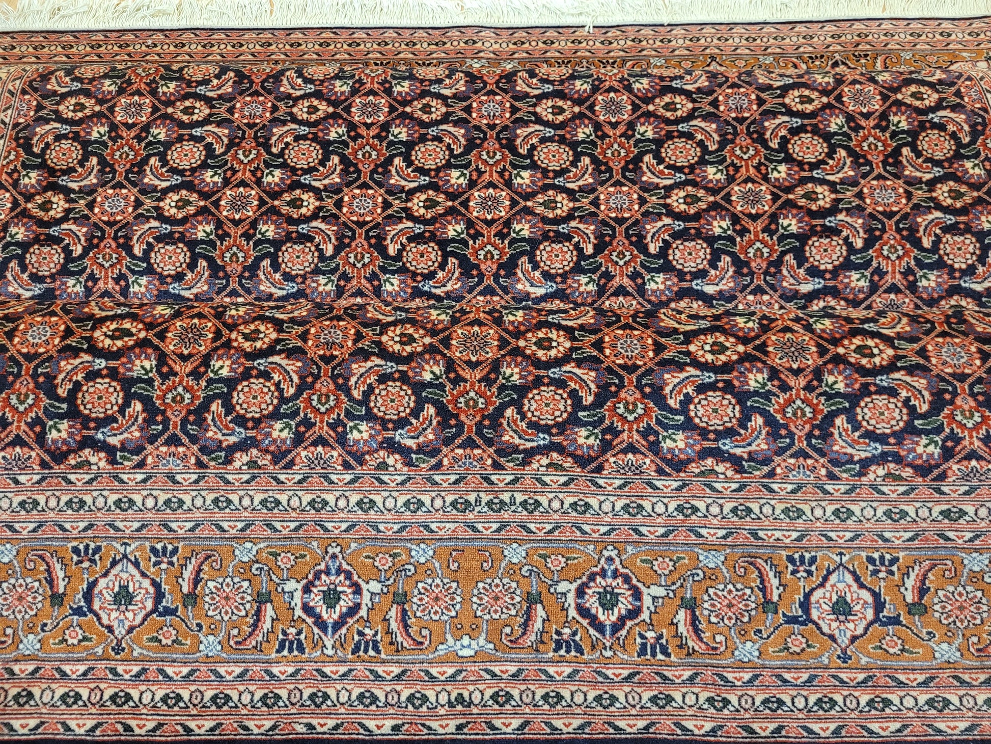 angeboten wird ein edler Täbriz Teppich aus feiner Korkwolle, handgeknüpft in detailreicher Ausführung. Das Feld zeigt ein gleichmäßiges florales Allover-Muster mit feinen Ranken, Blüten und Palmetten, kunstvoll angeordnet auf dunkelblauem Fond. Die breite Bordüre in warmem Goldbraun setzt mit ihren dekorativen Ornamenten einen harmonischen Rahmen und unterstreicht die klassische Eleganz dieses Meisterstücks.
