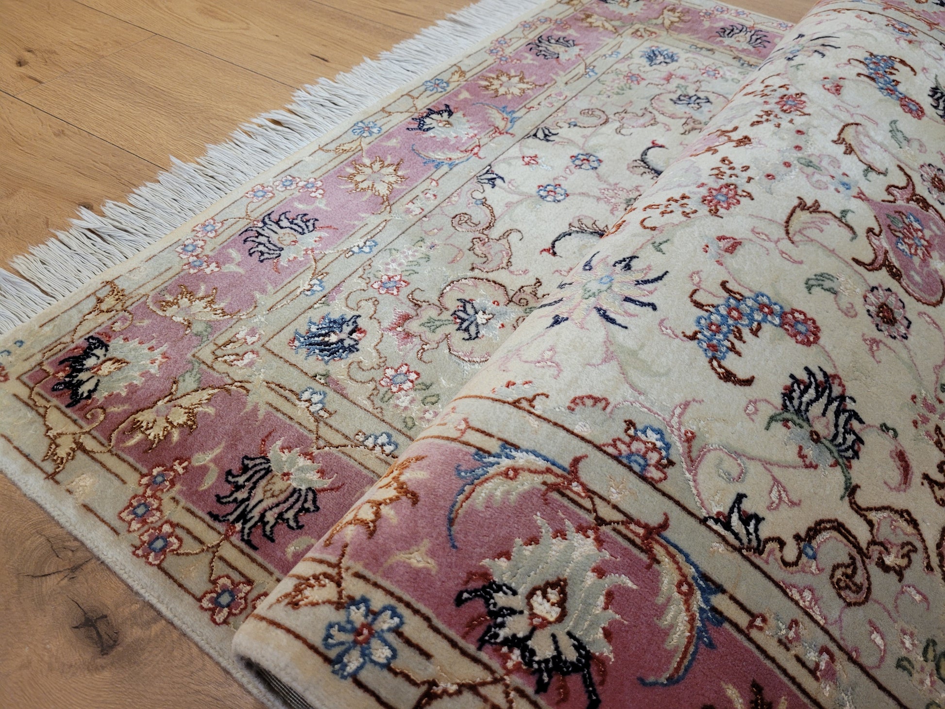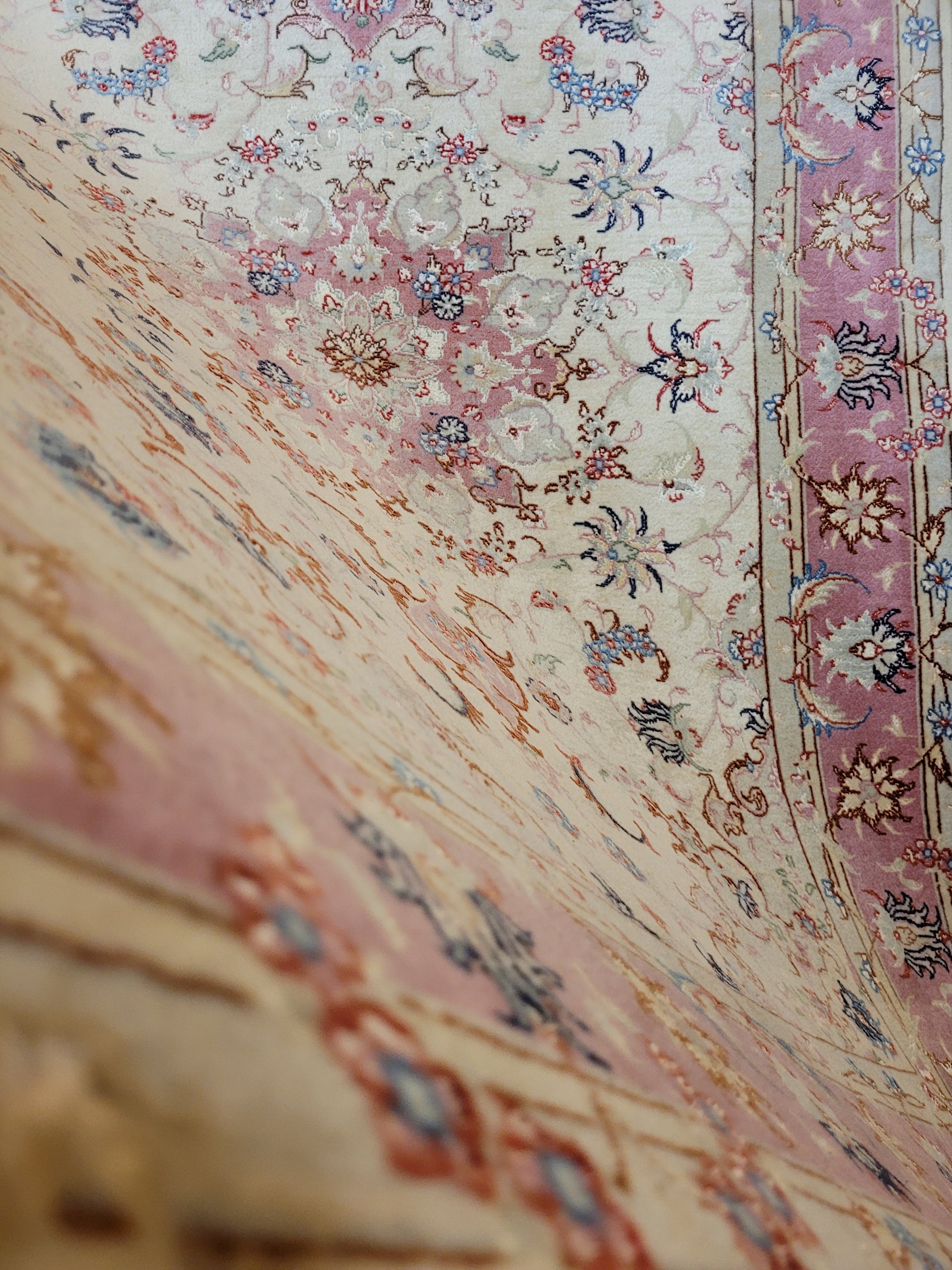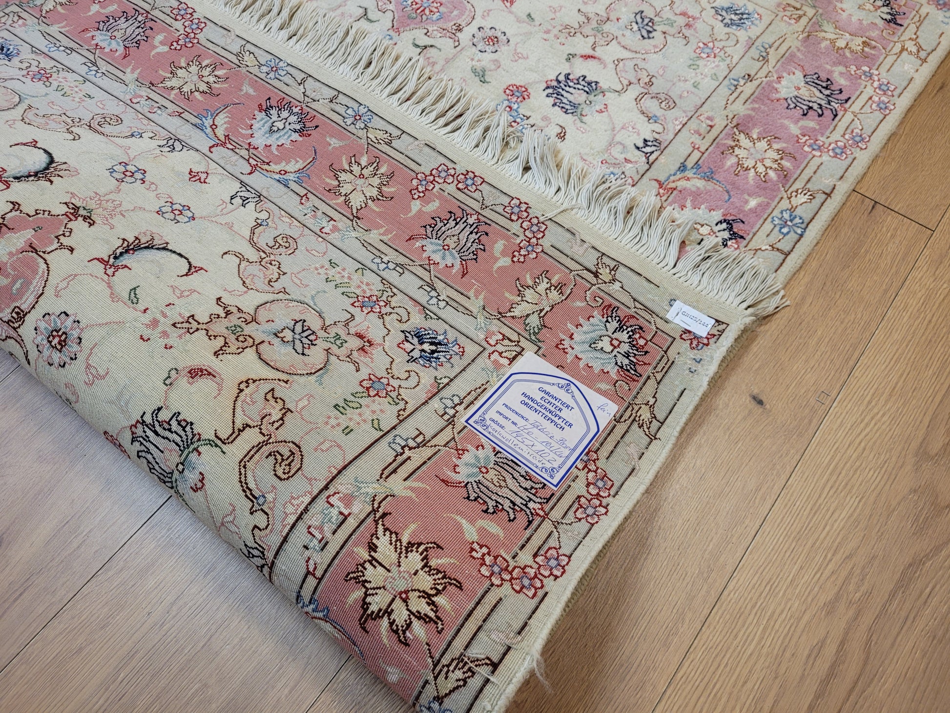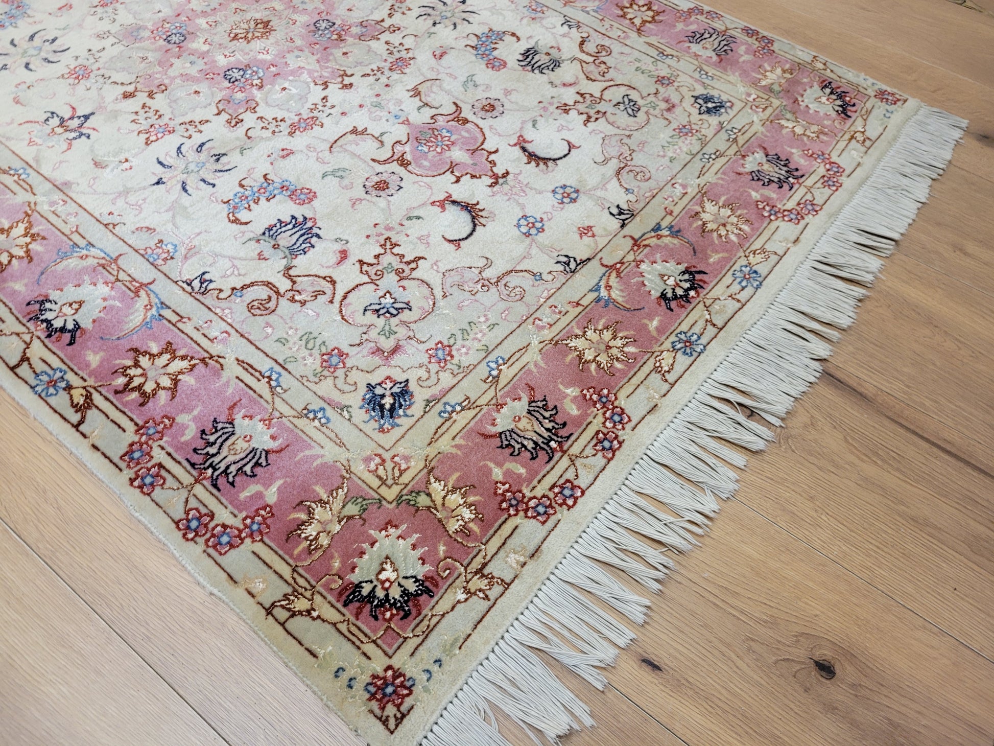 angeboten wird ein edler Täbriz Teppich aus feiner Korkwolle mit Seideneinlagen, handgeknüpft in meisterlicher Qualität. Das Zentrum schmückt ein symmetrisches Medaillon mit floraler Ornamentik, eingebettet in ein helles Fondfeld. Zarte Arabesken, Blütenranken und filigrane Muster verteilen sich harmonisch über die gesamte Fläche. Die Bordüre in Rosétönen ist mit kunstvollen Blütenmotiven verziert und bildet einen eleganten Rahmen.