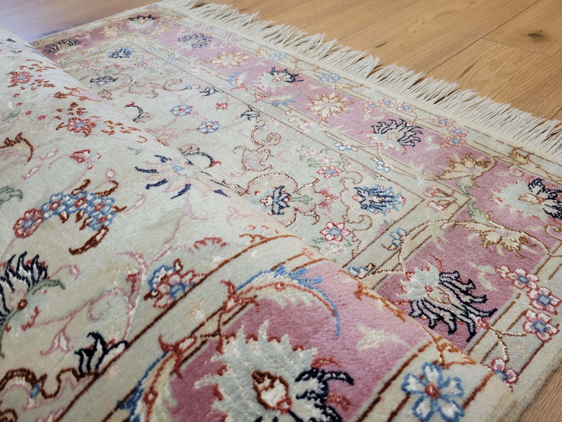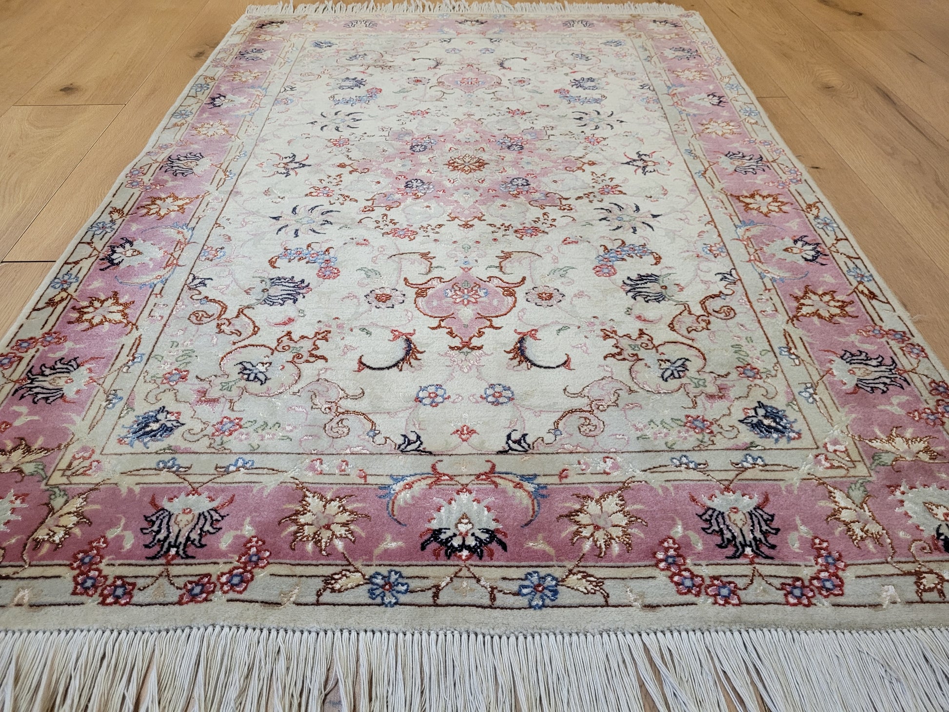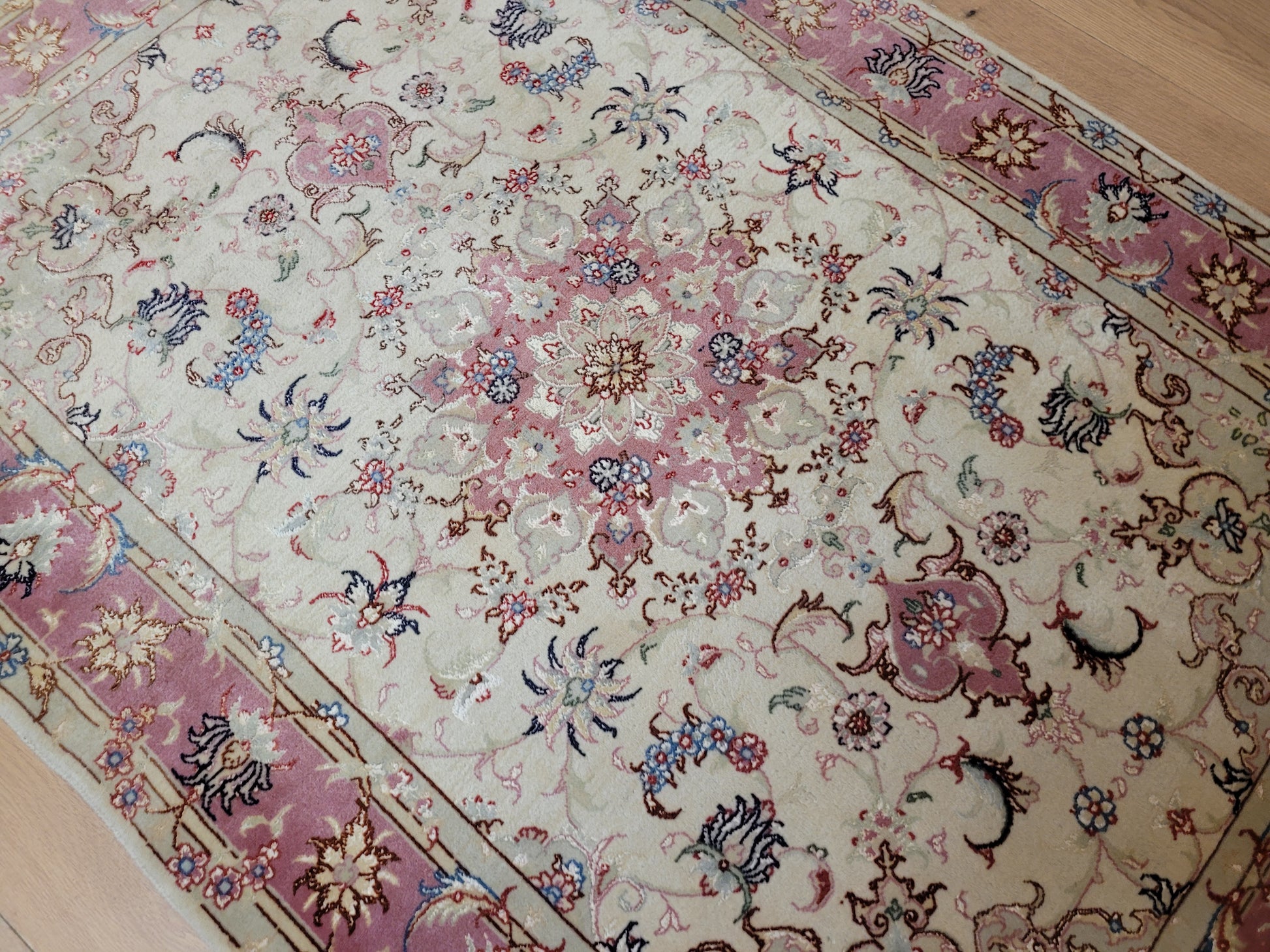 angeboten wird ein edler Täbriz Teppich aus feiner Korkwolle mit Seideneinlagen, handgeknüpft in meisterlicher Qualität. Das Zentrum schmückt ein symmetrisches Medaillon mit floraler Ornamentik, eingebettet in ein helles Fondfeld. Zarte Arabesken, Blütenranken und filigrane Muster verteilen sich harmonisch über die gesamte Fläche. Die Bordüre in Rosétönen ist mit kunstvollen Blütenmotiven verziert und bildet einen eleganten Rahmen.