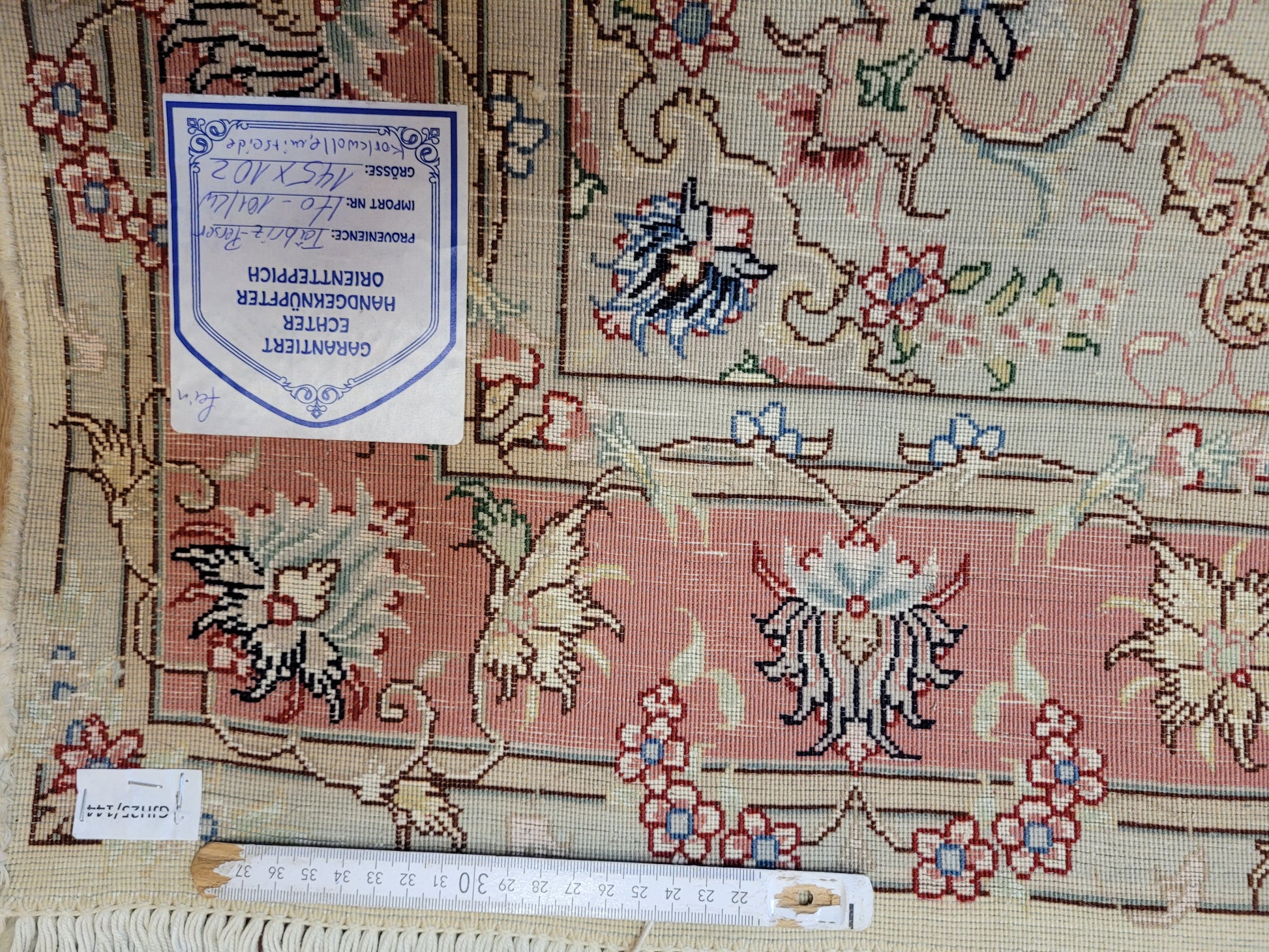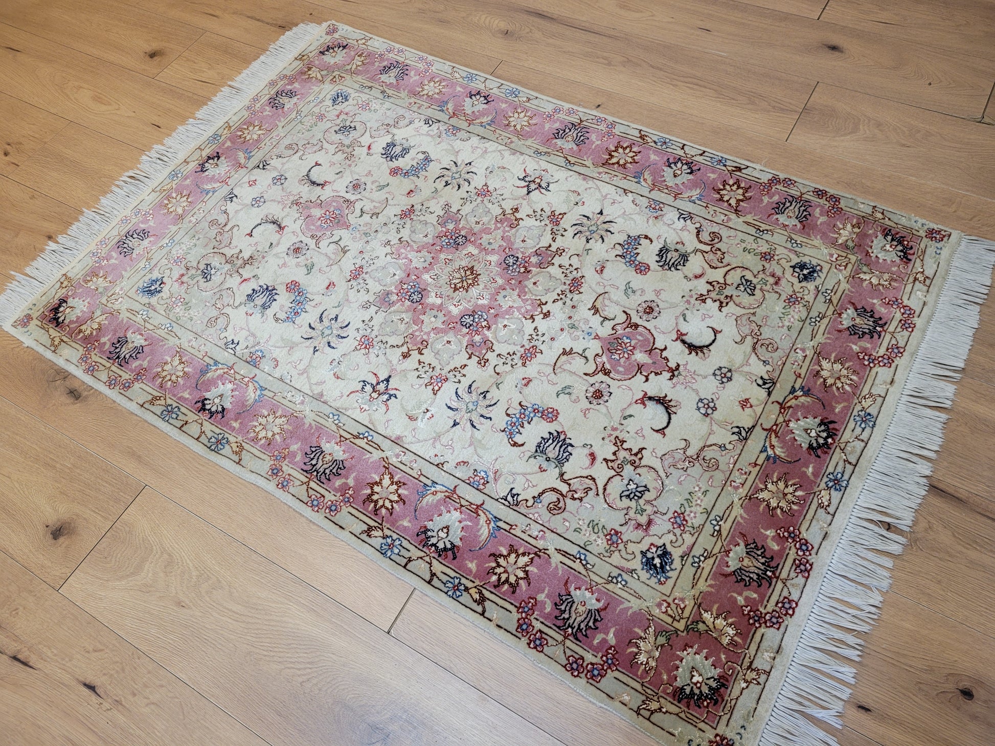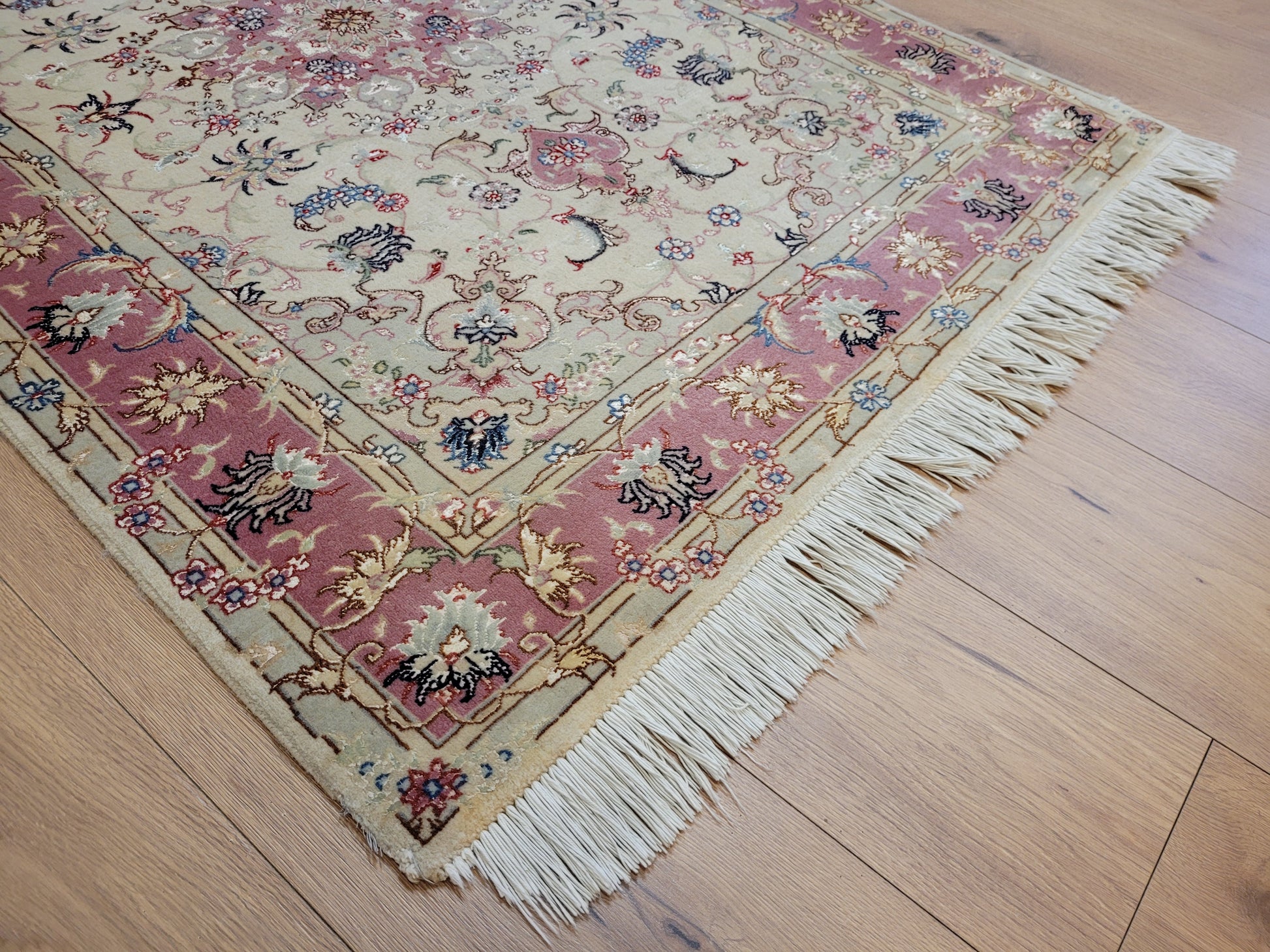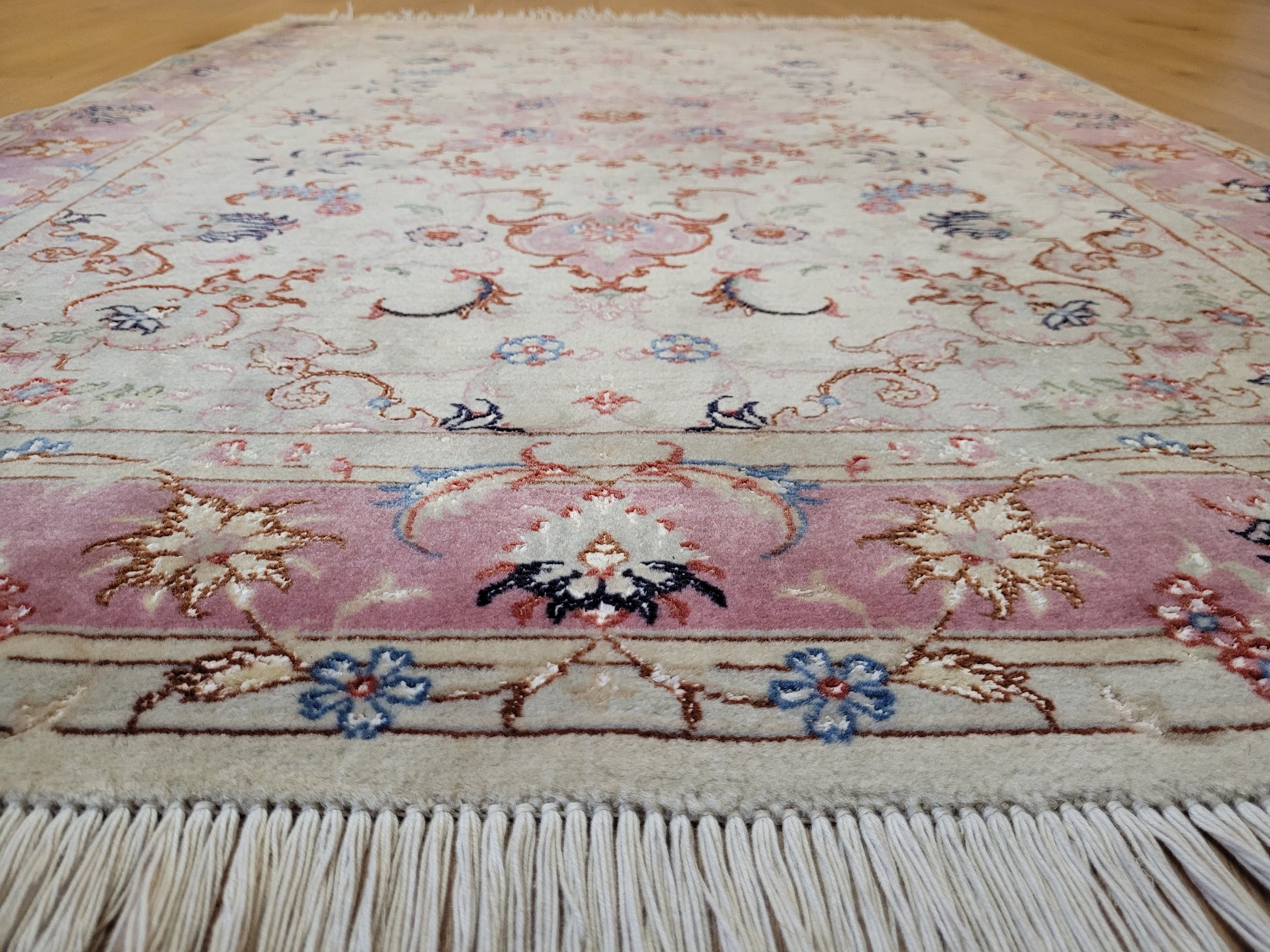 angeboten wird ein edler Täbriz Teppich aus feiner Korkwolle mit Seideneinlagen, handgeknüpft in meisterlicher Qualität. Das Zentrum schmückt ein symmetrisches Medaillon mit floraler Ornamentik, eingebettet in ein helles Fondfeld. Zarte Arabesken, Blütenranken und filigrane Muster verteilen sich harmonisch über die gesamte Fläche. Die Bordüre in Rosétönen ist mit kunstvollen Blütenmotiven verziert und bildet einen eleganten Rahmen.