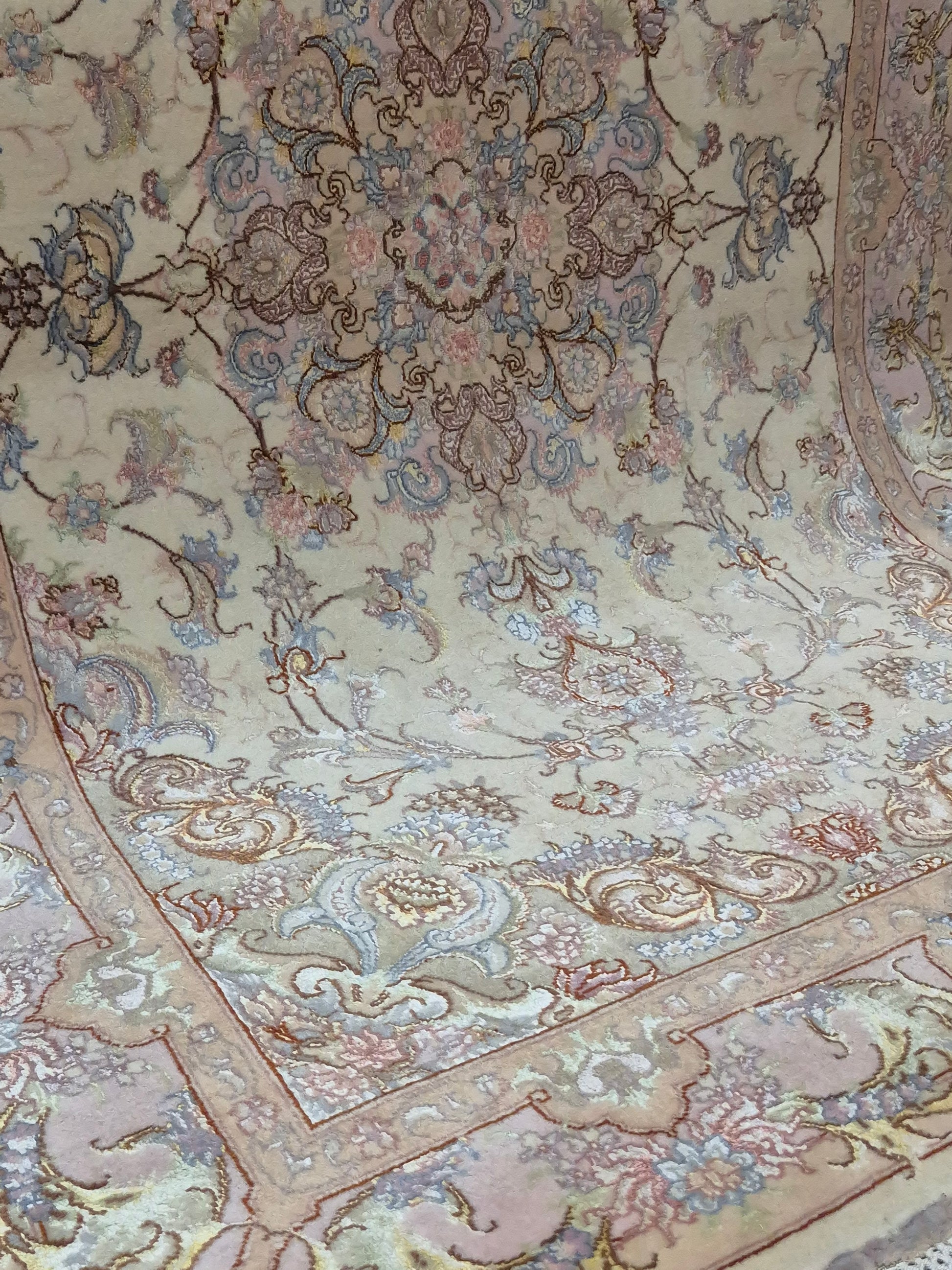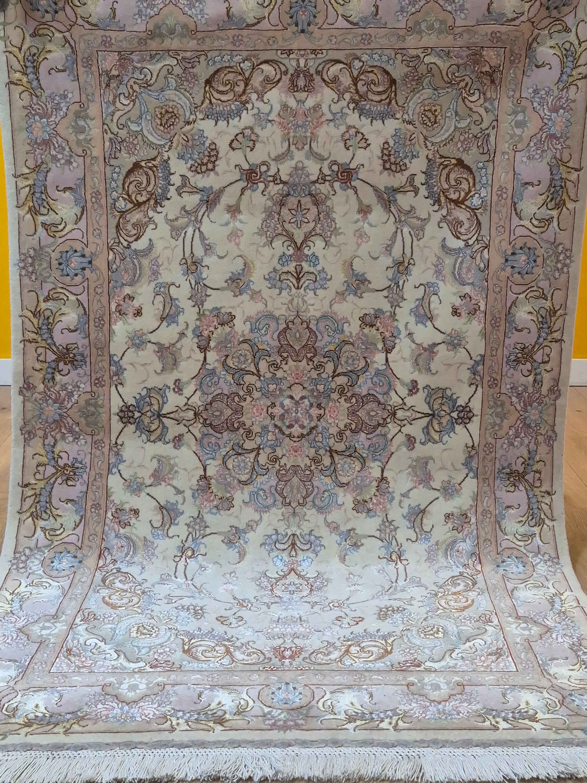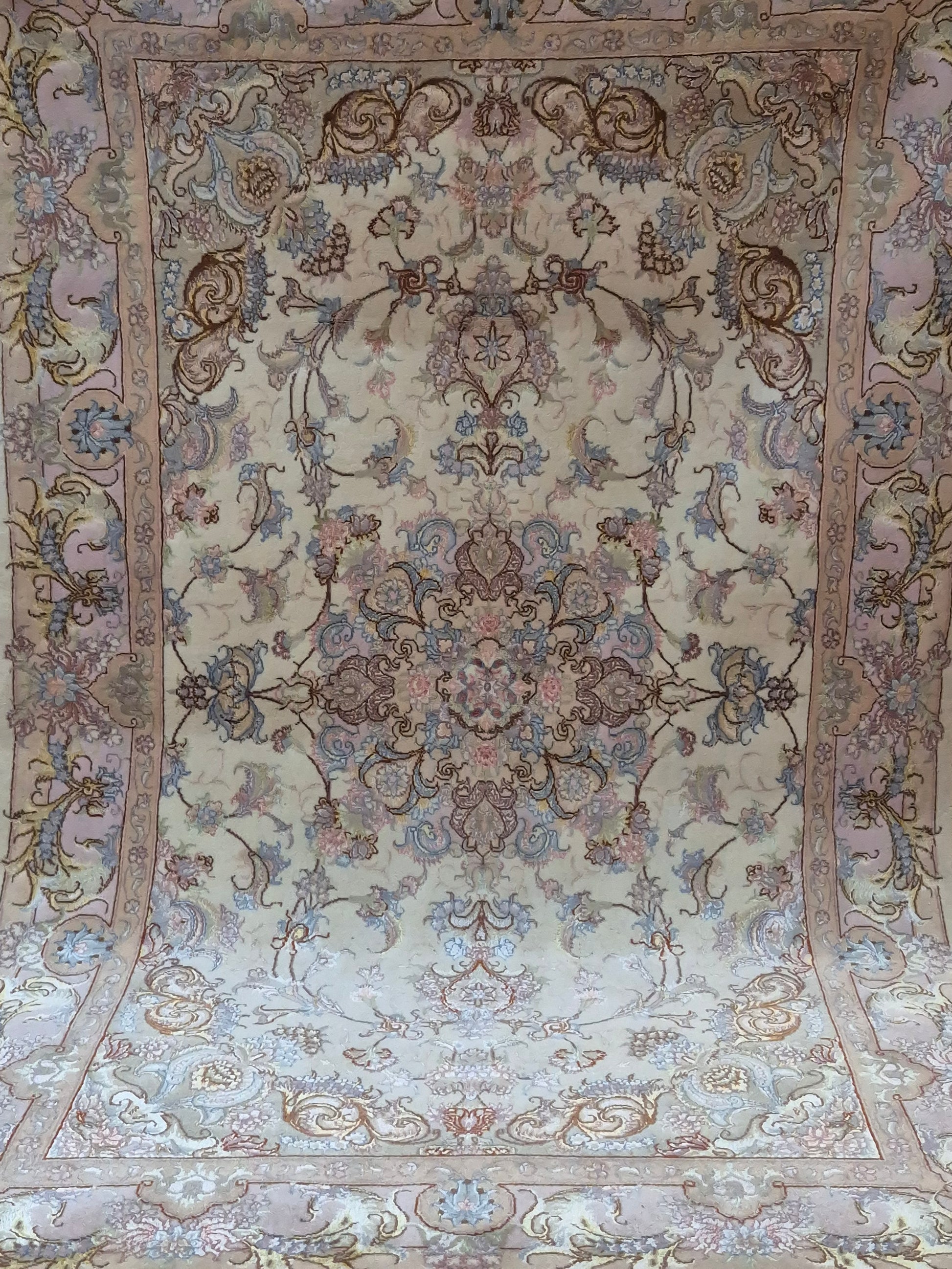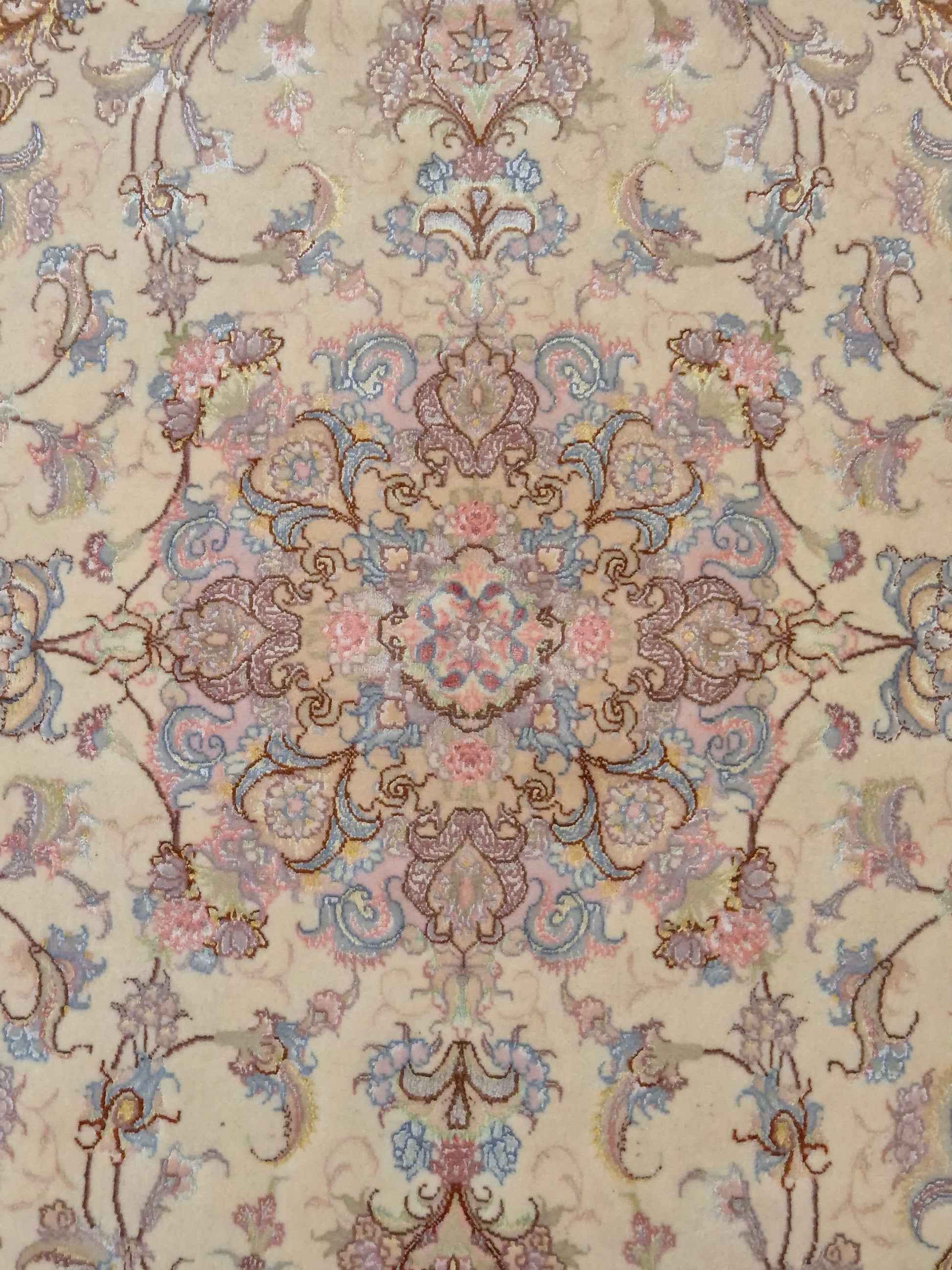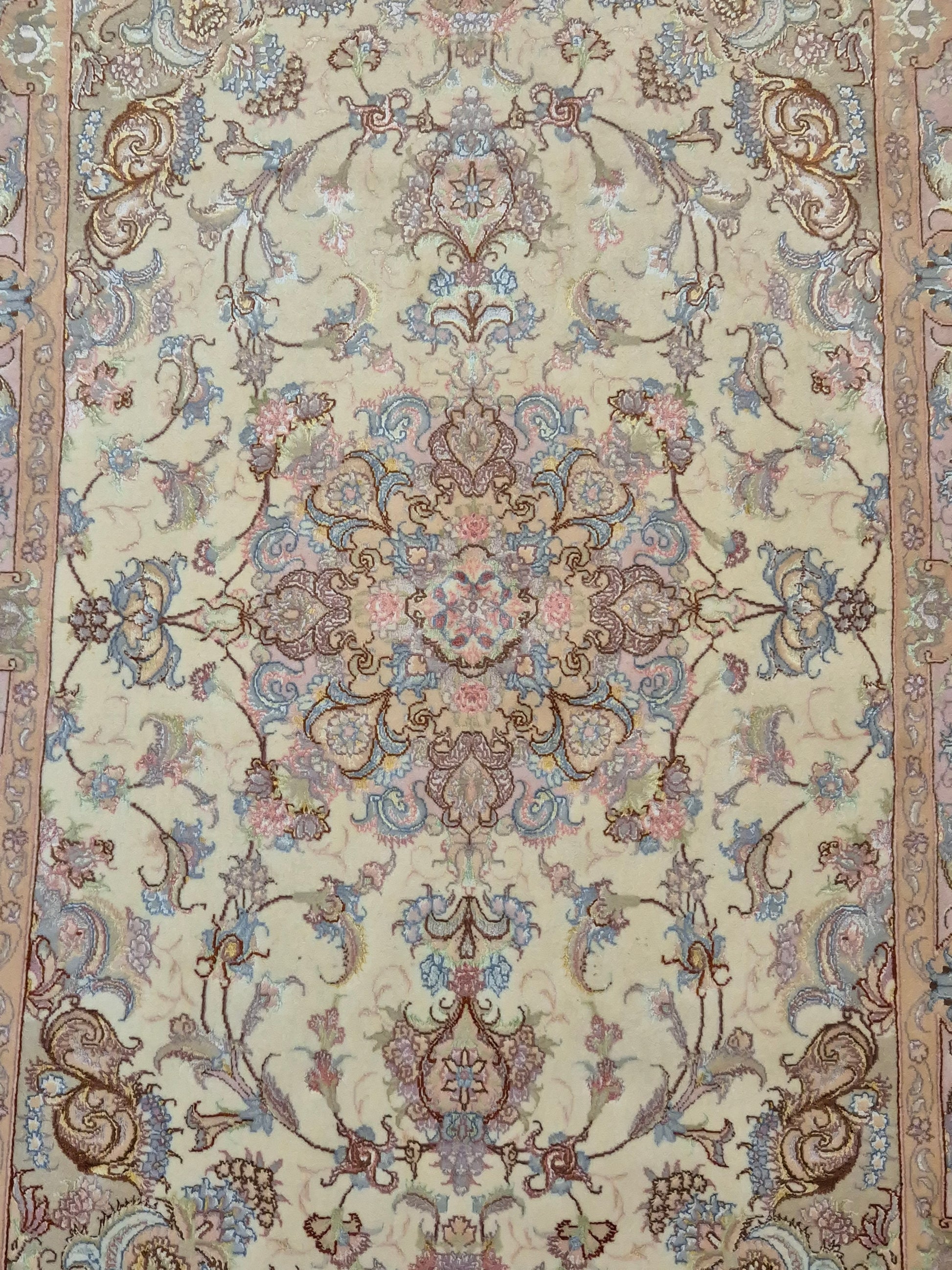 angeboten wird ein exquisiter Täbriz Teppich aus feiner Korkwolle mit Seide, auf Seide geknüpft. Dieses Stück besticht durch seine besonders feine Knüpfung und die elegante Gestaltung in zarten Pastelltönen. Im Zentrum befindet sich ein symmetrisches Medaillon, das von filigranen Blütenranken, Arabesken und geschwungenen Ornamenten umrahmt wird.